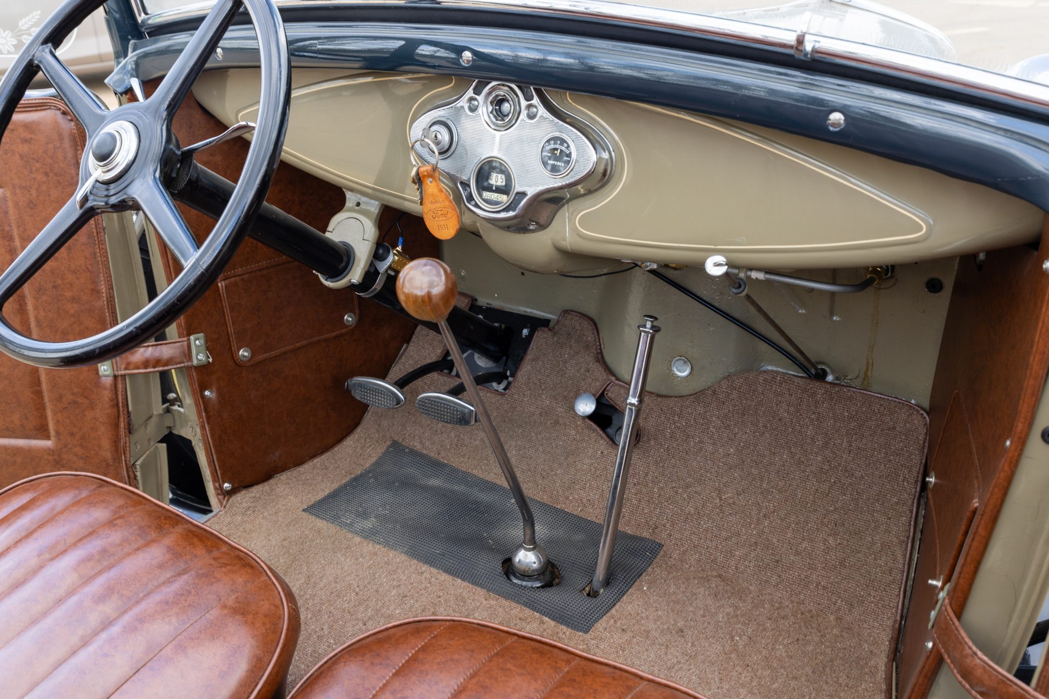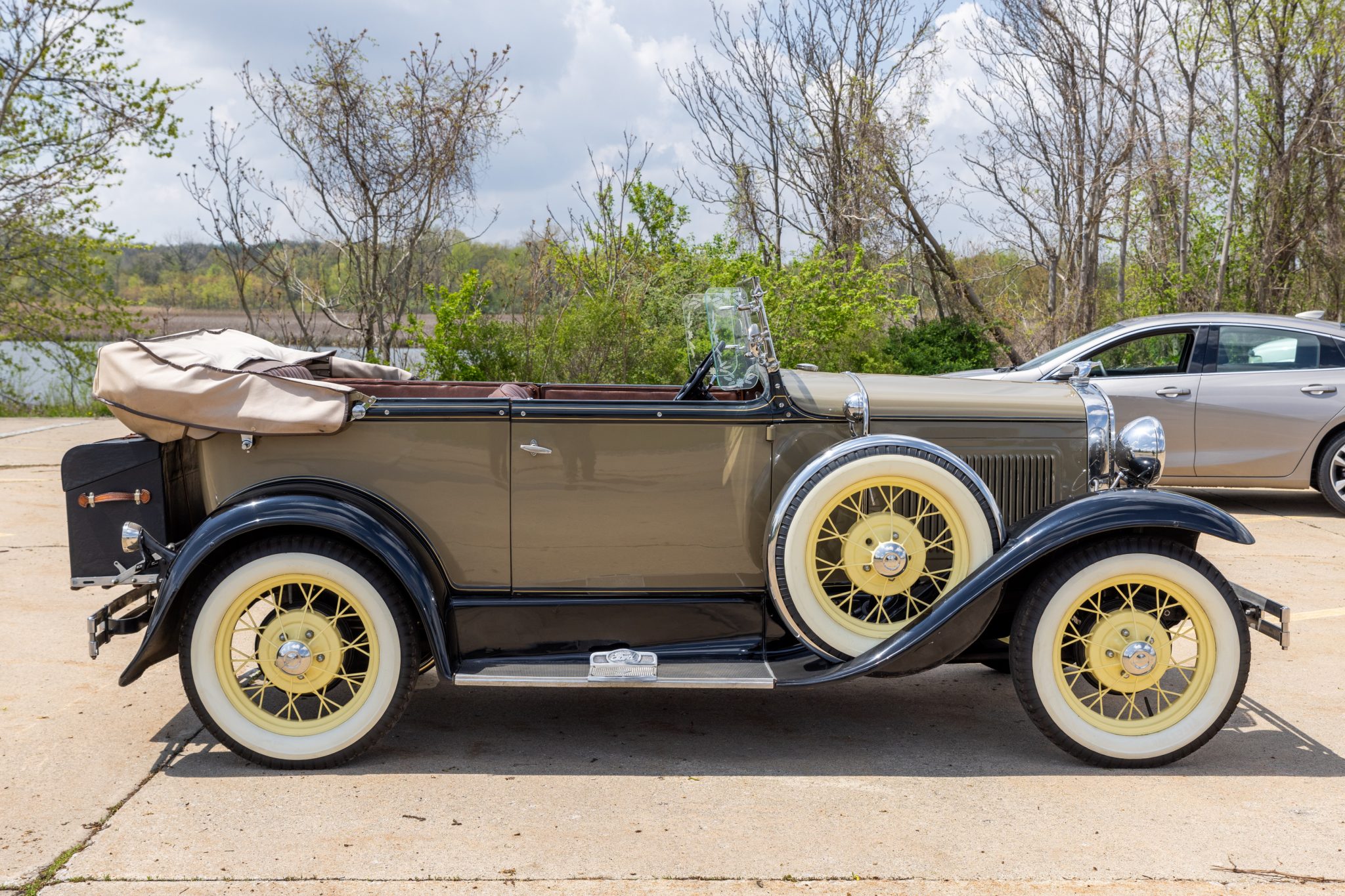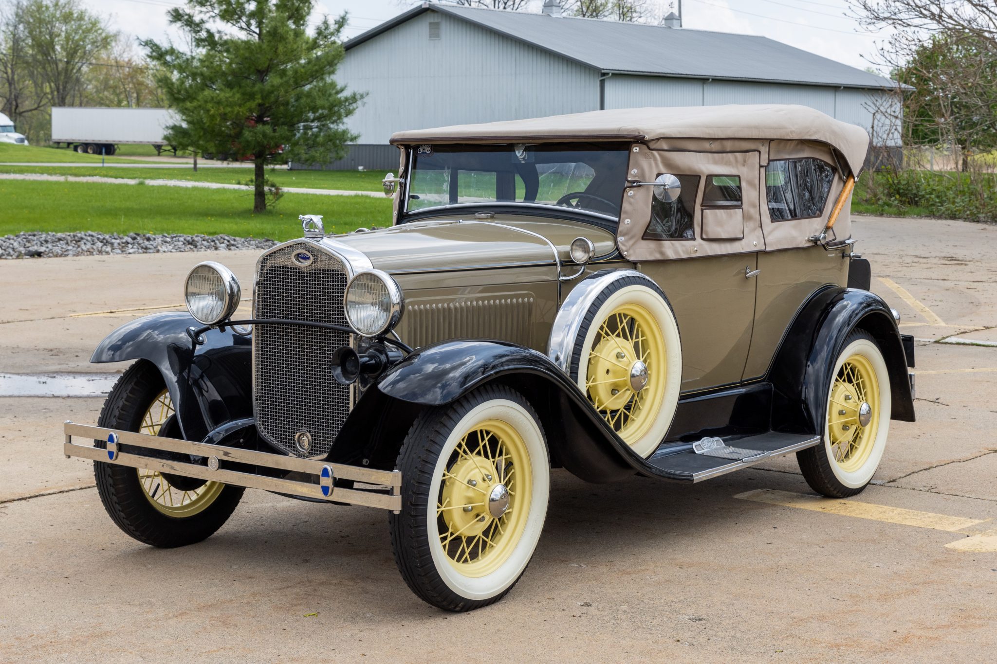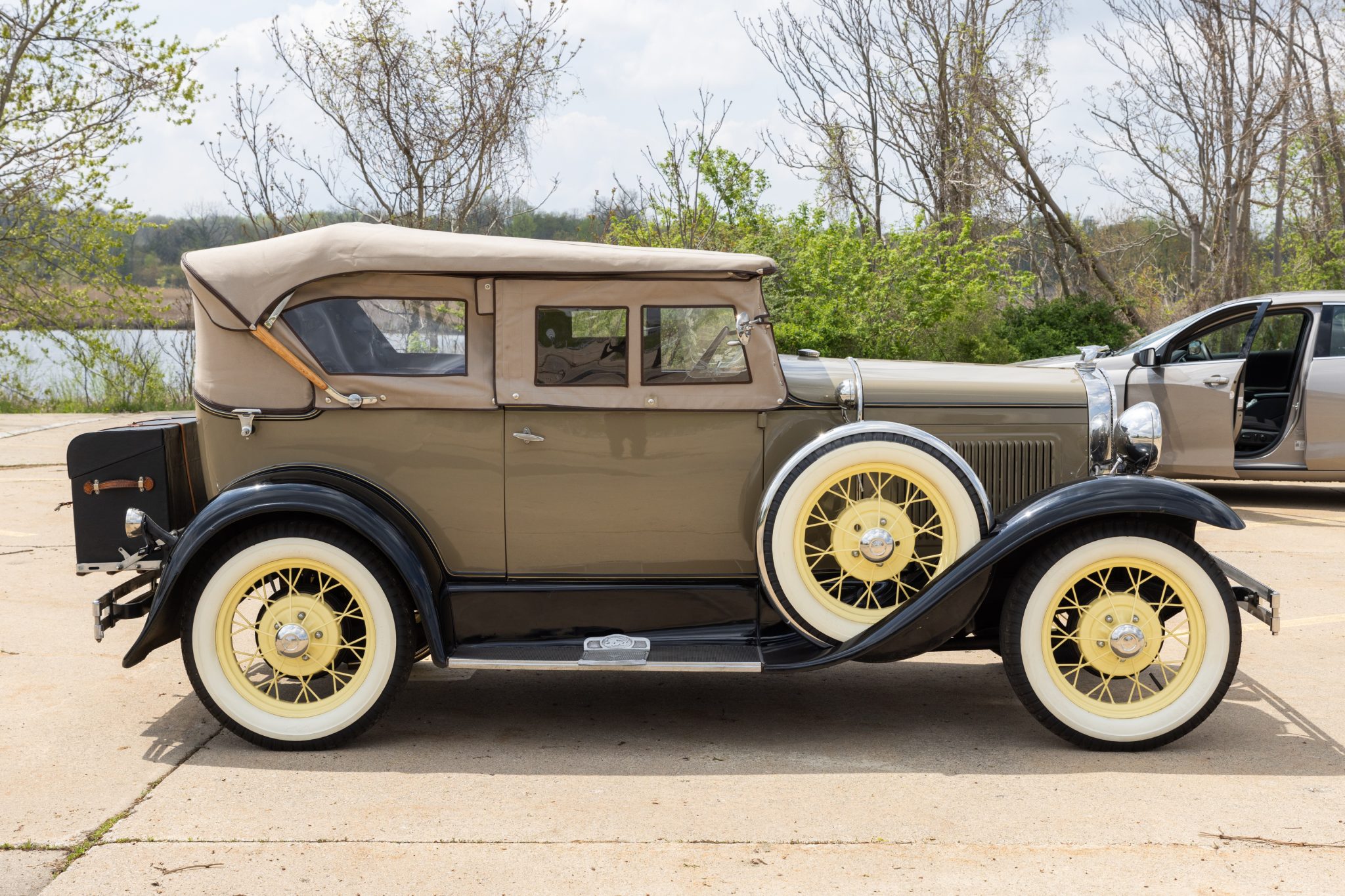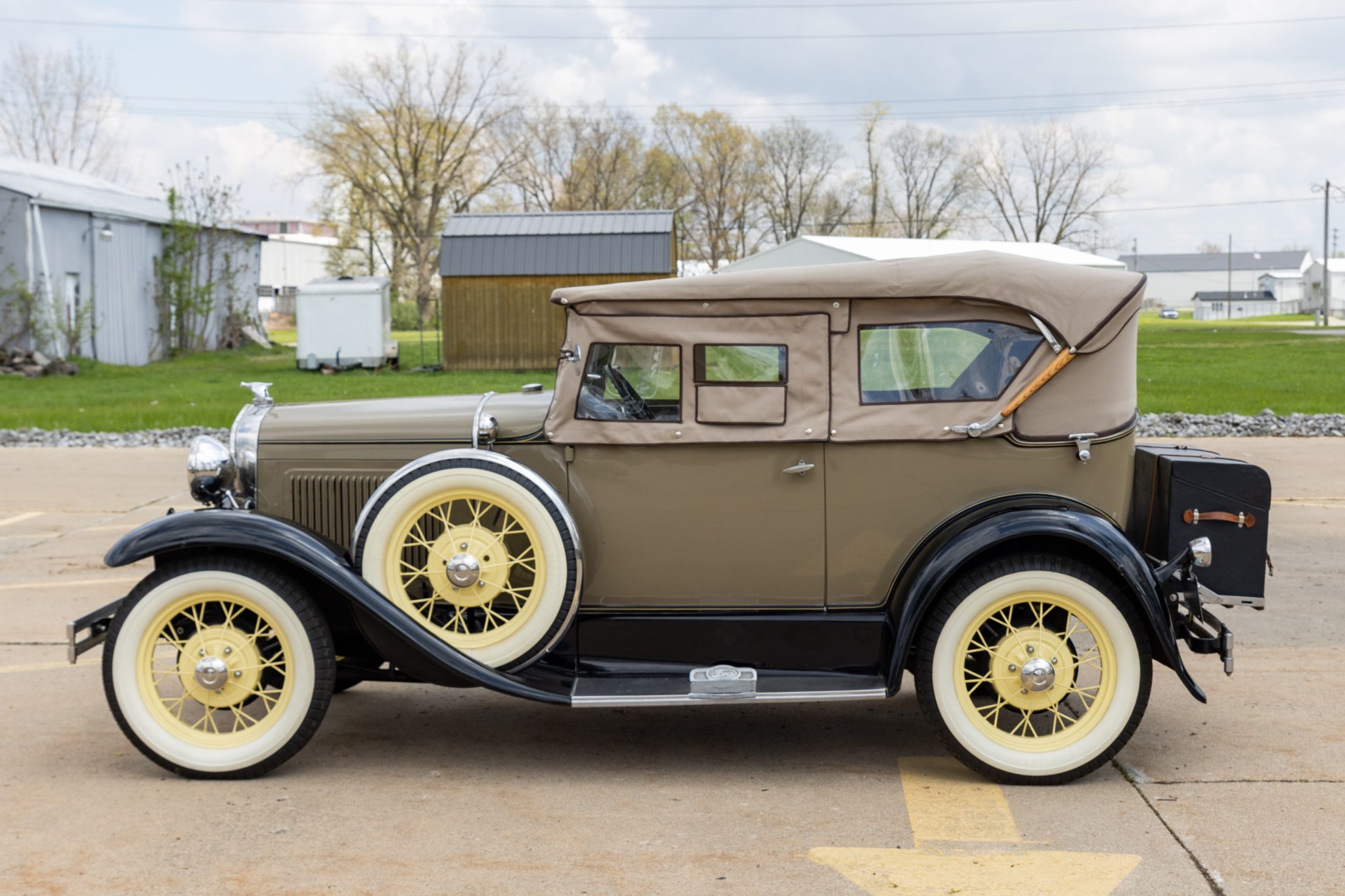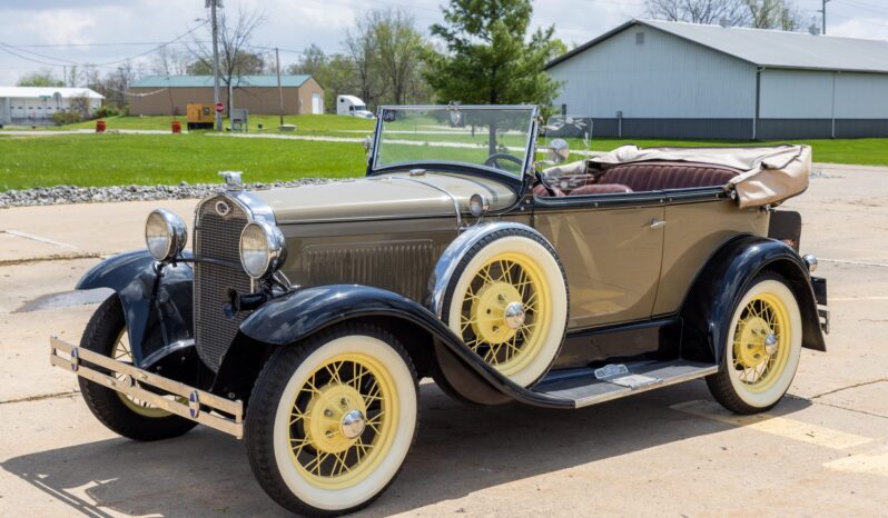 This 1931 Ford Model A Deluxe phaeton was refurbished and is powered by a 201ci L-head inline-four paired with a three-speed manual transmission. The car is finished in beige with black fenders and a tan soft top over brown vinyl upholstery and is equipped with a 12-volt electrical system, an alternator, side curtains, yellow-painted 19″ wire wheels, dual side-mount spares, dual side mirrors, cowl lamps, a tilt-out windshield, a grille guard, and a fold-down luggage rack hosting a trunk.