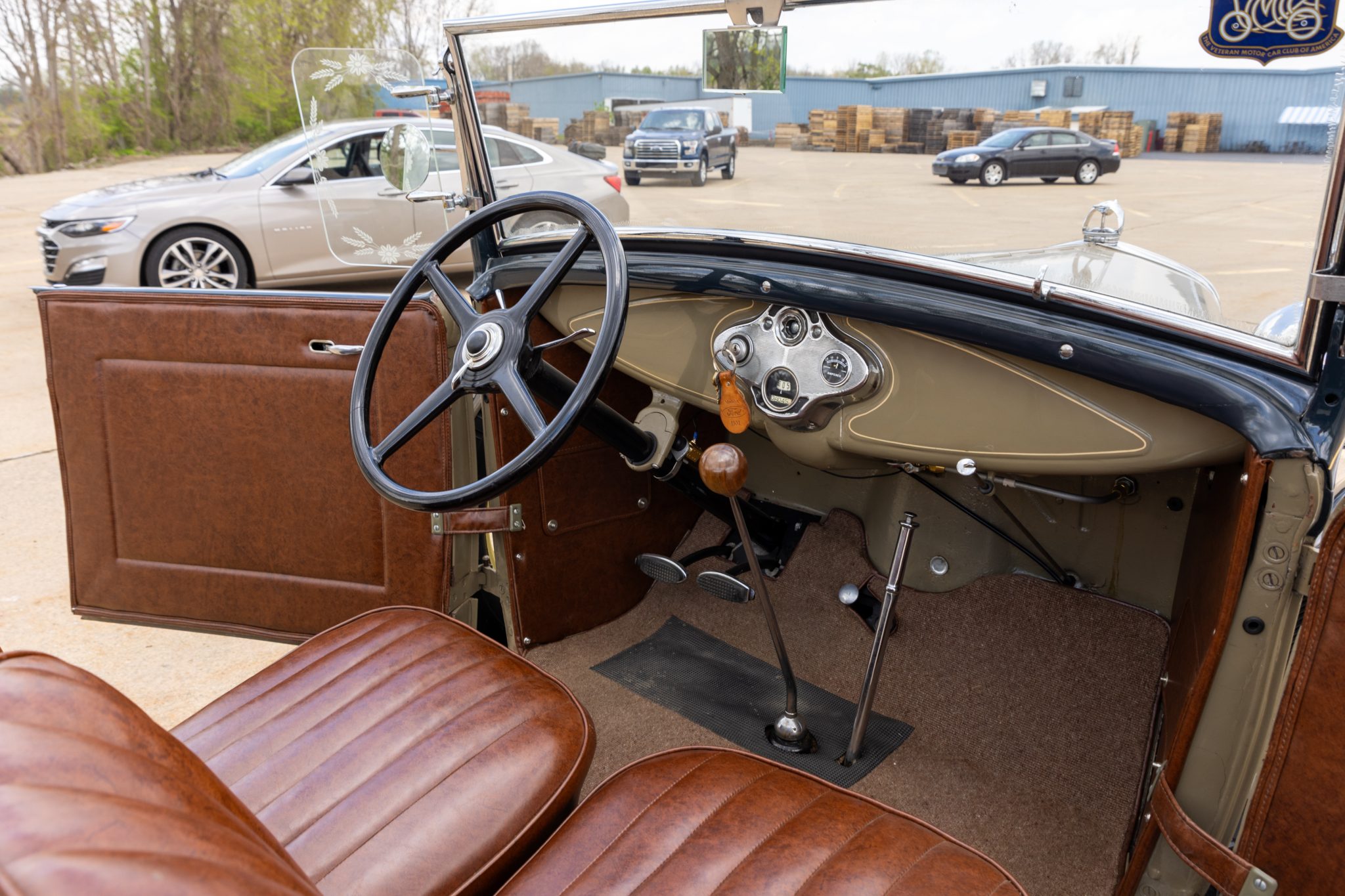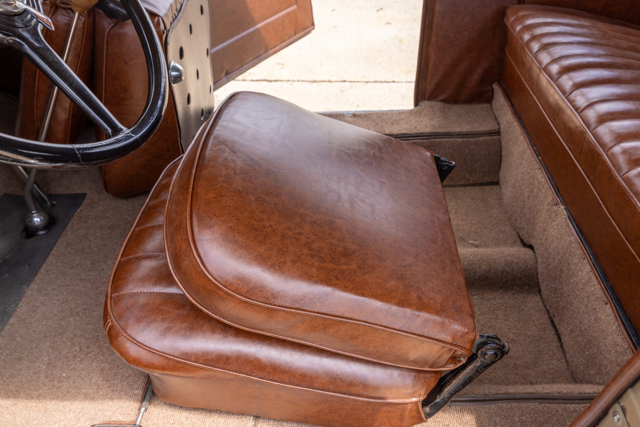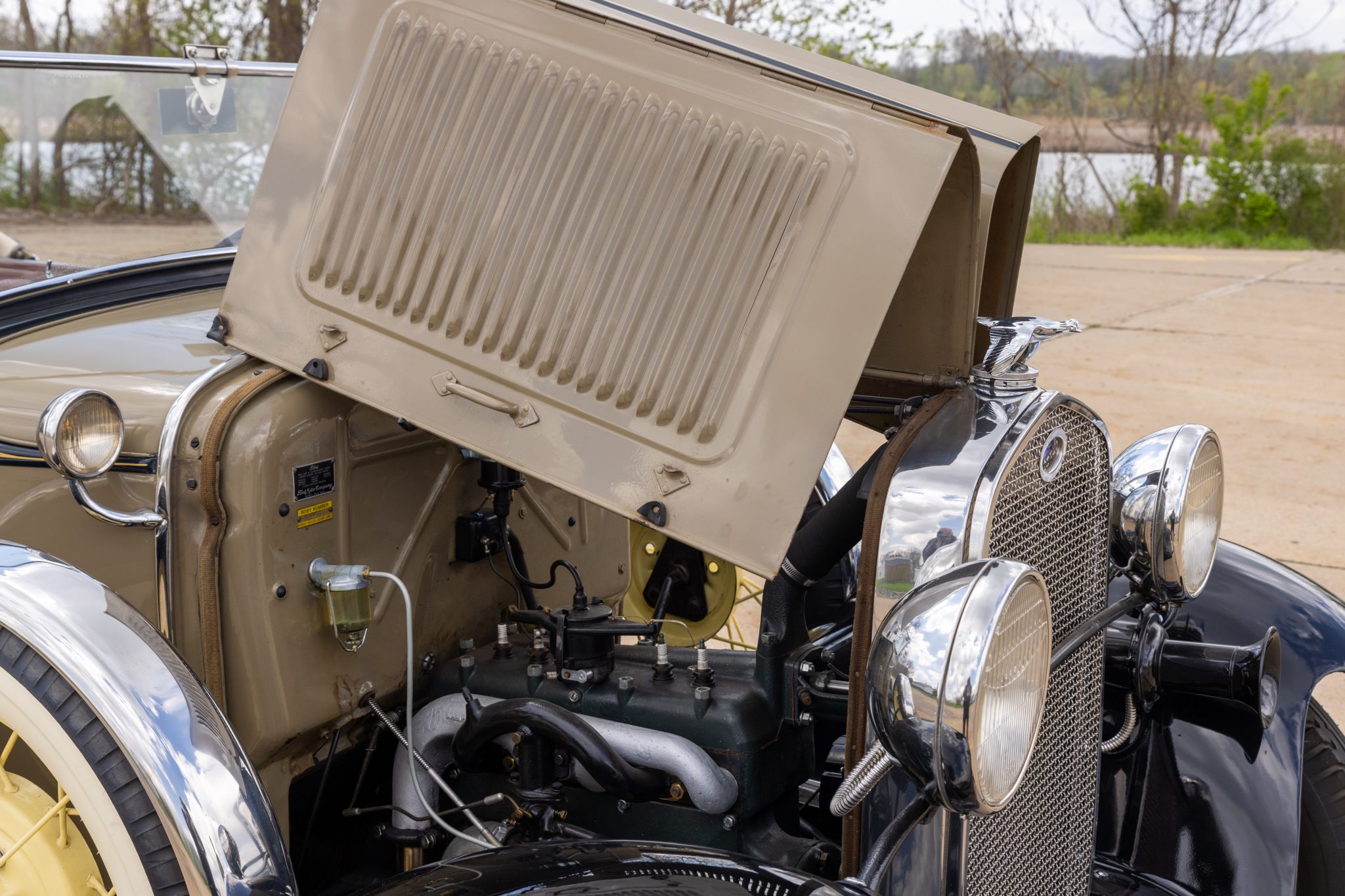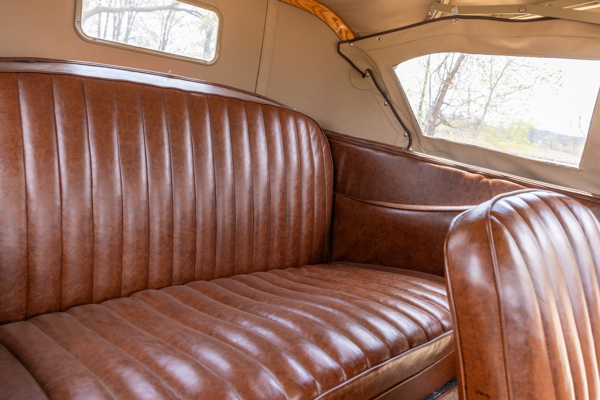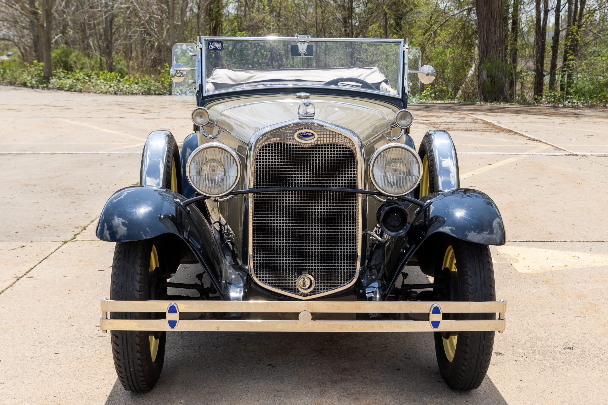 This 1931 Ford Model A Deluxe phaeton was refurbished and is powered by a 201ci L-head inline-four paired with a three-speed manual transmission. The car is finished in beige with black fenders and a tan soft top over brown vinyl upholstery and is equipped with a 12-volt electrical system, an alternator, side curtains, yellow-painted 19″ wire wheels, dual side-mount spares, dual side mirrors, cowl lamps, a tilt-out windshield, a grille guard, and a fold-down luggage rack hosting a trunk.