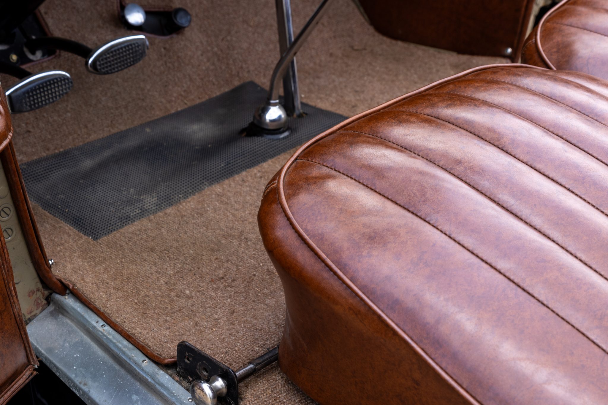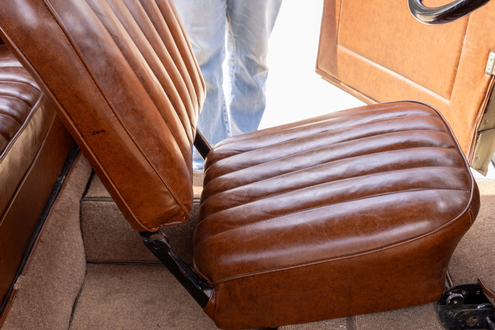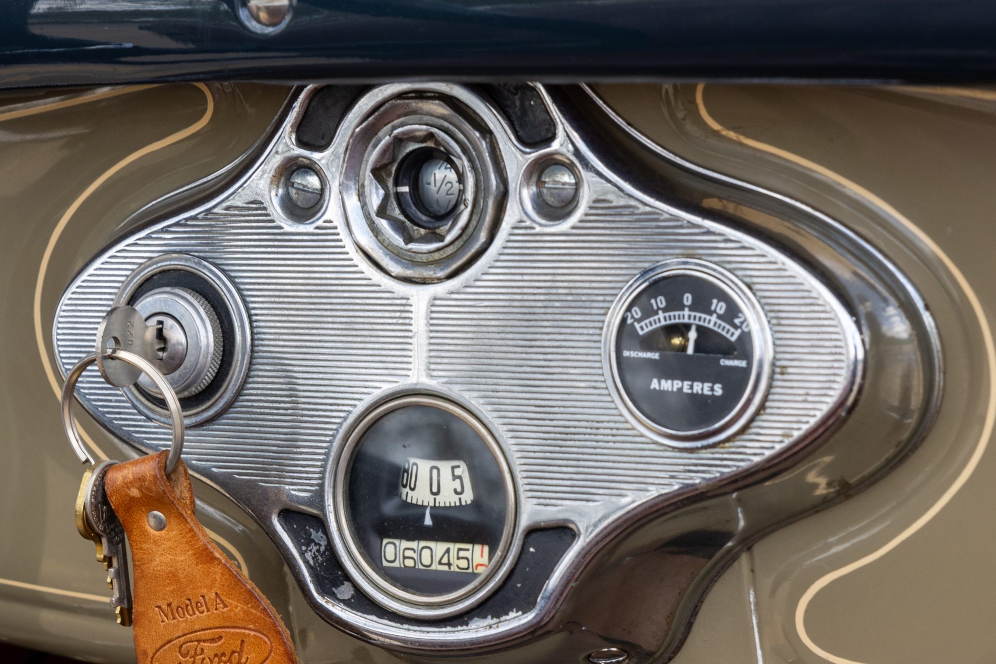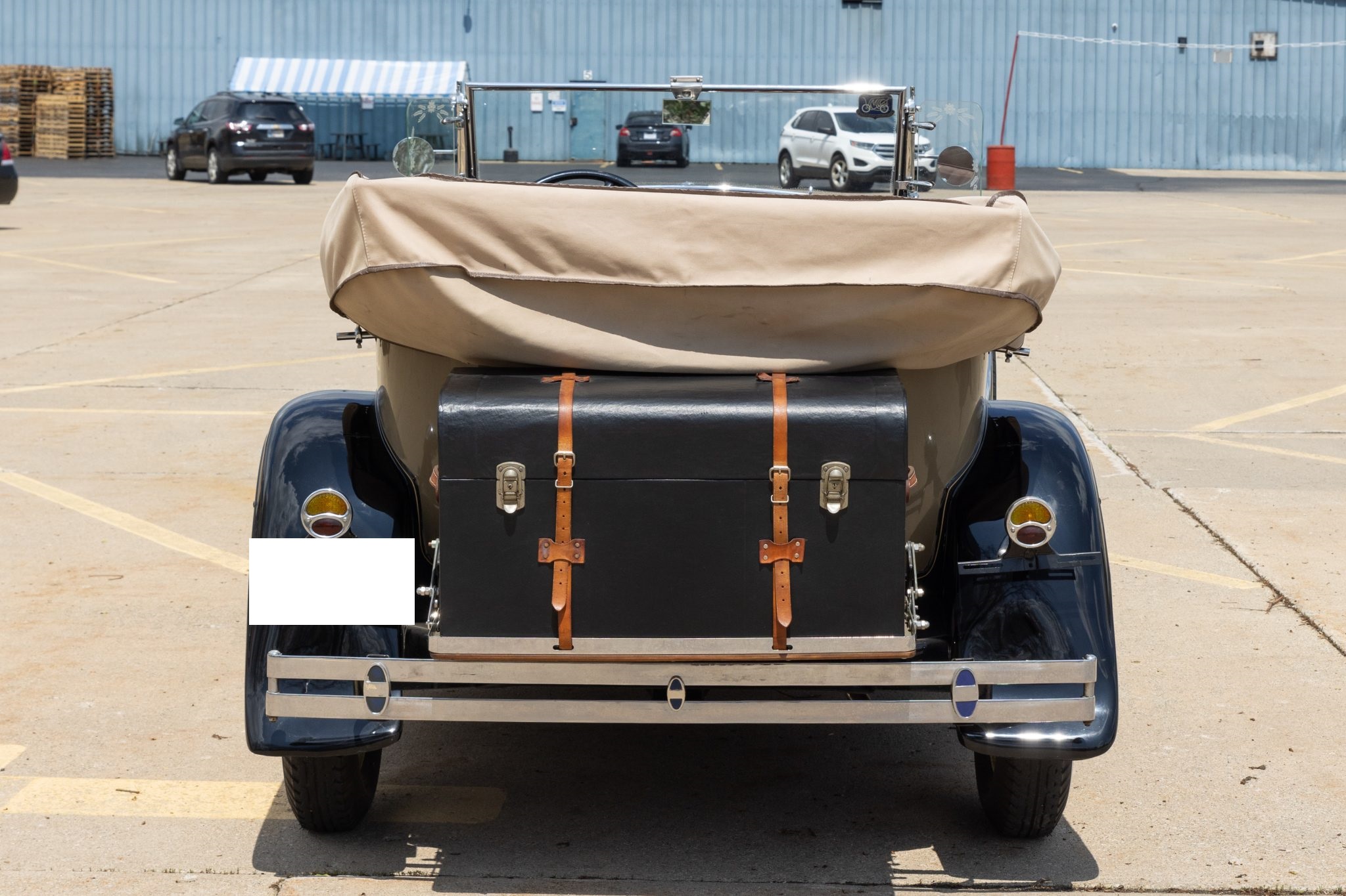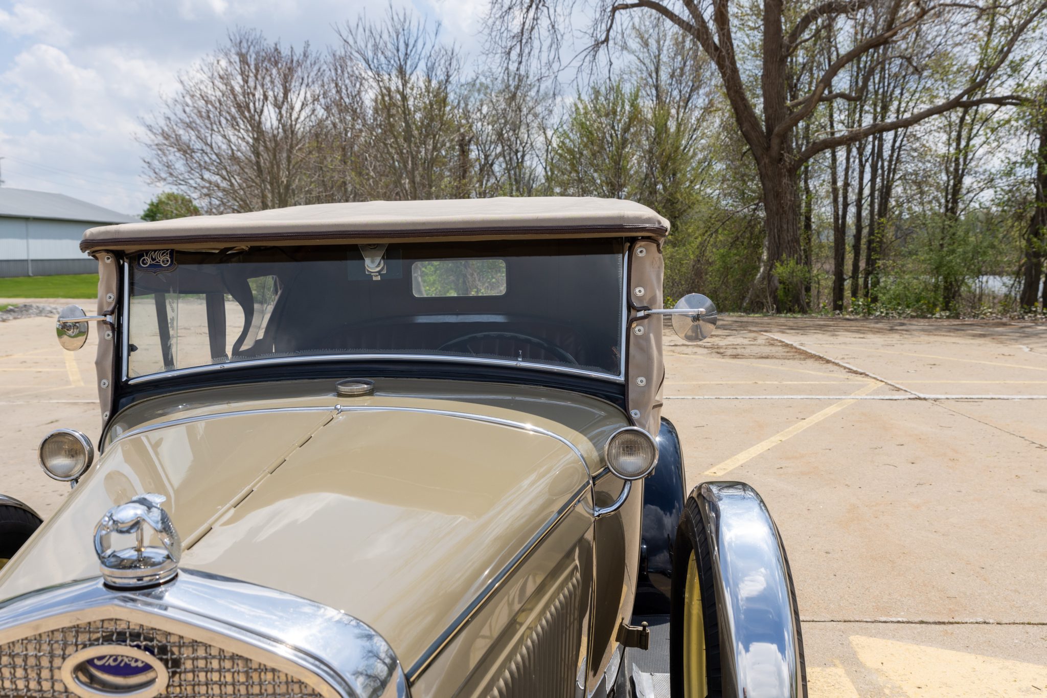 This 1931 Ford Model A Deluxe phaeton was refurbished and is powered by a 201ci L-head inline-four paired with a three-speed manual transmission. The car is finished in beige with black fenders and a tan soft top over brown vinyl upholstery and is equipped with a 12-volt electrical system, an alternator, side curtains, yellow-painted 19″ wire wheels, dual side-mount spares, dual side mirrors, cowl lamps, a tilt-out windshield, a grille guard, and a fold-down luggage rack hosting a trunk.