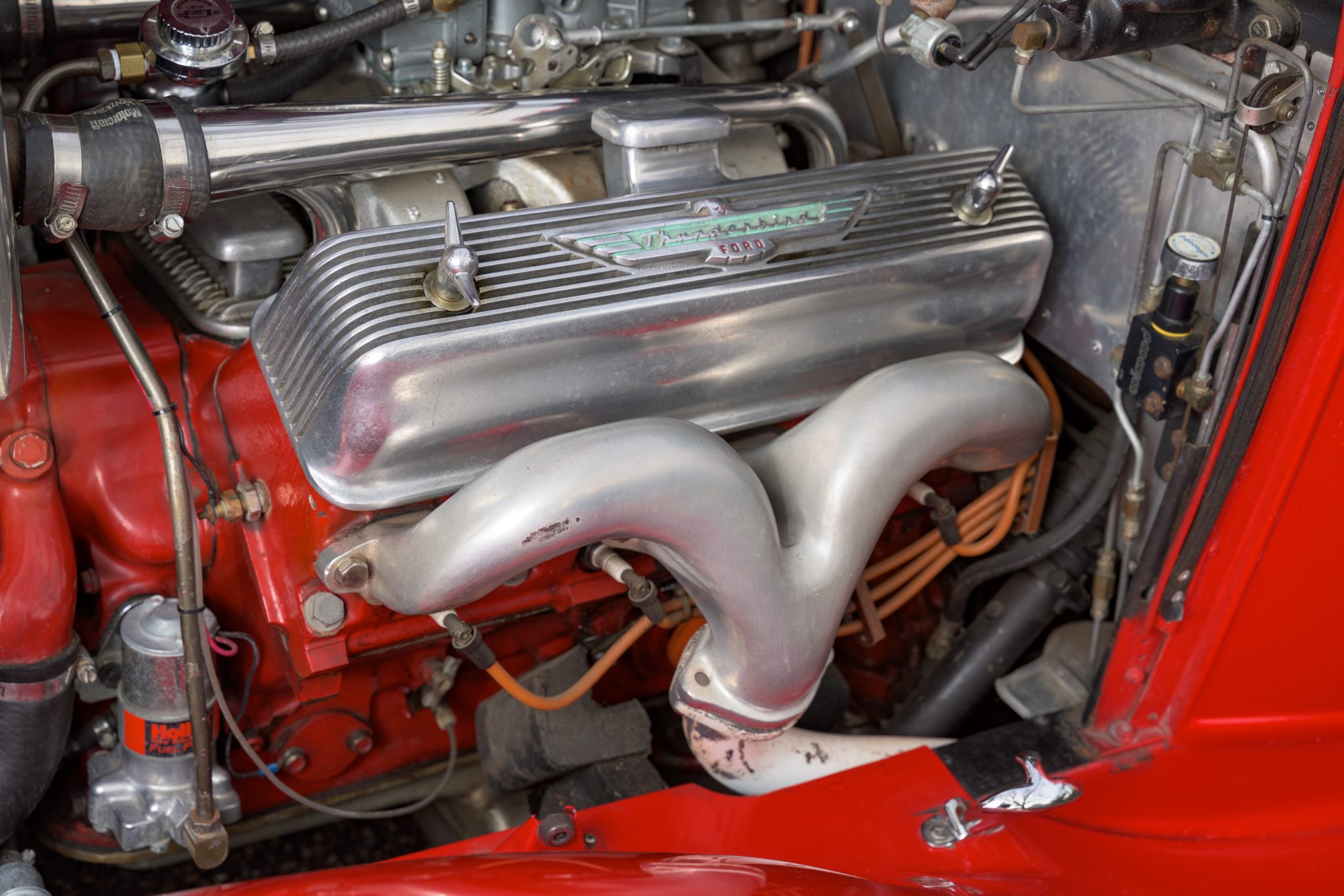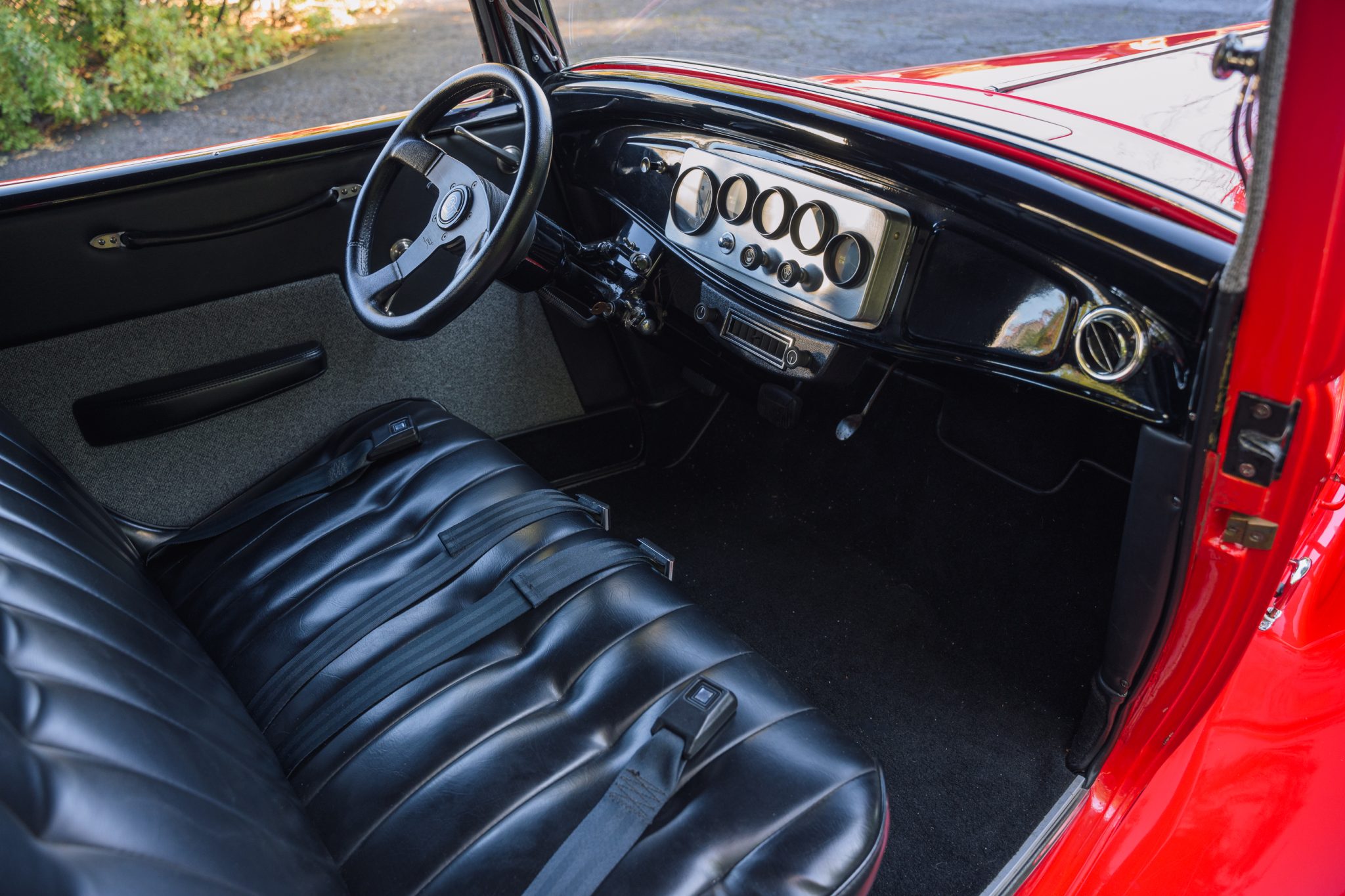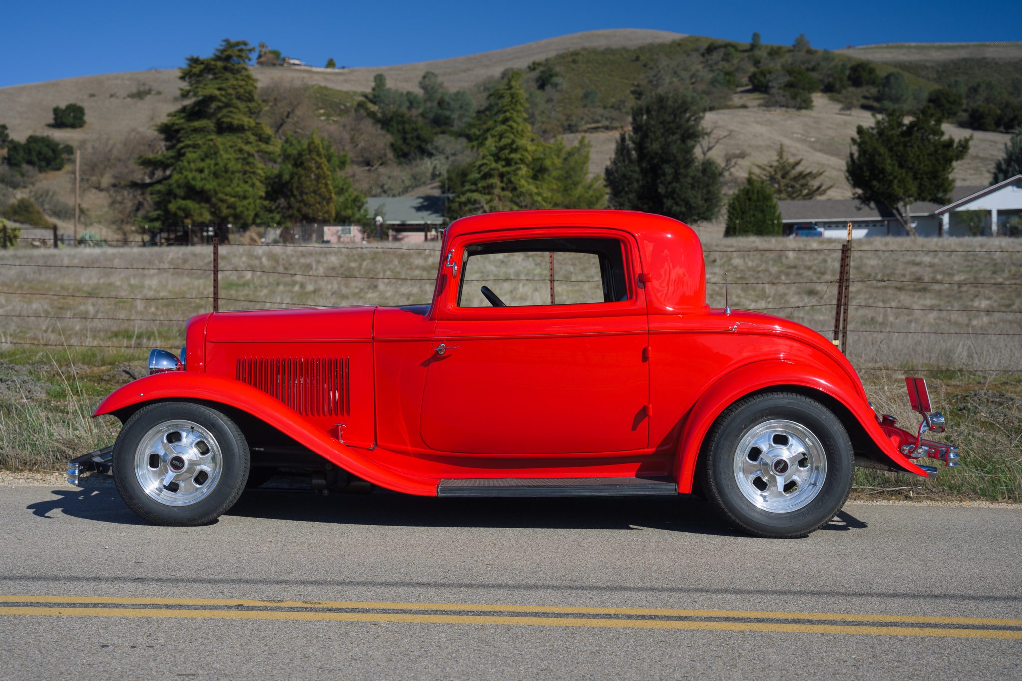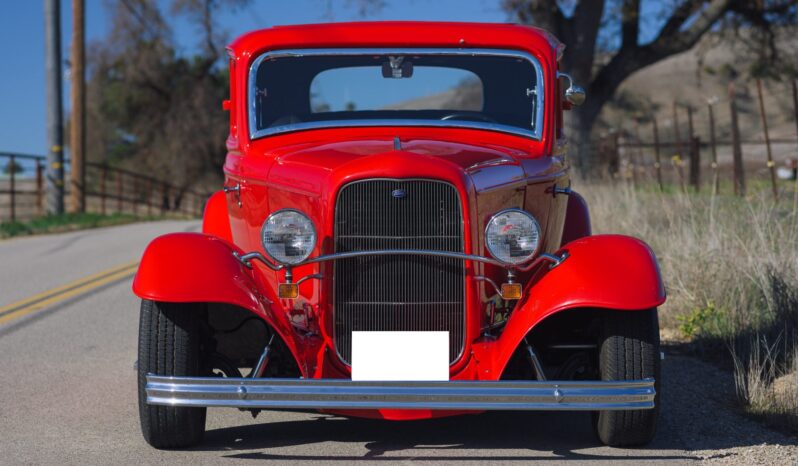 This ’32 Ford three-window coupe is powered by a 292ci Y-block V8 The sectioned fiberglass body is finished in red and mounted to a boxed steel frame with transverse leaf springs, a front drop axle, rear ladder bars, and front disc brakes. The engine is backed by a column-shifted four-speed manual transmission, and additional highlights include a Holley carburetor, rear-hinged doors, and Weld Racing 14” and 15” alloy wheels. Inside, black vinyl and gray tweed upholstery is joined by a Grant steering wheel, air conditioning, and Stewart-Warner gauges.