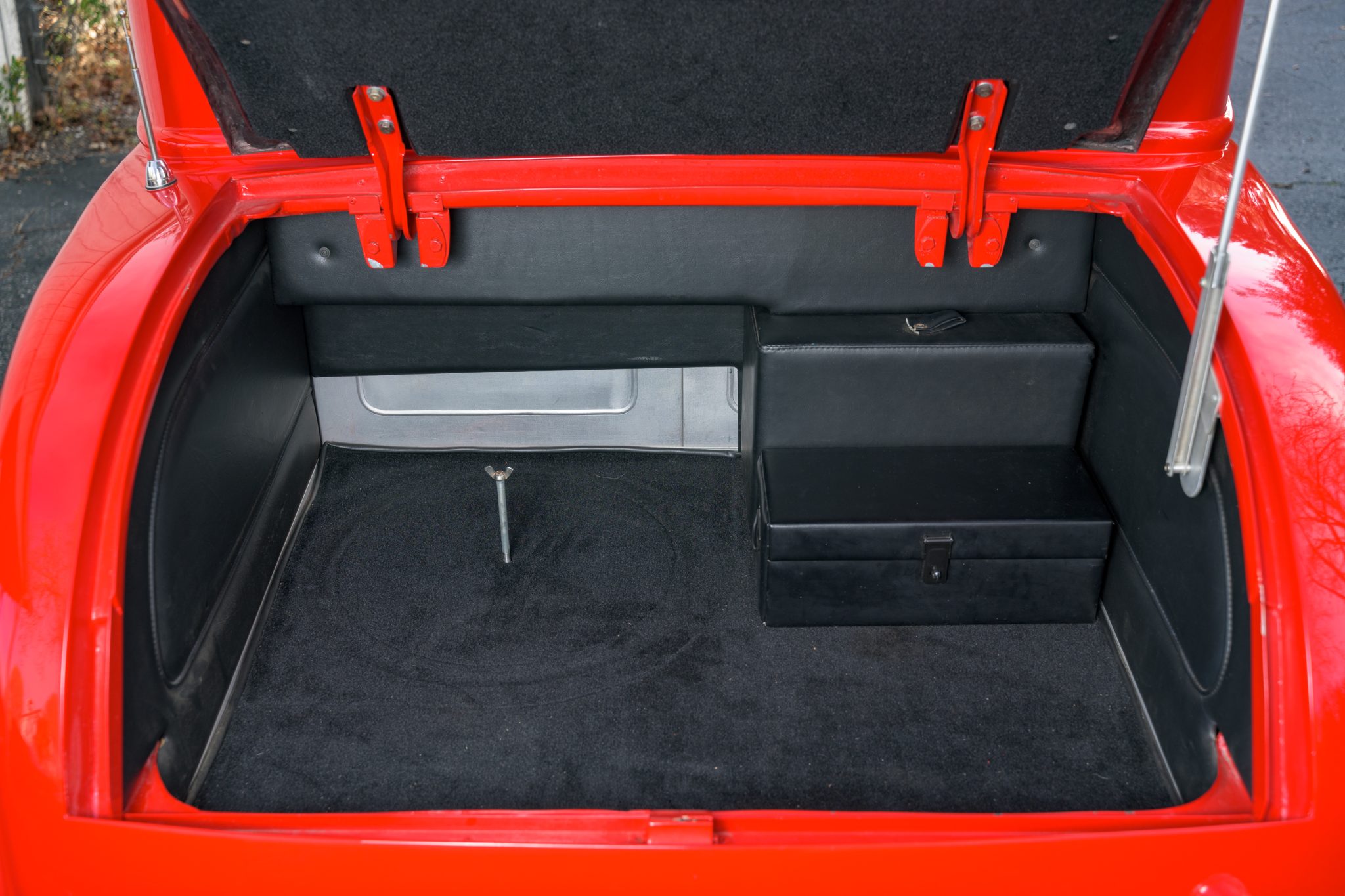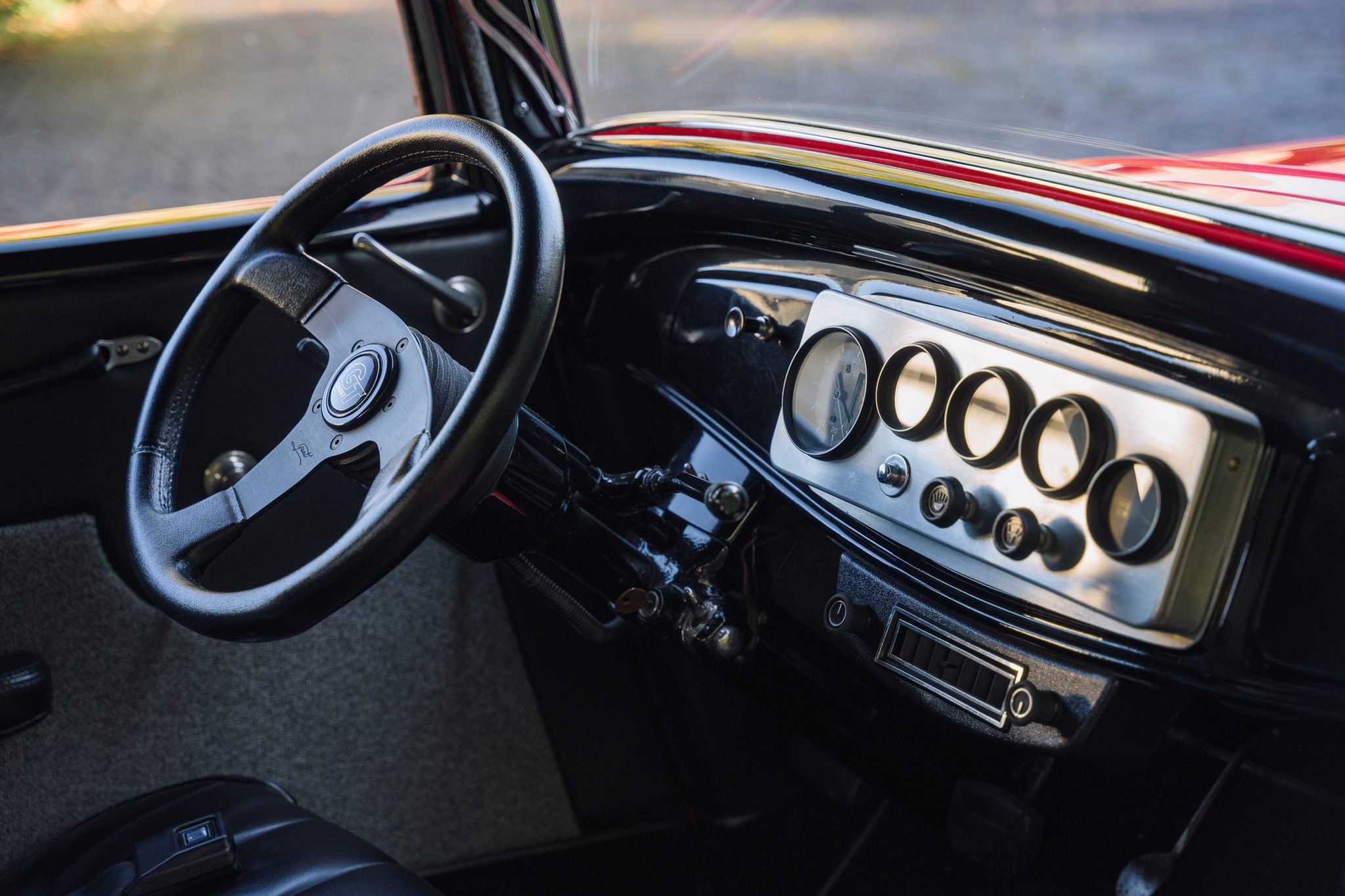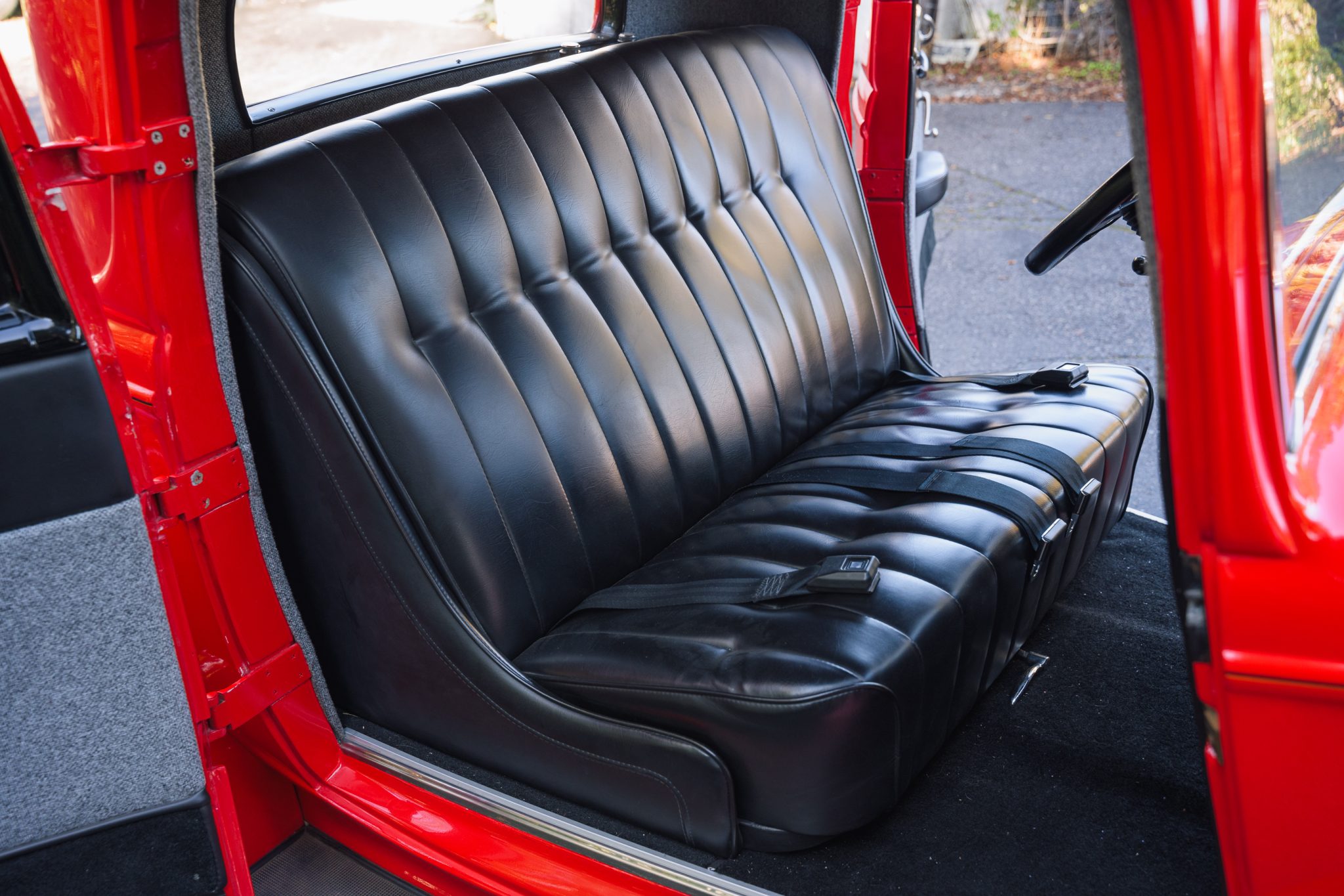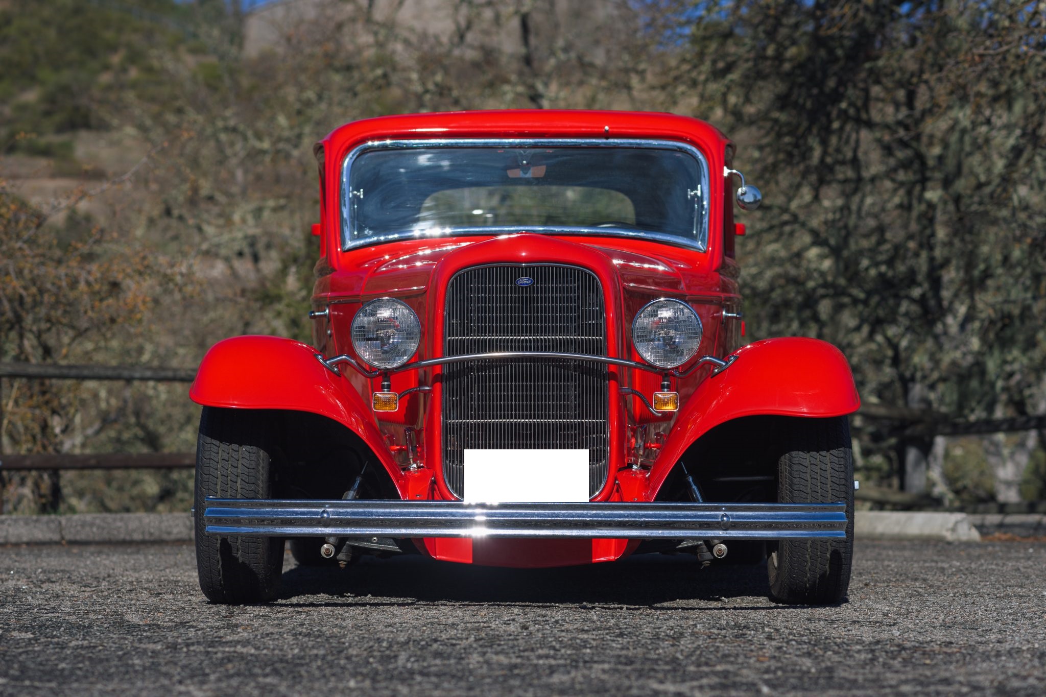 This ’32 Ford three-window coupe is powered by a 292ci Y-block V8 The sectioned fiberglass body is finished in red and mounted to a boxed steel frame with transverse leaf springs, a front drop axle, rear ladder bars, and front disc brakes. The engine is backed by a column-shifted four-speed manual transmission, and additional highlights include a Holley carburetor, rear-hinged doors, and Weld Racing 14” and 15” alloy wheels. Inside, black vinyl and gray tweed upholstery is joined by a Grant steering wheel, air conditioning, and Stewart-Warner gauges.