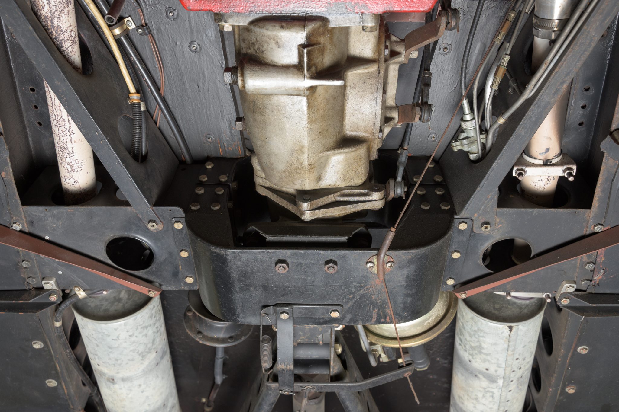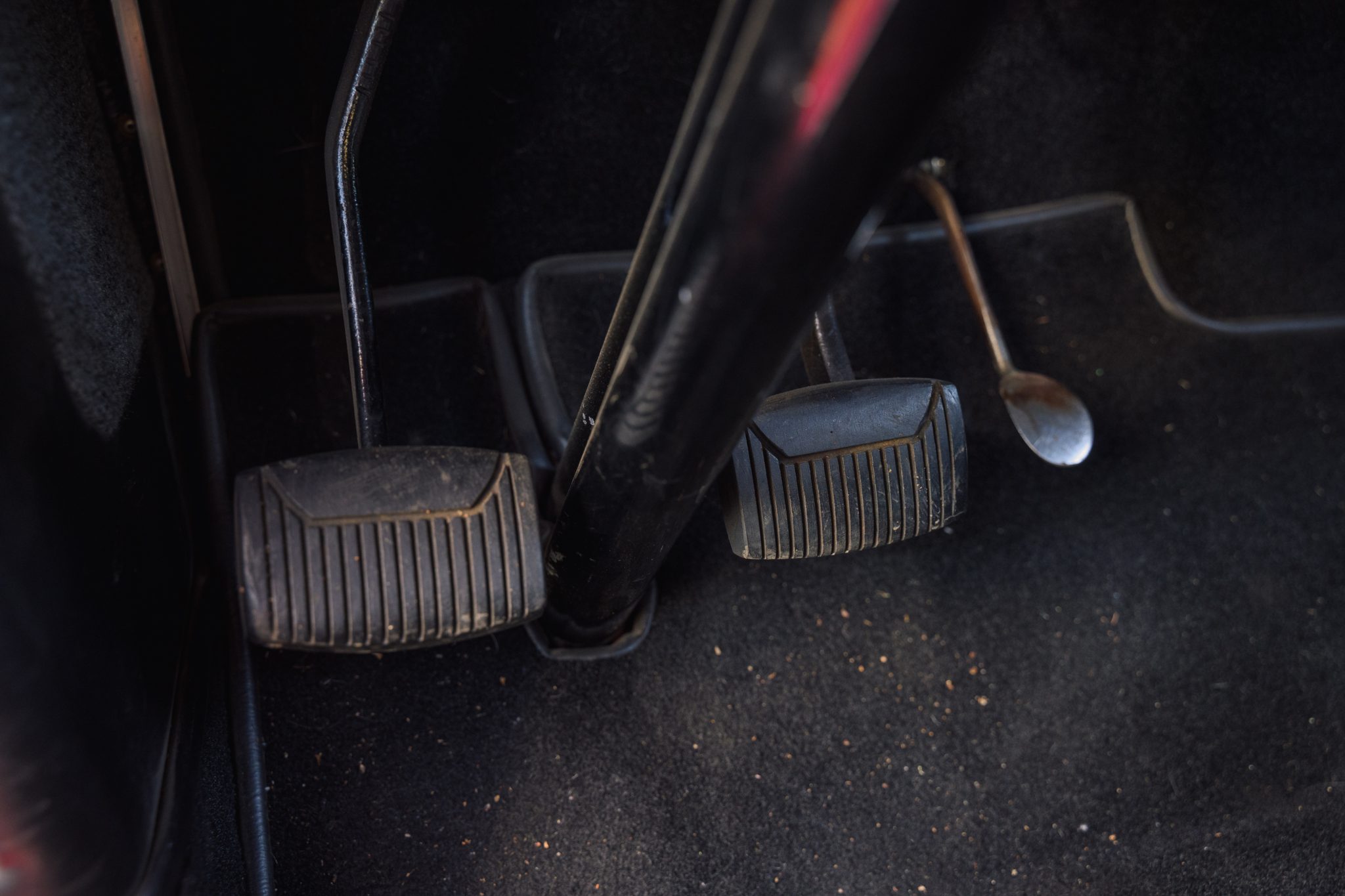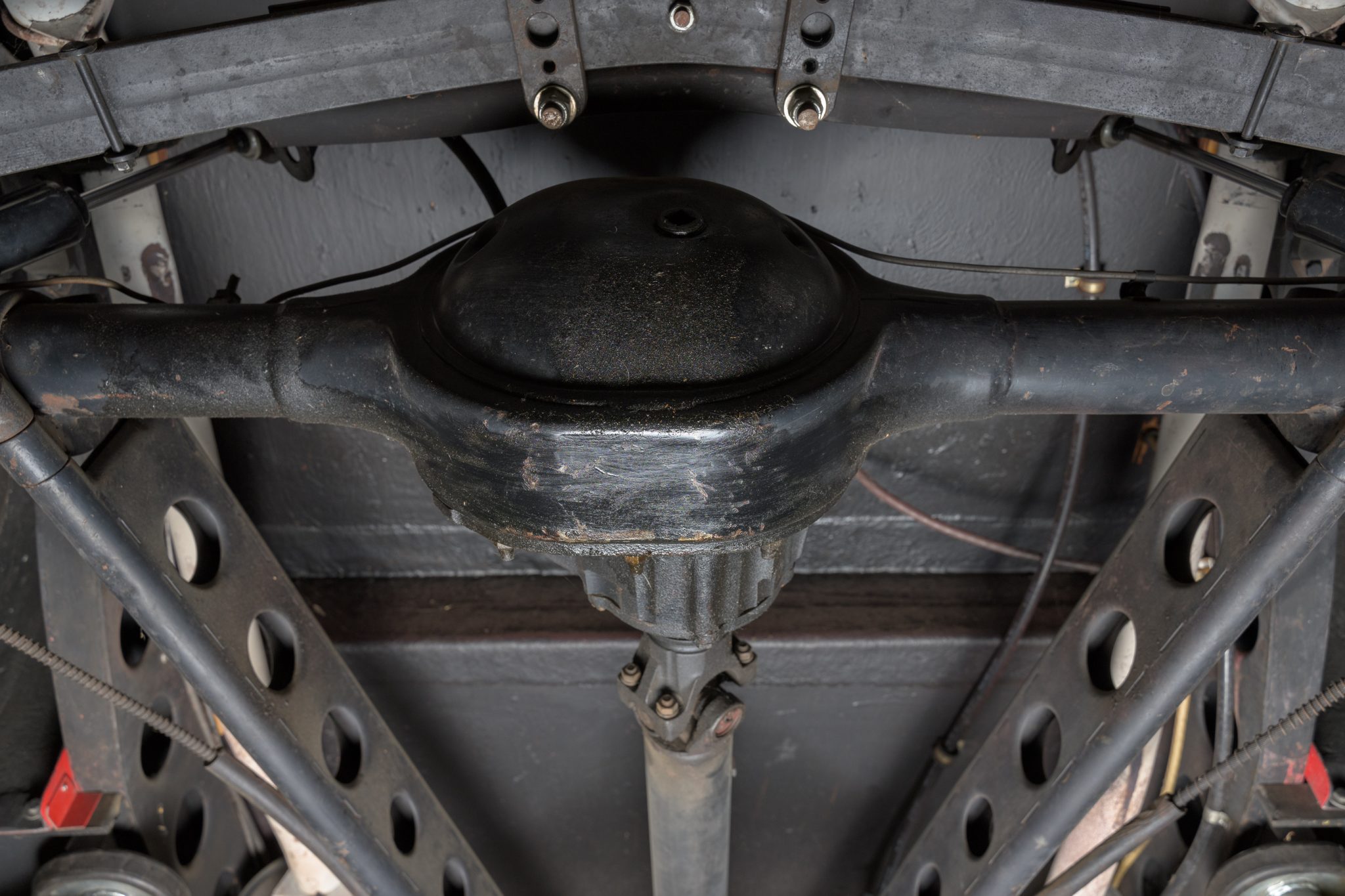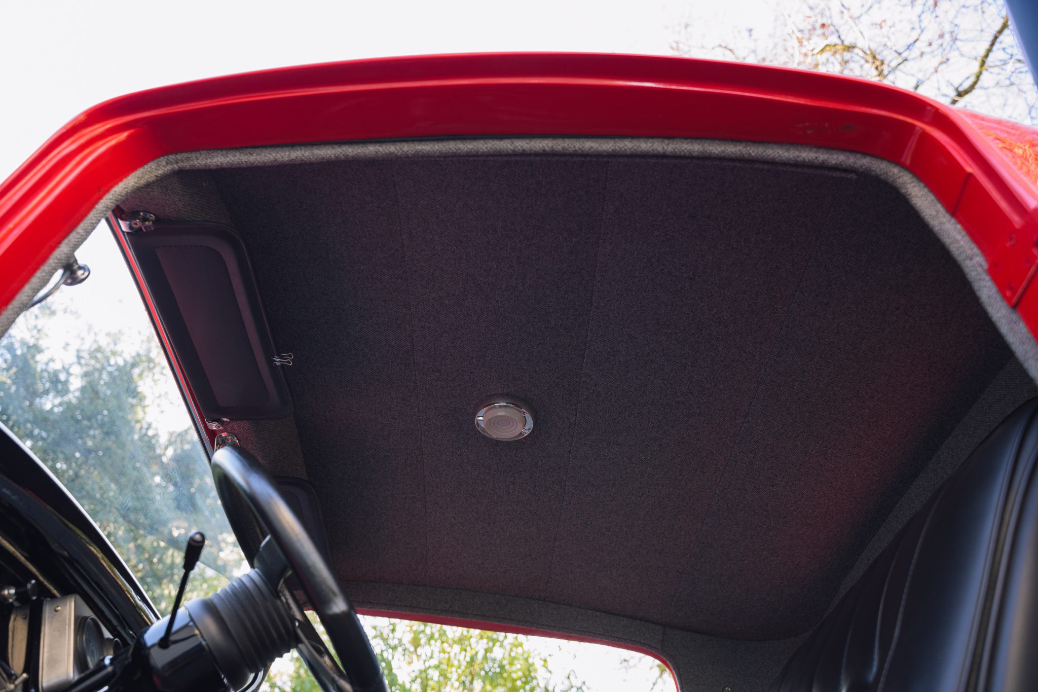 This ’32 Ford three-window coupe is powered by a 292ci Y-block V8 The sectioned fiberglass body is finished in red and mounted to a boxed steel frame with transverse leaf springs, a front drop axle, rear ladder bars, and front disc brakes. The engine is backed by a column-shifted four-speed manual transmission, and additional highlights include a Holley carburetor, rear-hinged doors, and Weld Racing 14” and 15” alloy wheels. Inside, black vinyl and gray tweed upholstery is joined by a Grant steering wheel, air conditioning, and Stewart-Warner gauges.