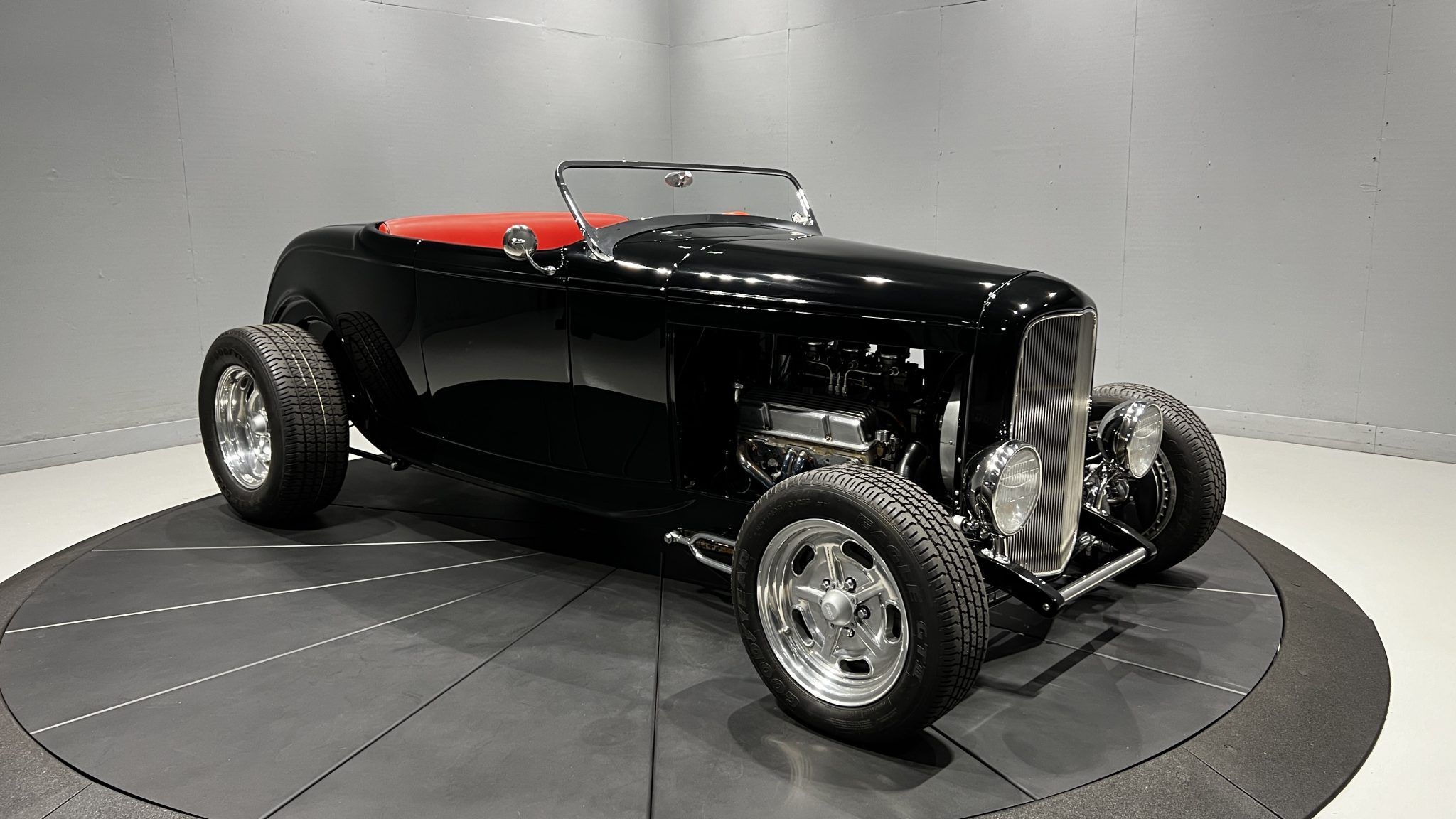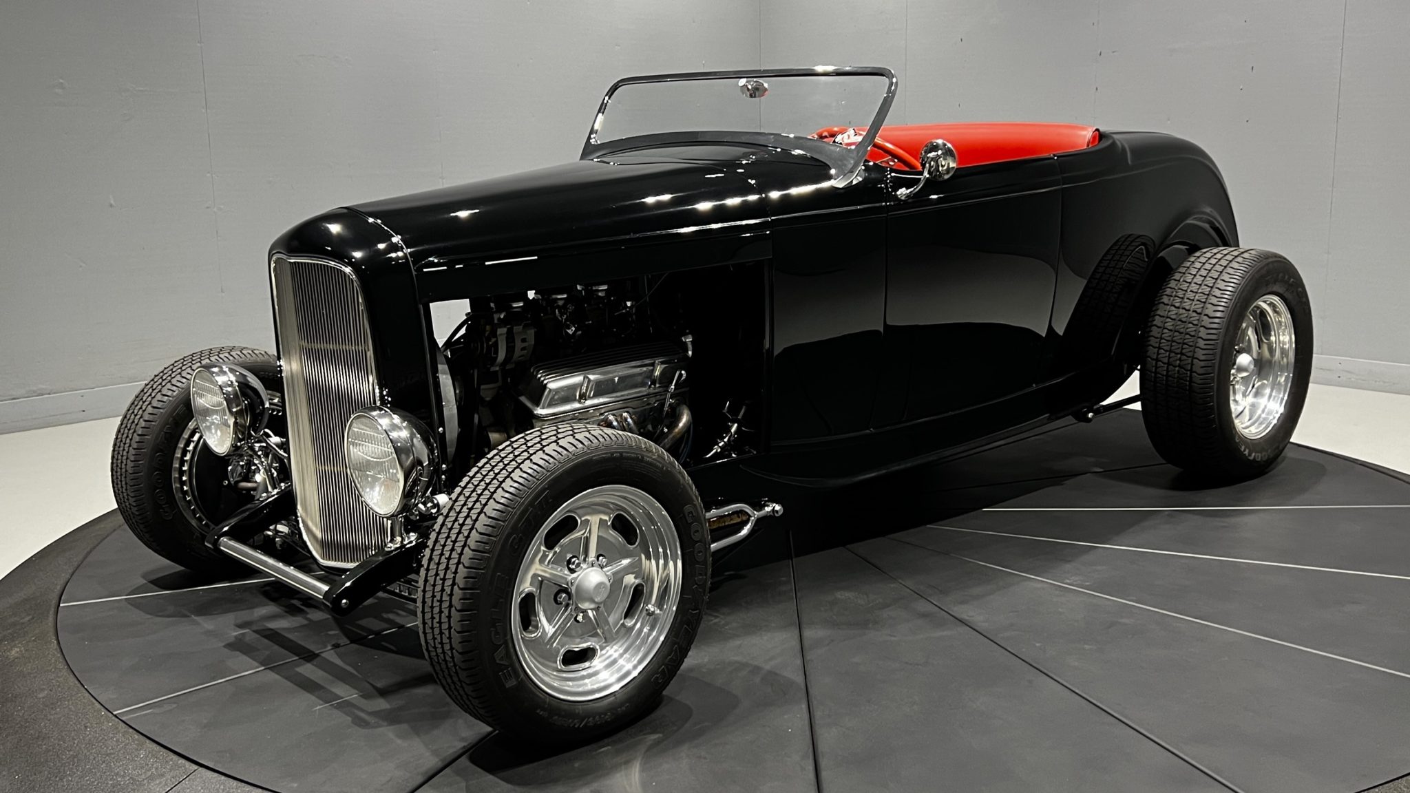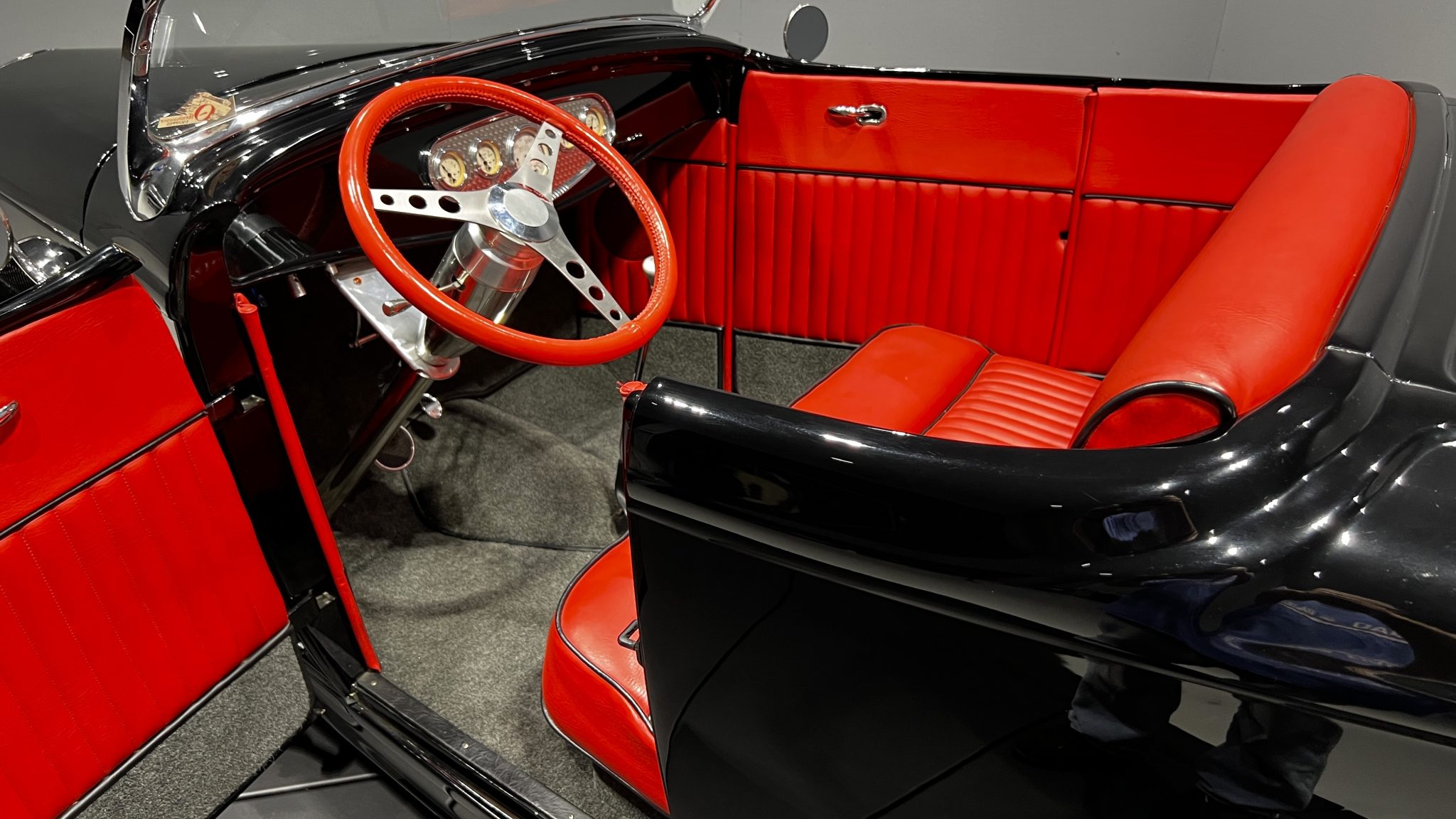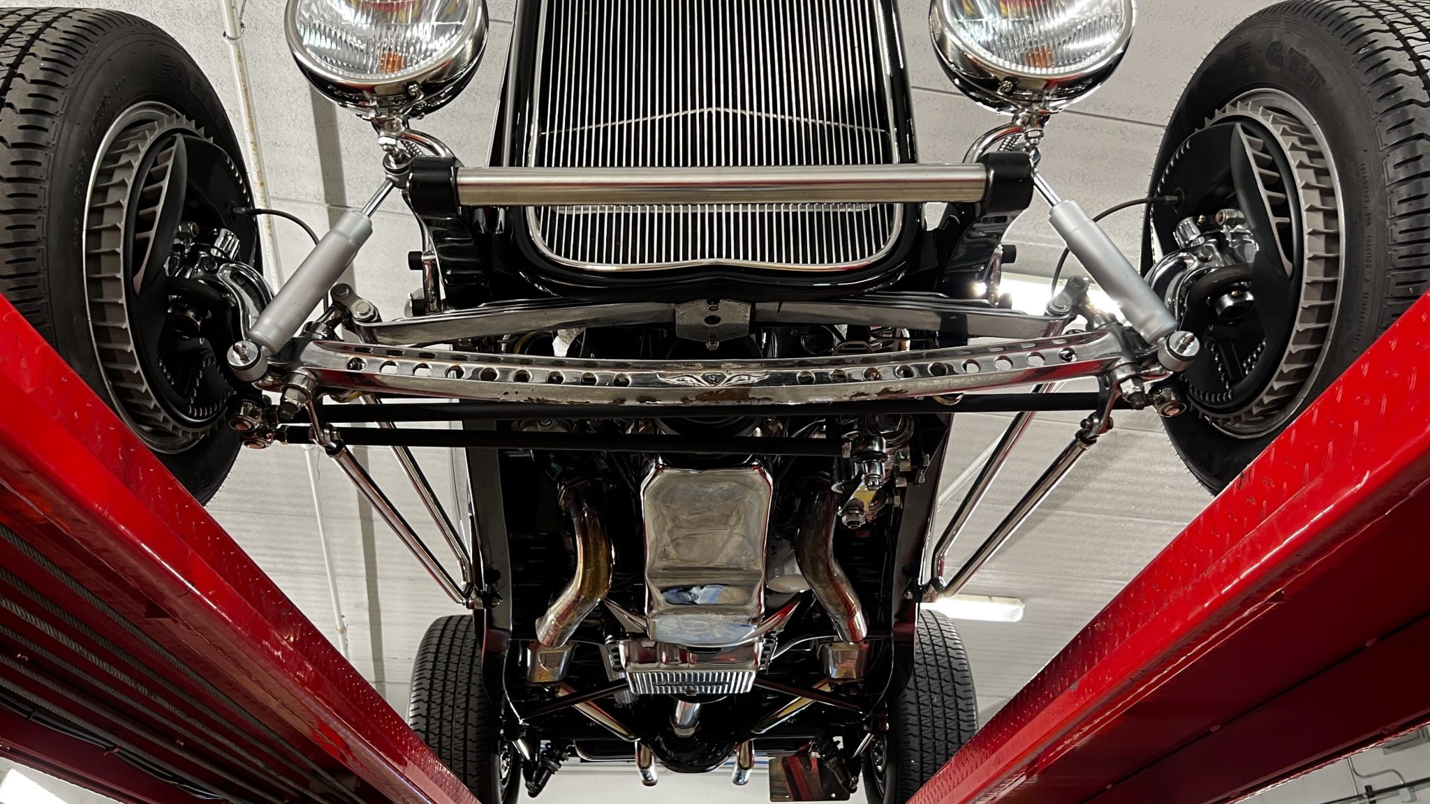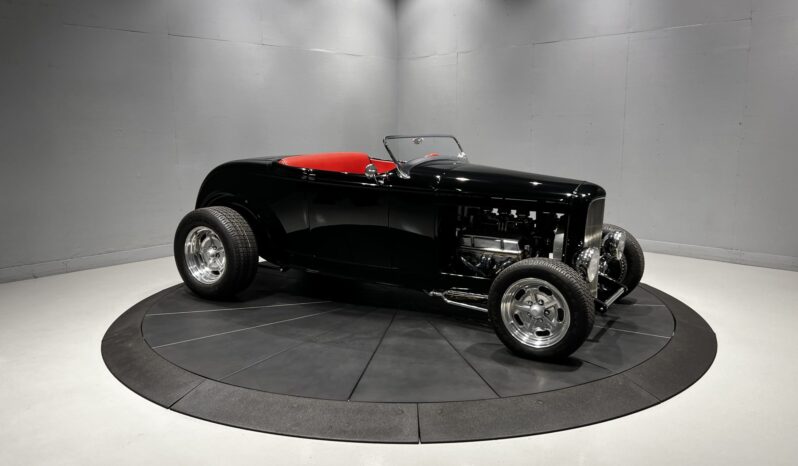 This ’32 Ford highboy was built between 2002–2003 using a steel body from Rod Bods and a boxed chassis. The car rides on a drop front end with a transverse leaf spring and radius rods, a four-link rear end, and staggered American Racing Salt Flat wheels. Power comes from a 383ci V8 equipped with AFR heads and three two-barrel carburetors, and it is linked to a 700R4 automatic and a Ford 9″ rear with a limited-slip differential and 3.70 gears. A hidden stereo is mounted under the bench seat with red upholstery, and the driver is provided a tilt column and a Lokar shifter.