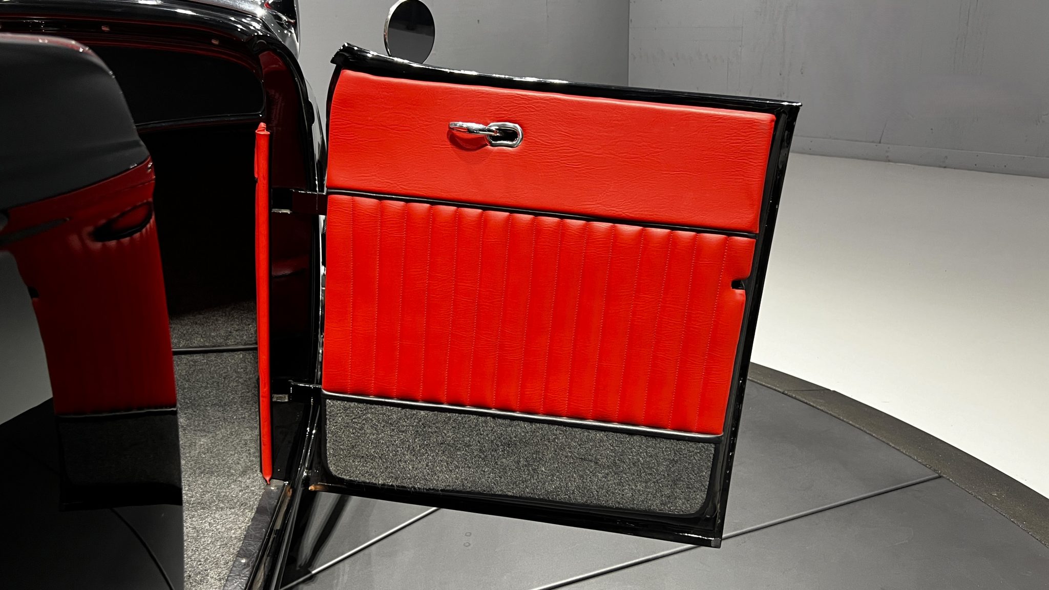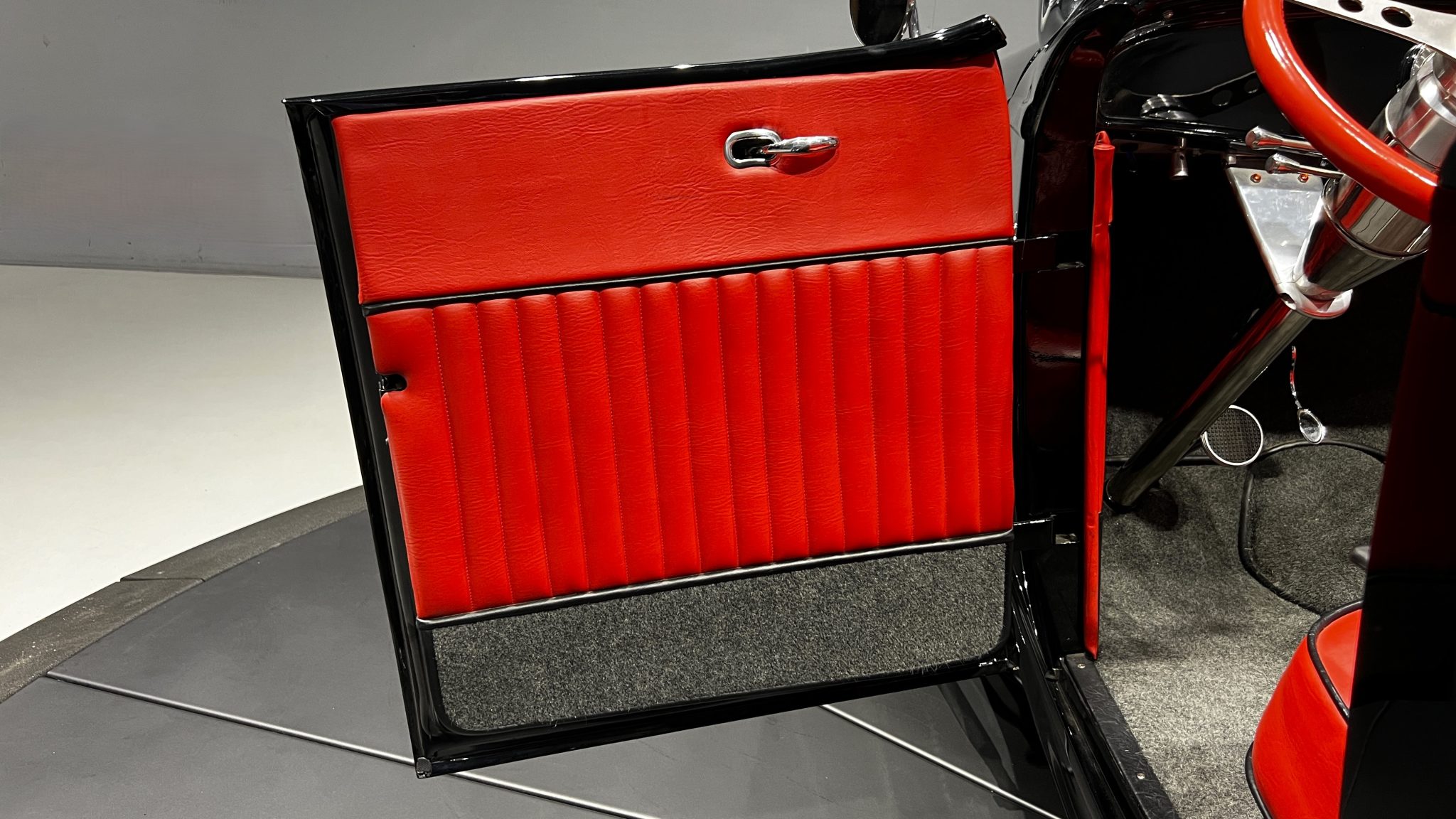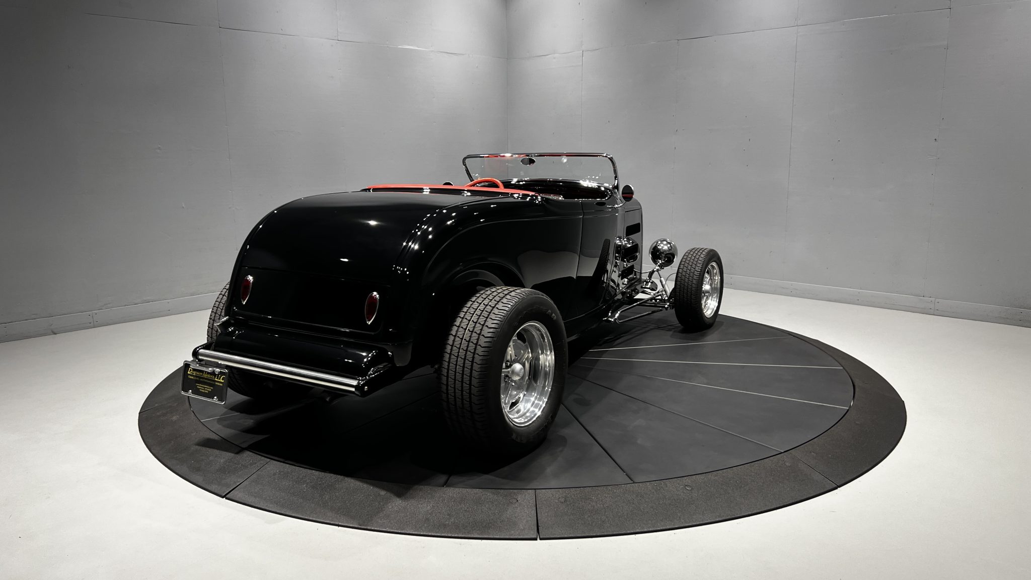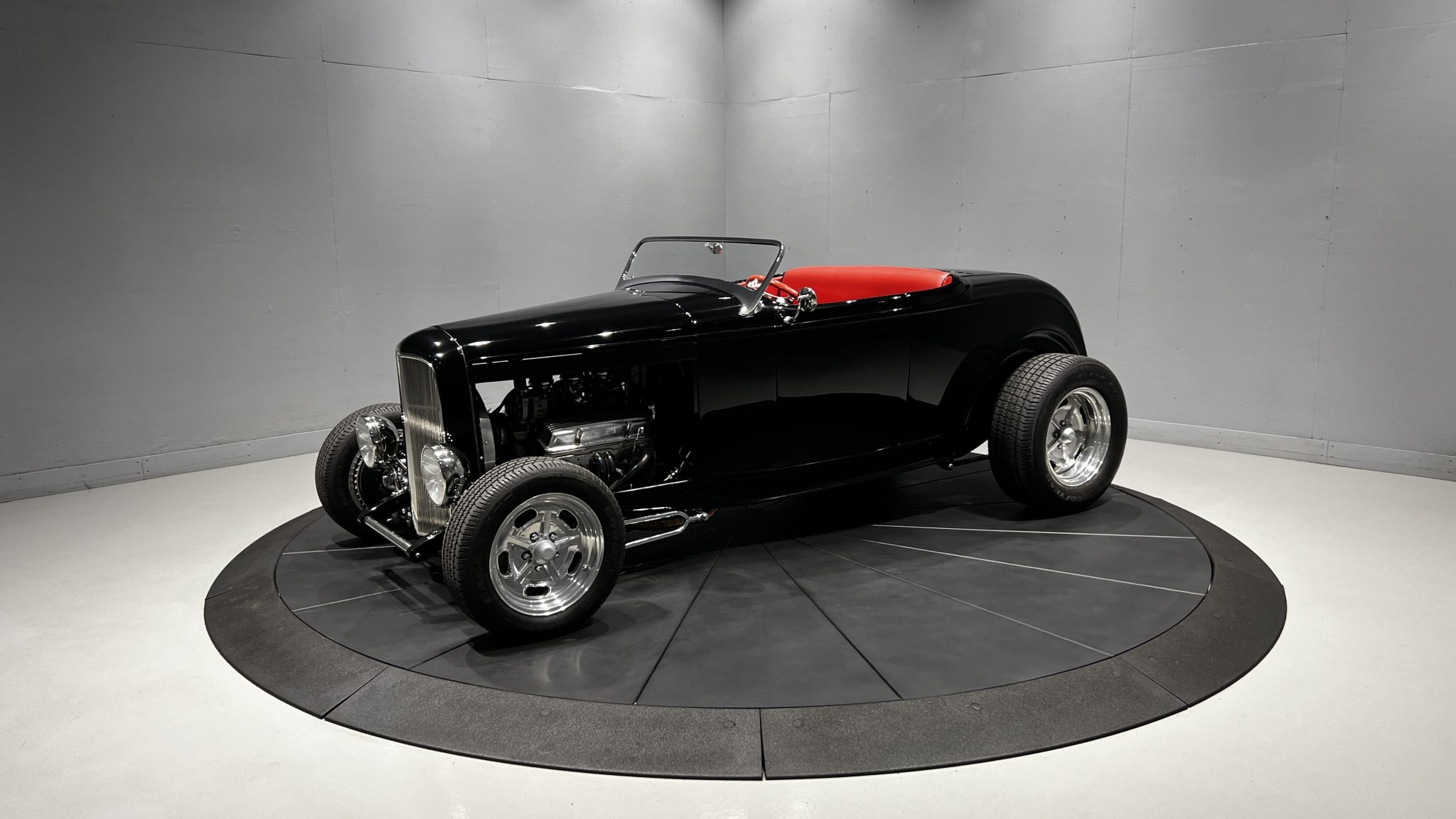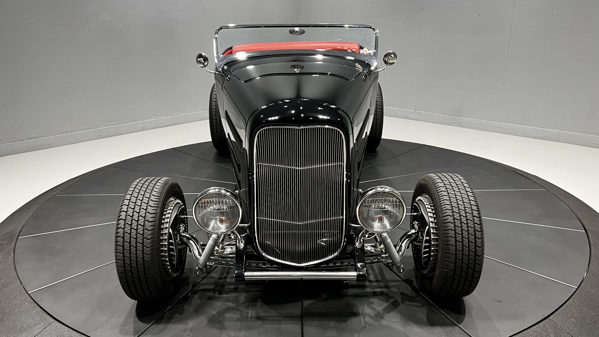 This ’32 Ford highboy was built between 2002–2003 using a steel body from Rod Bods and a boxed chassis. The car rides on a drop front end with a transverse leaf spring and radius rods, a four-link rear end, and staggered American Racing Salt Flat wheels. Power comes from a 383ci V8 equipped with AFR heads and three two-barrel carburetors, and it is linked to a 700R4 automatic and a Ford 9″ rear with a limited-slip differential and 3.70 gears. A hidden stereo is mounted under the bench seat with red upholstery, and the driver is provided a tilt column and a Lokar shifter.