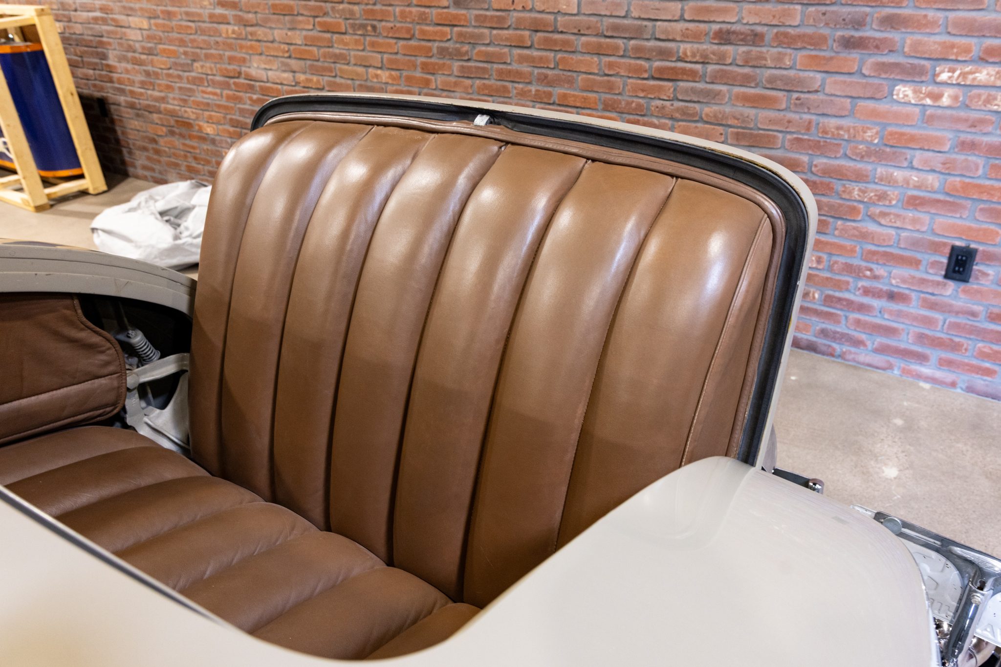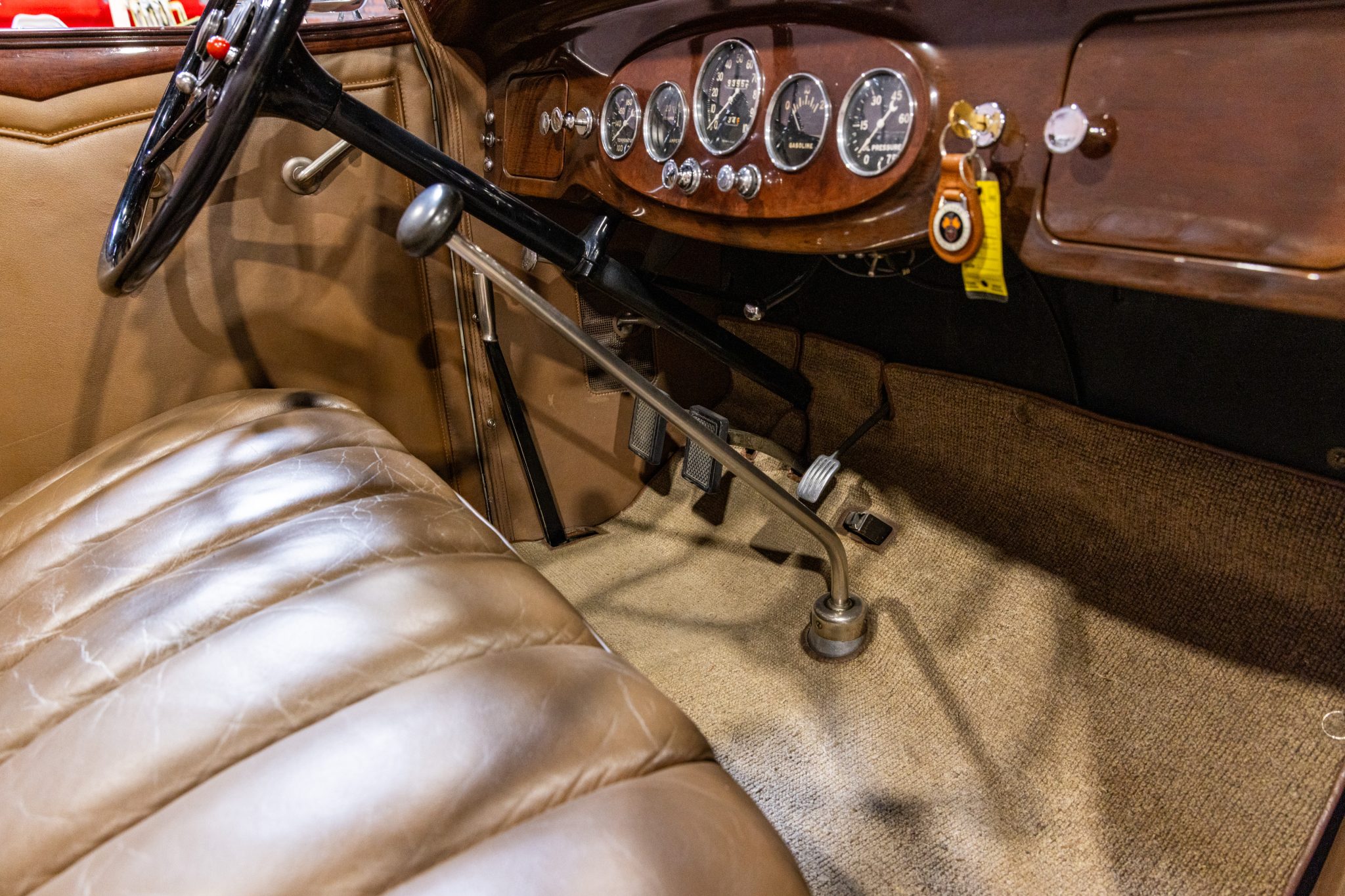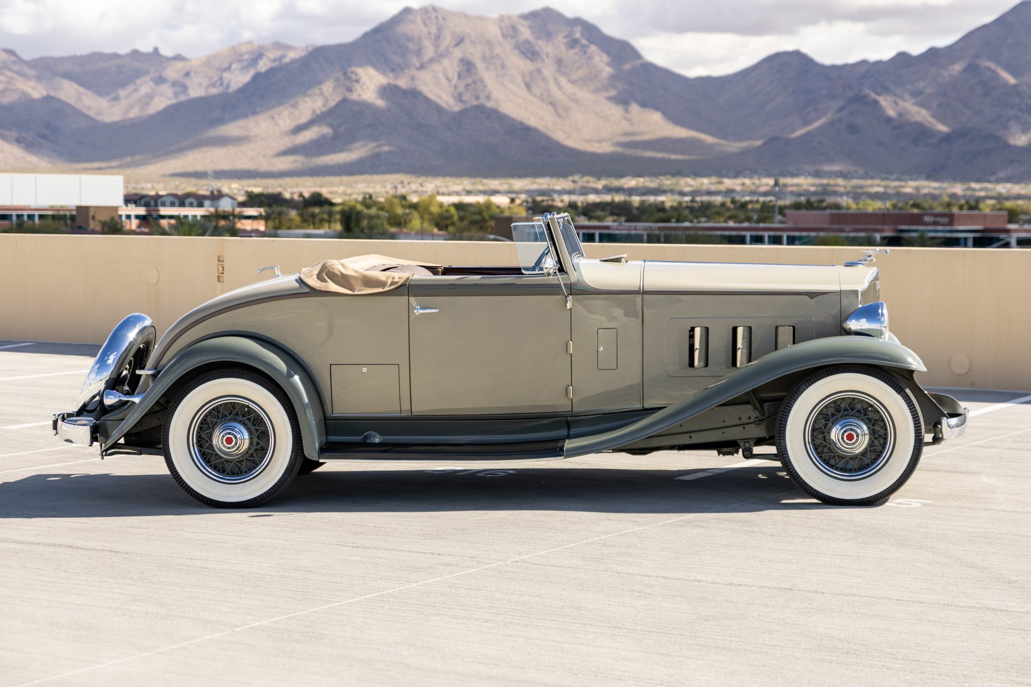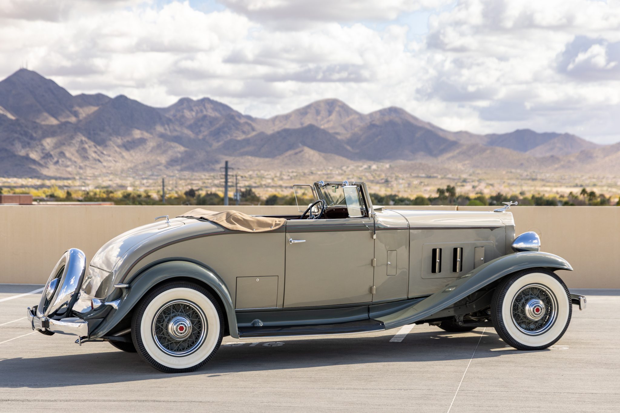 The car is finished in beige with gray fenders and red pinstripes, and power comes from a 320ci L-head inline-eight. Additional features include a three-speed manual transmission with synchromesh on its top two gears, mechanically actuated four-wheel drum brakes, adjustable hydraulic shock absorbers, 17” painted wire wheels, a rear-mount spare, a tan convertible top, golf bag door, brown leather interior upholstery, and a rumble seat.
