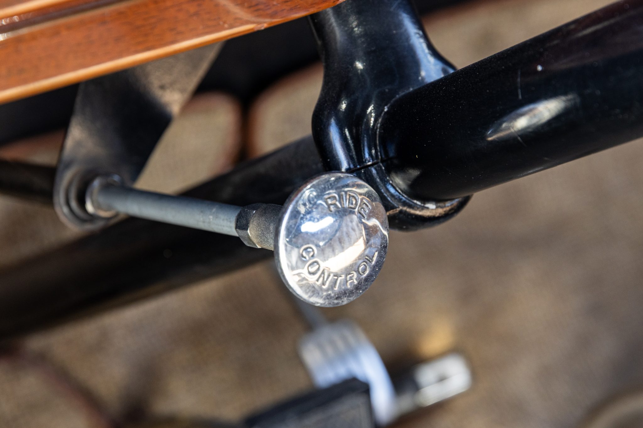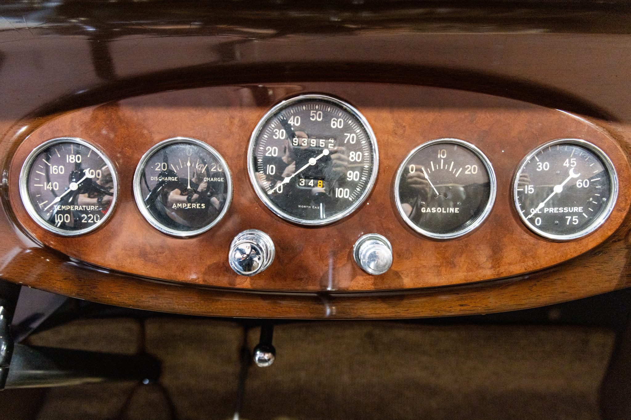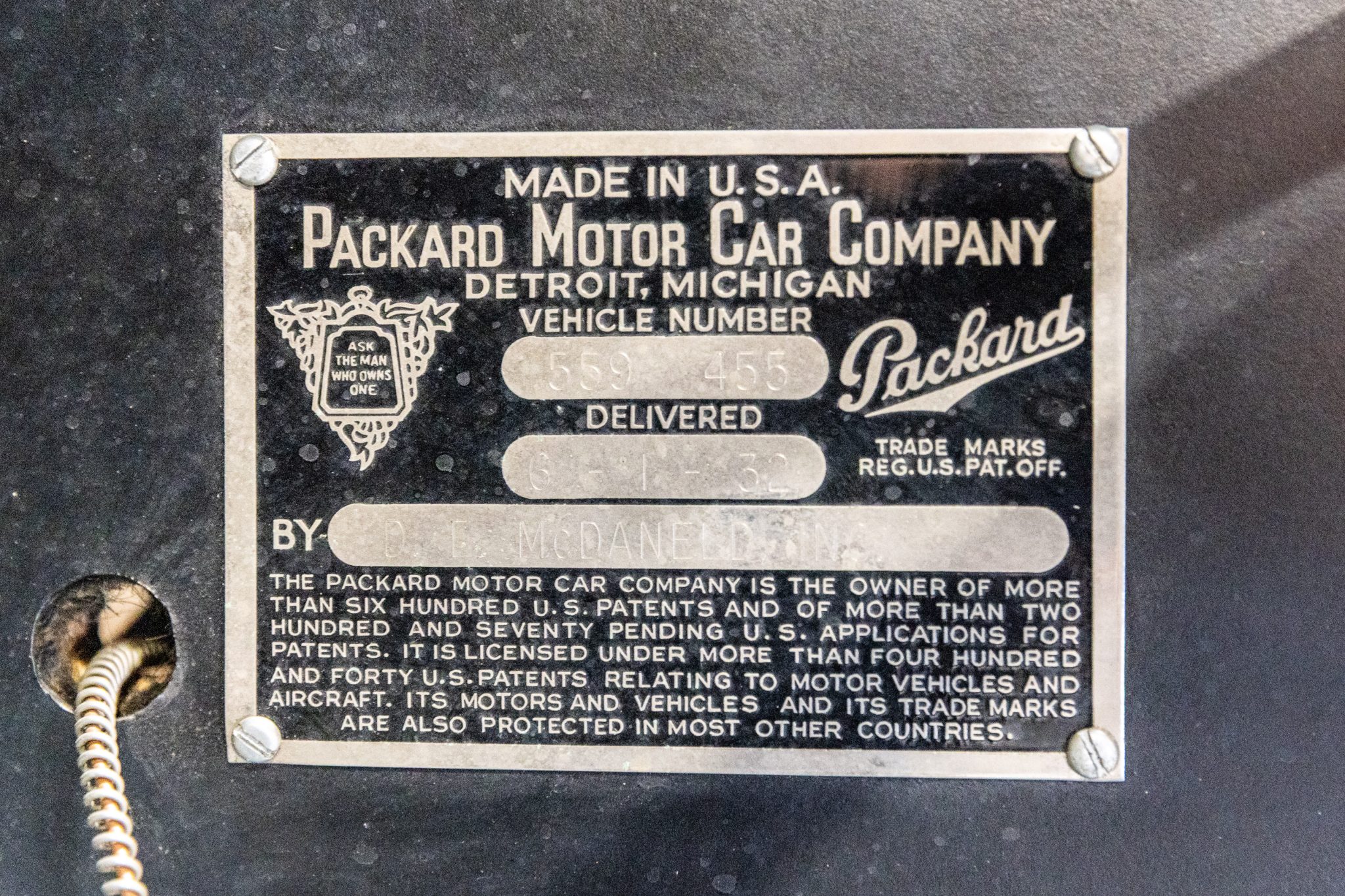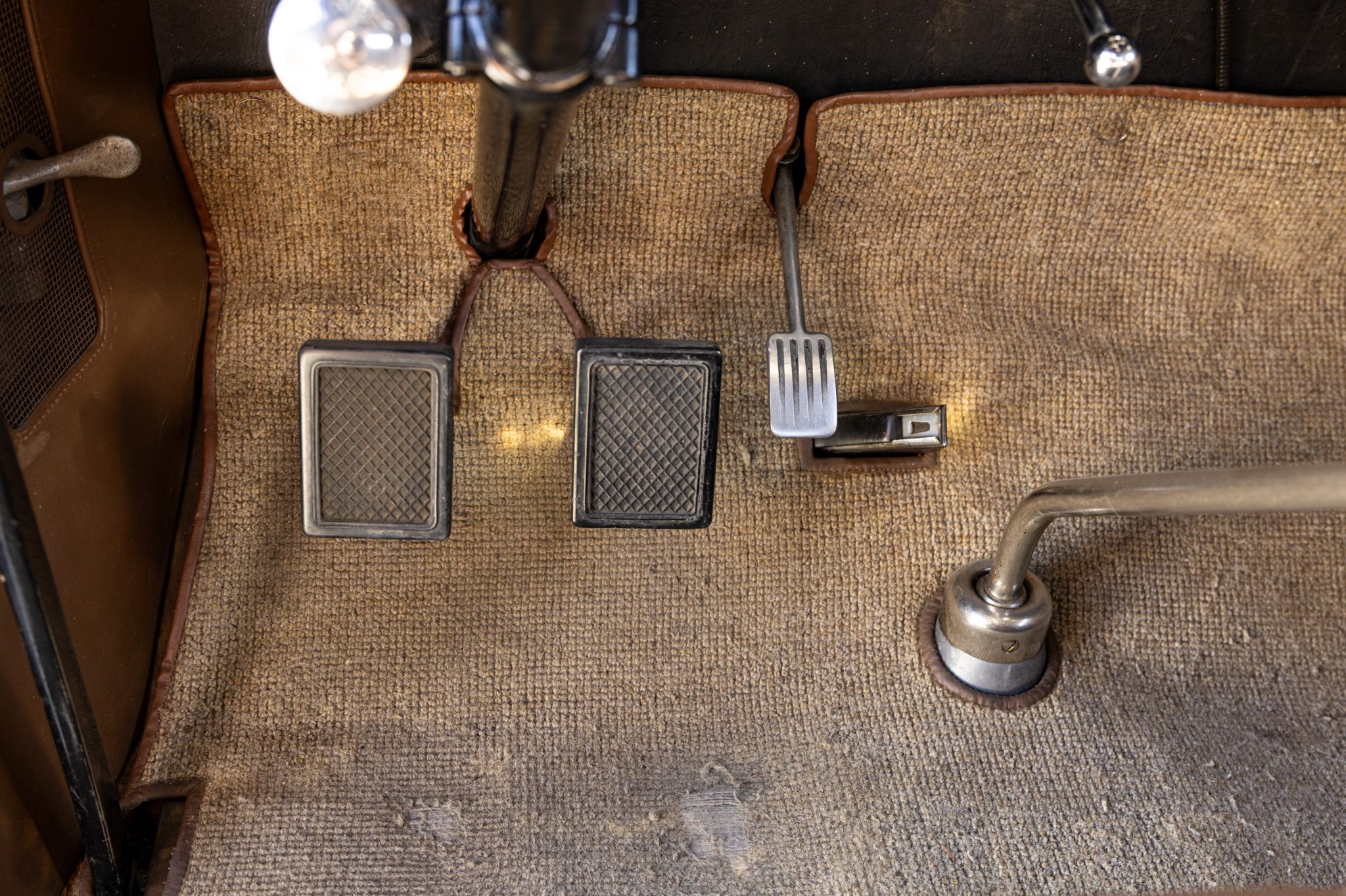 The car is finished in beige with gray fenders and red pinstripes, and power comes from a 320ci L-head inline-eight. Additional features include a three-speed manual transmission with synchromesh on its top two gears, mechanically actuated four-wheel drum brakes, adjustable hydraulic shock absorbers, 17” painted wire wheels, a rear-mount spare, a tan convertible top, golf bag door, brown leather interior upholstery, and a rumble seat.