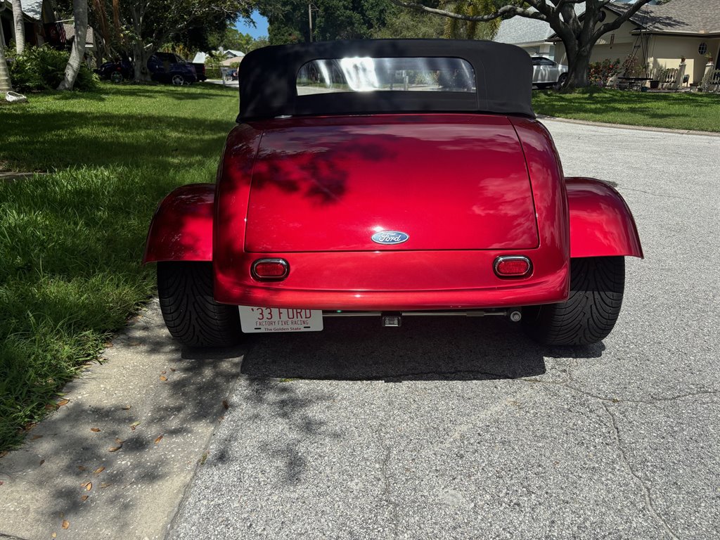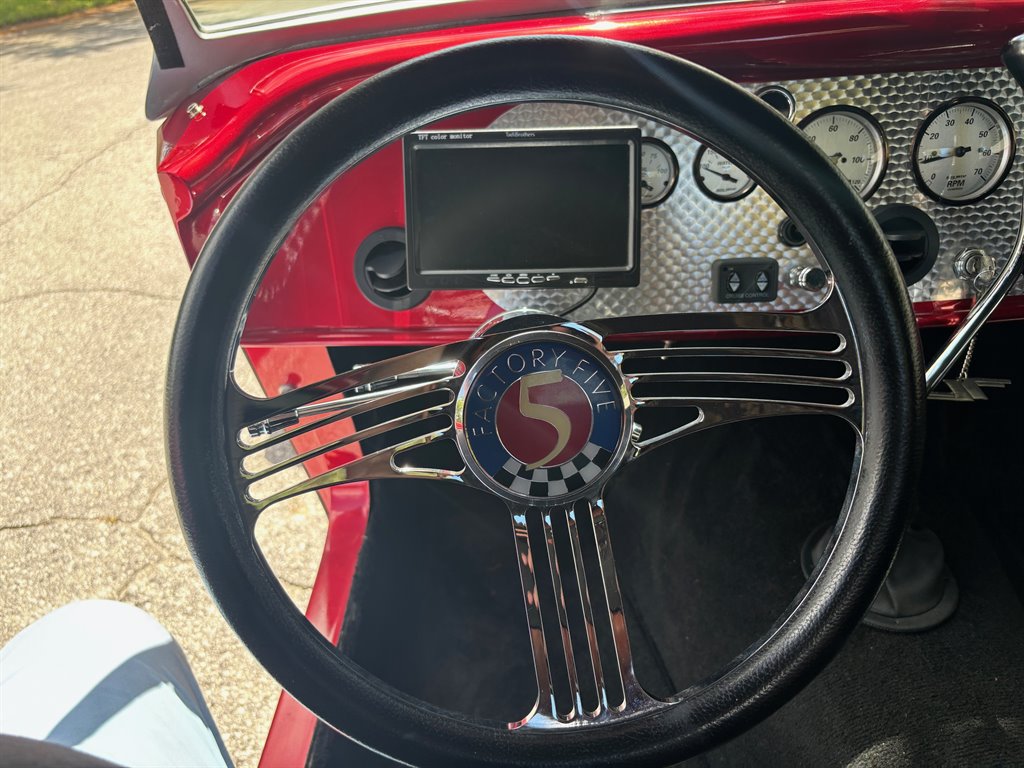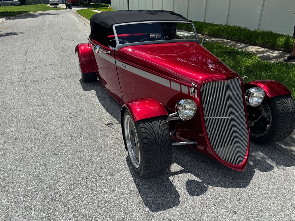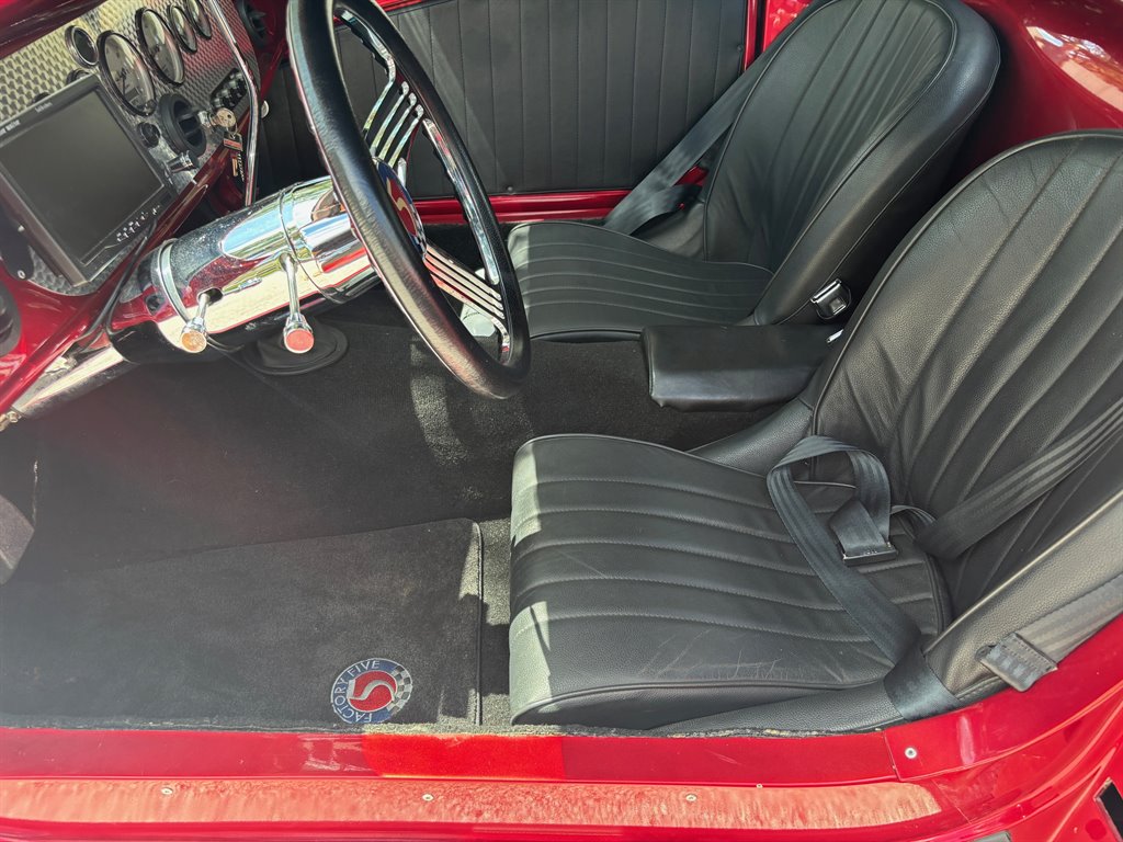 This ’33 Ford roadster was sourced from Factory Five Racing and built around 2010. It is powered by a 302ci V8 topped by a four-barrel carburetor and linked to a three-speed automatic. The fiberglass bodywork has been painted Candy Apple Red with silver stripes, and it rides on a fabricated tubular chassis with an independent front end and four-wheel discs. Inside are bucket seats, a tilt column, Auto Meter gauges set in an engine-turned panel, air conditioning, cruise control, and an integrated roll bar.