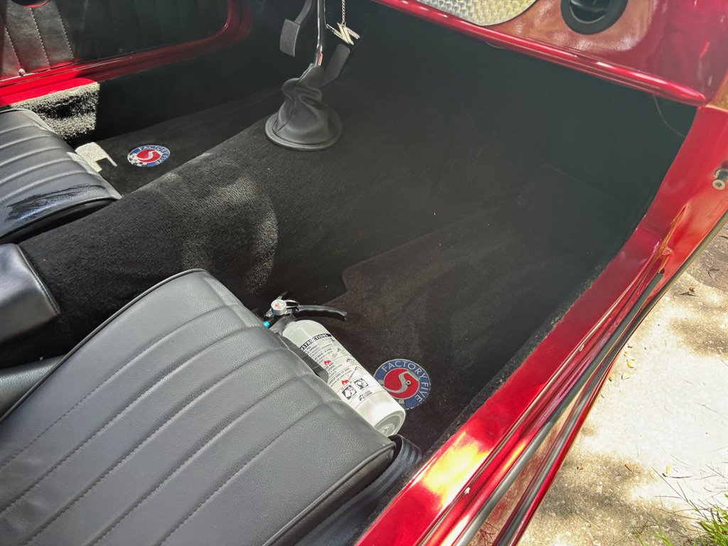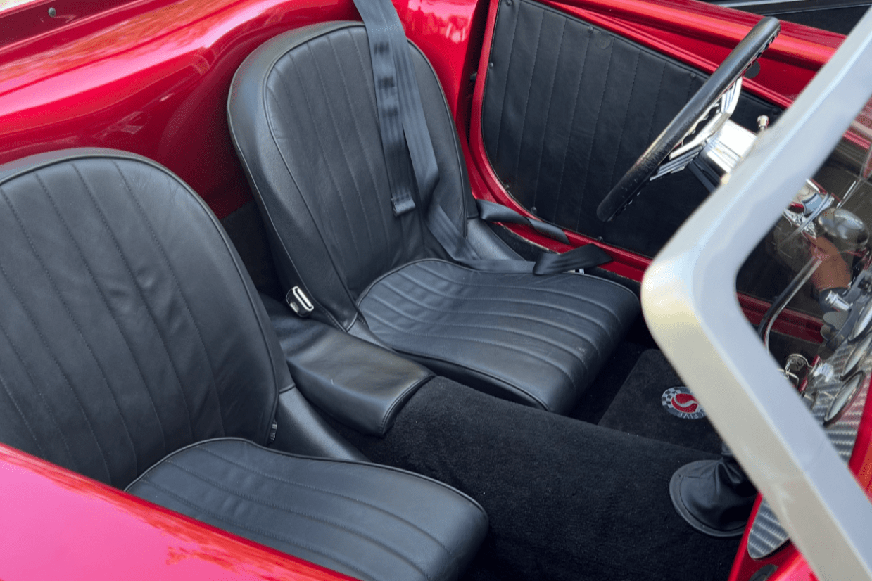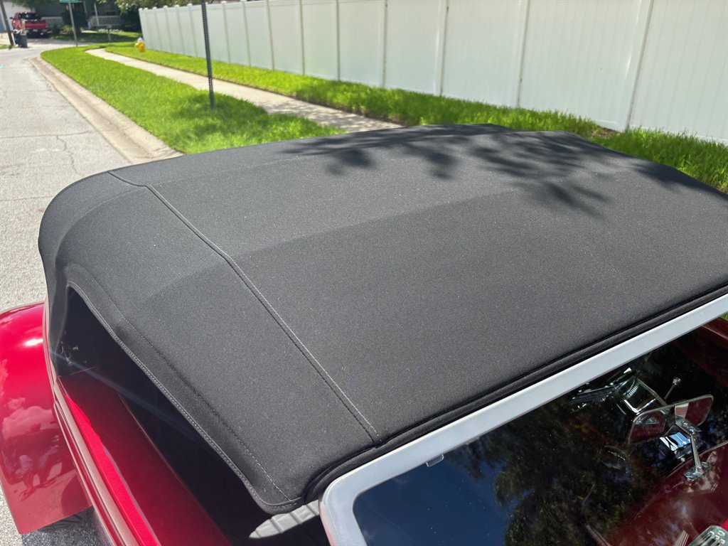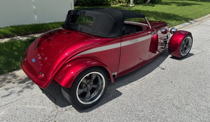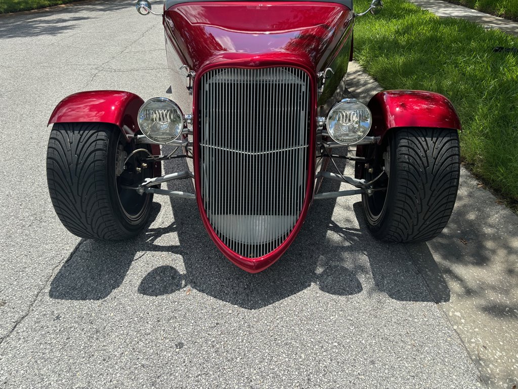 This ’33 Ford roadster was sourced from Factory Five Racing and built around 2010. It is powered by a 302ci V8 topped by a four-barrel carburetor and linked to a three-speed automatic. The fiberglass bodywork has been painted Candy Apple Red with silver stripes, and it rides on a fabricated tubular chassis with an independent front end and four-wheel discs. Inside are bucket seats, a tilt column, Auto Meter gauges set in an engine-turned panel, air conditioning, cruise control, and an integrated roll bar.