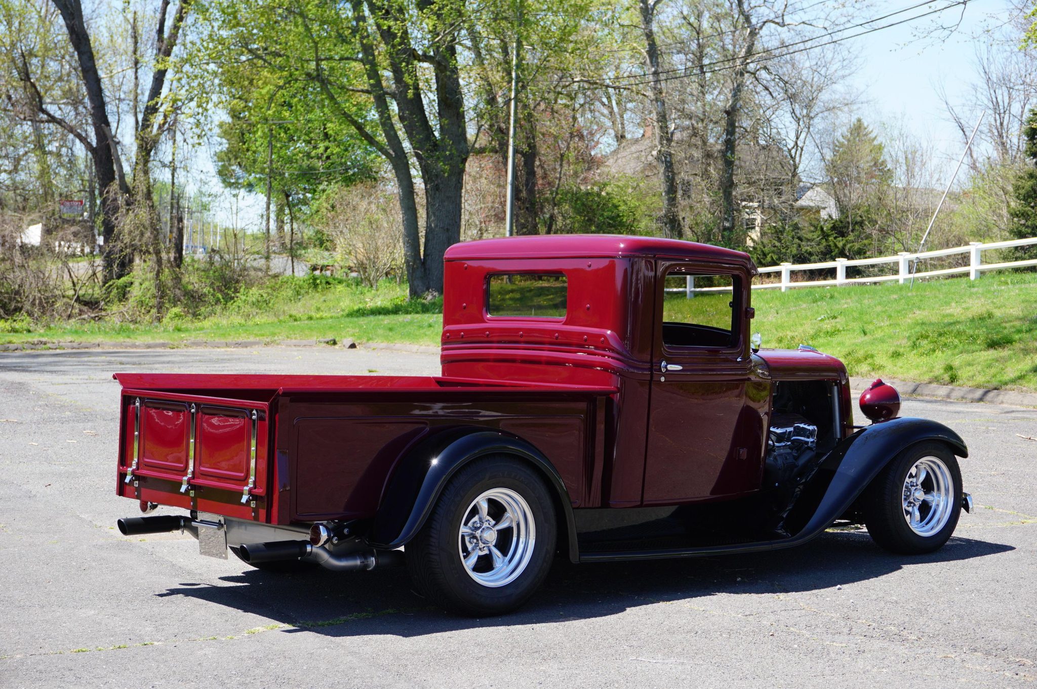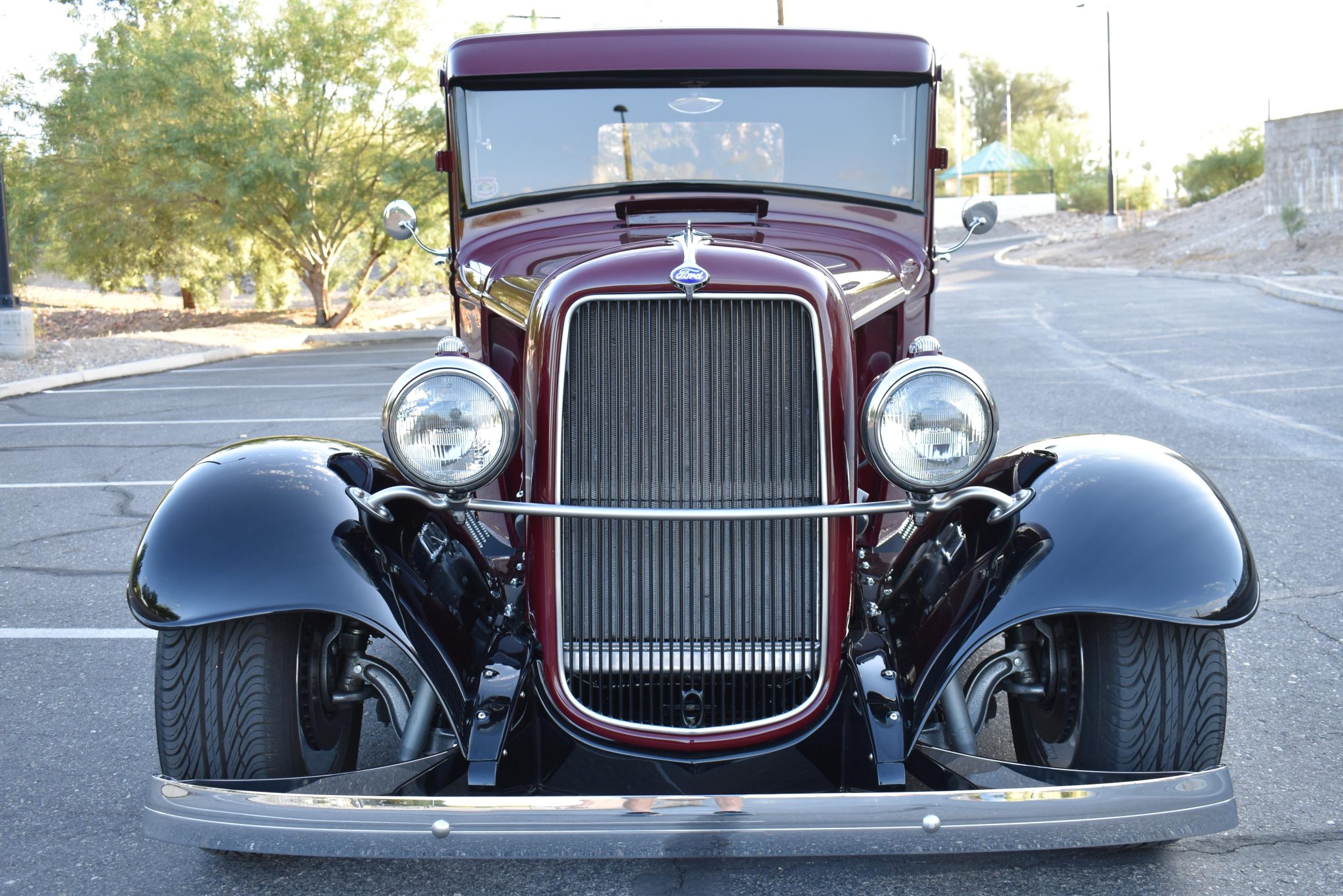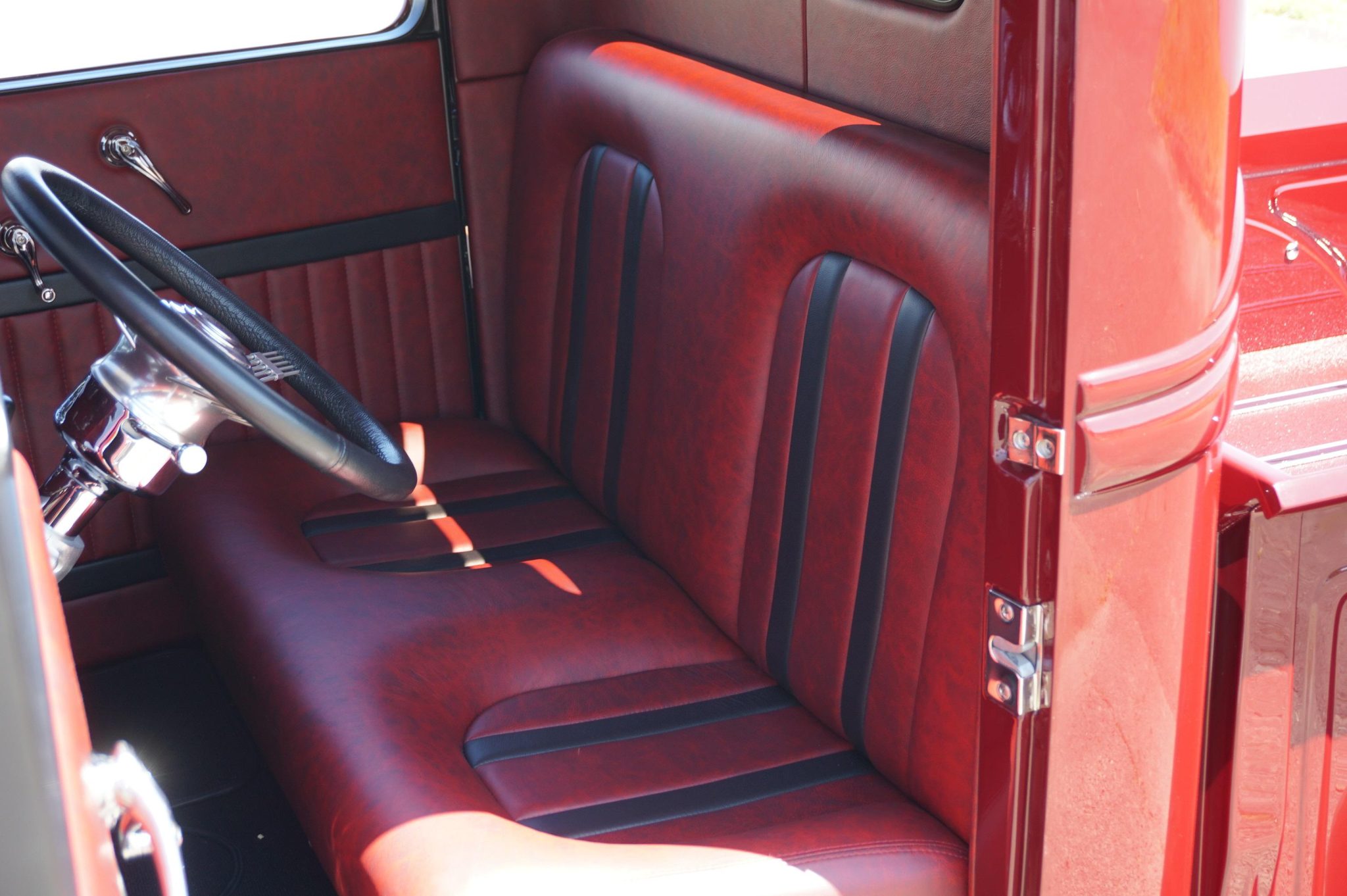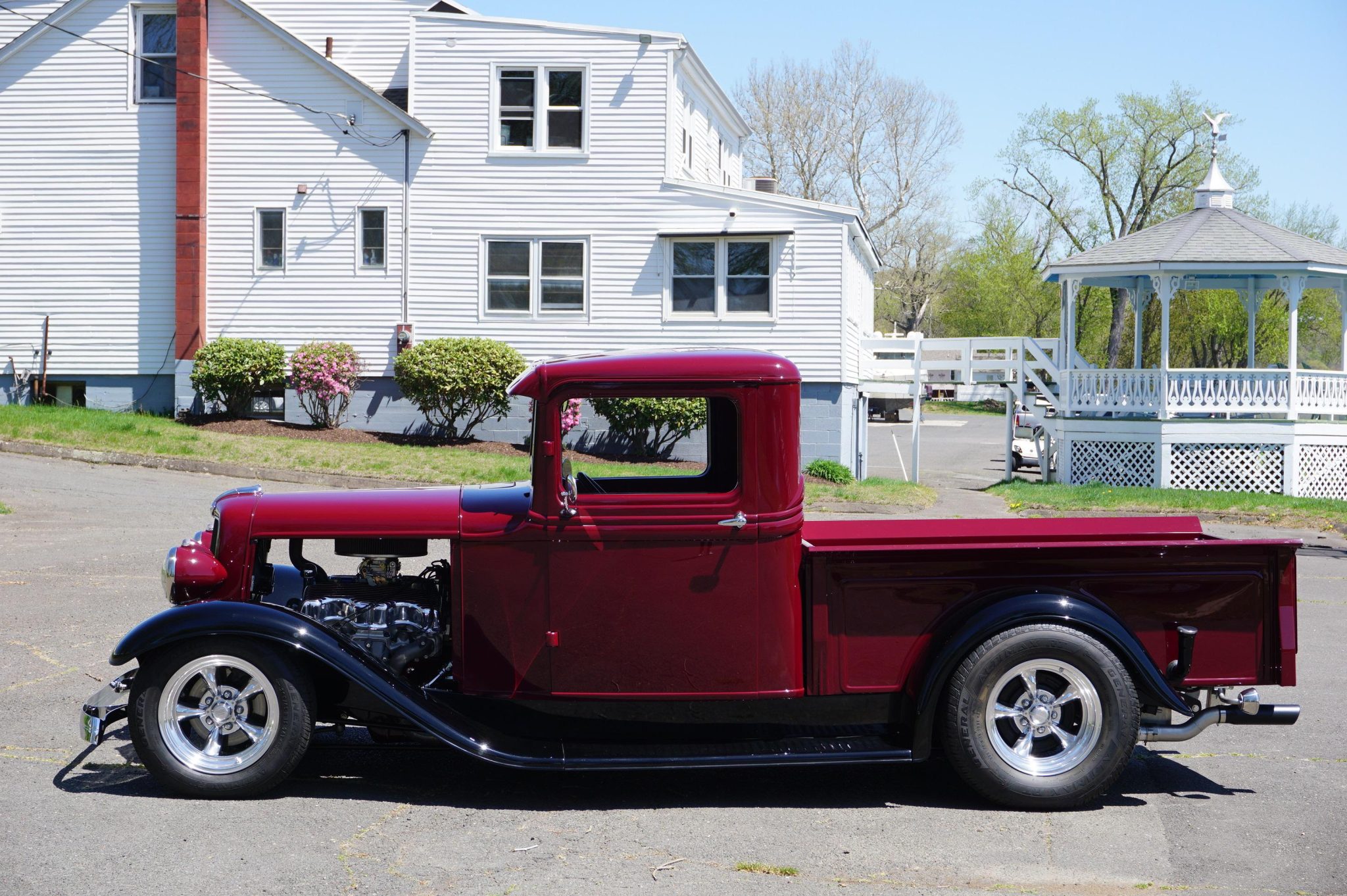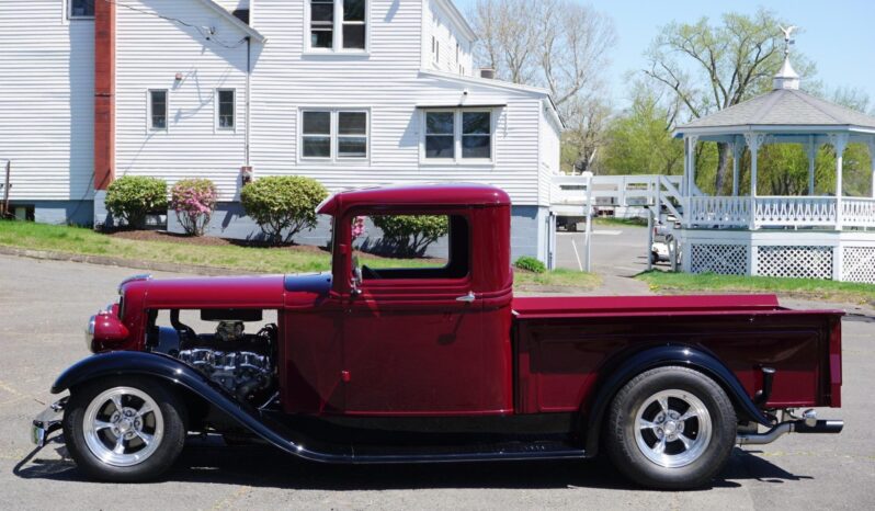 This custom Ford pickup was built around 2016 using a 1934 steel body that was chopped and modified, and it is mounted on a Cornhusker Rod & Custom chassis. Power comes from a Chevrolet 409ci V8 topped by Edelbrock aluminum heads, an aluminum intake manifold, and a four-barrel carburetor, and it is linked to a 700R4 automatic transmission and a Ford rear end. The truck rides on a modified suspension with a Super Bell drop axle, hairpin radius rods, and a transverse leaf spring up front, while out back is a triangulated four-link setup with coilovers. The maroon-and-black exterior is complemented by a color-coordinated interior featuring a Limeworks column, a banjo-style steering wheel, a Lokar shifter, a crank-out windshield, So-Cal instruments