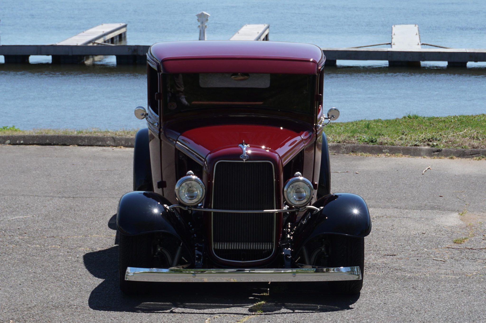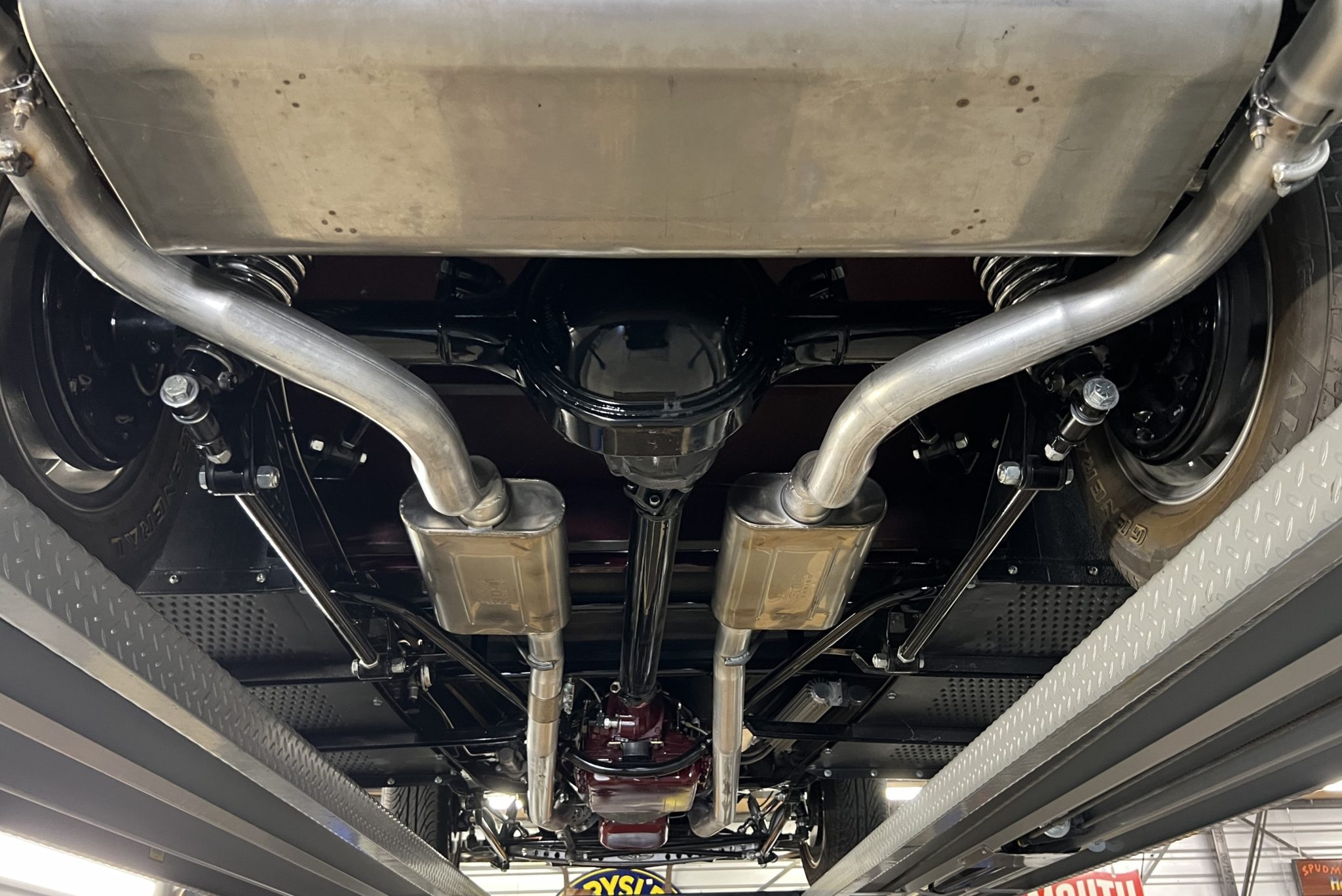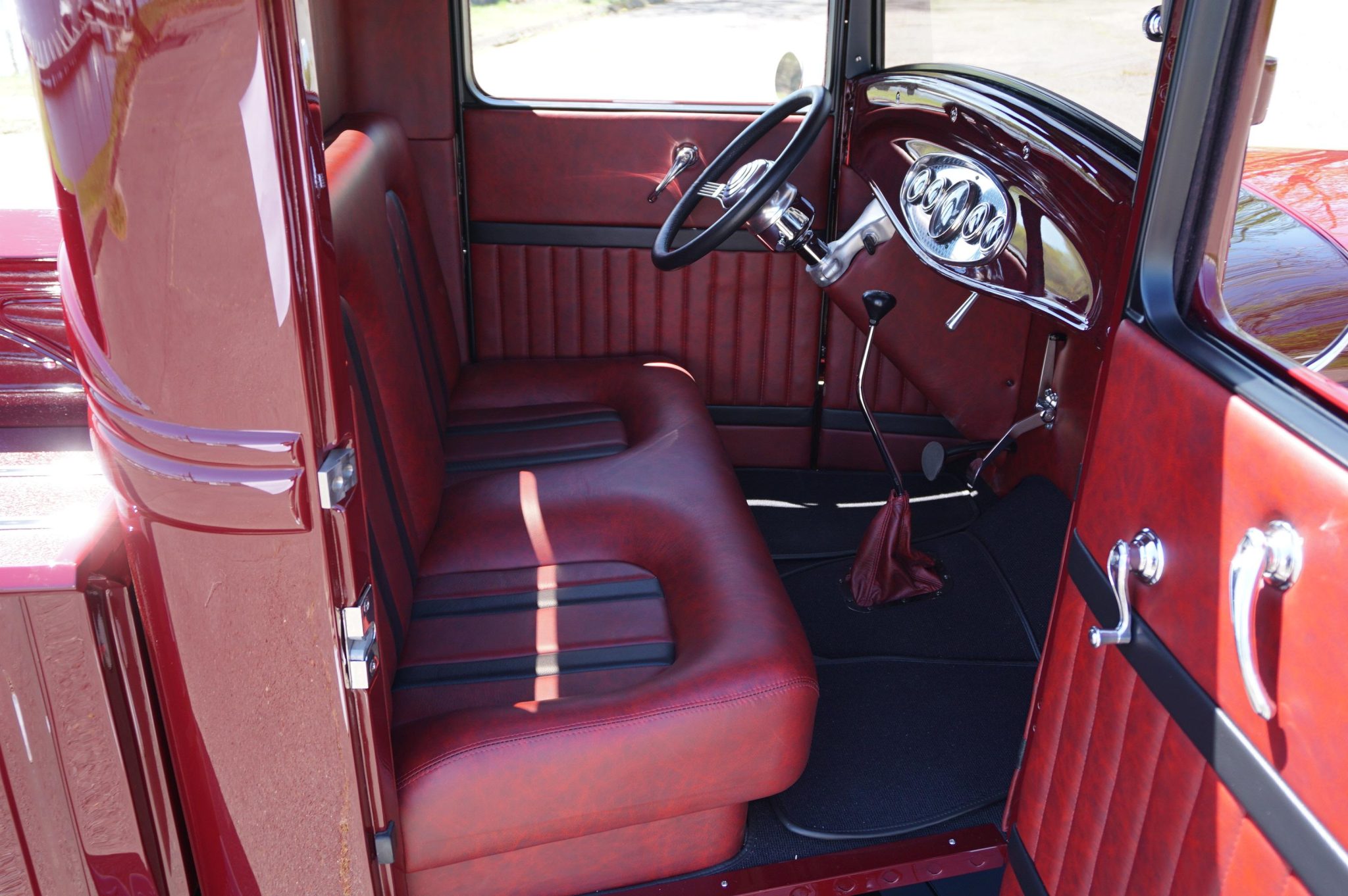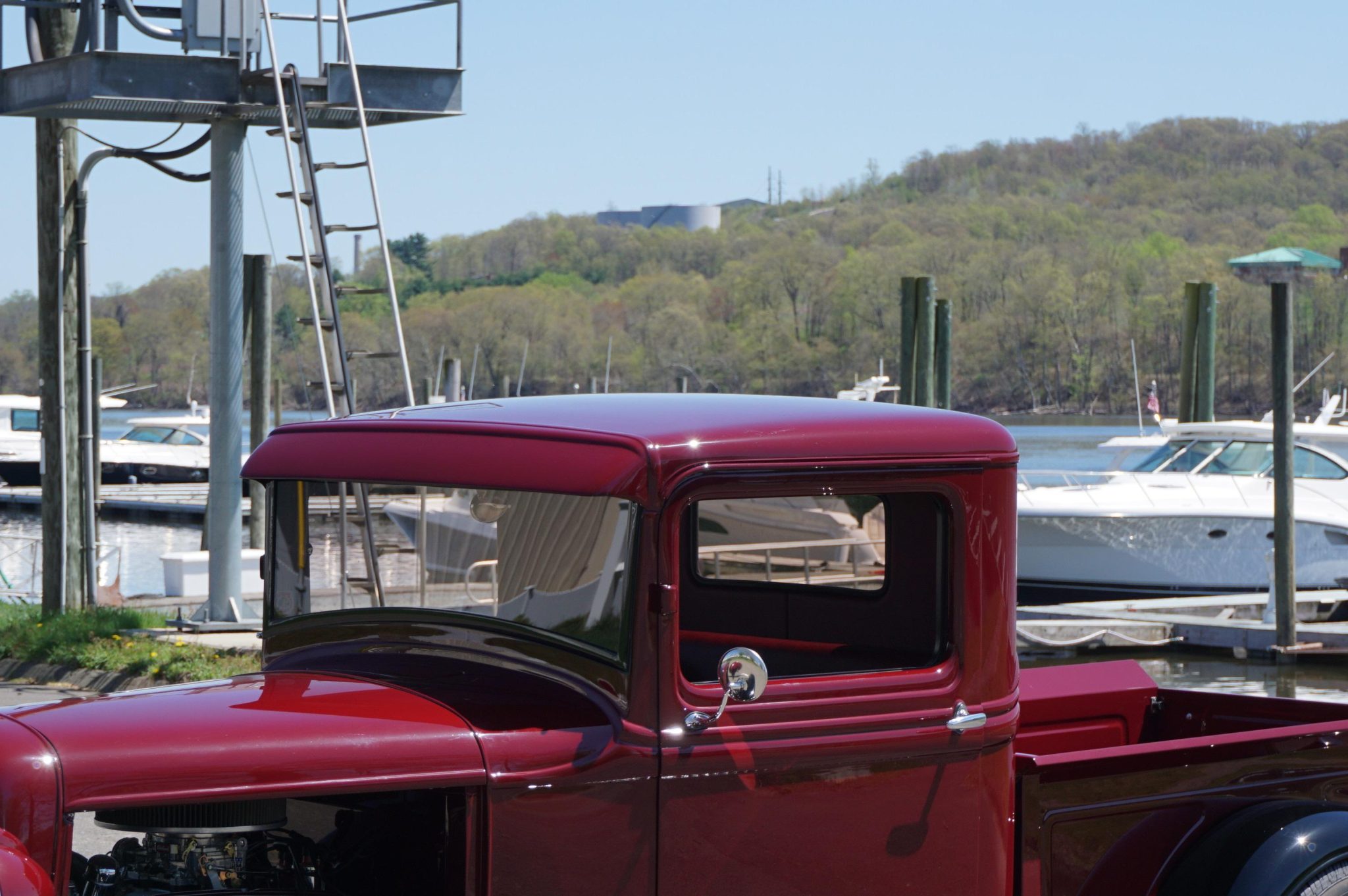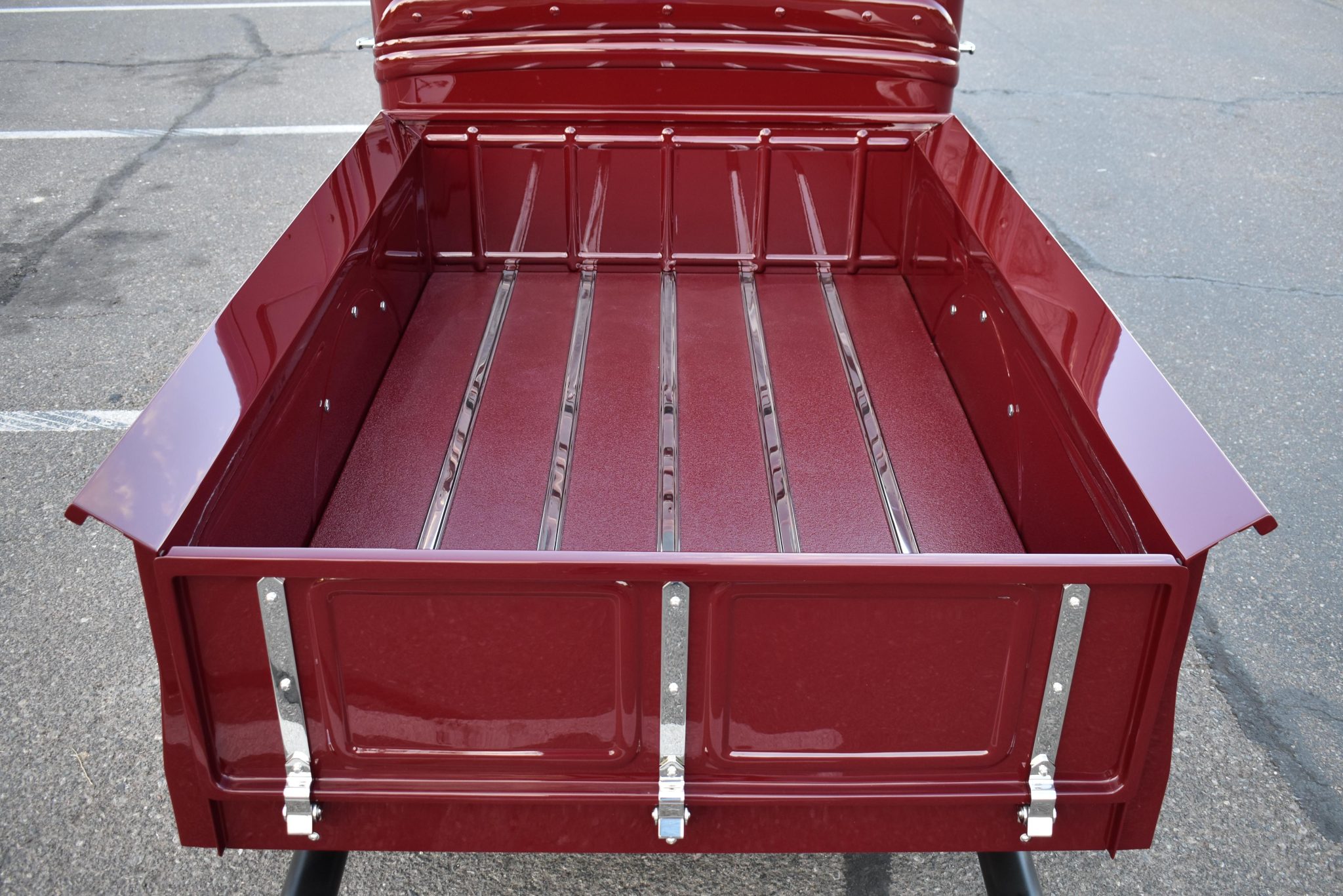 This custom Ford pickup was built around 2016 using a 1934 steel body that was chopped and modified, and it is mounted on a Cornhusker Rod & Custom chassis. Power comes from a Chevrolet 409ci V8 topped by Edelbrock aluminum heads, an aluminum intake manifold, and a four-barrel carburetor, and it is linked to a 700R4 automatic transmission and a Ford rear end. The truck rides on a modified suspension with a Super Bell drop axle, hairpin radius rods, and a transverse leaf spring up front, while out back is a triangulated four-link setup with coilovers. The maroon-and-black exterior is complemented by a color-coordinated interior featuring a Limeworks column, a banjo-style steering wheel, a Lokar shifter, a crank-out windshield, So-Cal instruments