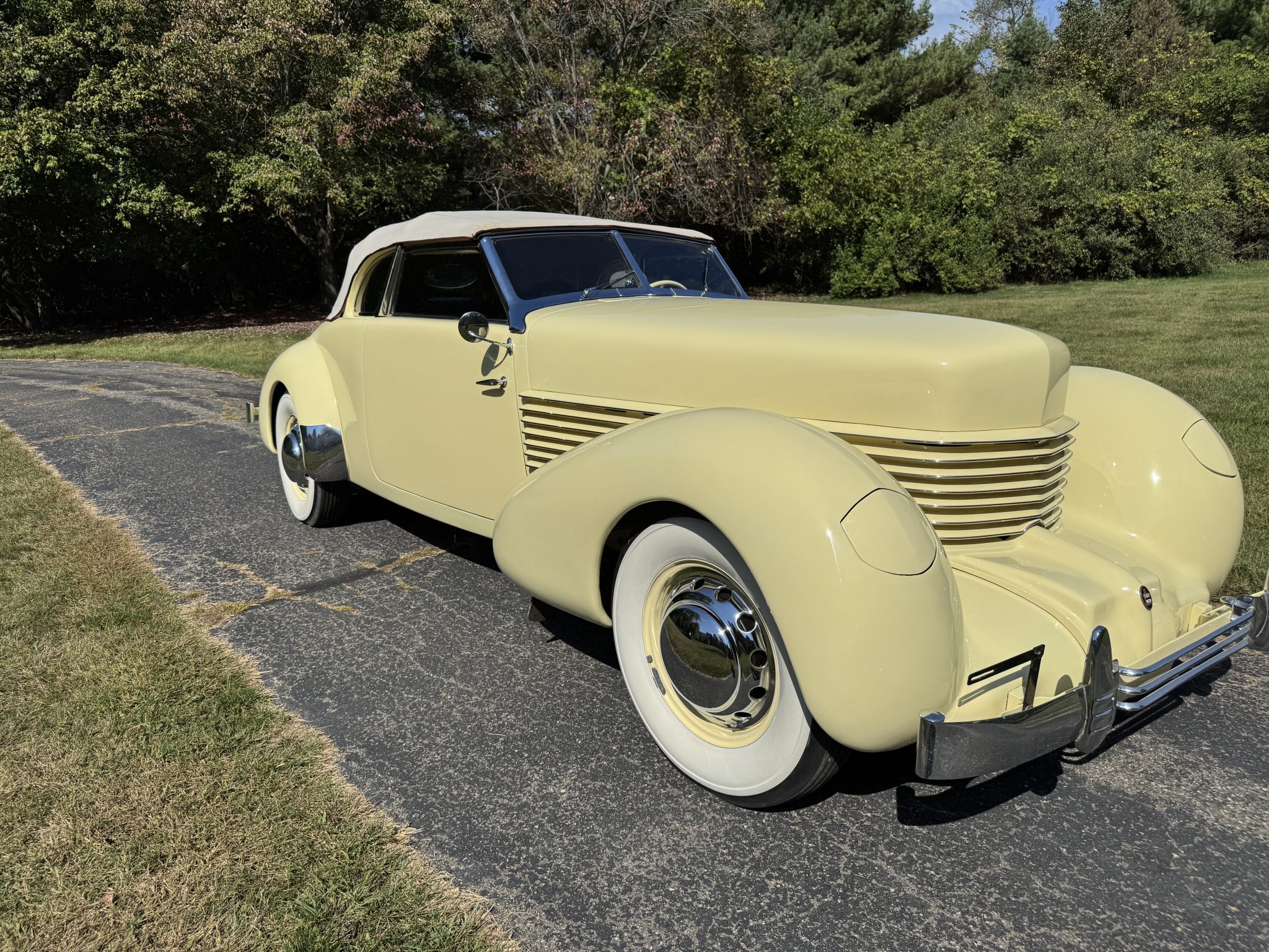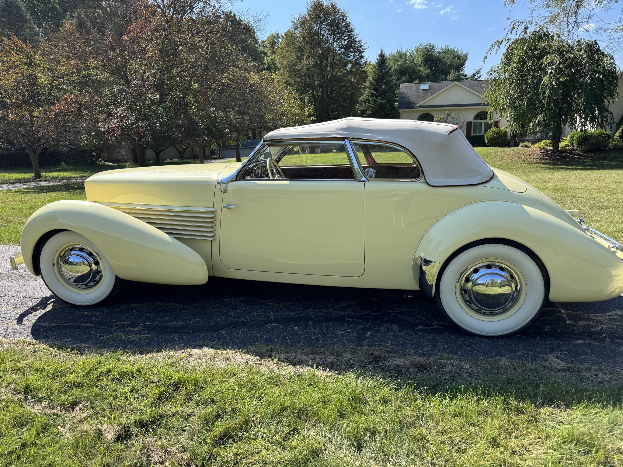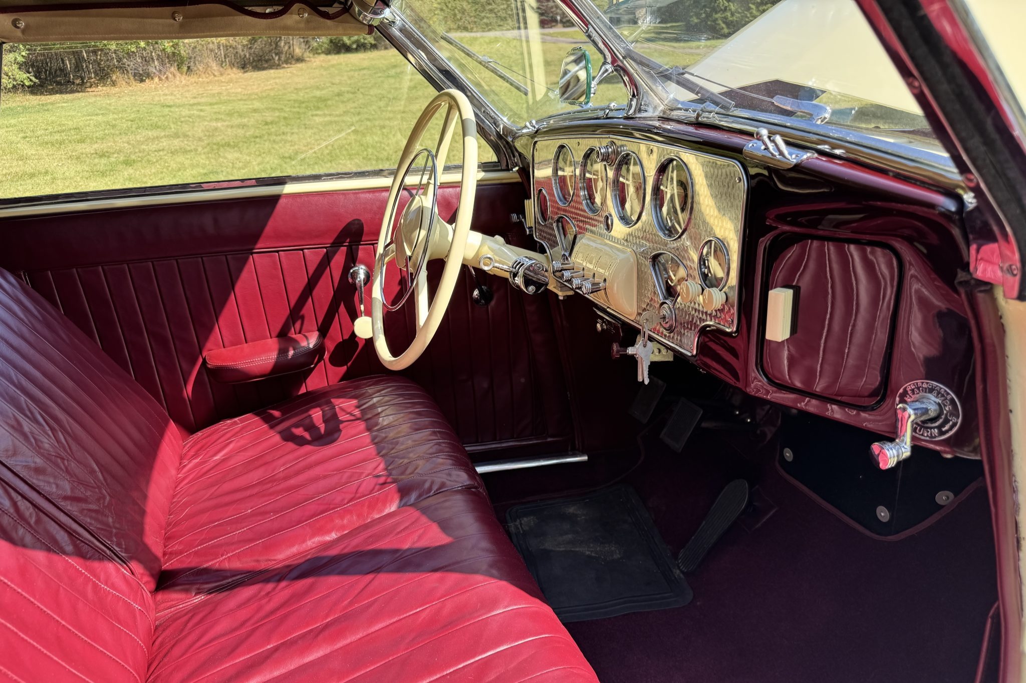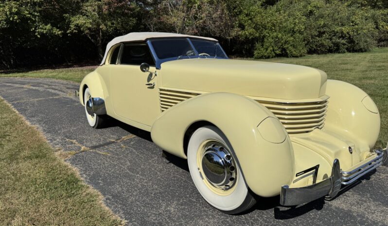 Chassis 2339H was repainted in cream in 1989 and subsequently earned a first-place award at the ACD Club 38th Annual Reunion in 1993 as well as a Best 810/812 Cord award at the Great Lakes Region ACD Mini Meet in 1997. Power comes from a 289ci Lycoming V8 that drives the front wheels via a vacuum-operated four-speed preselector transaxle, and equipment includes a backup electric fuel pump, independent front suspension, 16″ body-color steel wheels, mechanically operated pop-up headlights, and a beige convertible top. Inside, the cabin is trimmed in maroon leather upholstery and features a Cord AM radio, an engine-turned dash panel, and a Bendix “electric hand” gear selector.