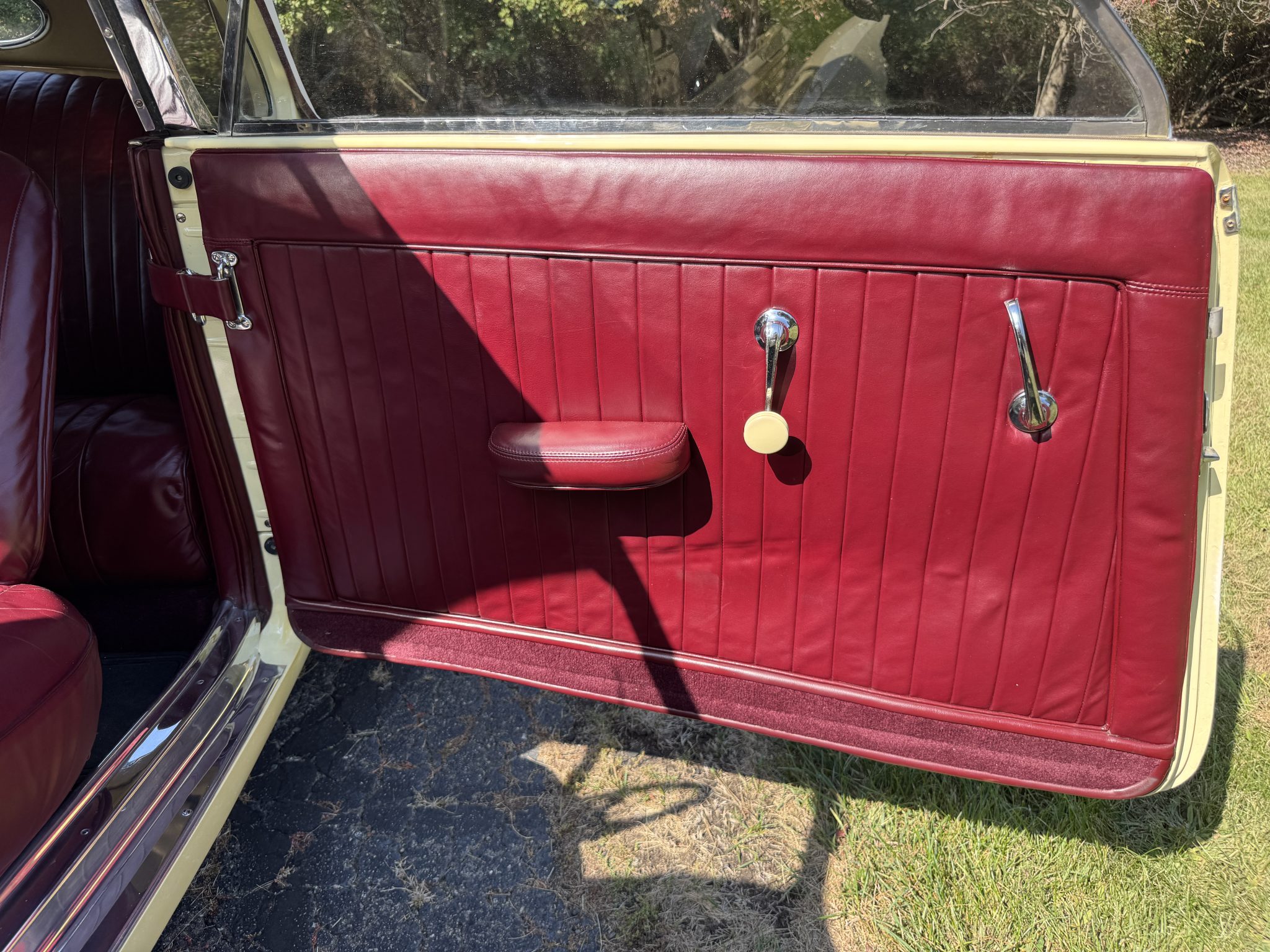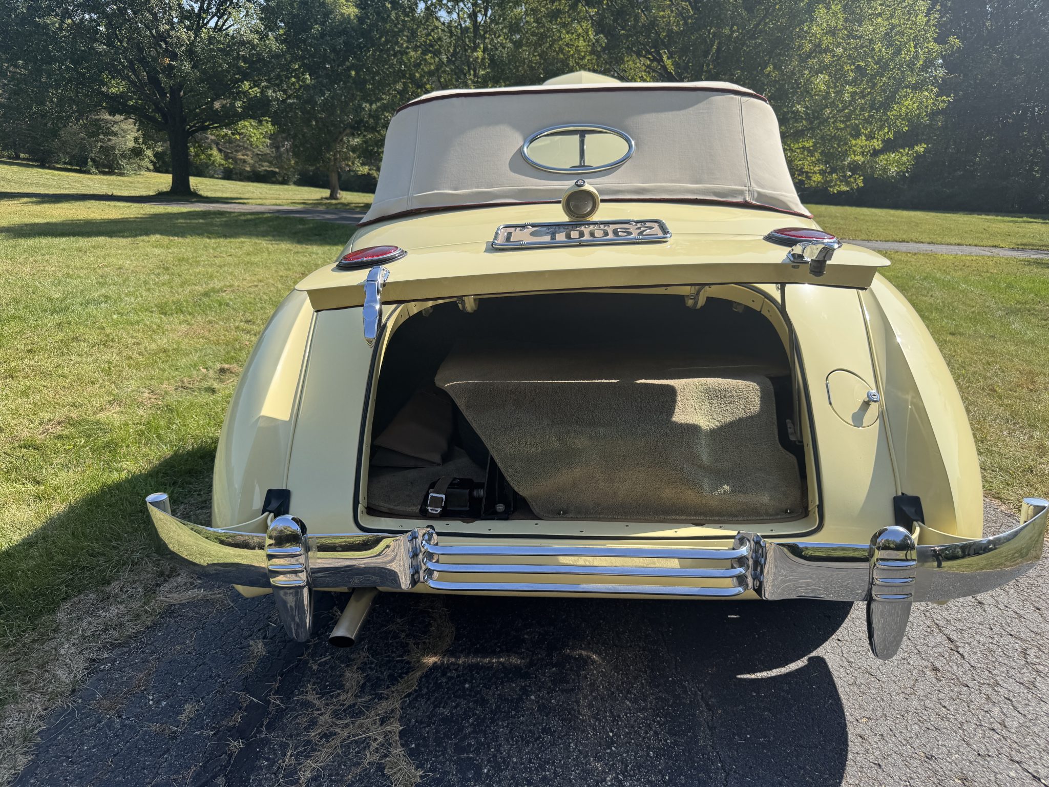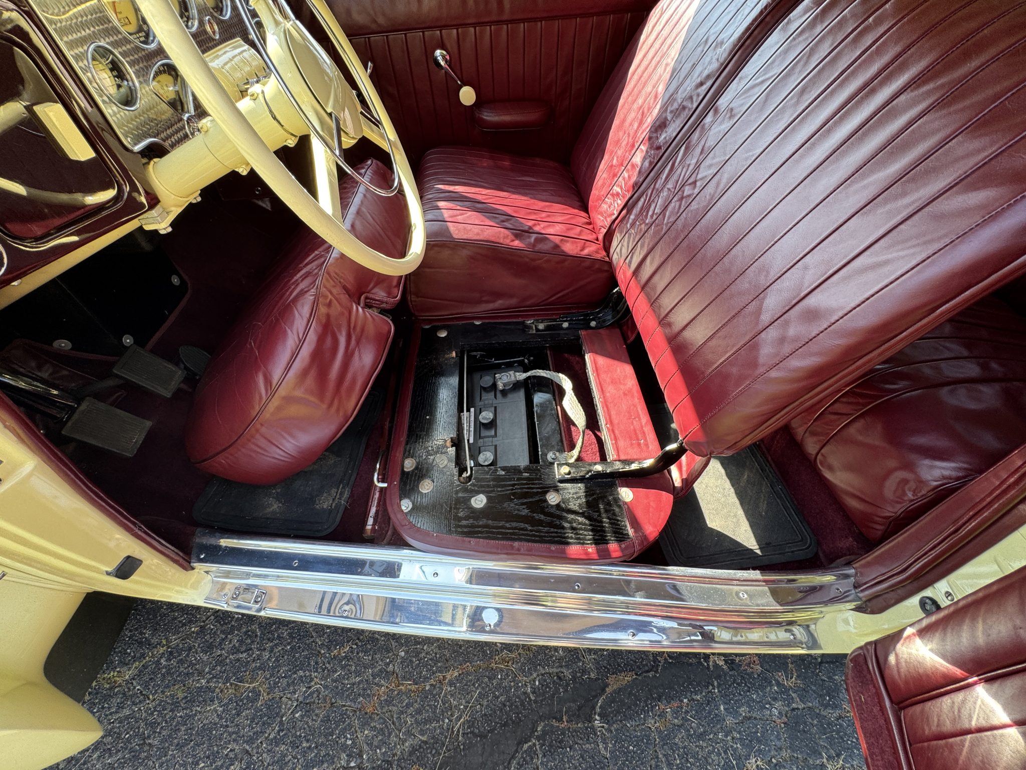 Chassis 2339H was repainted in cream in 1989 and subsequently earned a first-place award at the ACD Club 38th Annual Reunion in 1993 as well as a Best 810/812 Cord award at the Great Lakes Region ACD Mini Meet in 1997. Power comes from a 289ci Lycoming V8 that drives the front wheels via a vacuum-operated four-speed preselector transaxle, and equipment includes a backup electric fuel pump, independent front suspension, 16″ body-color steel wheels, mechanically operated pop-up headlights, and a beige convertible top. Inside, the cabin is trimmed in maroon leather upholstery and features a Cord AM radio, an engine-turned dash panel, and a Bendix “electric hand” gear selector.
