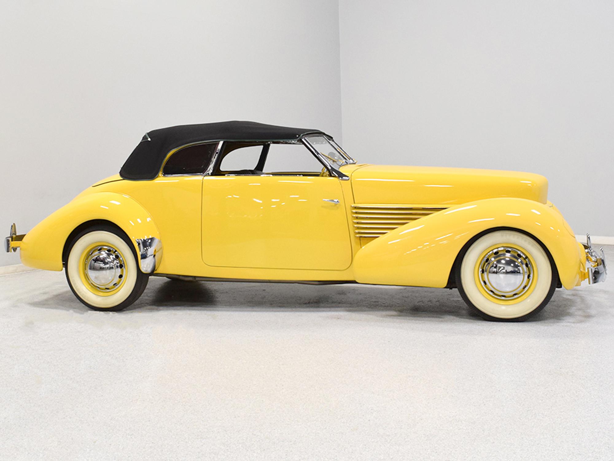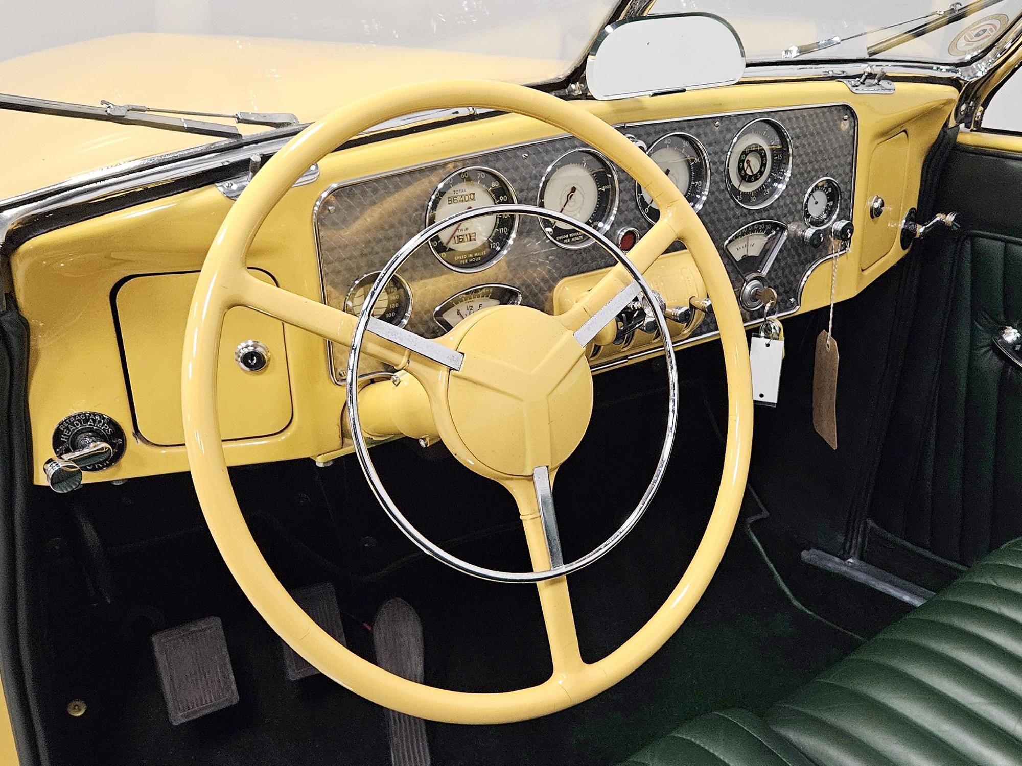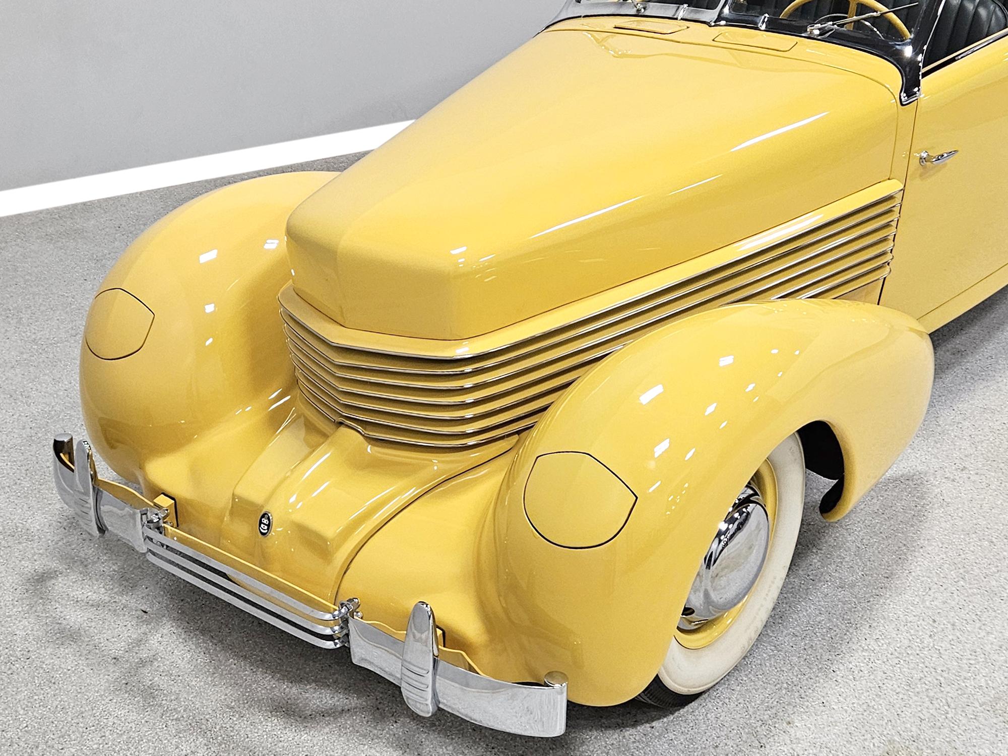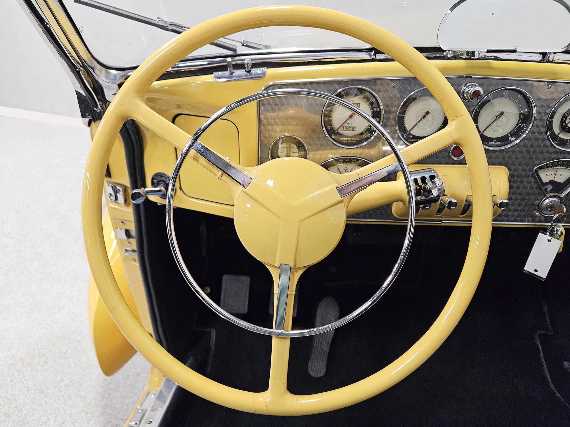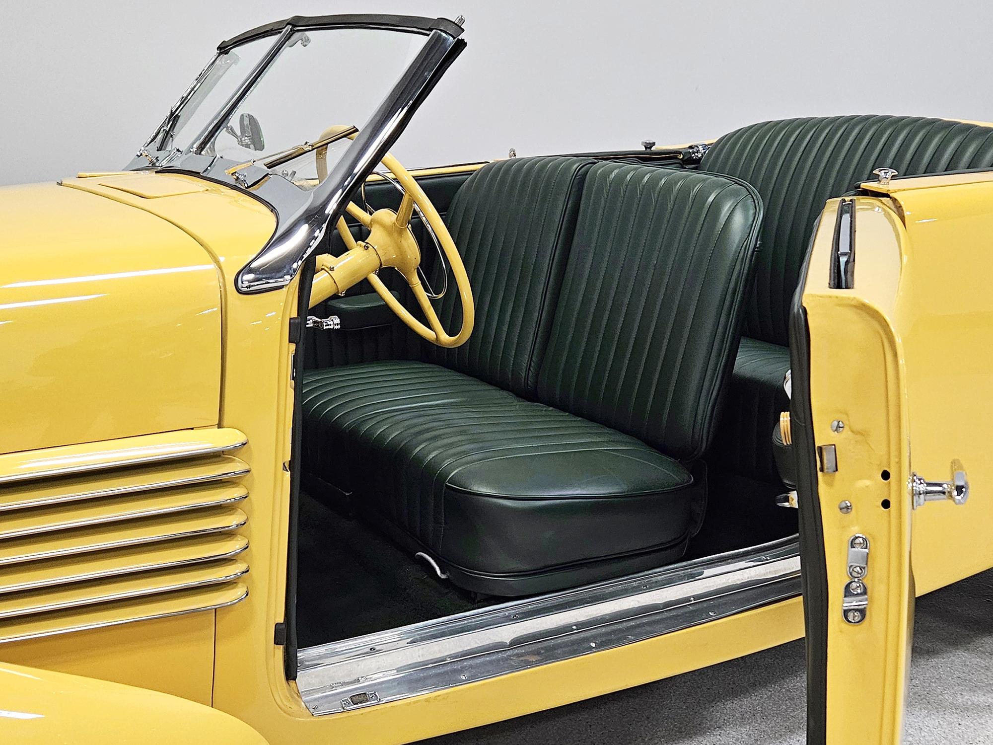 This 1937 Cord 812 phaeton have undergone a refurbishment in the 2000s Finished in yellow over dark green leather, the car is powered by a 289ci Lycoming V8 that drives the front wheels via a vacuum-operated four-speed preselector transaxle. Additional features include independent front suspension, Richardson CV-joint front axles, electronic ignition, mechanically operated pop-up headlights, and a black convertible top.