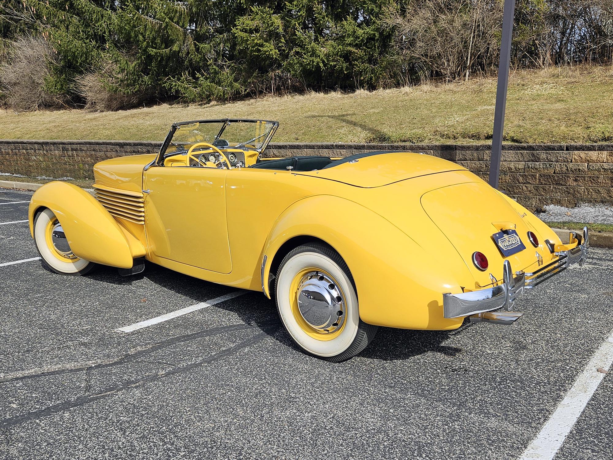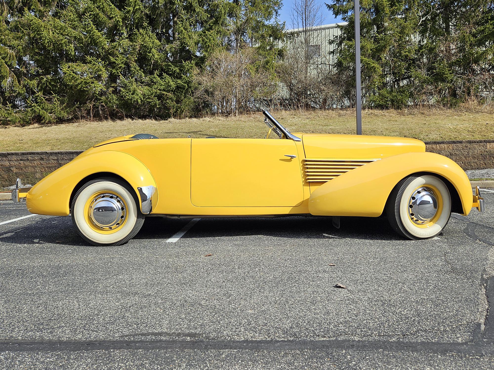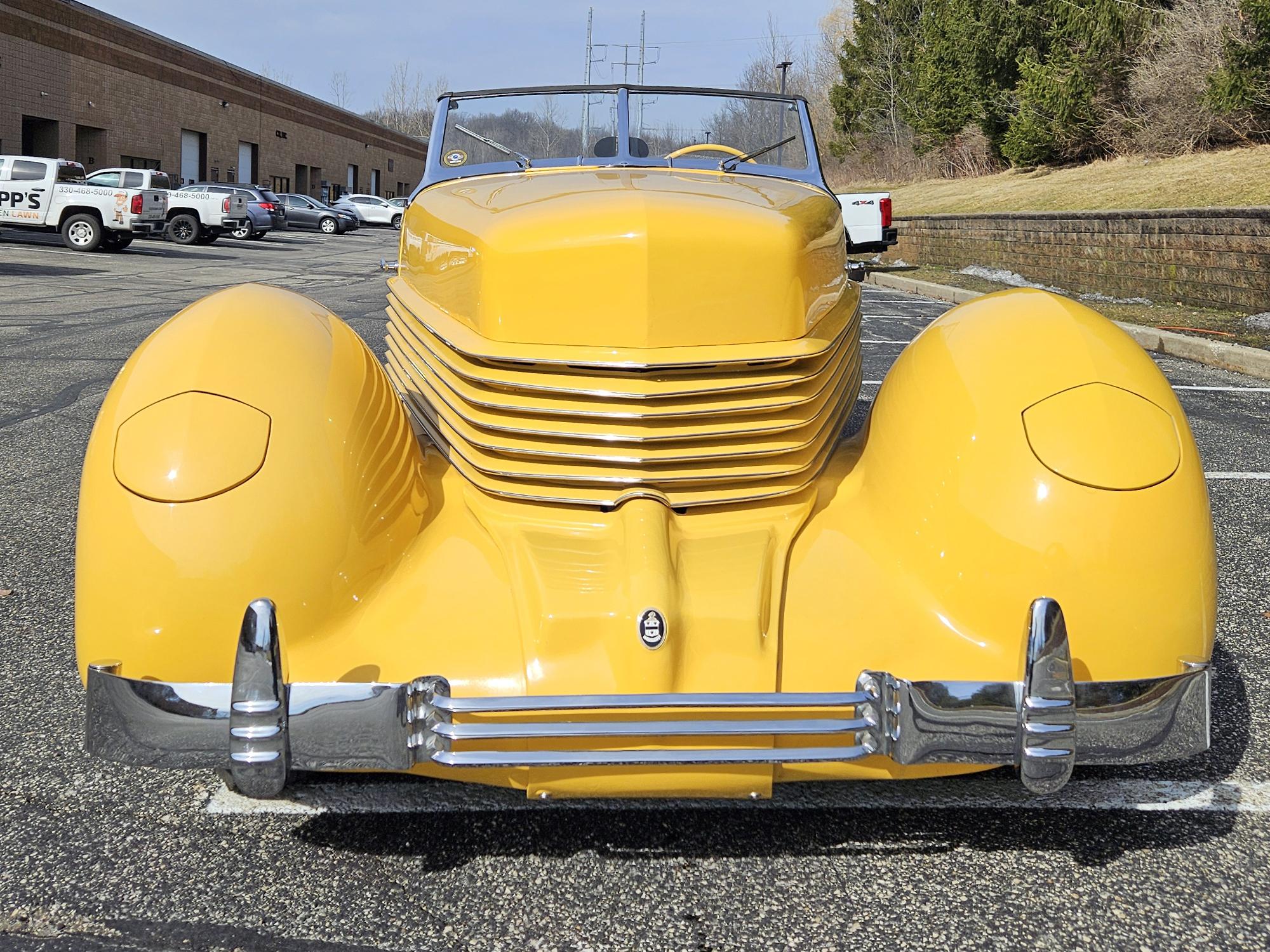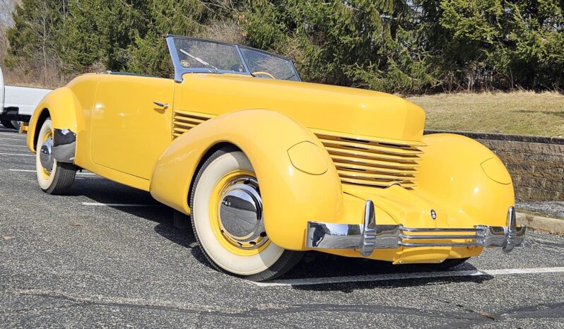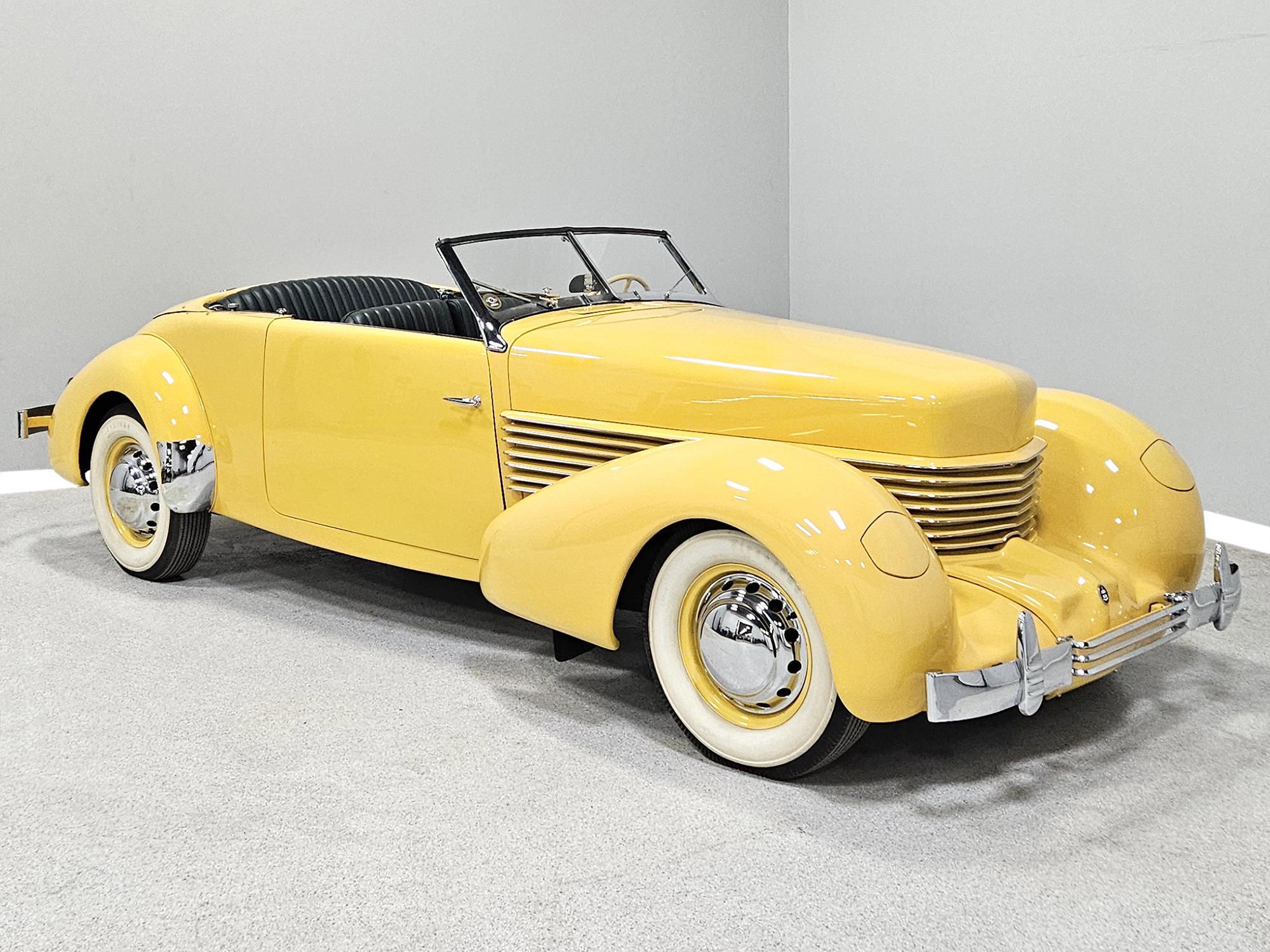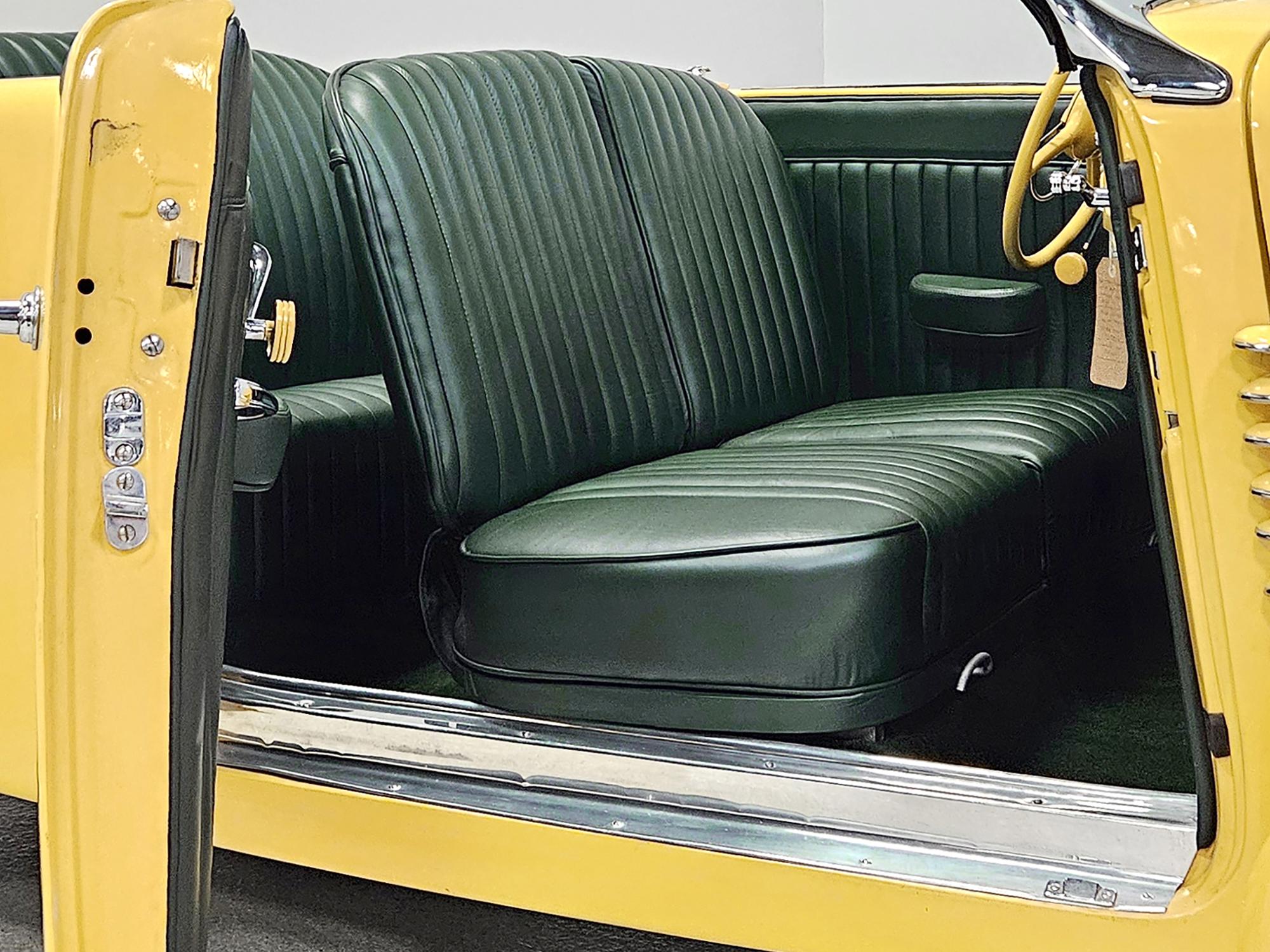 This 1937 Cord 812 phaeton have undergone a refurbishment in the 2000s Finished in yellow over dark green leather, the car is powered by a 289ci Lycoming V8 that drives the front wheels via a vacuum-operated four-speed preselector transaxle. Additional features include independent front suspension, Richardson CV-joint front axles, electronic ignition, mechanically operated pop-up headlights, and a black convertible top.
