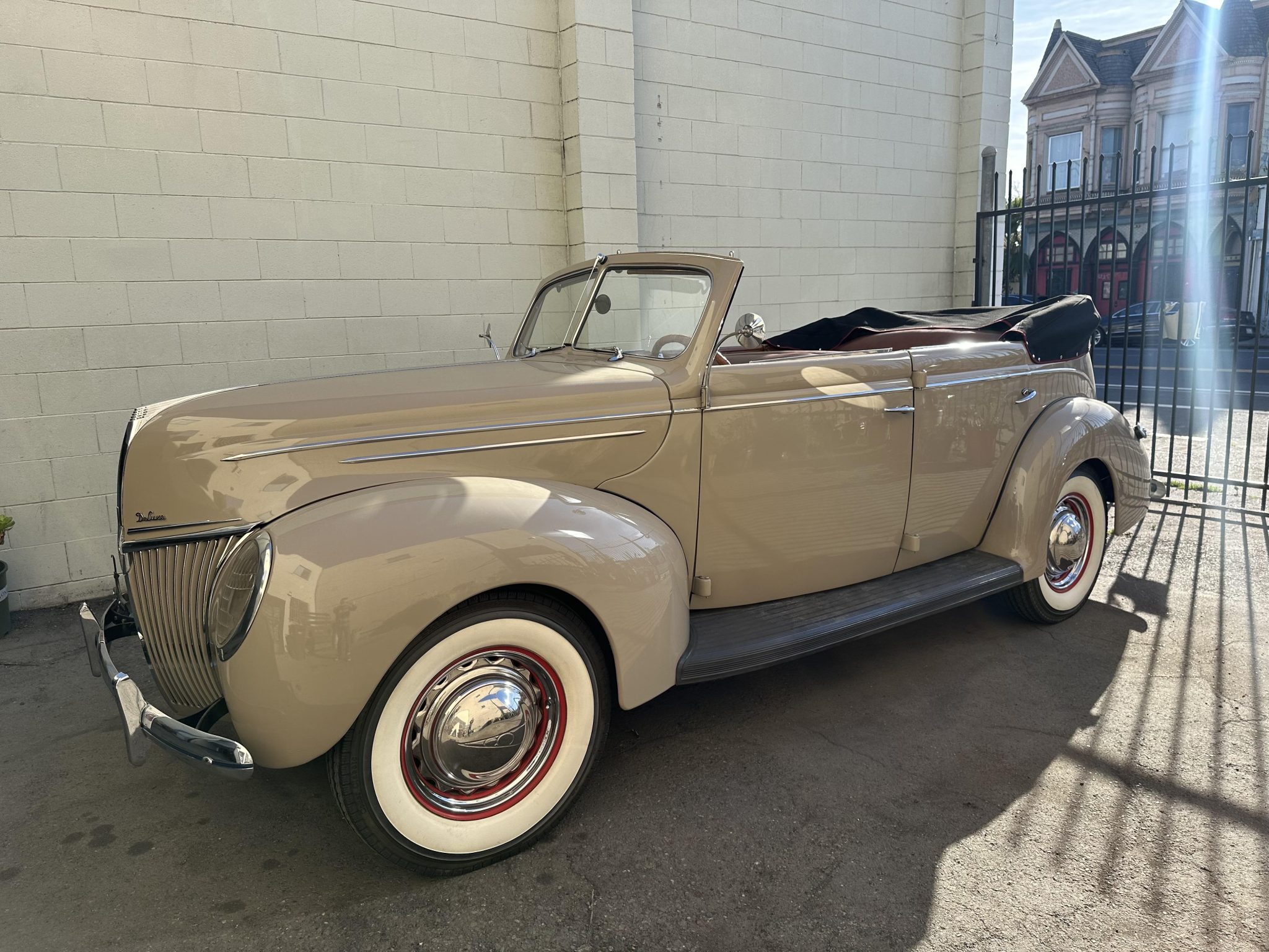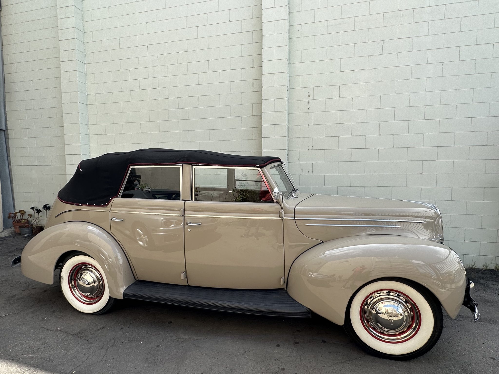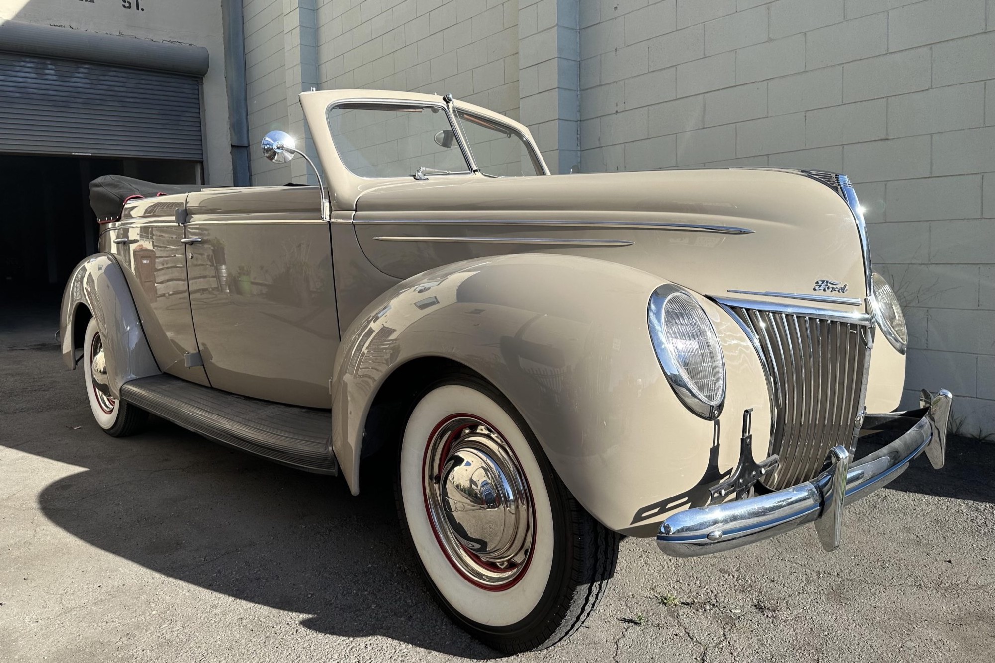 This 1939 Ford Deluxe convertible sedan is finished in beige over brown upholstery and is powered by a 221ci flathead V8 mated to a three-speed manual transmission. Equipment includes a dark brown soft top, a split windshield, and red 16″ steel wheels with whitewall tires in addition to a faux wood metal finish dashboard, an analog clock, a heater, and a push-button radio.