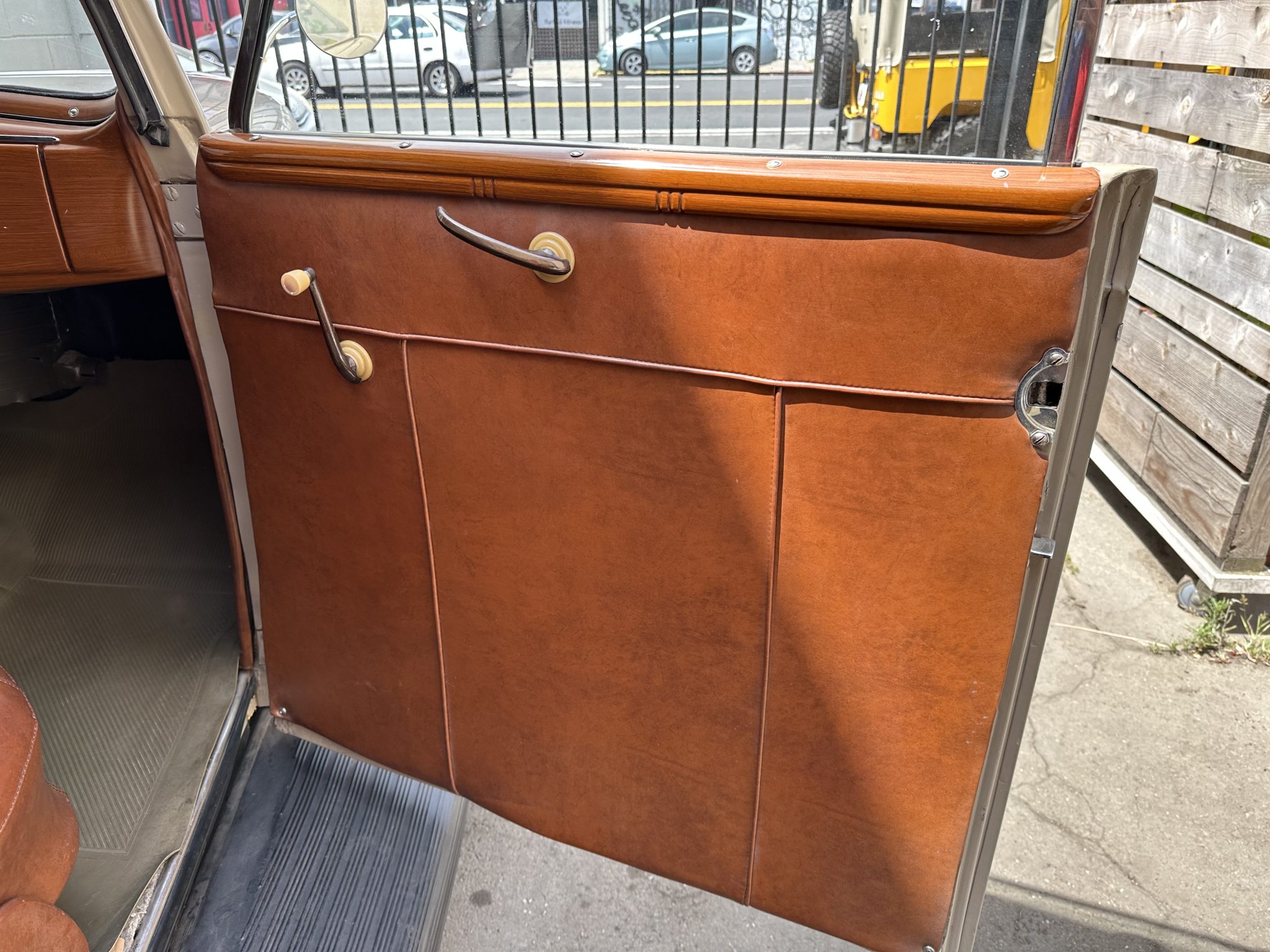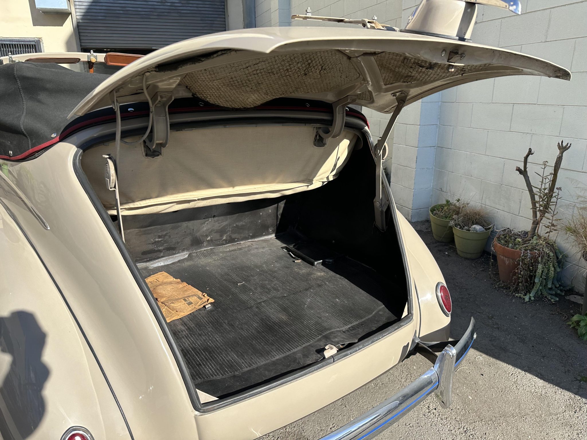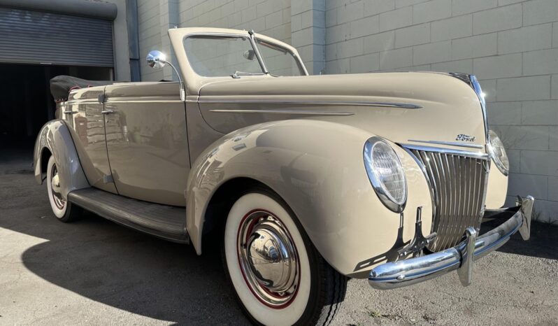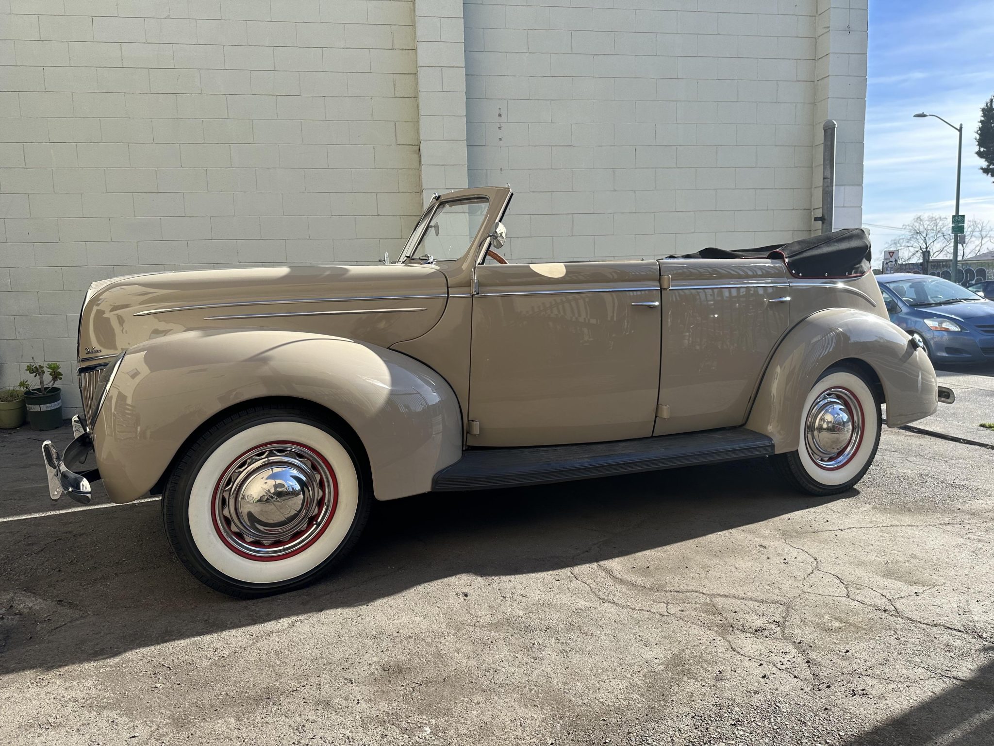 This 1939 Ford Deluxe convertible sedan is finished in beige over brown upholstery and is powered by a 221ci flathead V8 mated to a three-speed manual transmission. Equipment includes a dark brown soft top, a split windshield, and red 16″ steel wheels with whitewall tires in addition to a faux wood metal finish dashboard, an analog clock, a heater, and a push-button radio.
