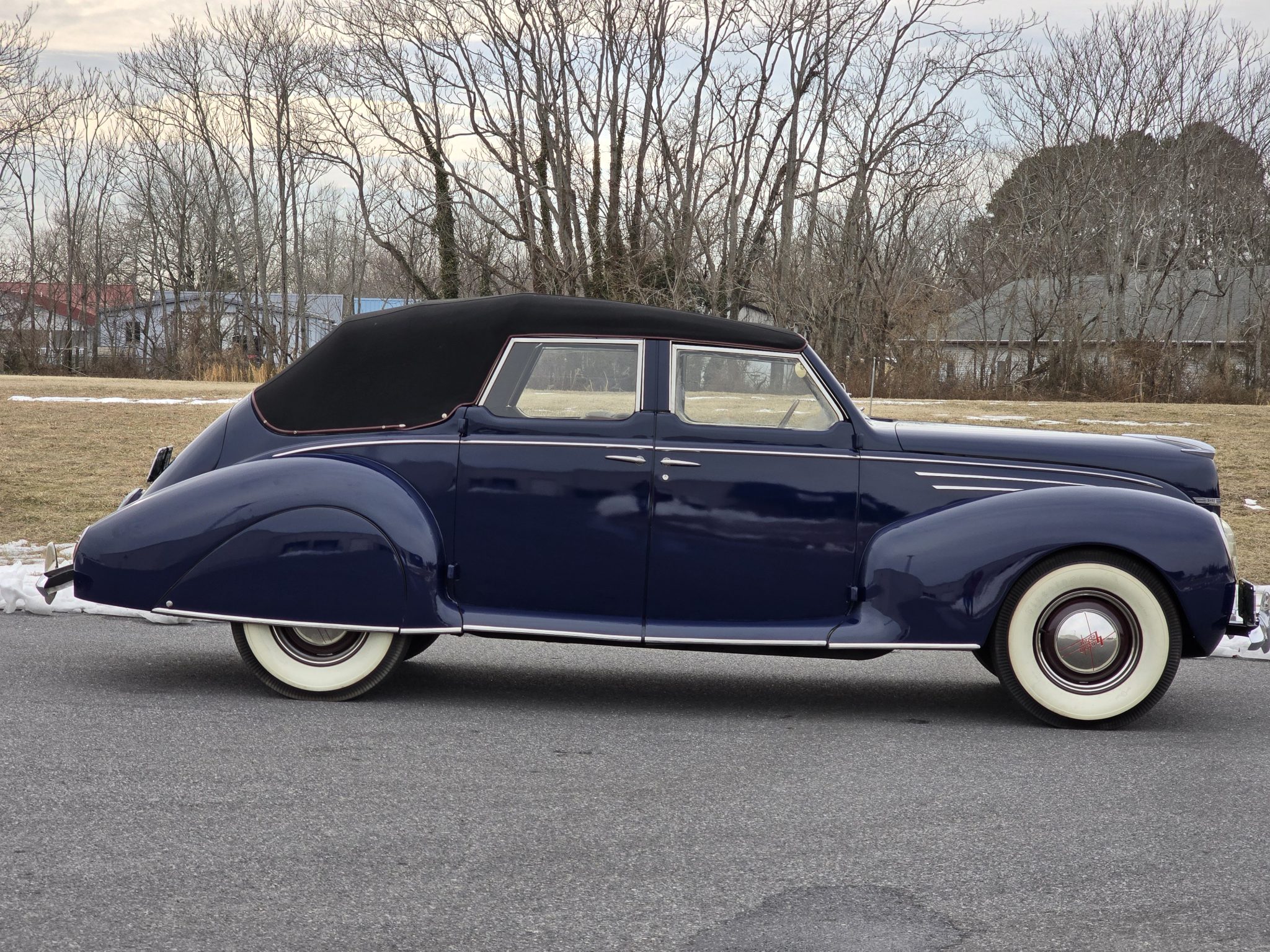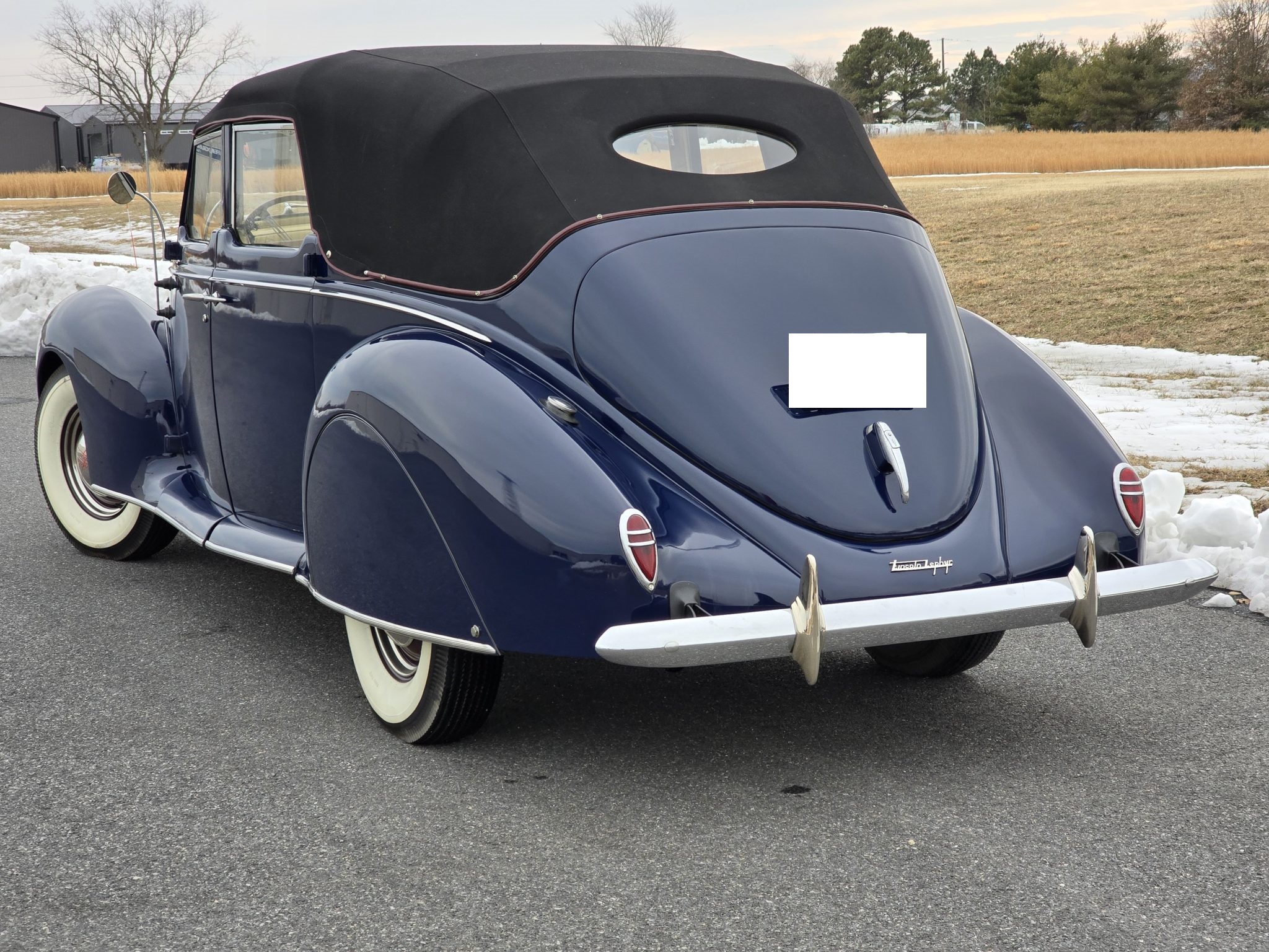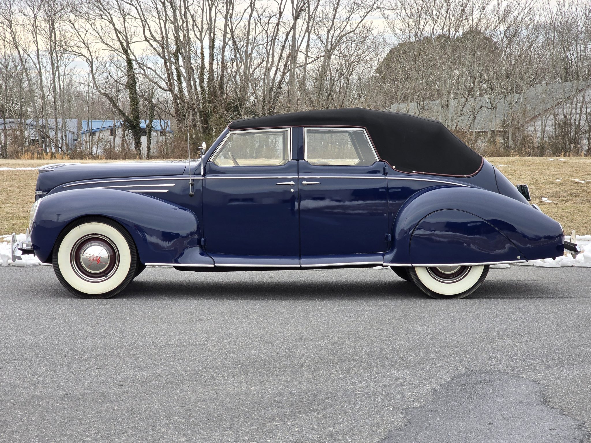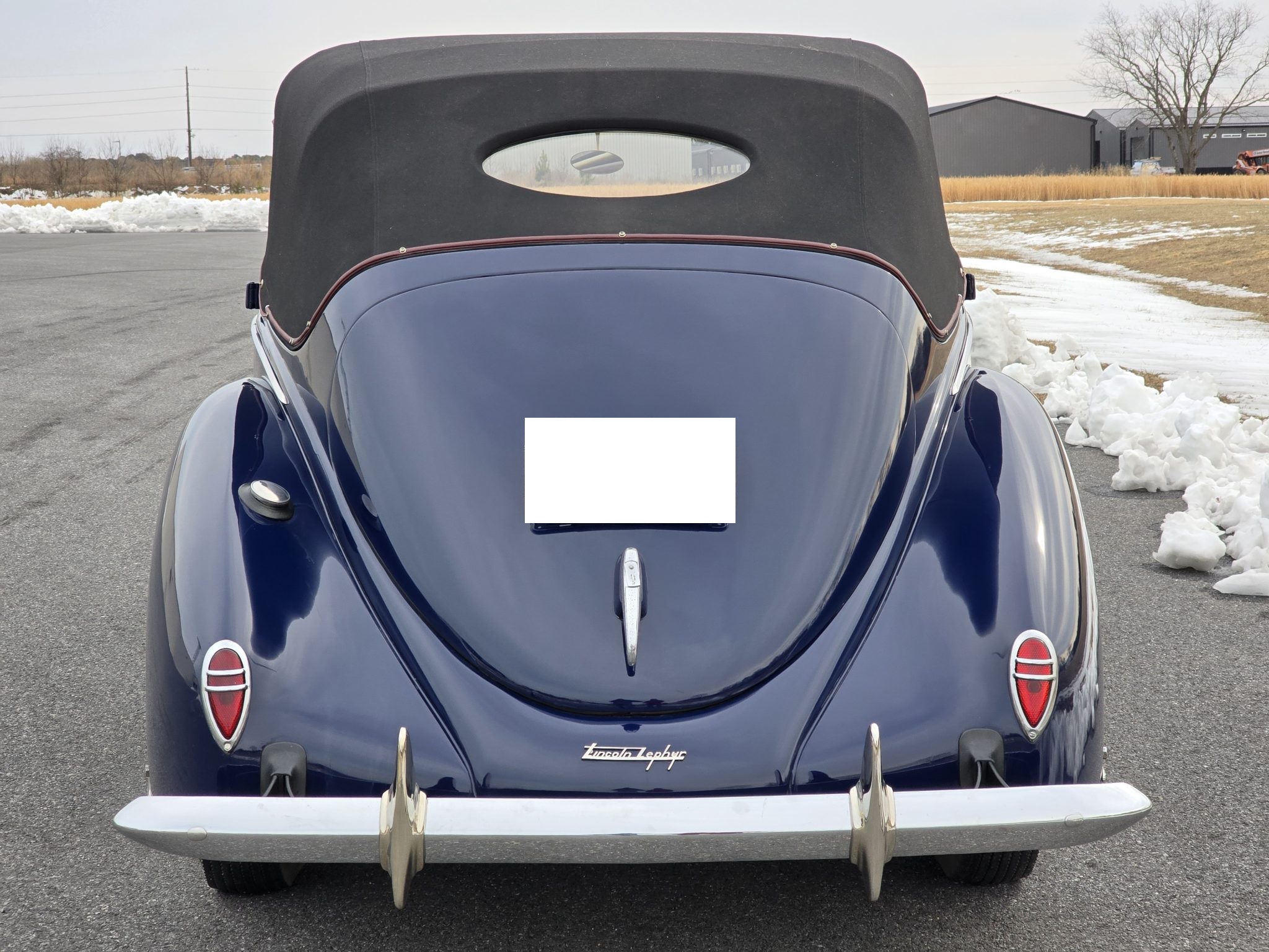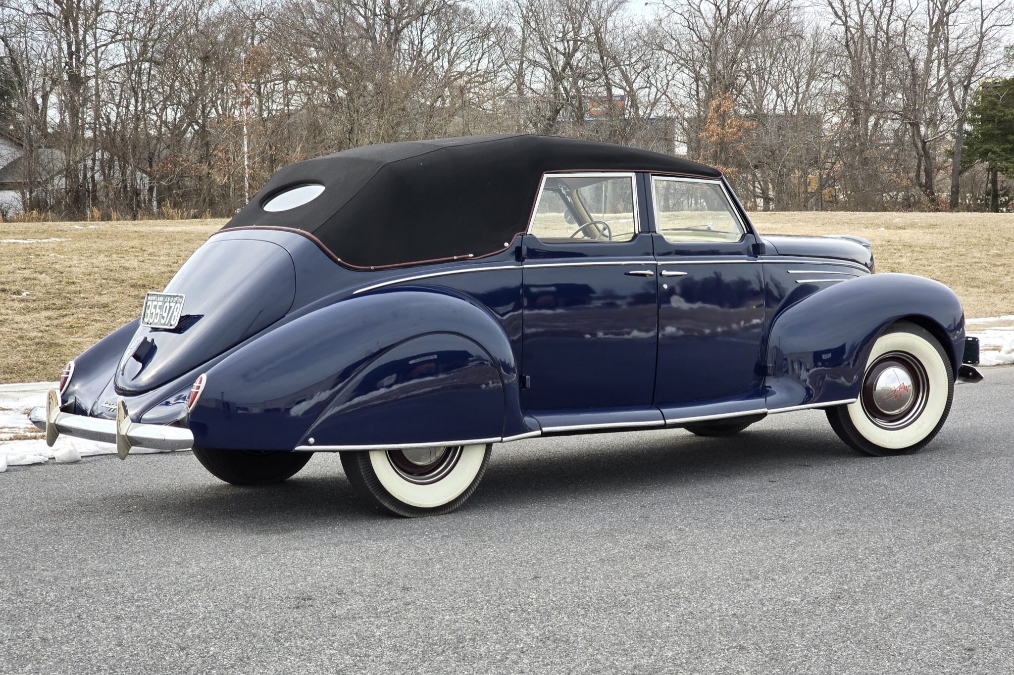 This 1939 Lincoln Zephyr is one of 302 convertible sedans produced for the model year. The car is finished in dark blue over tan leather upholstery, and power comes from a 267.3ci V12 linked with a three-speed manual transmission and a Columbia two-speed rear axle. Equipment includes a black soft top with red piping as well as yellow-lens driving lamps, rear-hinged rear doors, detachable B-pillars, fender skirts, dual gloveboxes, and an AM radio.