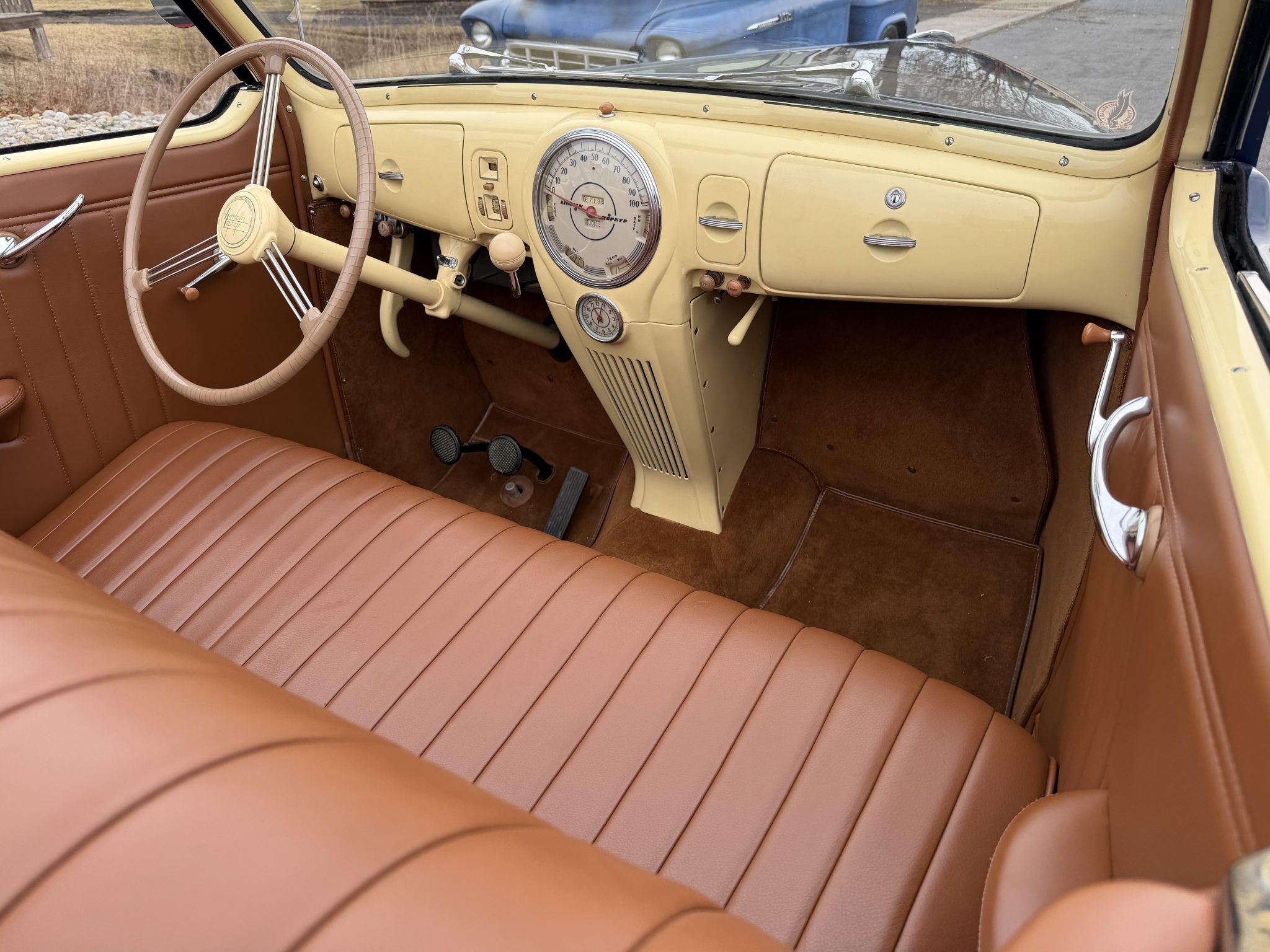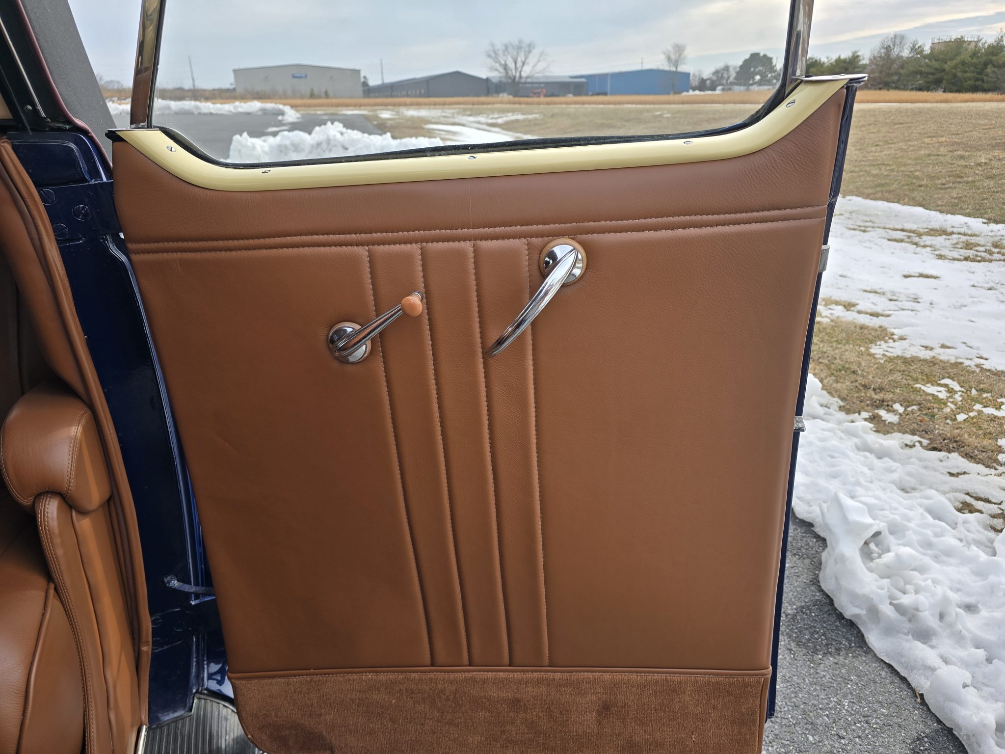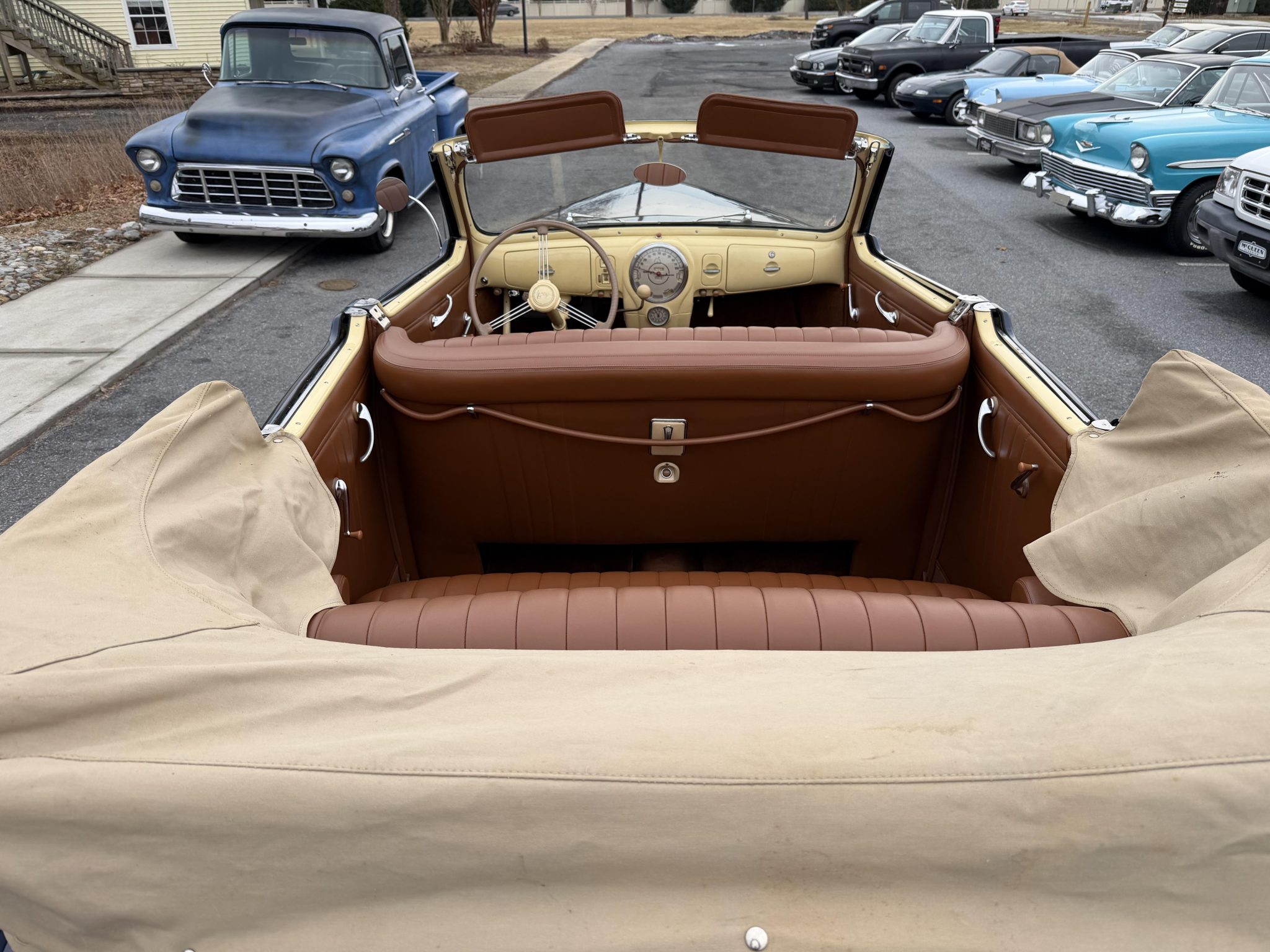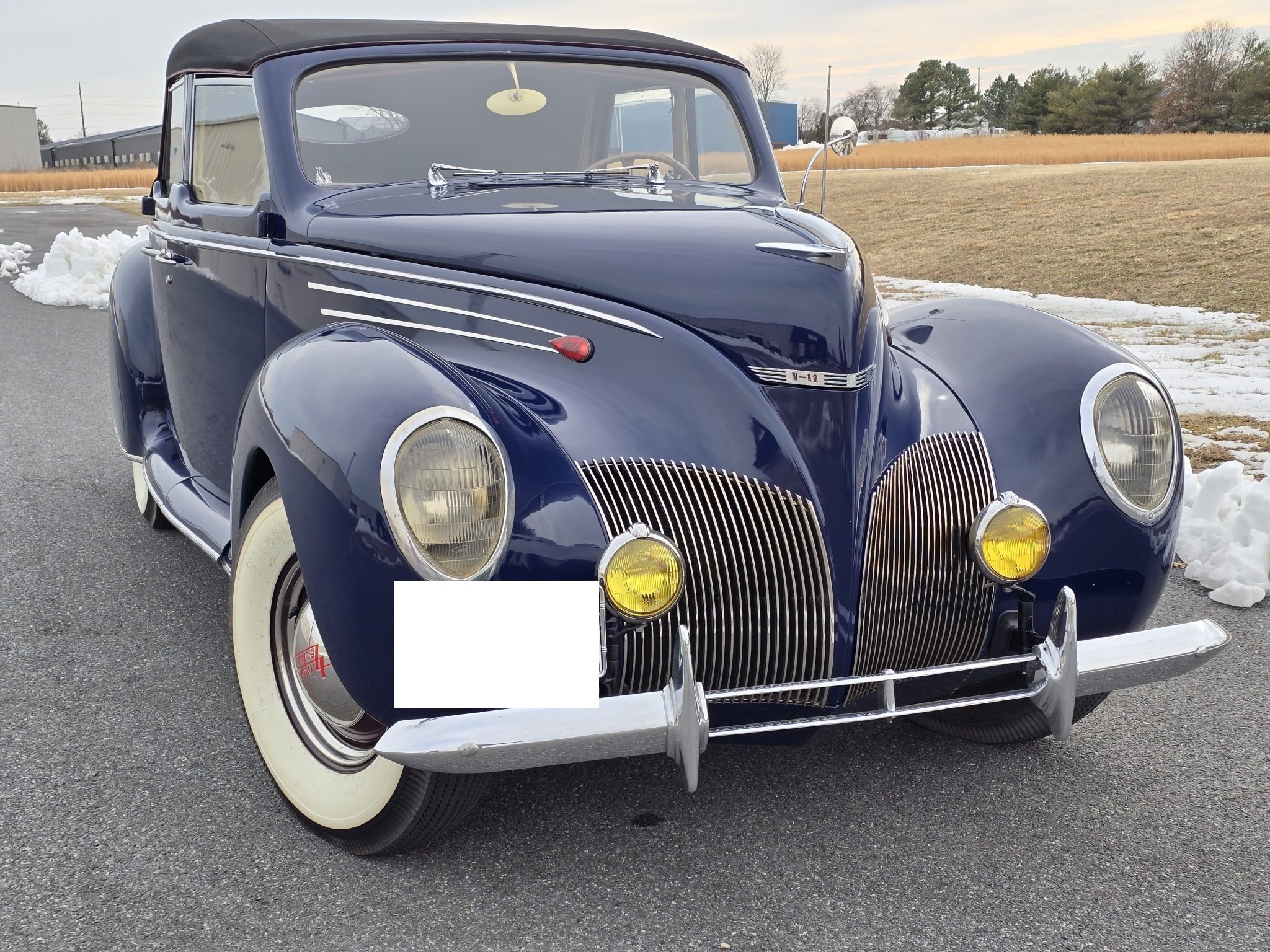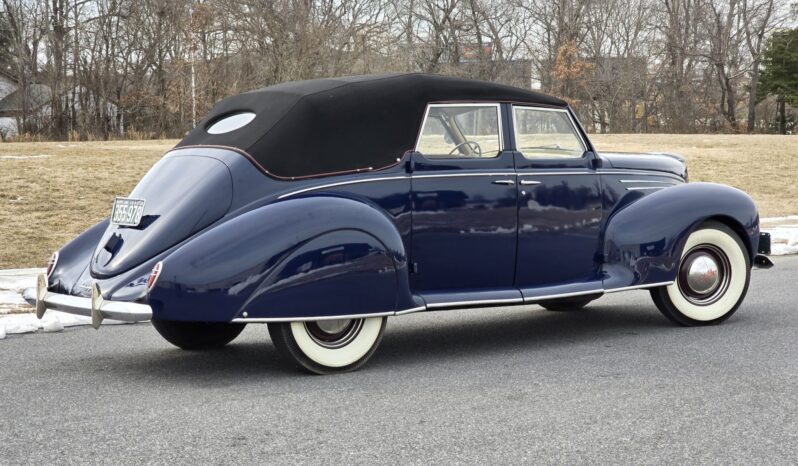 This 1939 Lincoln Zephyr is one of 302 convertible sedans produced for the model year. The car is finished in dark blue over tan leather upholstery, and power comes from a 267.3ci V12 linked with a three-speed manual transmission and a Columbia two-speed rear axle. Equipment includes a black soft top with red piping as well as yellow-lens driving lamps, rear-hinged rear doors, detachable B-pillars, fender skirts, dual gloveboxes, and an AM radio.