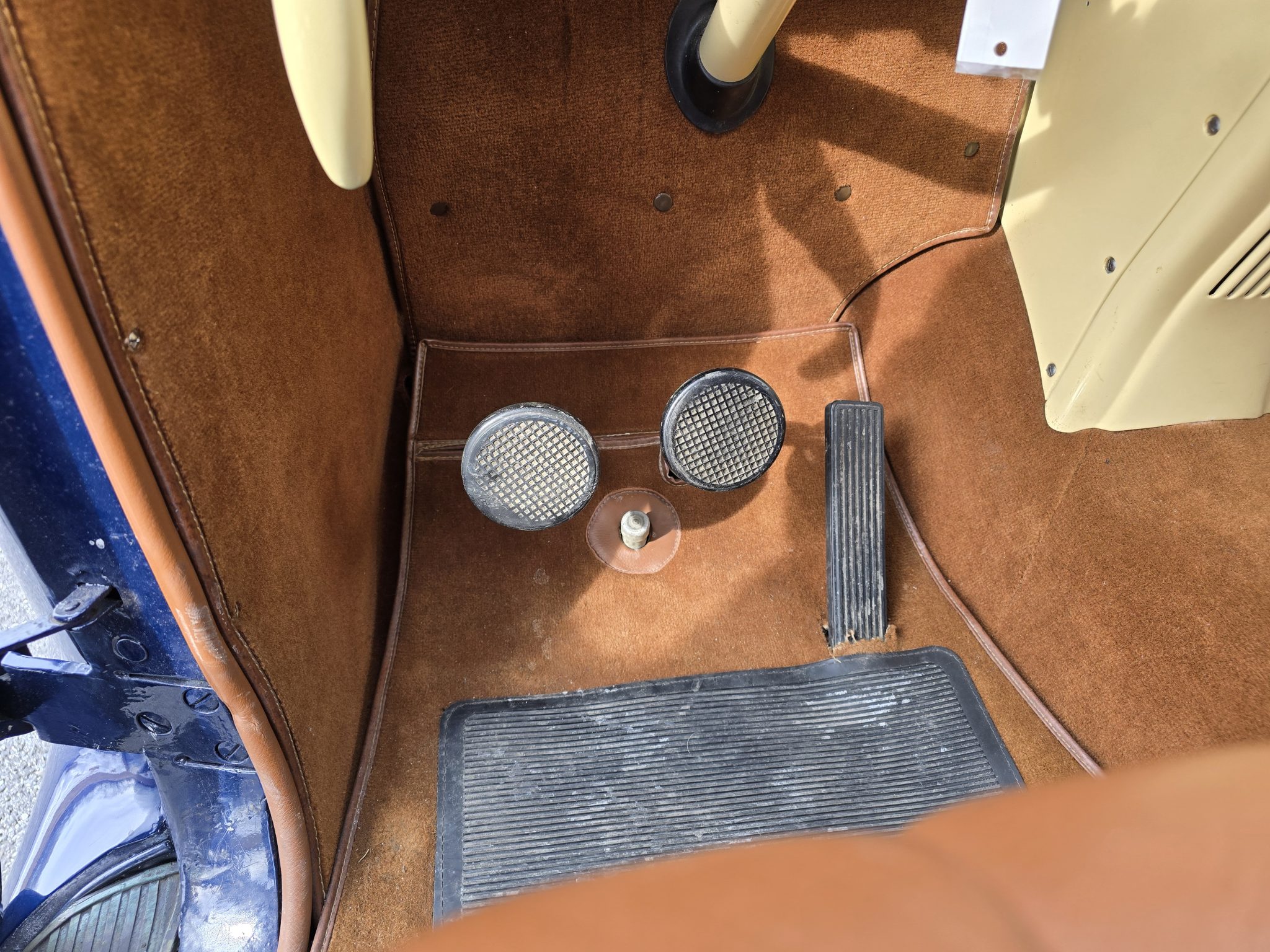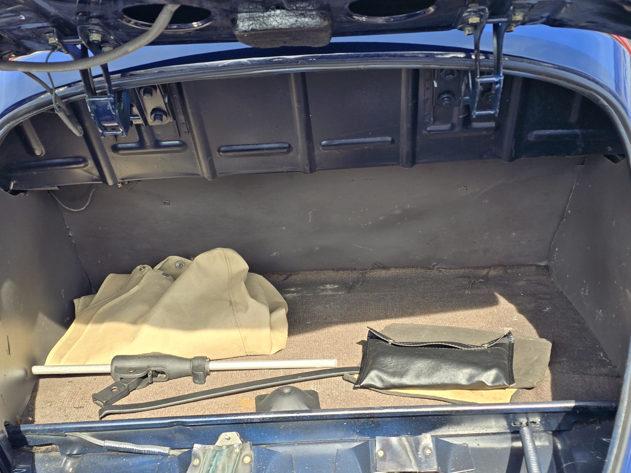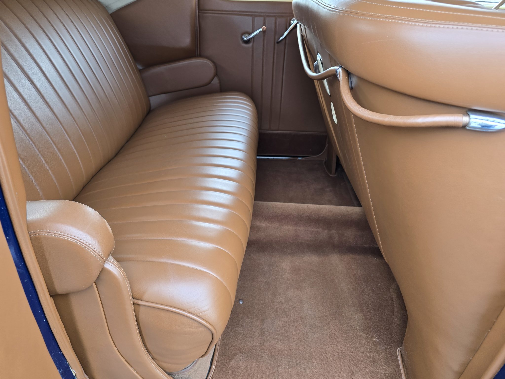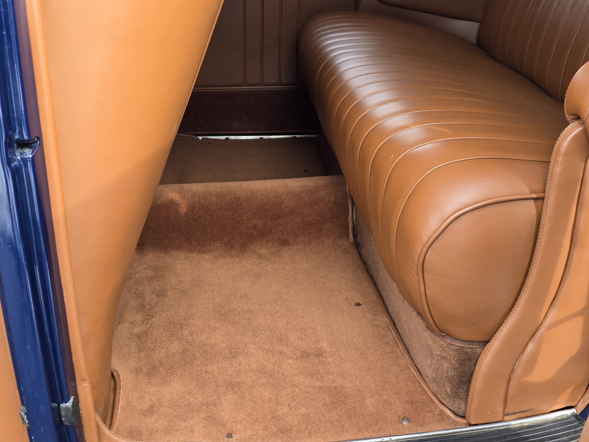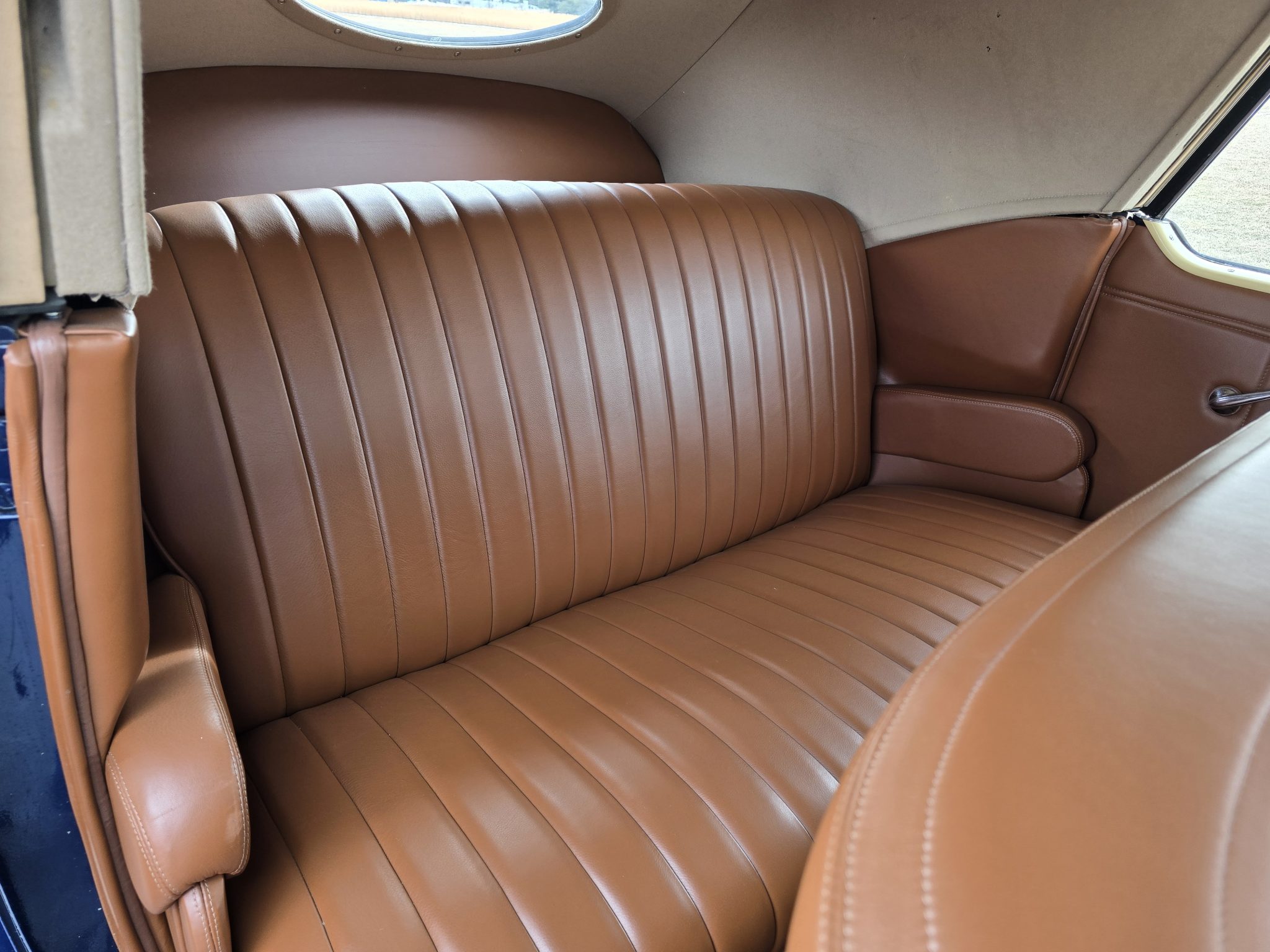 This 1939 Lincoln Zephyr is one of 302 convertible sedans produced for the model year. The car is finished in dark blue over tan leather upholstery, and power comes from a 267.3ci V12 linked with a three-speed manual transmission and a Columbia two-speed rear axle. Equipment includes a black soft top with red piping as well as yellow-lens driving lamps, rear-hinged rear doors, detachable B-pillars, fender skirts, dual gloveboxes, and an AM radio.