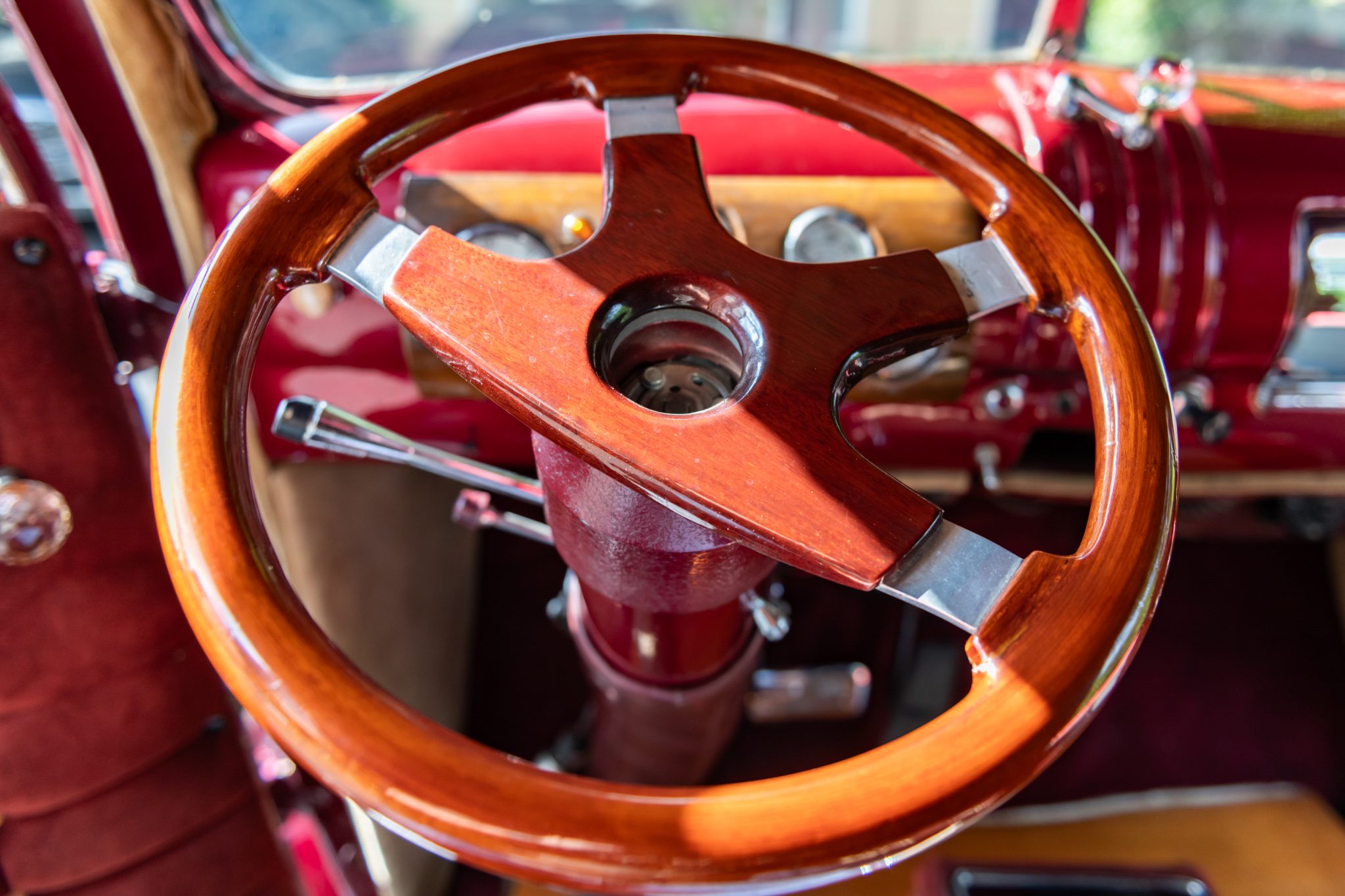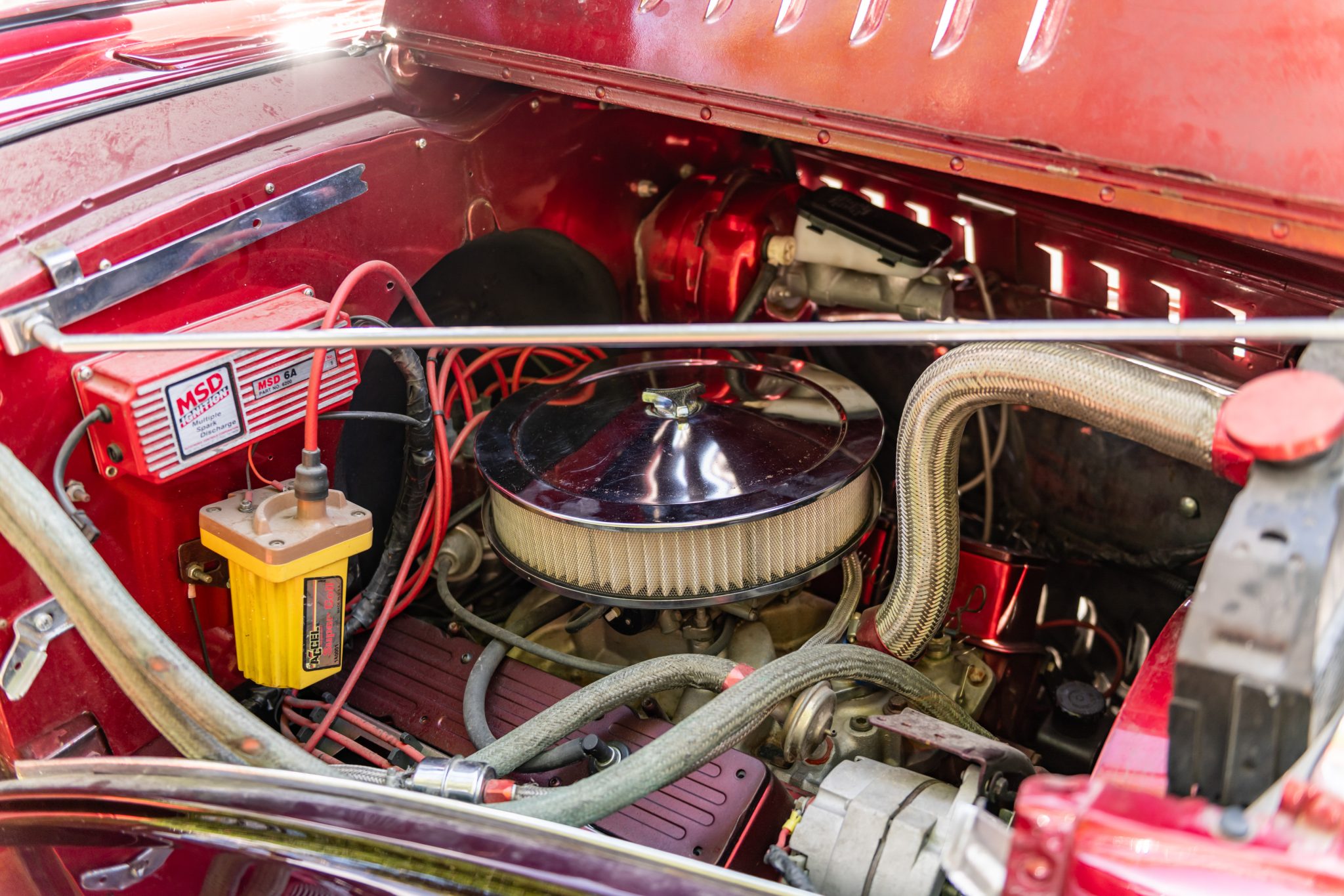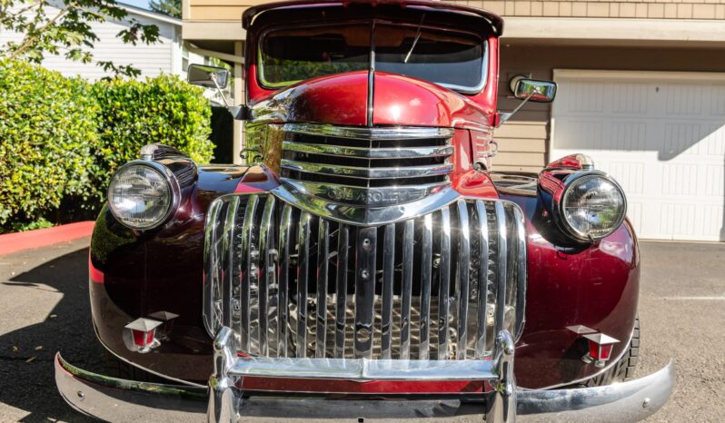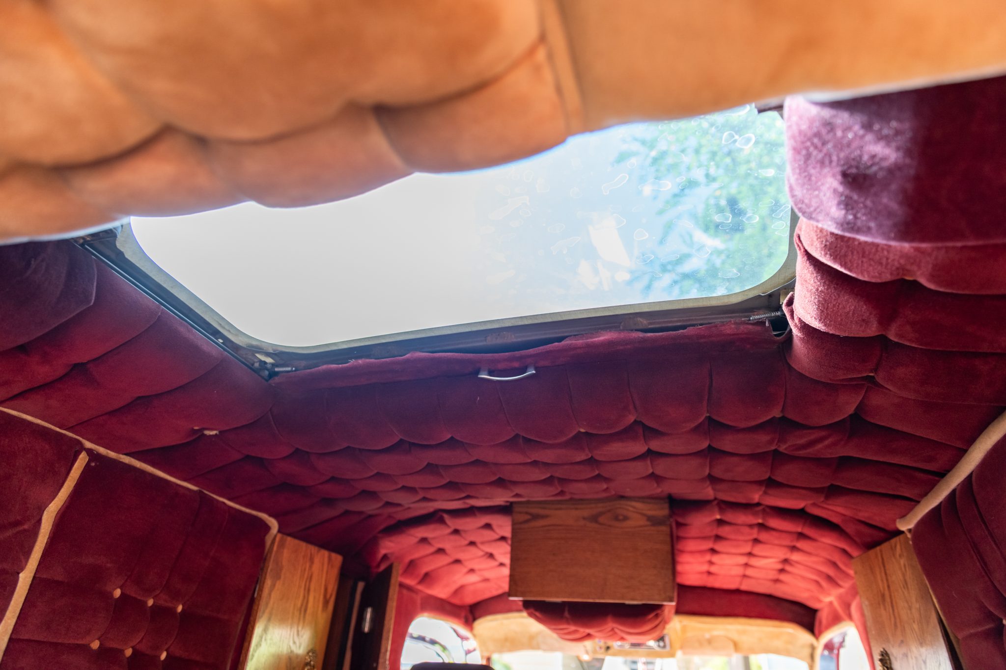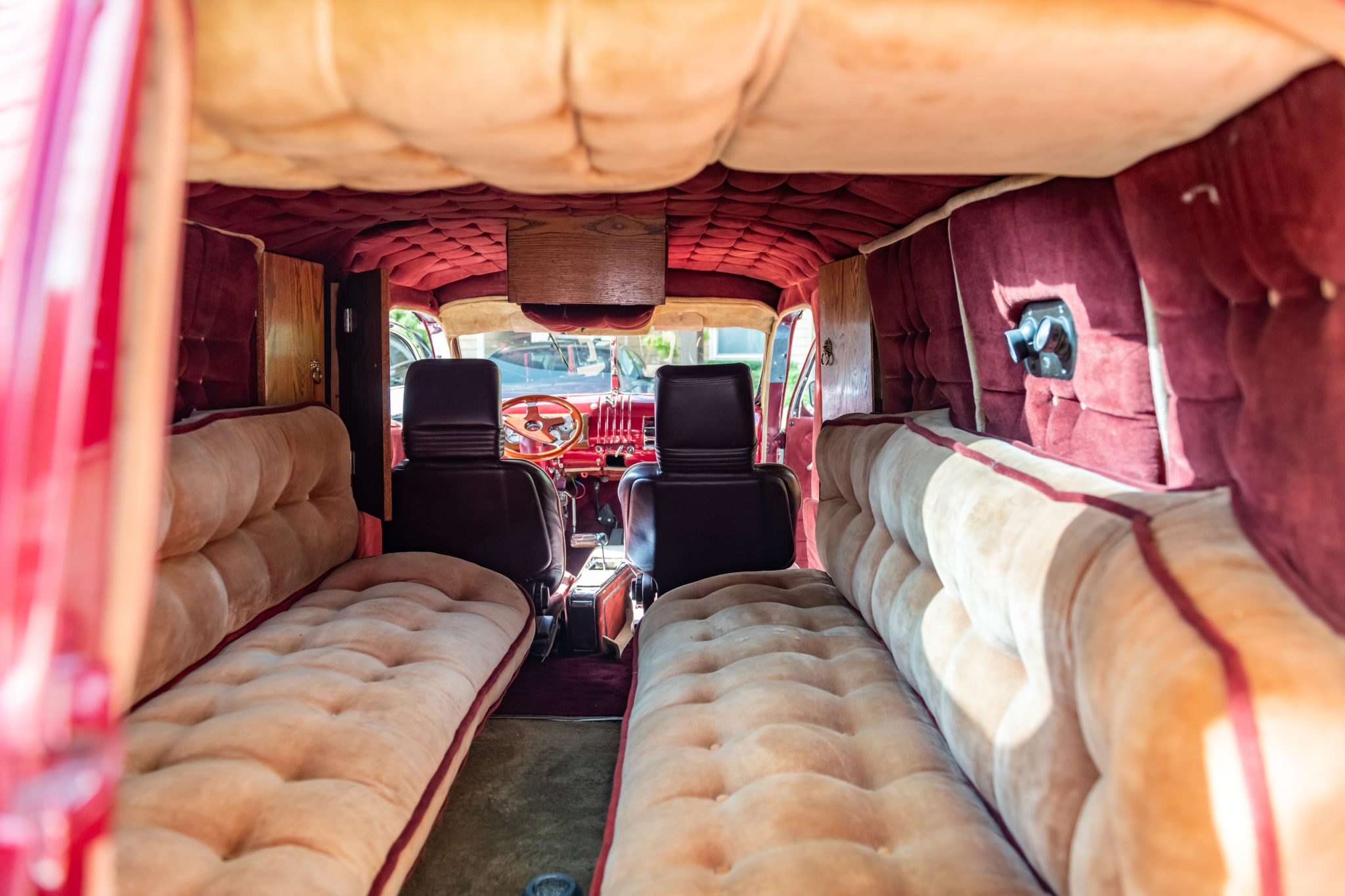 This 1947 GMC EC152 3/4-ton panel van it was customized with two-tone paintwork and a bespoke burgundy-and-tan interior with hand-sewn, button-tufted upholstery. The truck is powered by a 350ci V8 mated to an automatic transmission, and additional features include chrome bumpers and trim, a windshield visor, 18″ wheels, front disc brakes, a sunroof, VDO gauges, woodgrain trim, a Panasonic CD stereo, and inward-facing rear bench seats.