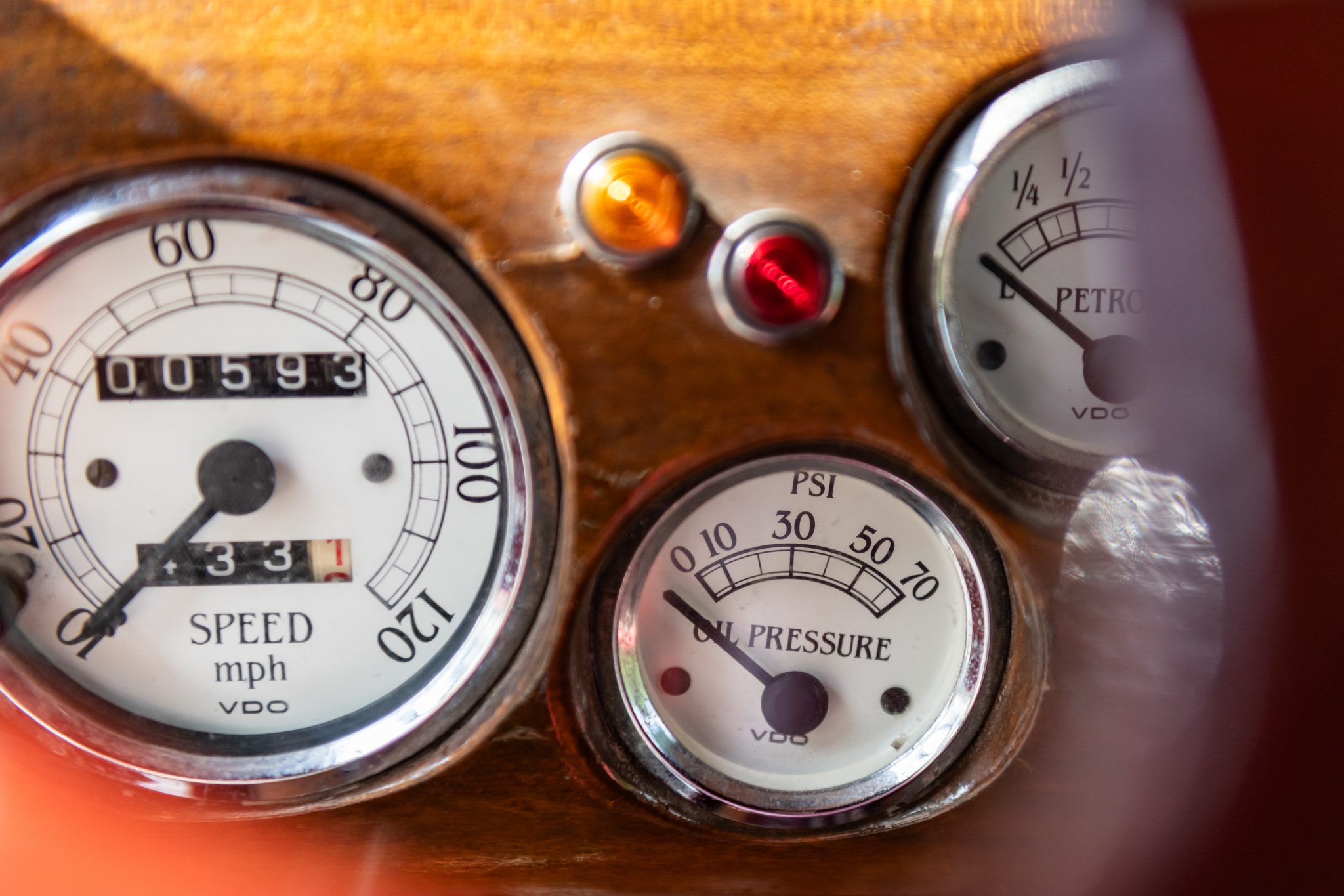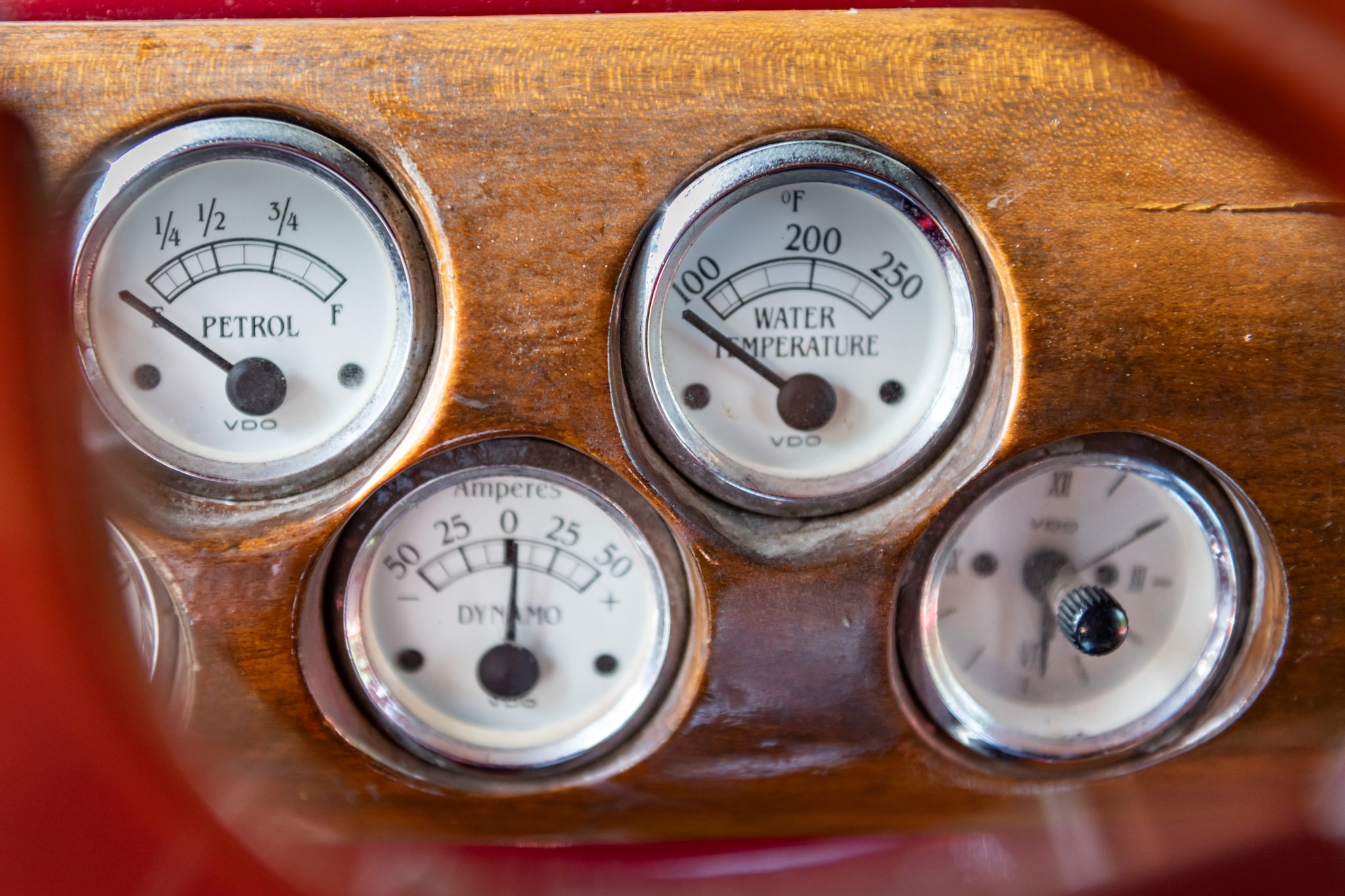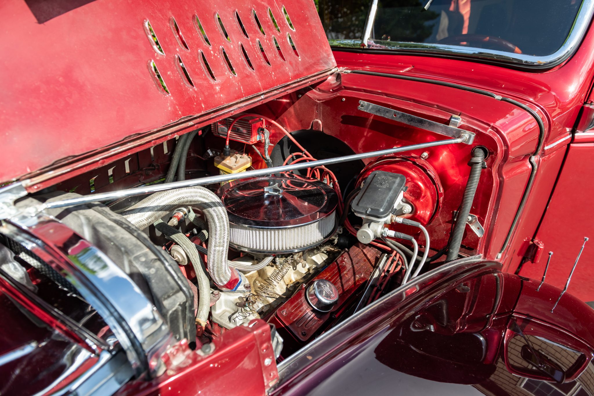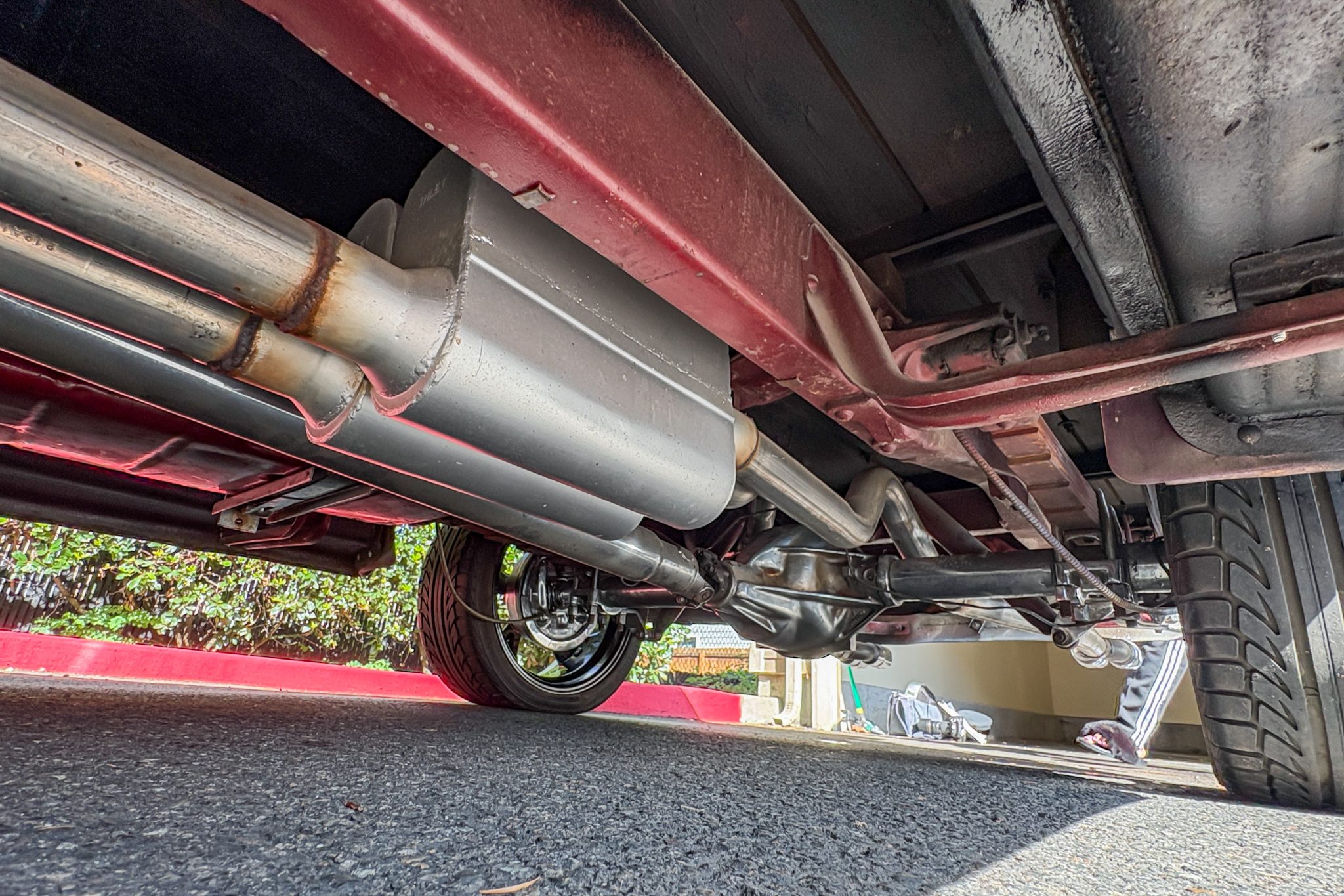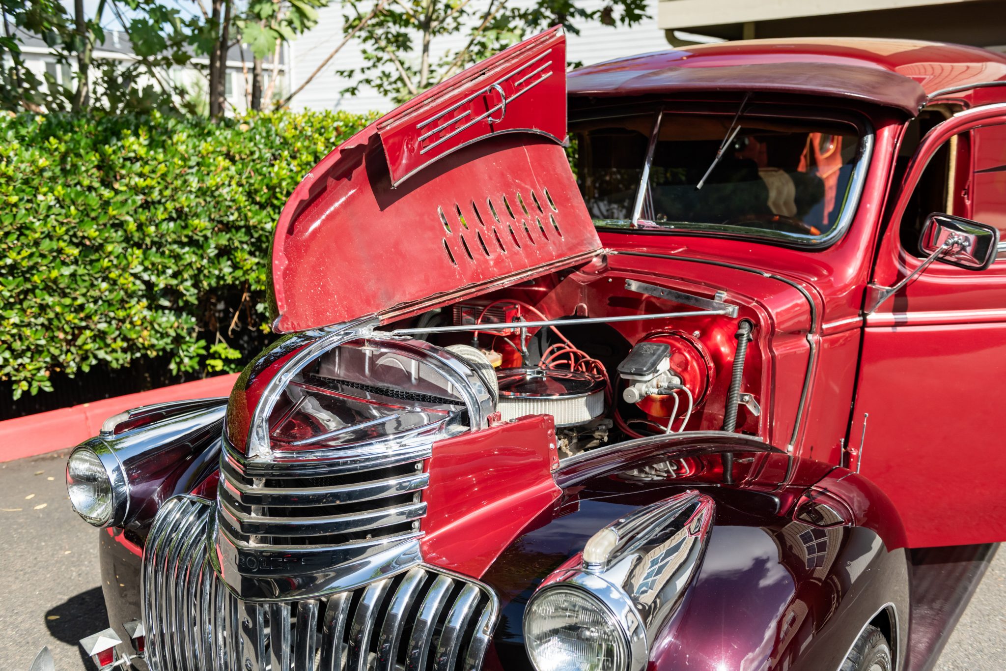 This 1947 GMC EC152 3/4-ton panel van it was customized with two-tone paintwork and a bespoke burgundy-and-tan interior with hand-sewn, button-tufted upholstery. The truck is powered by a 350ci V8 mated to an automatic transmission, and additional features include chrome bumpers and trim, a windshield visor, 18″ wheels, front disc brakes, a sunroof, VDO gauges, woodgrain trim, a Panasonic CD stereo, and inward-facing rear bench seats.