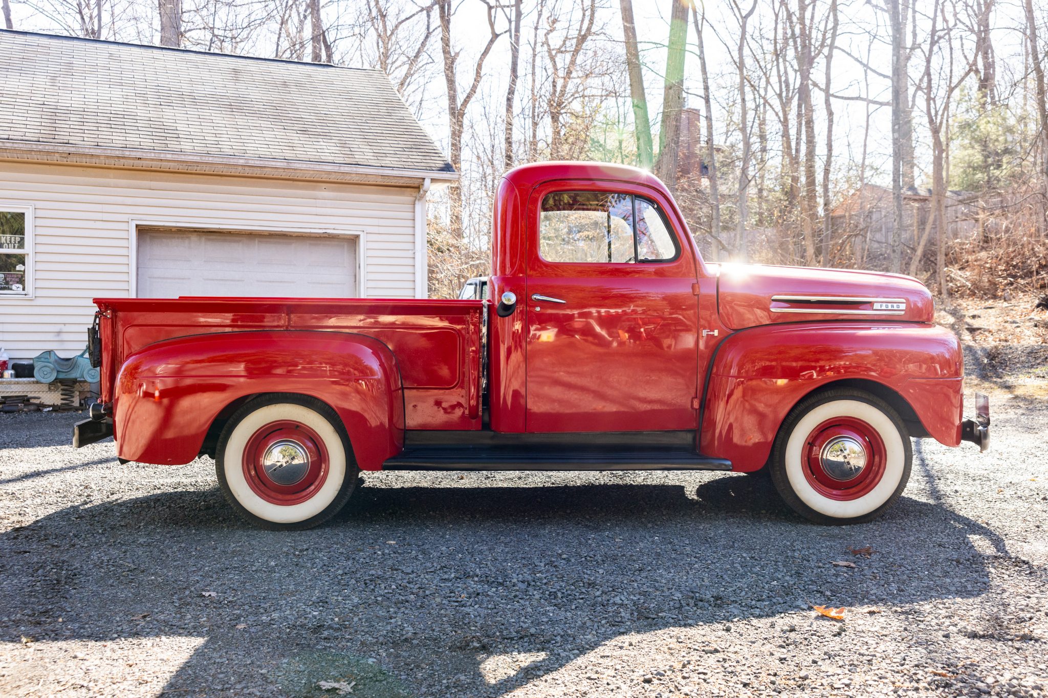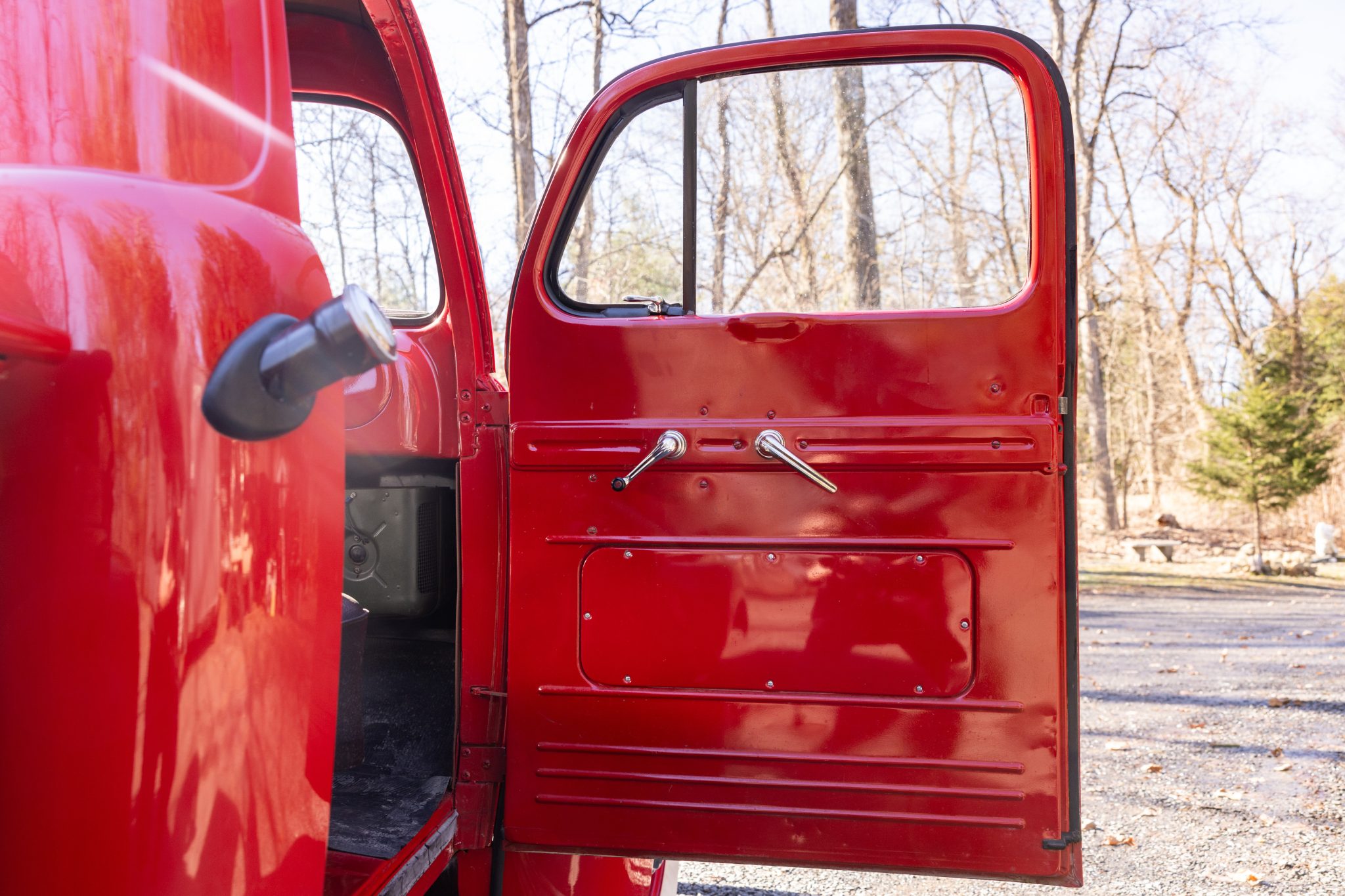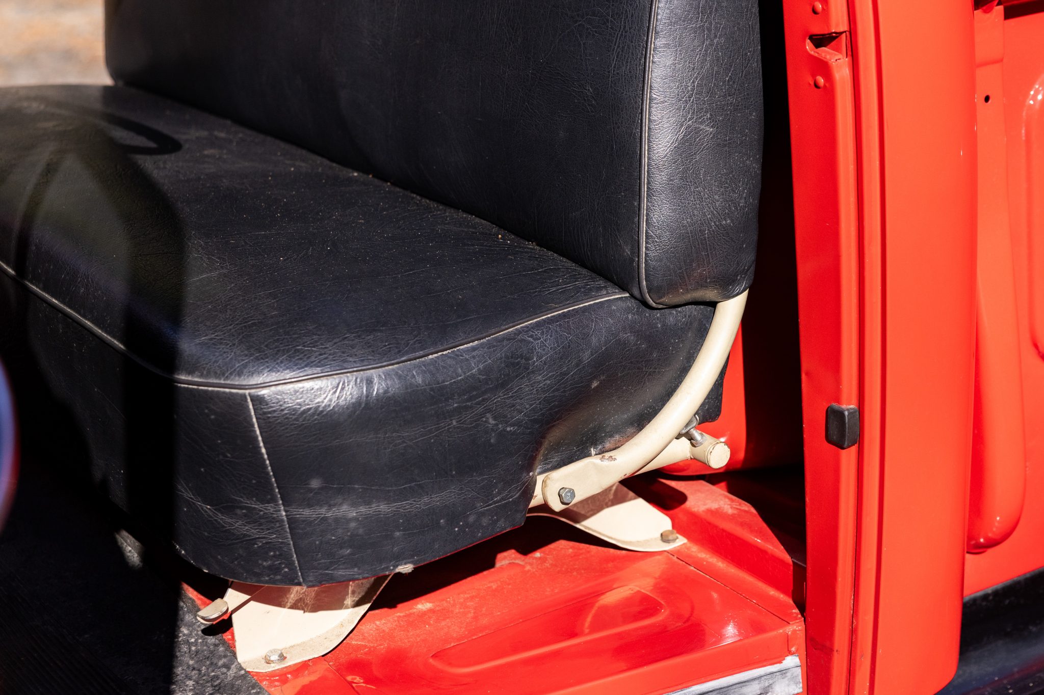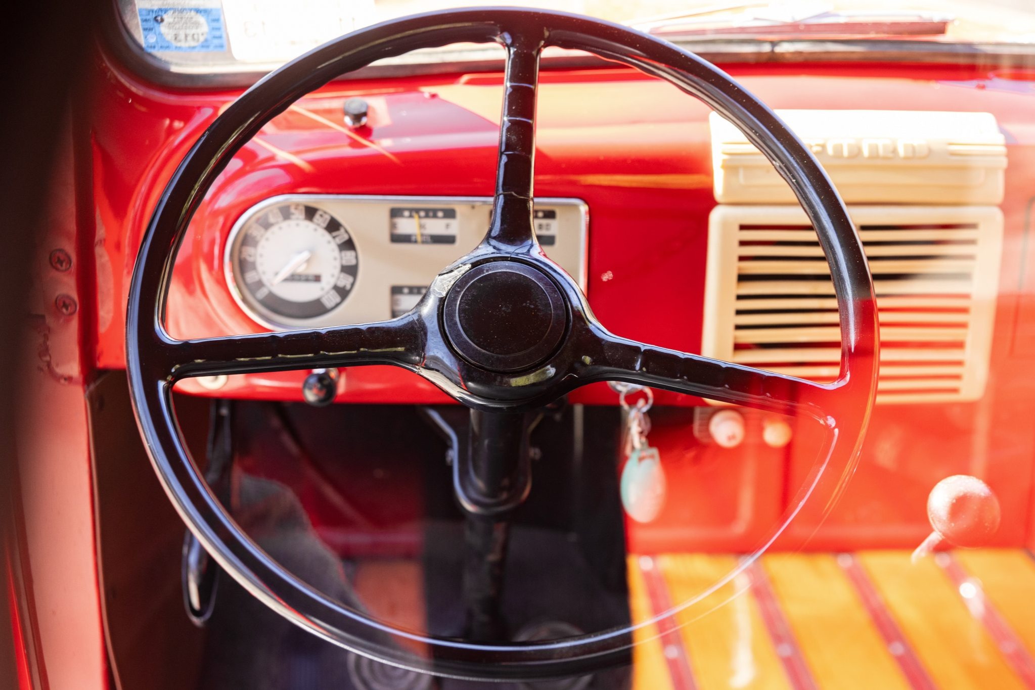 This 1948 Ford F-1 pickup is powered by a 226ci flathead inline-six paired with a four-speed manual transmission. Finished in red over black vinyl upholstery, the truck is equipped with black-finished bumpers, black-finished running boards, a wood cargo bed floor, red-finished 16″ steel wheels with bright hubcaps, a driver’s side mirror, a PerTronix ignition system, a heater, and a glovebox.