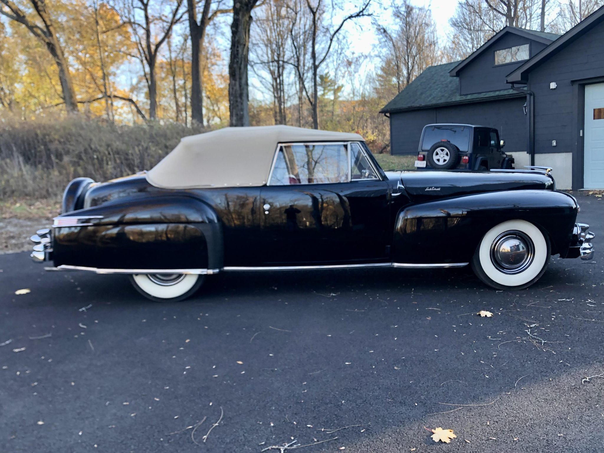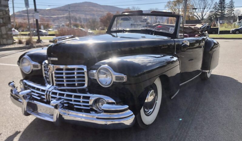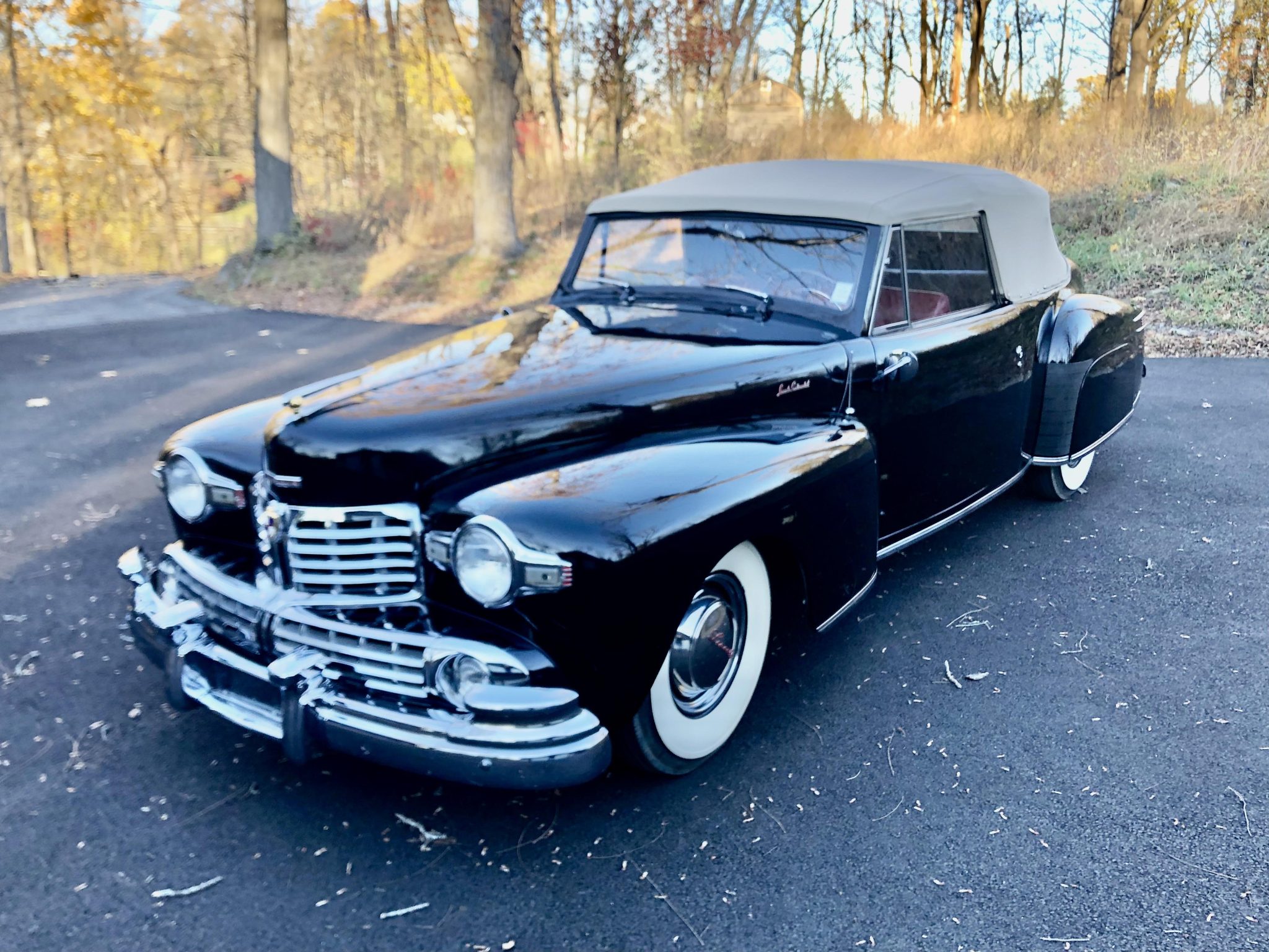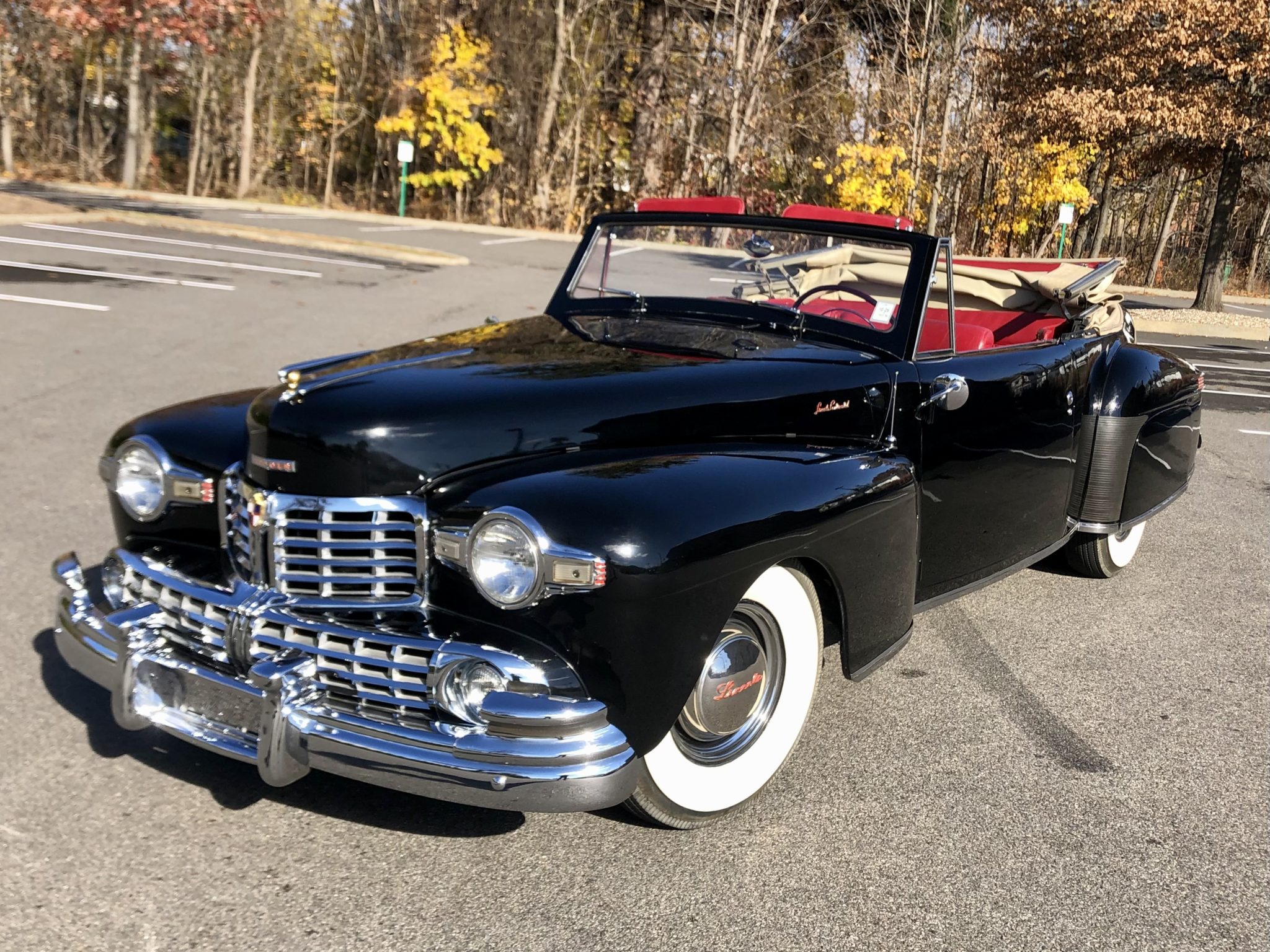 This 1948 Lincoln Continental is one of 452 cabriolets built for the model year, and it is said to have been refurbished around 2000. Finished in black with a tan soft top over red leather upholstery, the vehicle is powered by a 292ci V12 paired with a three-speed manual transmission. Features include 15″ steel wheels, chrome hubcaps and trim rings, whitewall tires, a rear-mounted spare-tire carrier, hydraulic drum brakes, push-button door handles, rear fender skirts, seatbelts, and an AM radio.