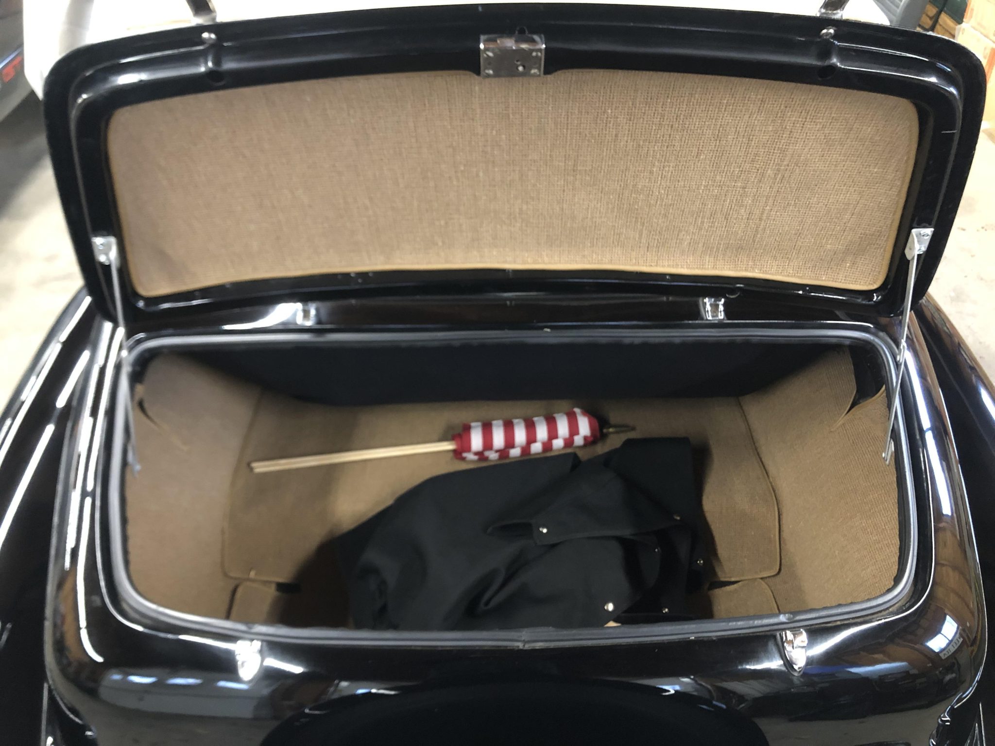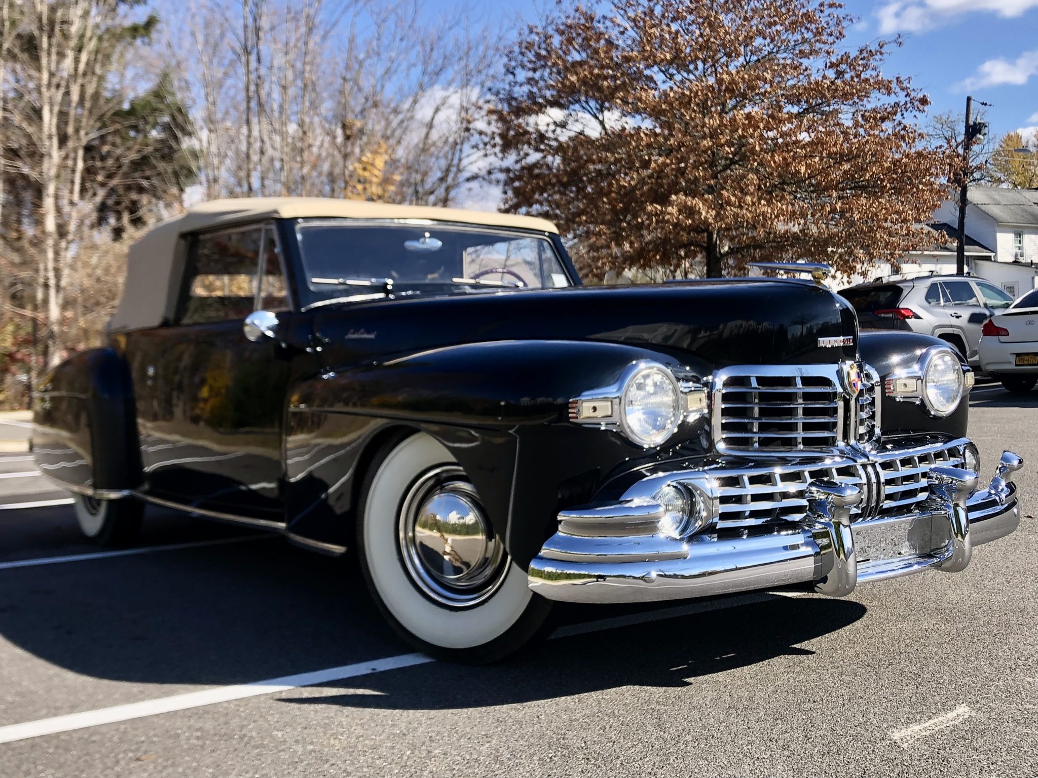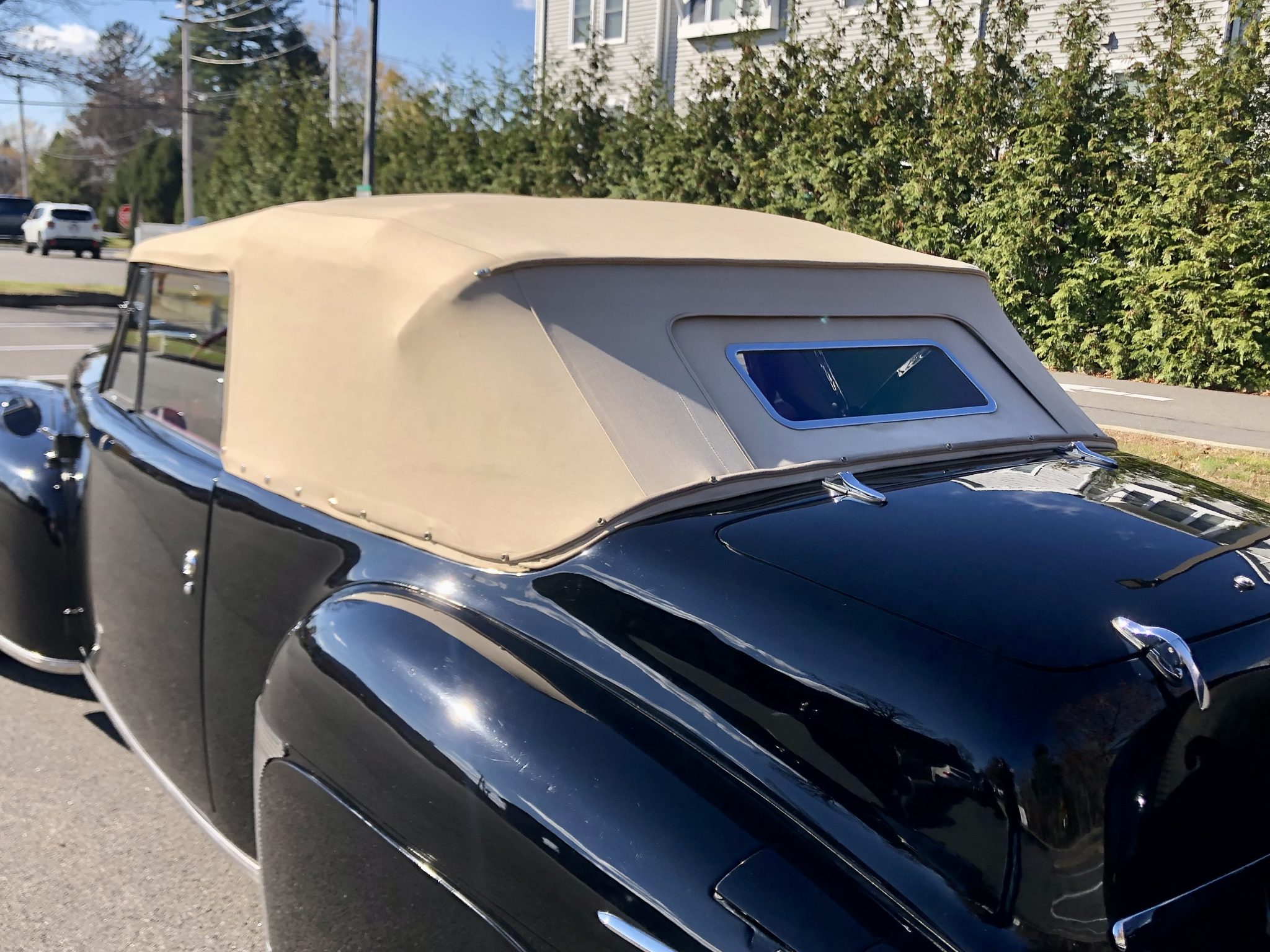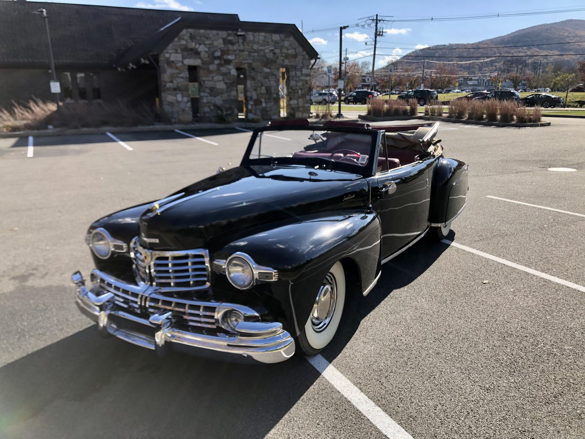 This 1948 Lincoln Continental is one of 452 cabriolets built for the model year, and it is said to have been refurbished around 2000. Finished in black with a tan soft top over red leather upholstery, the vehicle is powered by a 292ci V12 paired with a three-speed manual transmission. Features include 15″ steel wheels, chrome hubcaps and trim rings, whitewall tires, a rear-mounted spare-tire carrier, hydraulic drum brakes, push-button door handles, rear fender skirts, seatbelts, and an AM radio.