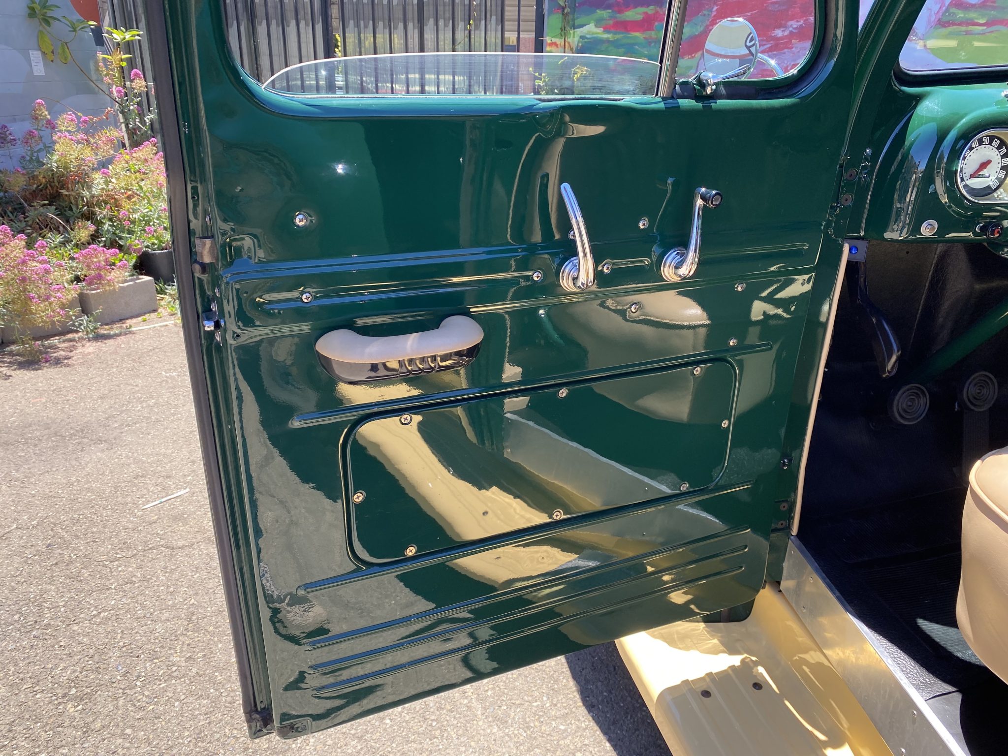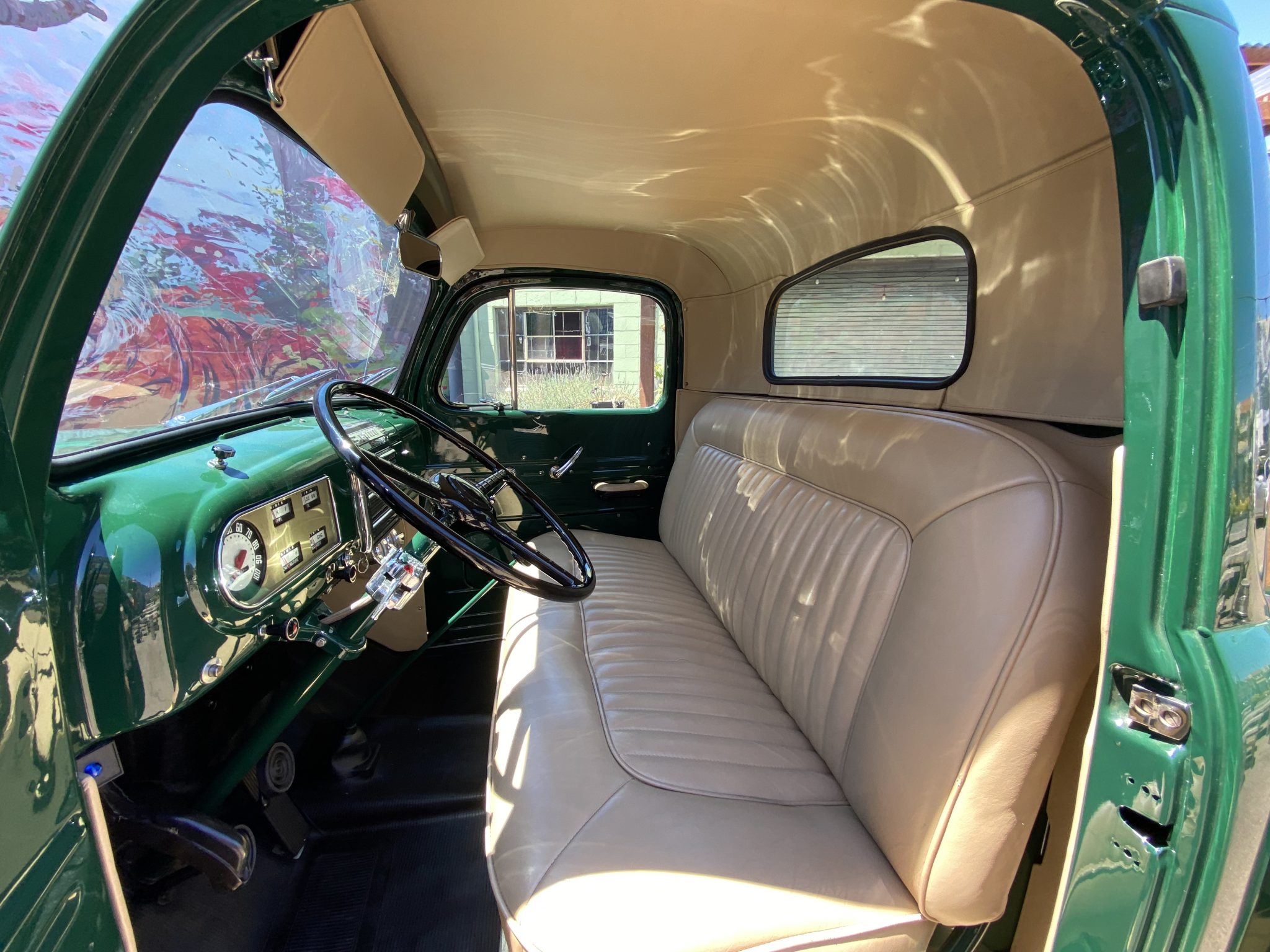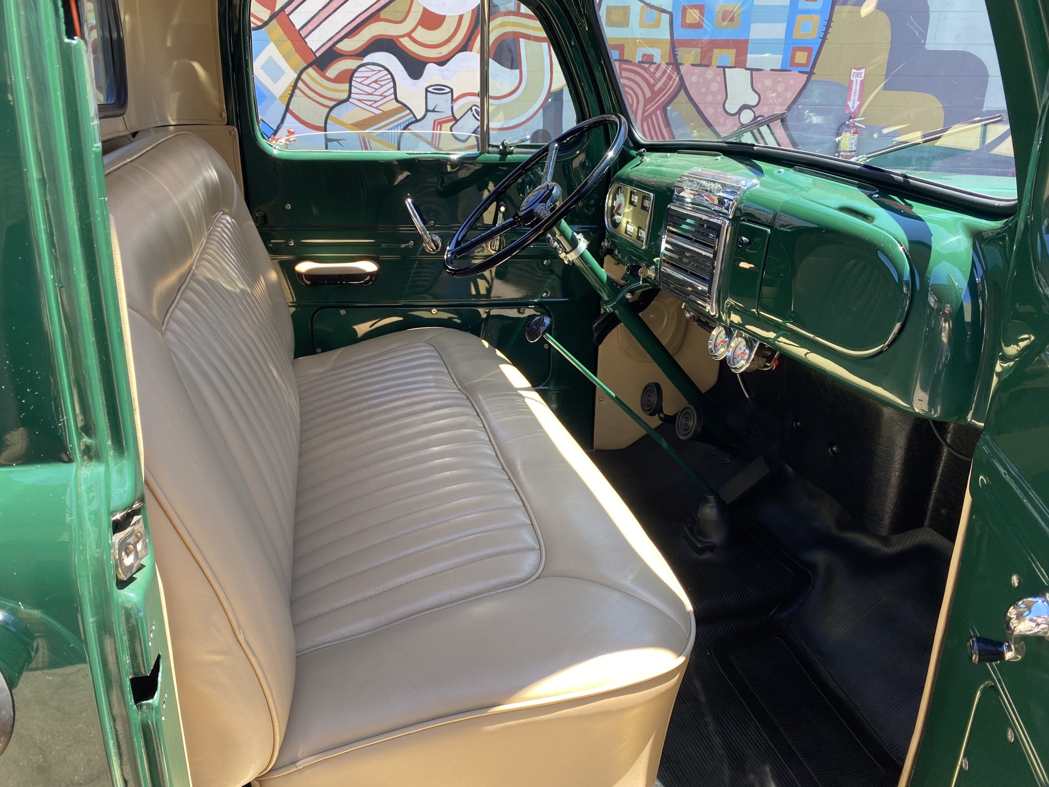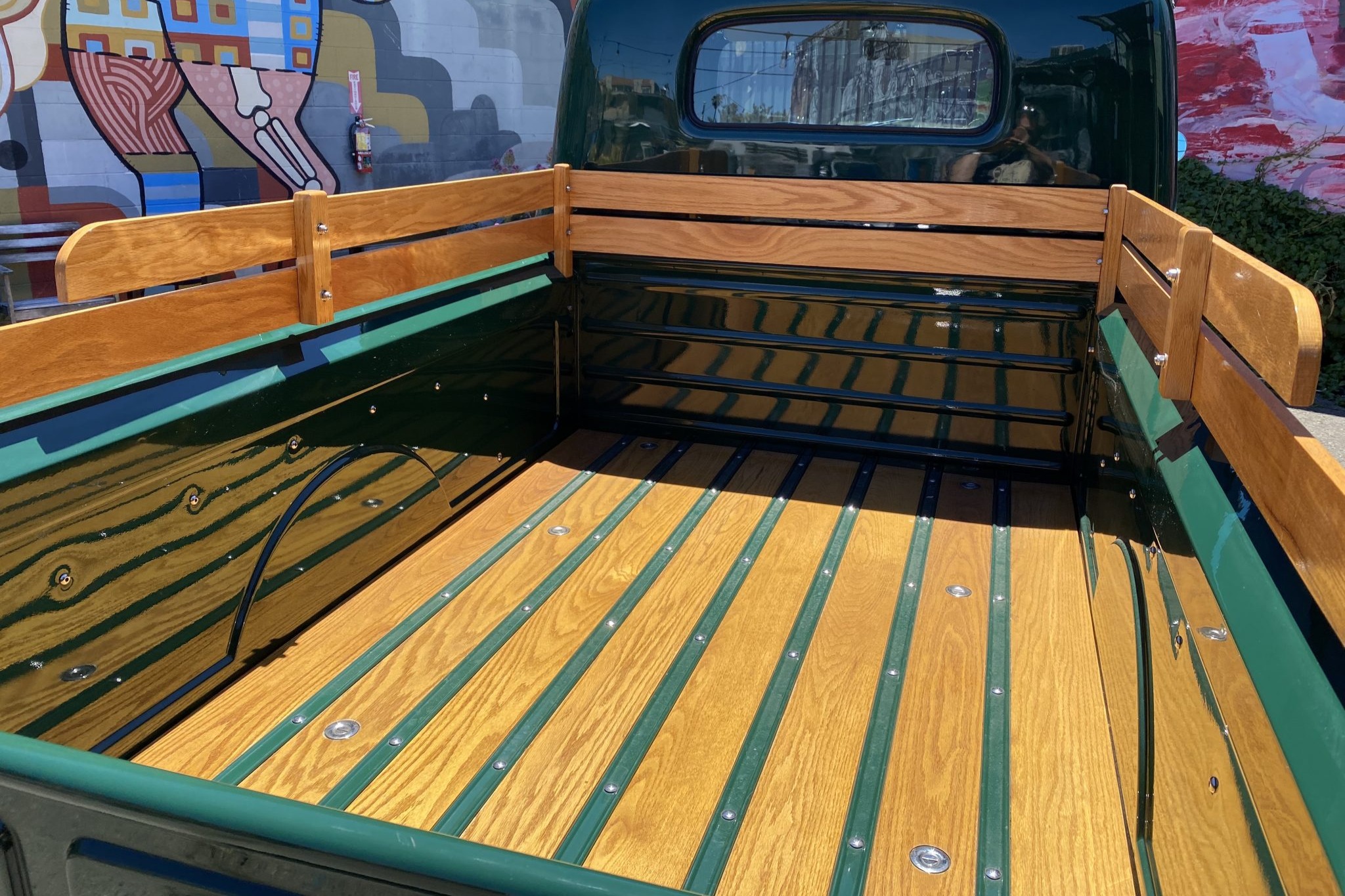 The truck is powered by a 239ci flathead V8 mated to a three-speed manual transmission, and it is finished in green over tan upholstery. Equipment includes 15″ steel wheels with bright hubcaps in addition to a 12-volt electrical conversion, a wood-plank bed floor, wood side stakes and rails, chrome bumpers, a heater, and a Pioneer stereo.