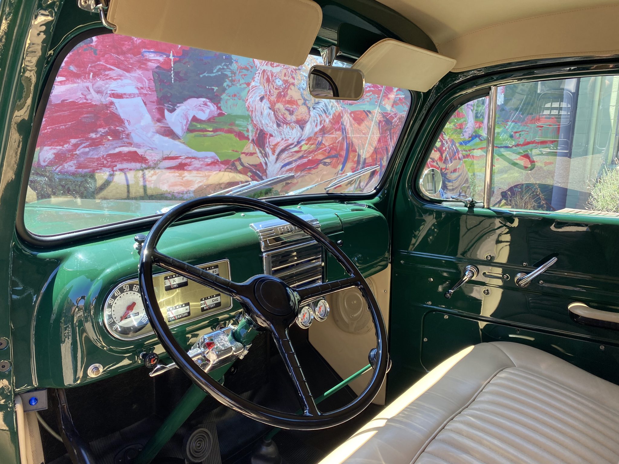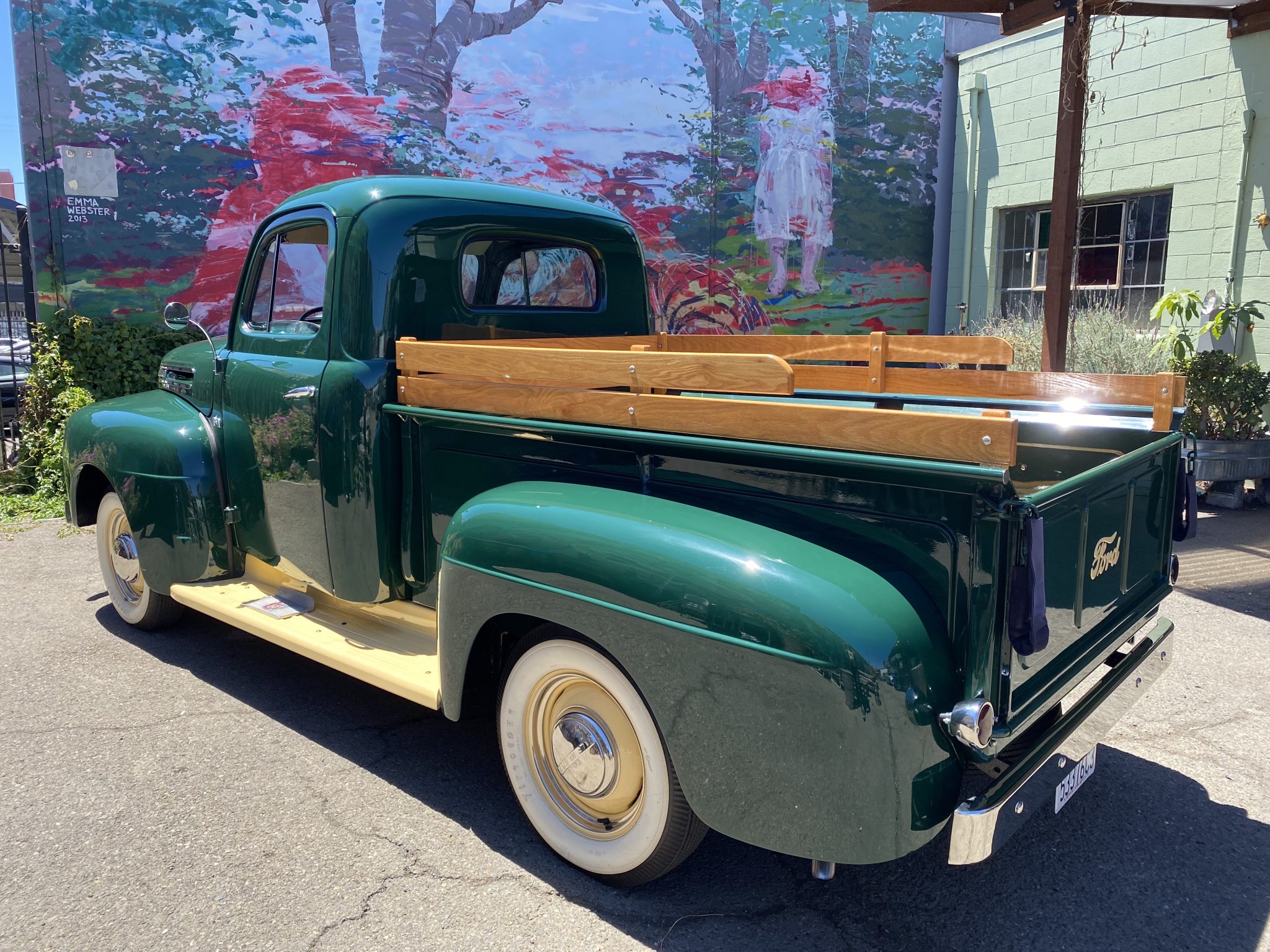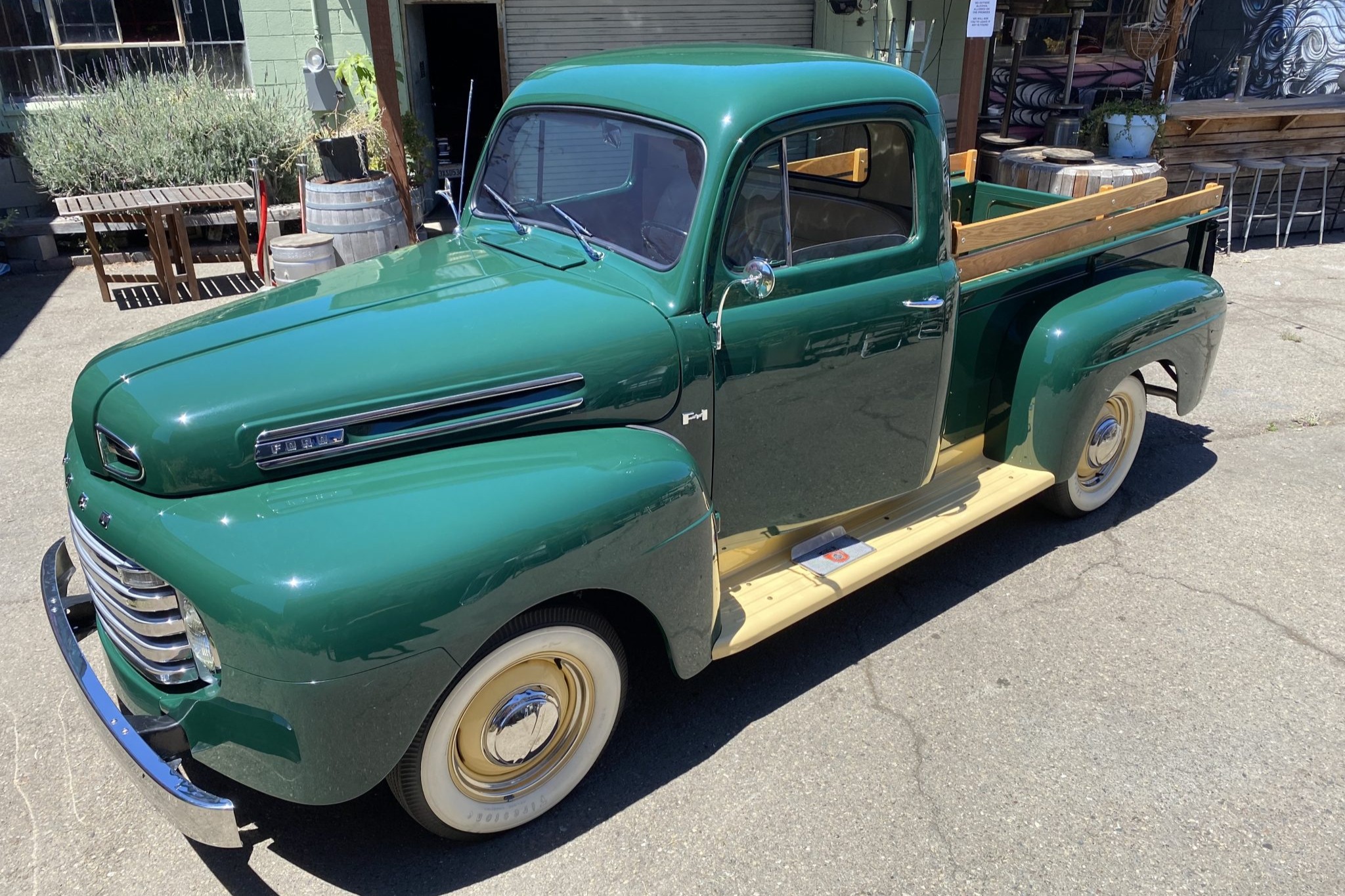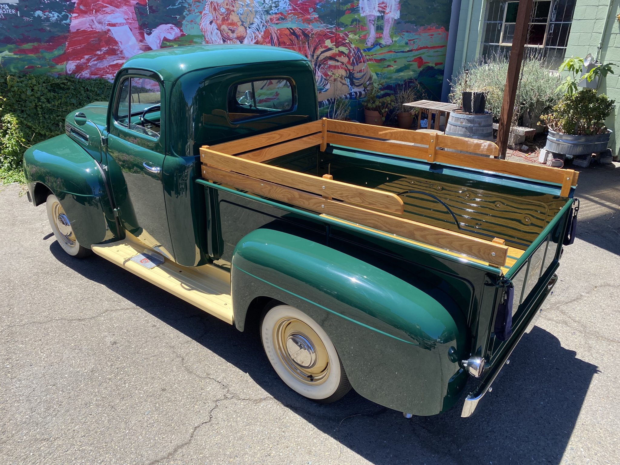 The truck is powered by a 239ci flathead V8 mated to a three-speed manual transmission, and it is finished in green over tan upholstery. Equipment includes 15″ steel wheels with bright hubcaps in addition to a 12-volt electrical conversion, a wood-plank bed floor, wood side stakes and rails, chrome bumpers, a heater, and a Pioneer stereo.
