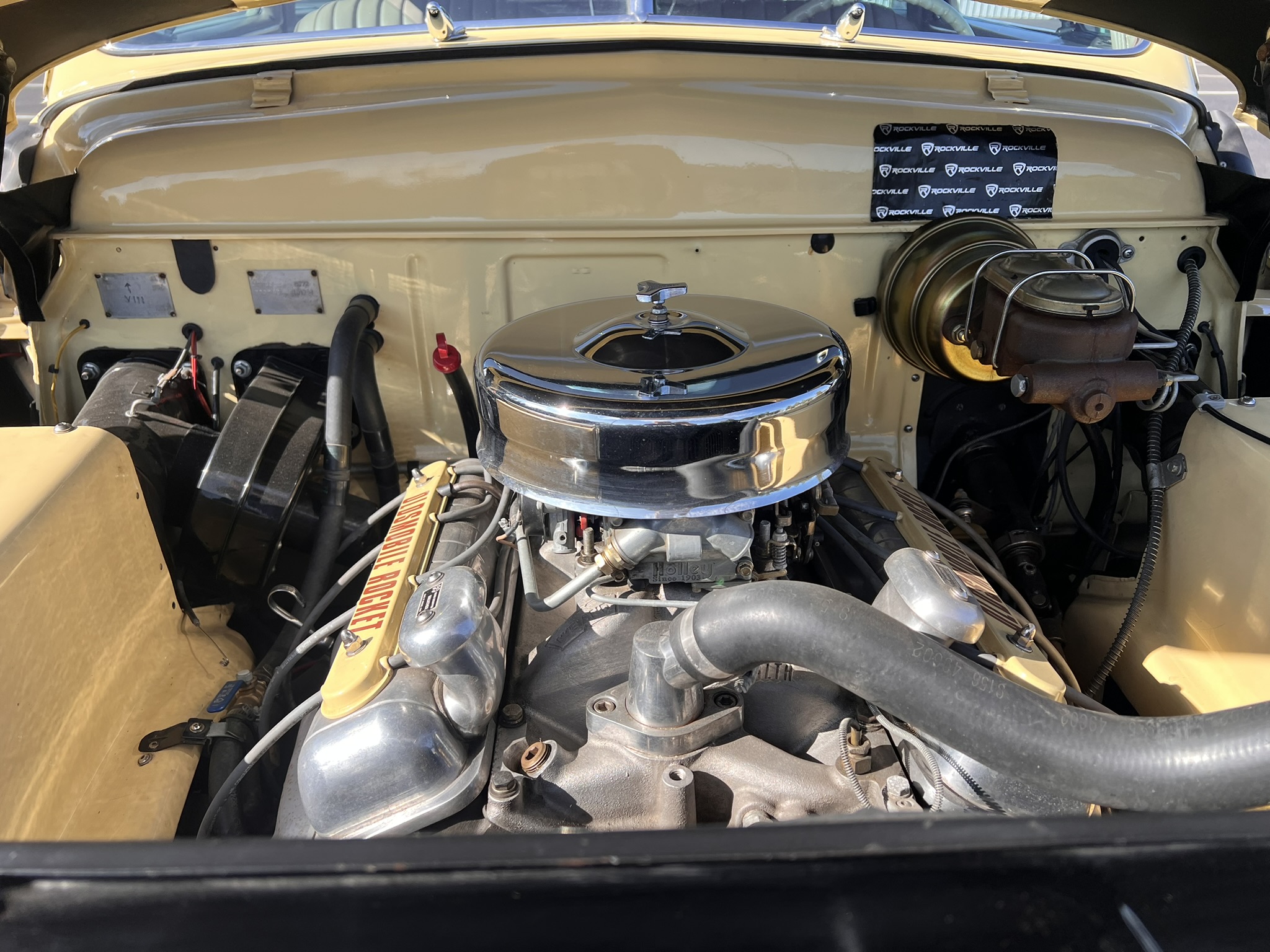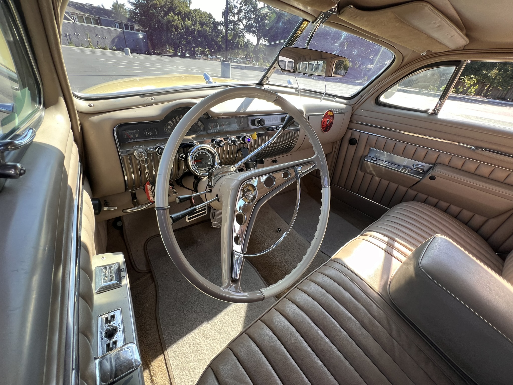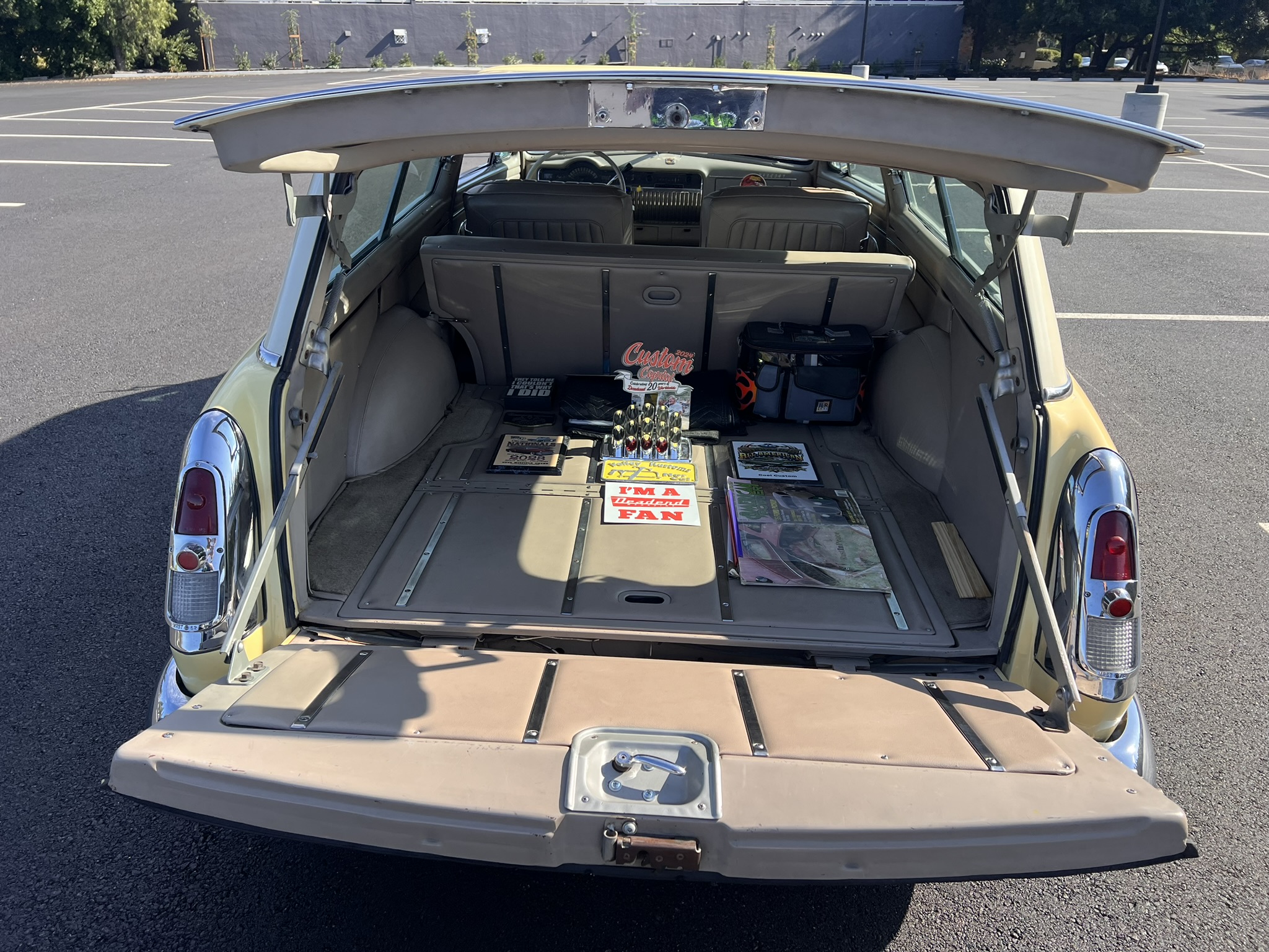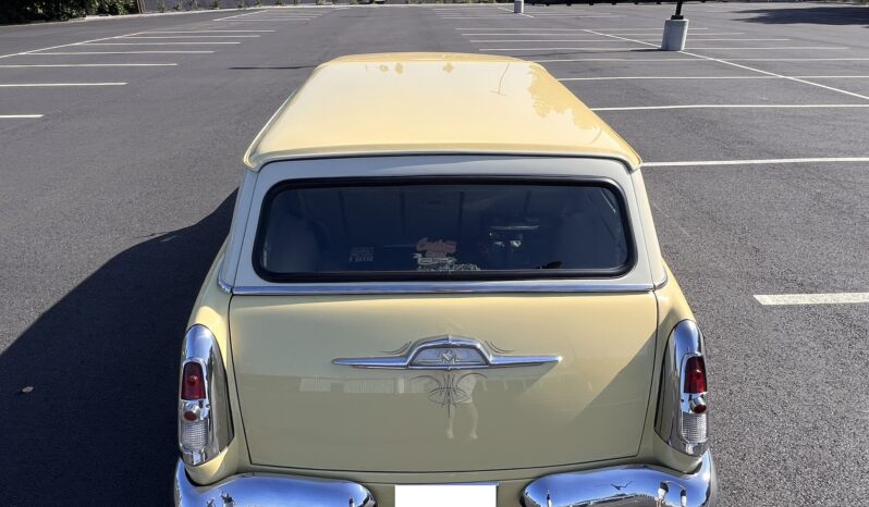 The work involved installing a 355ci V8 and a 700R4 four-speed automatic transmission as well as replacing the front suspension, chopping the windshield and doors, fabricating quarter panel extensions, fitting a Ford station wagon roof, retrimming the interior with replacement seats and beige vinyl upholstery, and refinishing the body in yellow and white. Additional modifications include air-adjustable suspension, 14″ chrome wheels, power steering, a Holley four-barrel carburetor, MSD ignition, Stewart-Warner instrumentation, power windows, and a Pioneer CD stereo.
