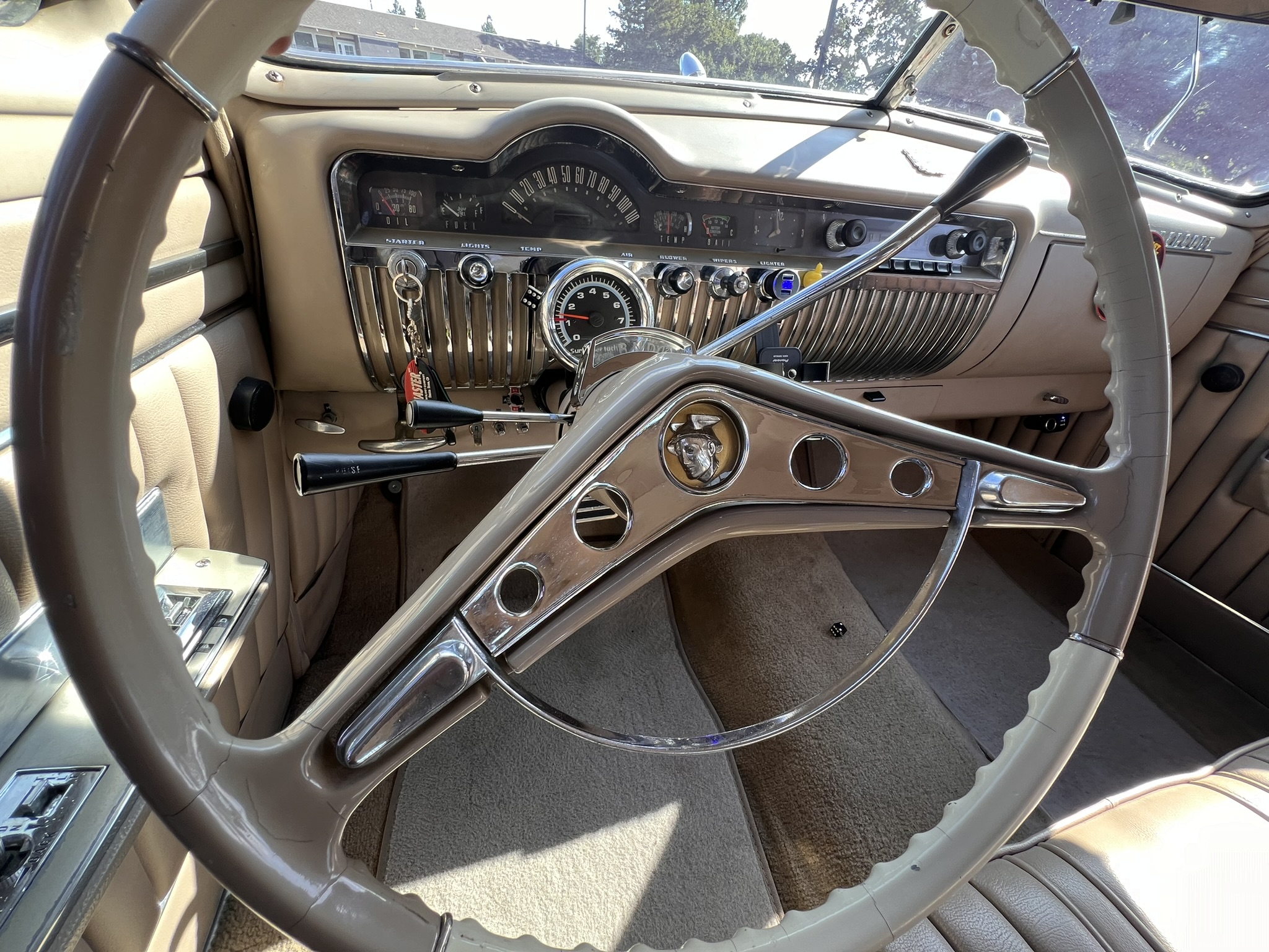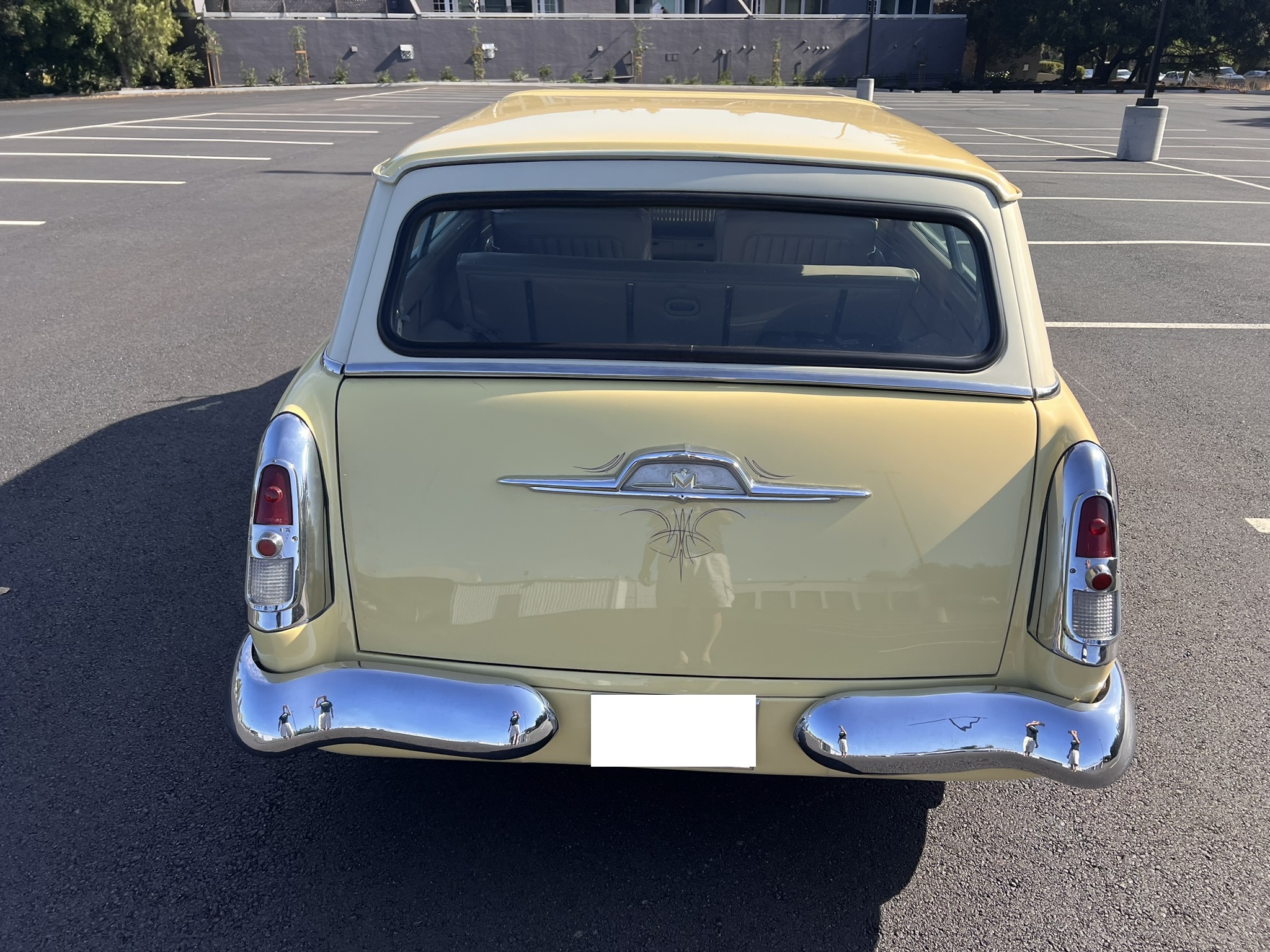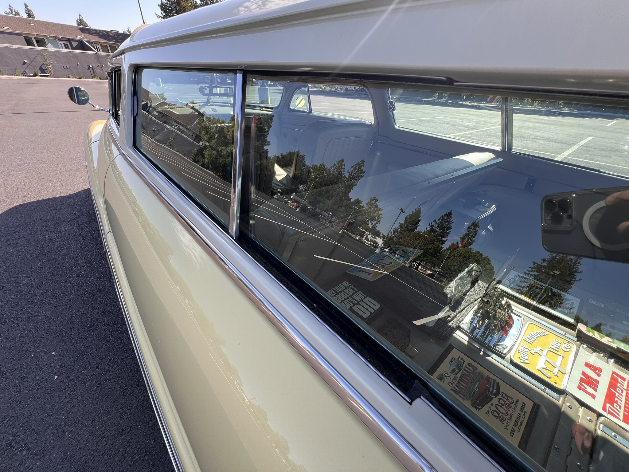 The work involved installing a 355ci V8 and a 700R4 four-speed automatic transmission as well as replacing the front suspension, chopping the windshield and doors, fabricating quarter panel extensions, fitting a Ford station wagon roof, retrimming the interior with replacement seats and beige vinyl upholstery, and refinishing the body in yellow and white. Additional modifications include air-adjustable suspension, 14″ chrome wheels, power steering, a Holley four-barrel carburetor, MSD ignition, Stewart-Warner instrumentation, power windows, and a Pioneer CD stereo.