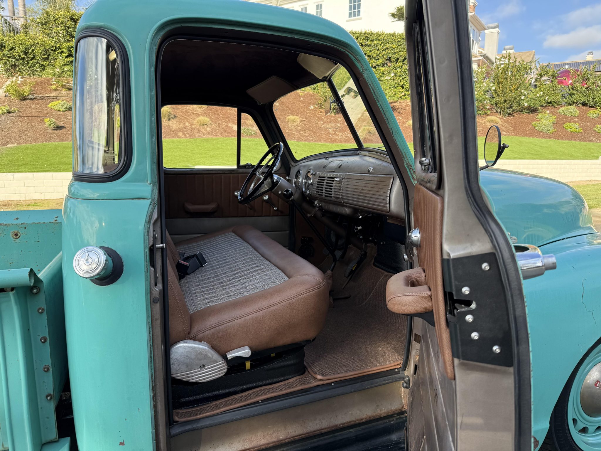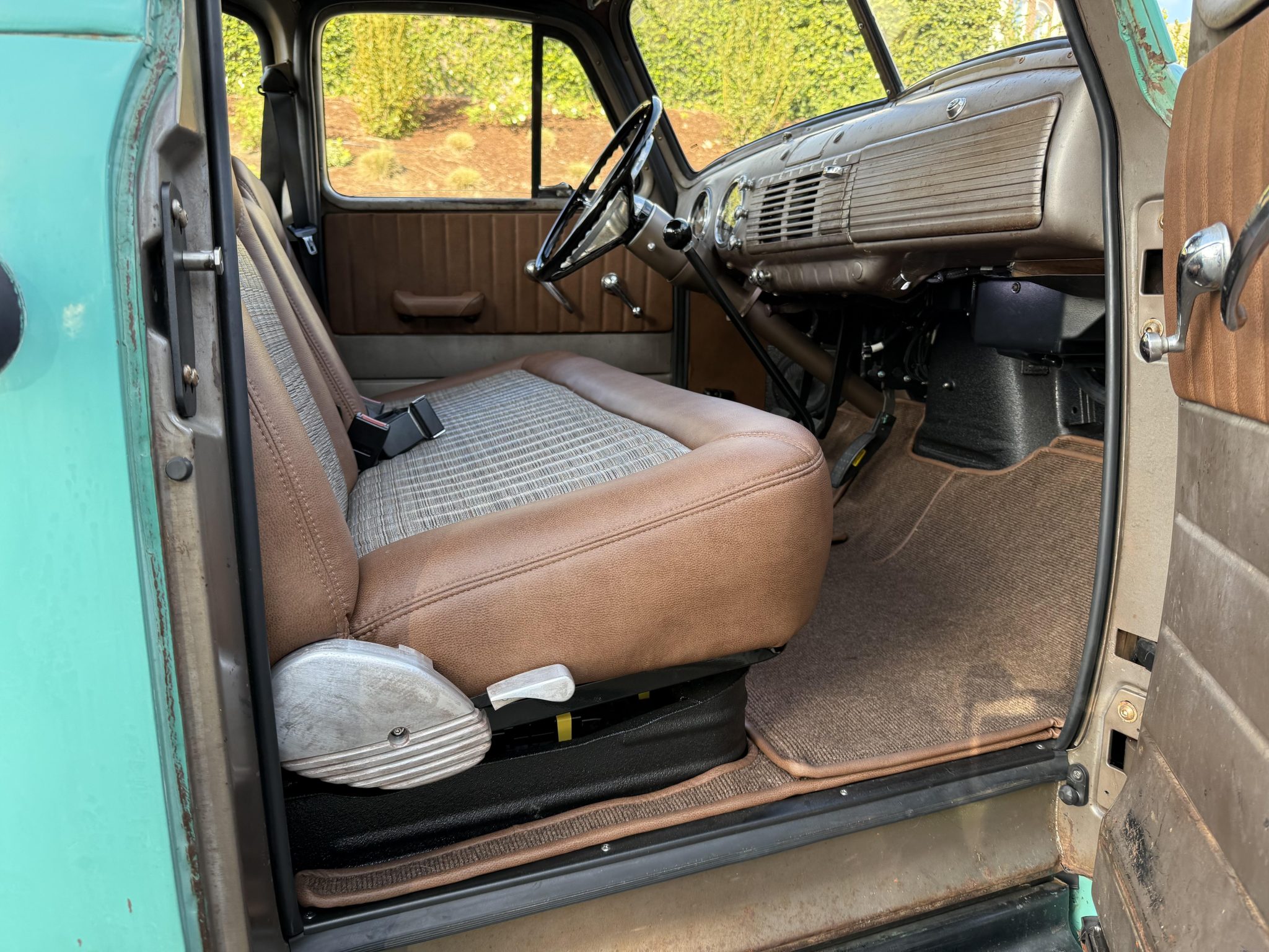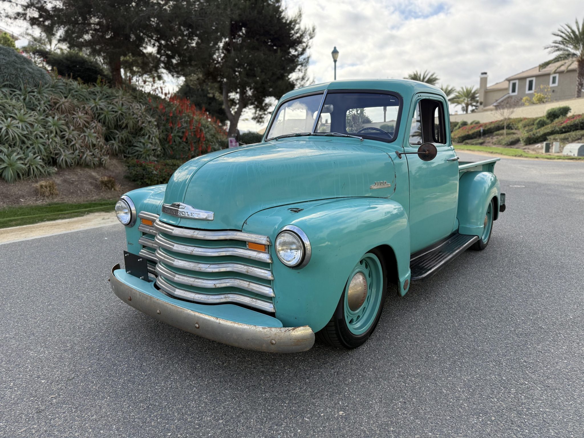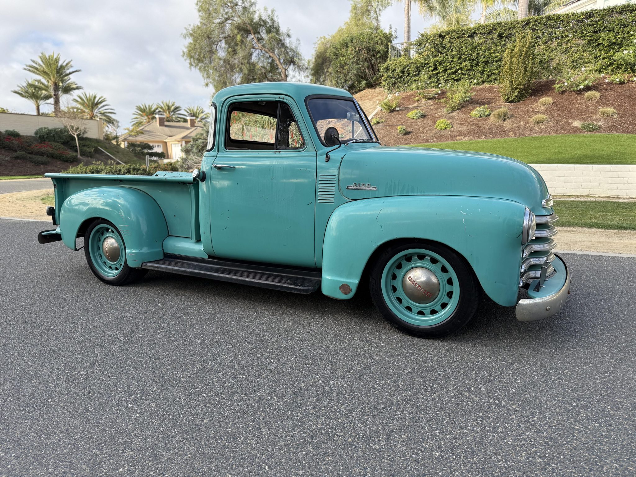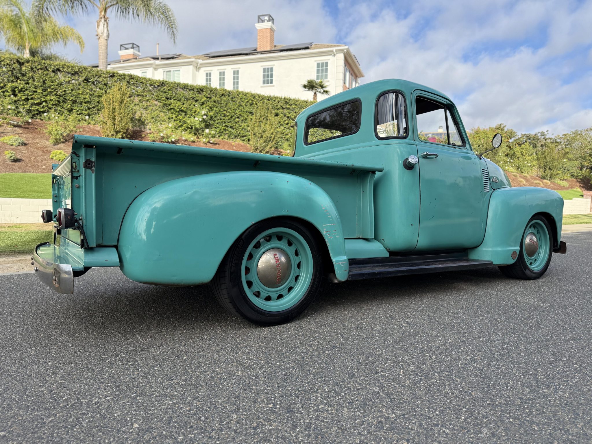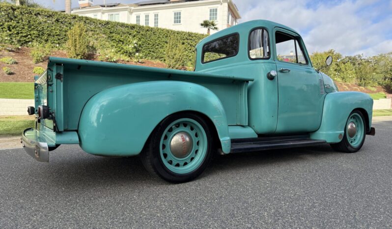 This 1953 Chevrolet 3100 is a five-window pickup that was built by ICON 4×4 Work involved installing an Art Morrison chassis, a 6.2-liter E-Rod LS3 V8 crate engine, a Tremec Magnum six-speed manual transmission, and a Strange Engineering limited-slip rear differential as well as replacing the wood bed floor, re-wiring the electrical system, and re-trimming the interior. The truck is finished in faded turquoise paint over tan upholstery, and additional details include adjustable coilovers, four-wheel independent suspension, power steering, a Hydratech hydraulic brake booster, Brembo four-wheel disc brakes, 18″ artillery-style wheels, Vintage Air climate control, Dakota Digital instrumentation, and a custom stereo.