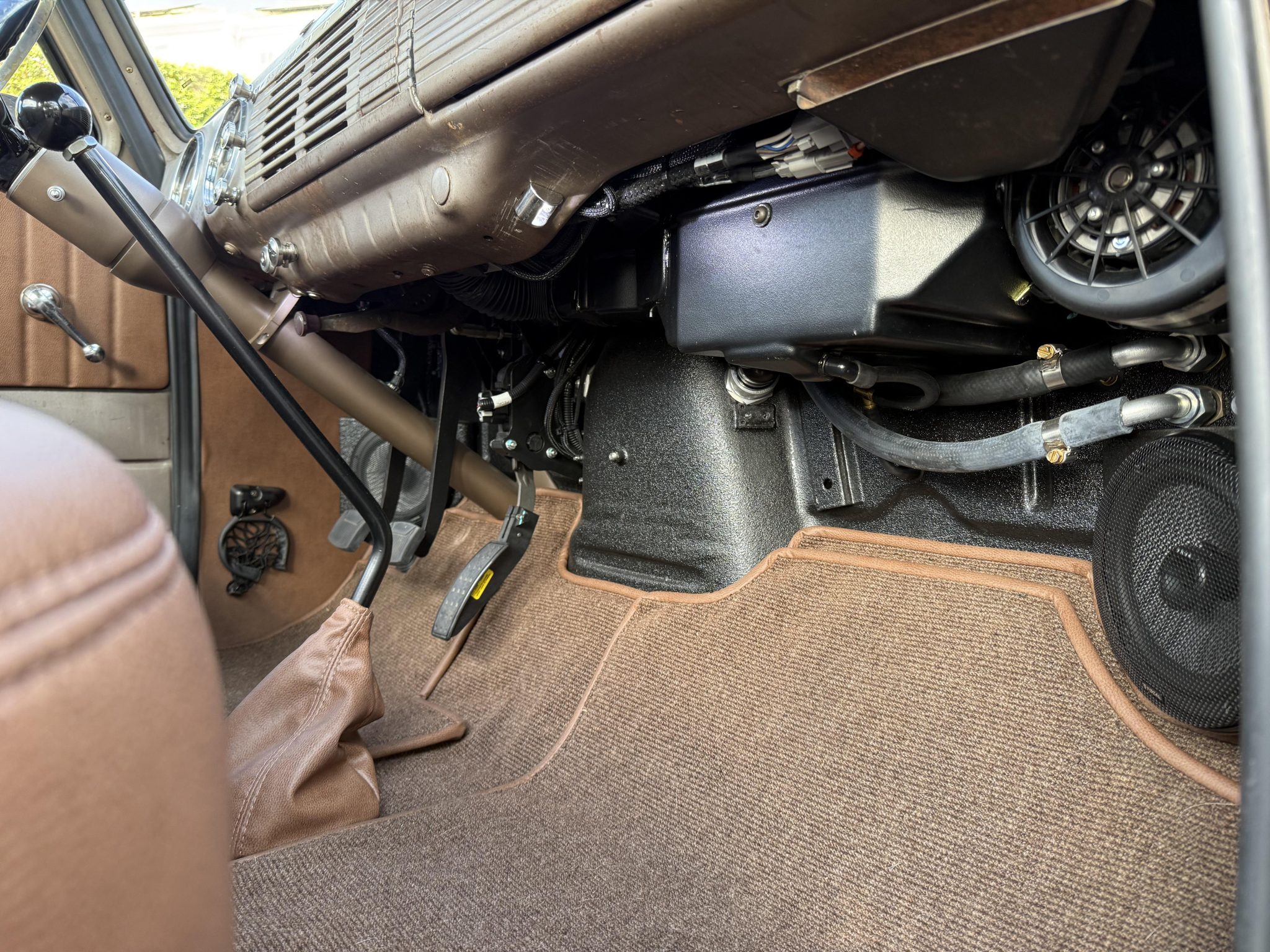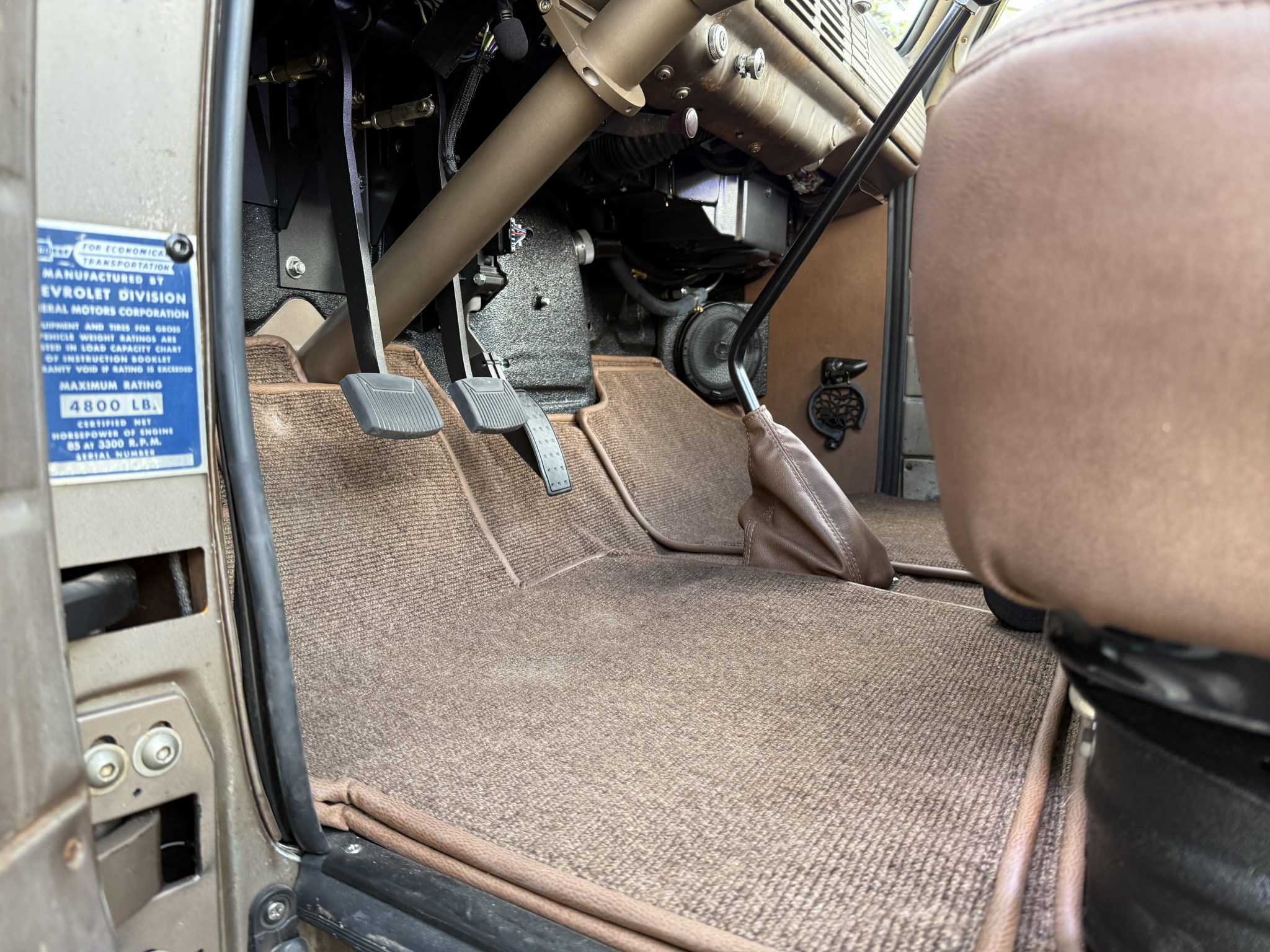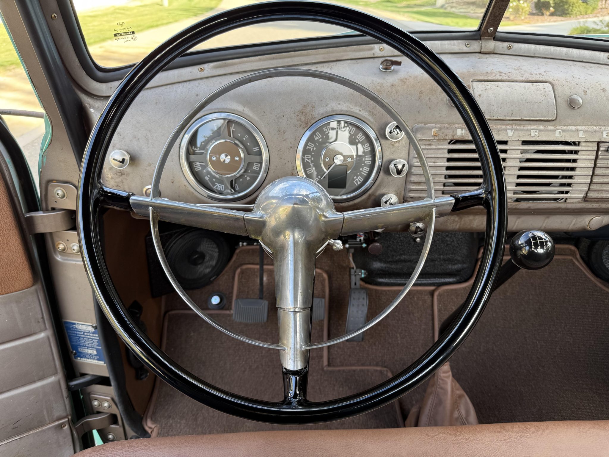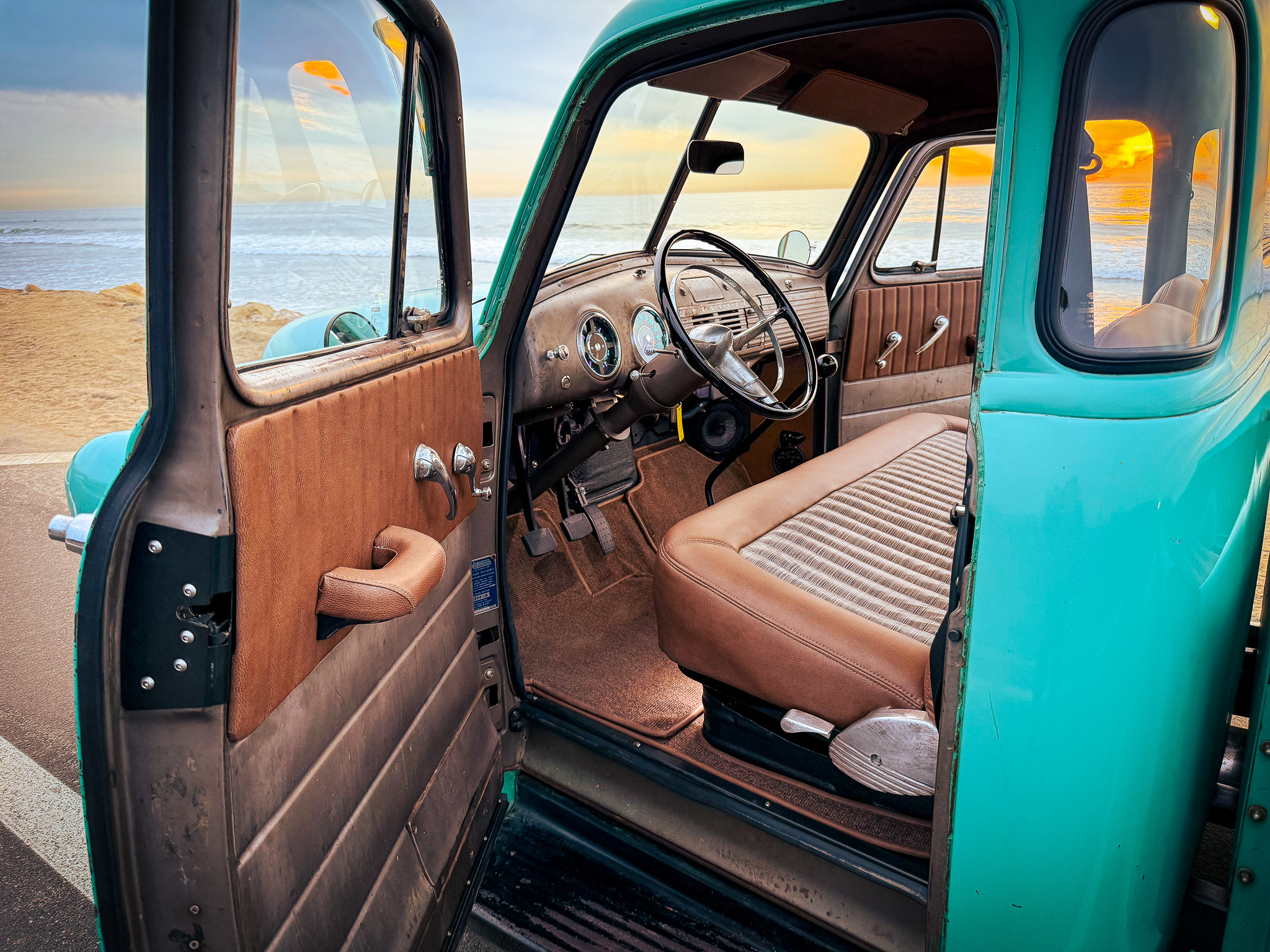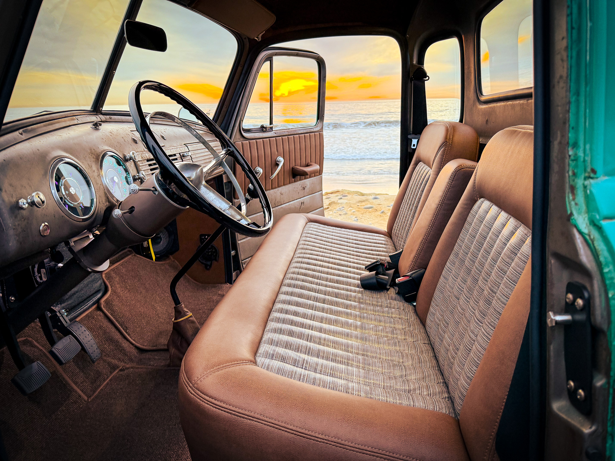 This 1953 Chevrolet 3100 is a five-window pickup that was built by ICON 4×4 Work involved installing an Art Morrison chassis, a 6.2-liter E-Rod LS3 V8 crate engine, a Tremec Magnum six-speed manual transmission, and a Strange Engineering limited-slip rear differential as well as replacing the wood bed floor, re-wiring the electrical system, and re-trimming the interior. The truck is finished in faded turquoise paint over tan upholstery, and additional details include adjustable coilovers, four-wheel independent suspension, power steering, a Hydratech hydraulic brake booster, Brembo four-wheel disc brakes, 18″ artillery-style wheels, Vintage Air climate control, Dakota Digital instrumentation, and a custom stereo.