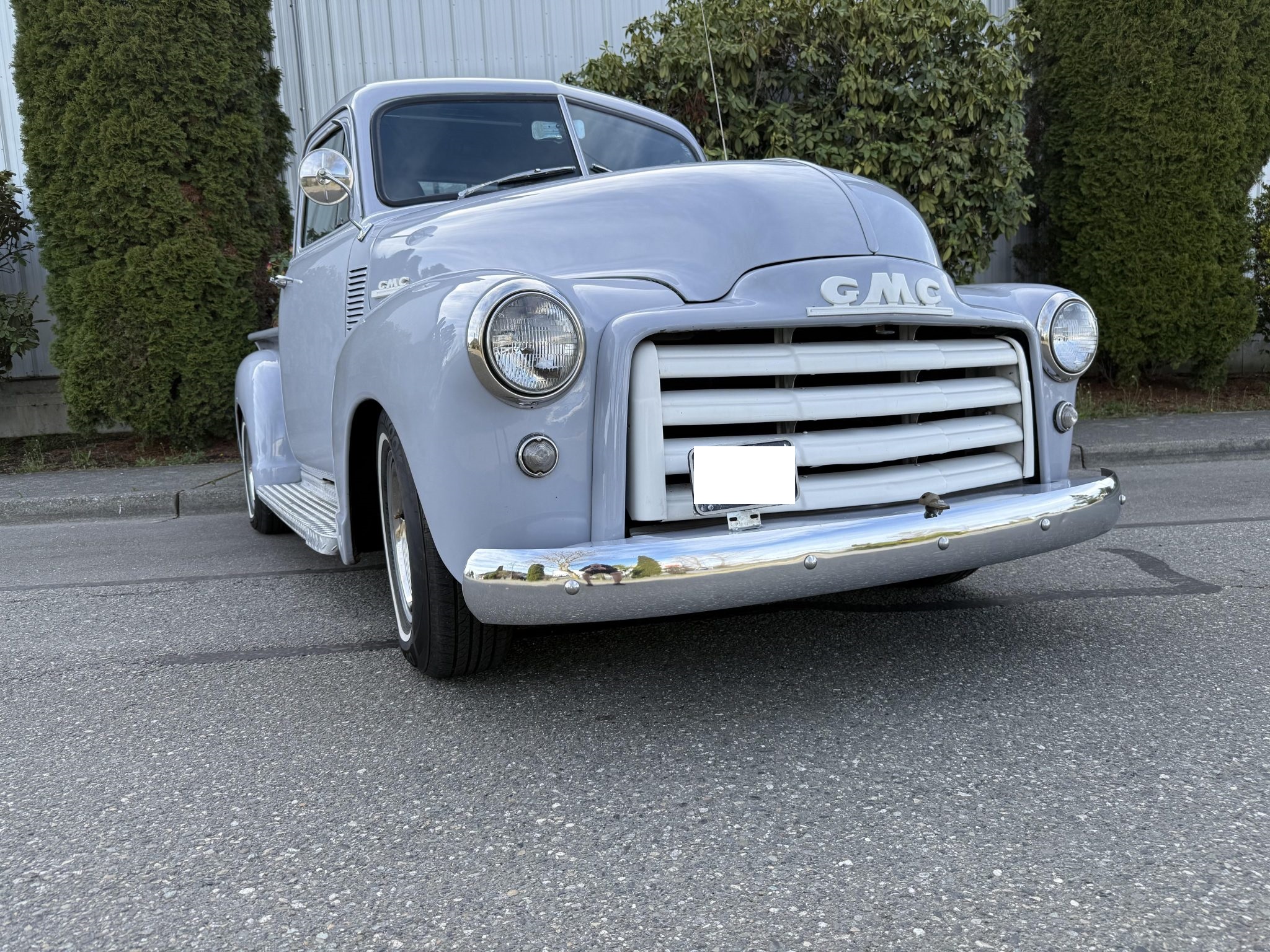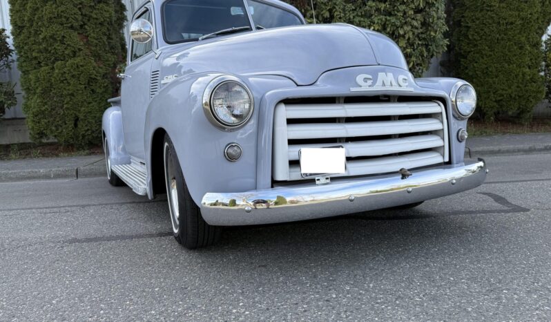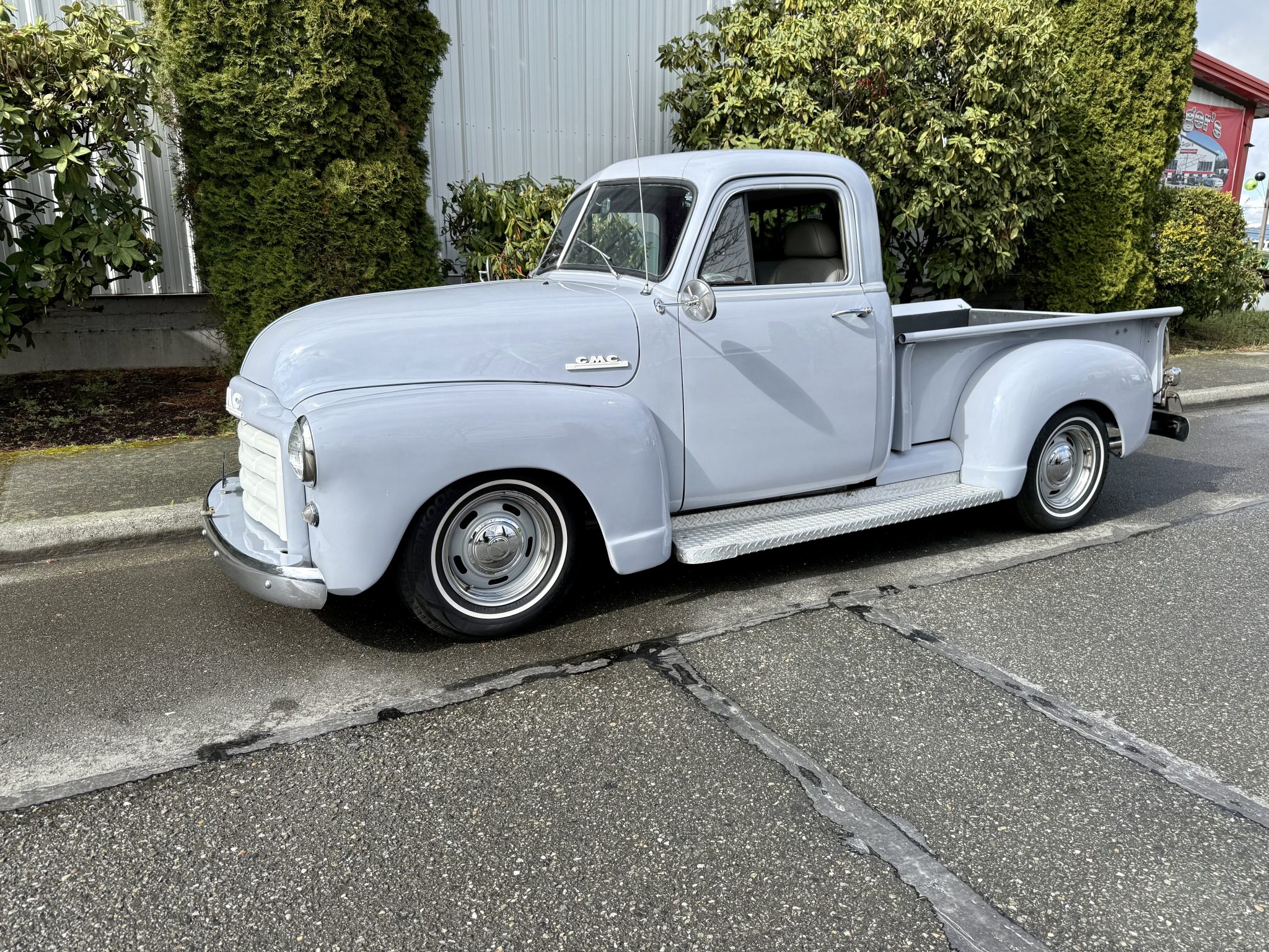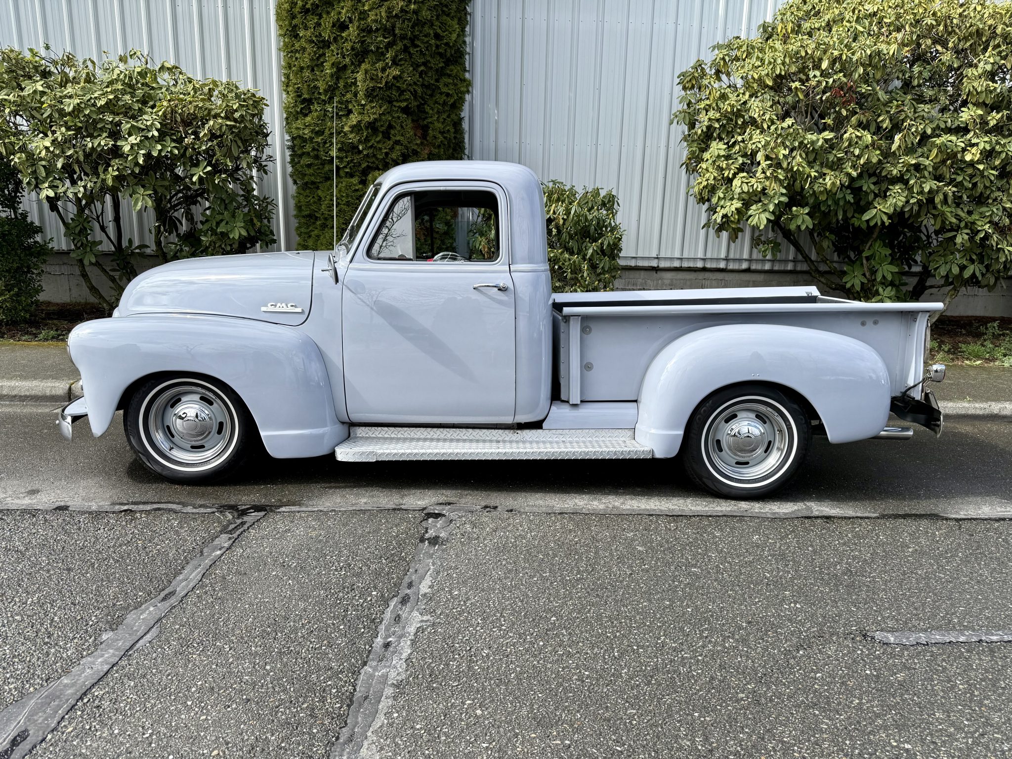 This 1953 GMC 150 is a 3/4-ton pickup that was refurbished and it rides on a Mustang II-style front suspension and air helper springs over 15″ Rally wheels. The truck is finished in gray over gray upholstery and is powered by a replacement inline-six paired with a three-speed automatic transmission. Additional equipment includes power steering, power-assisted front disc brakes, a wood bed floor, and diamond-plate running boards.