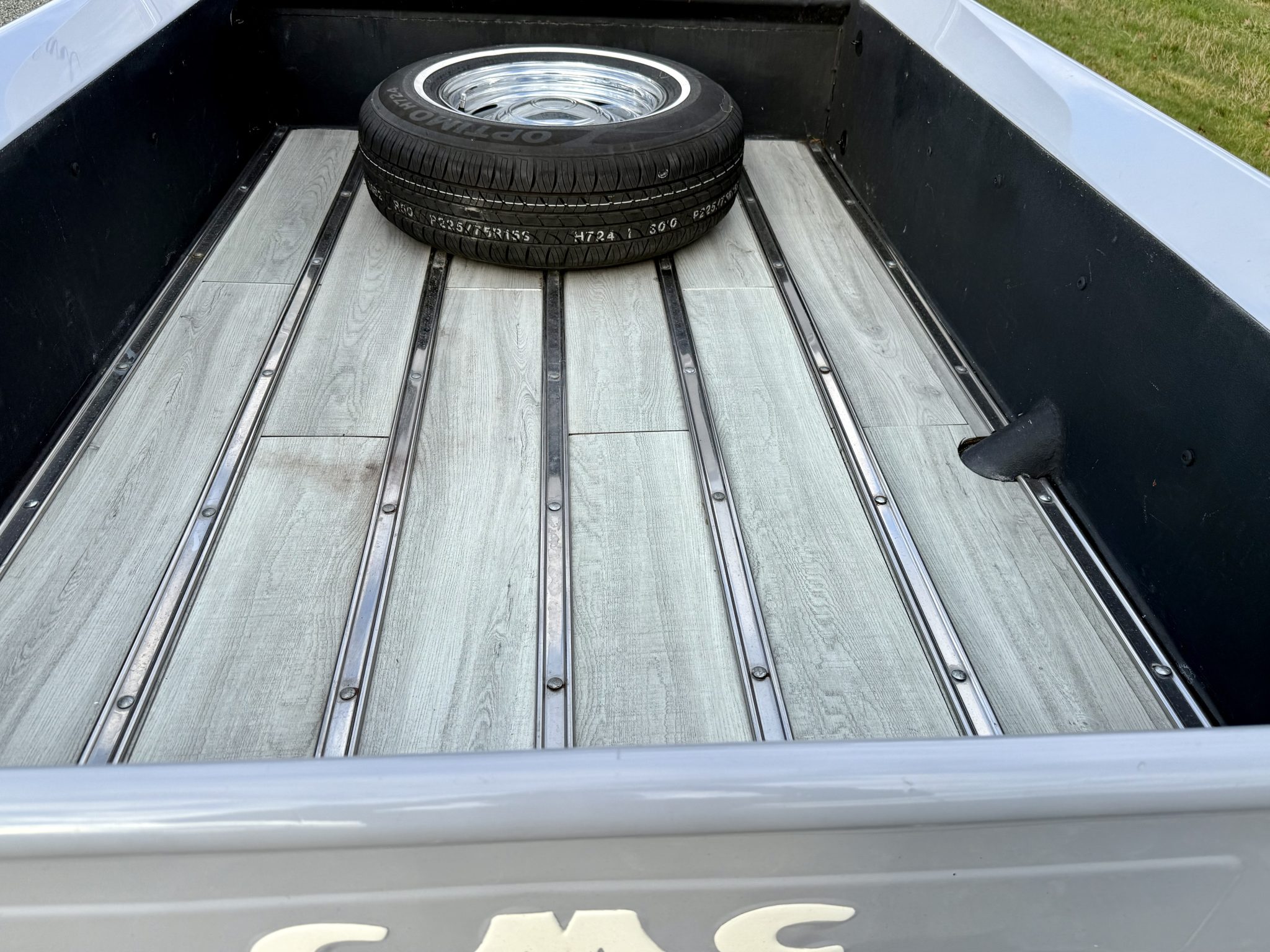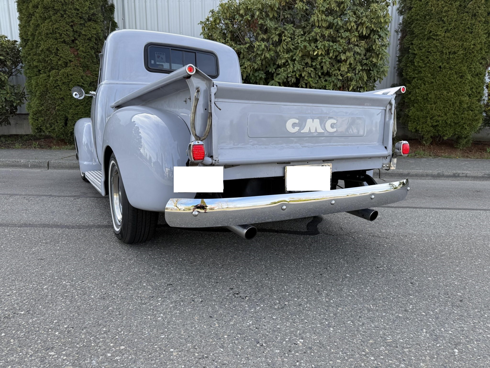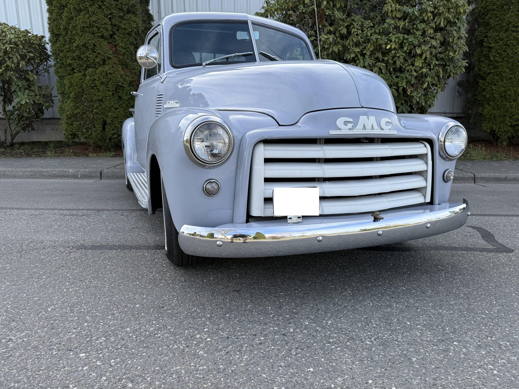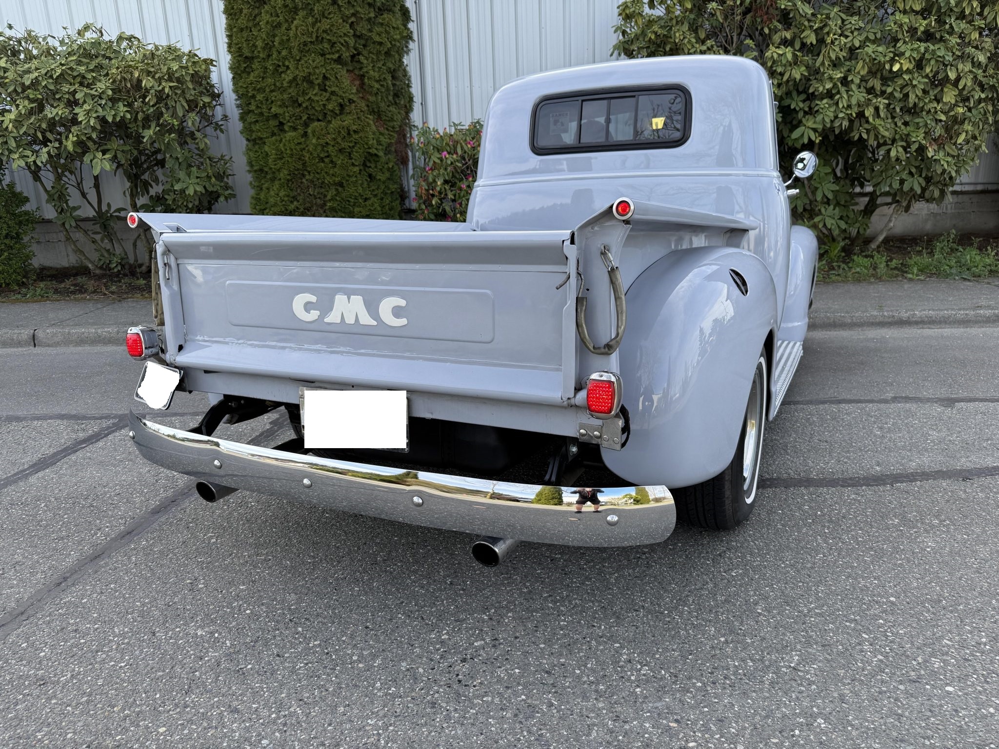 This 1953 GMC 150 is a 3/4-ton pickup that was refurbished and it rides on a Mustang II-style front suspension and air helper springs over 15″ Rally wheels. The truck is finished in gray over gray upholstery and is powered by a replacement inline-six paired with a three-speed automatic transmission. Additional equipment includes power steering, power-assisted front disc brakes, a wood bed floor, and diamond-plate running boards.