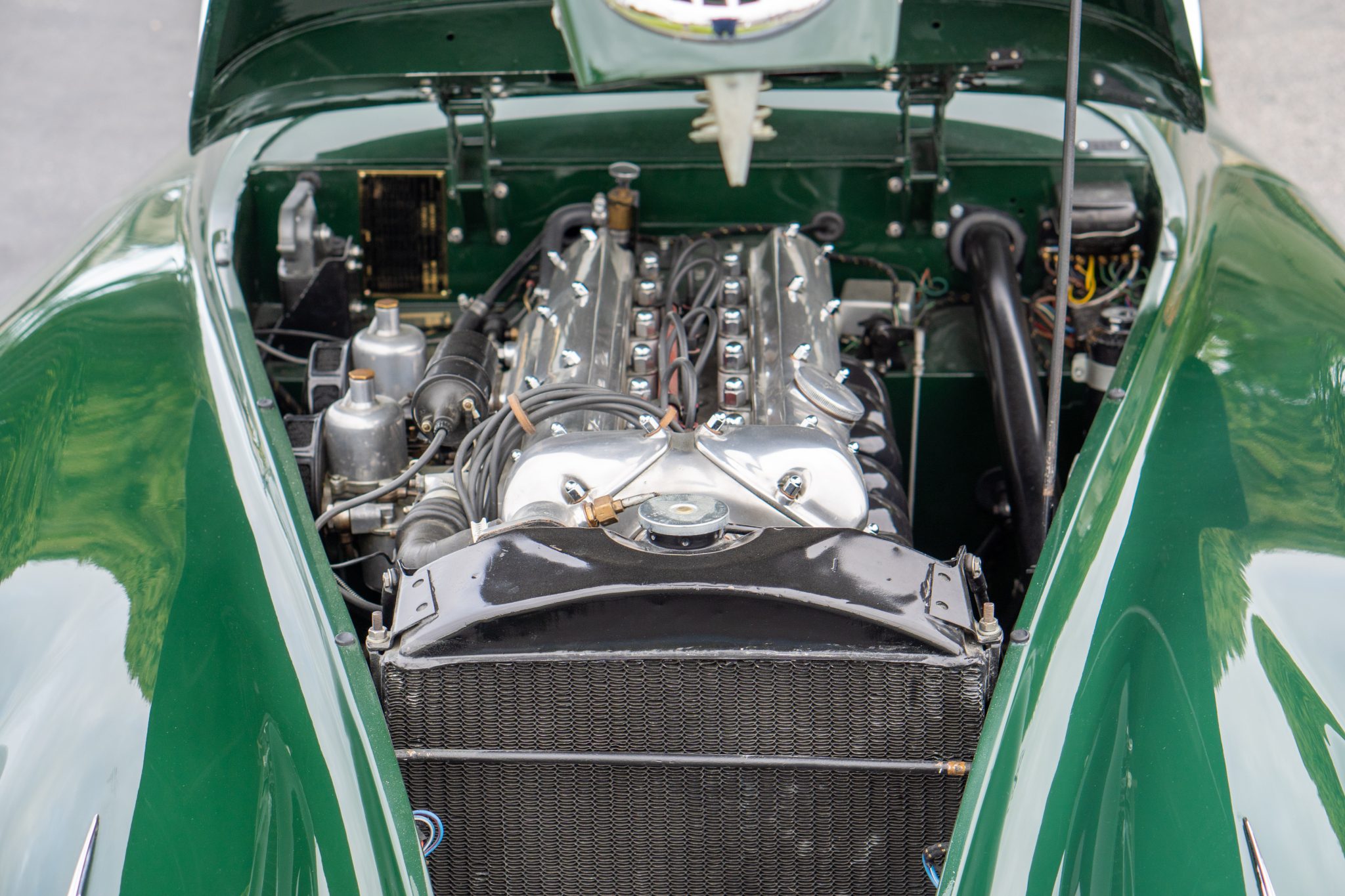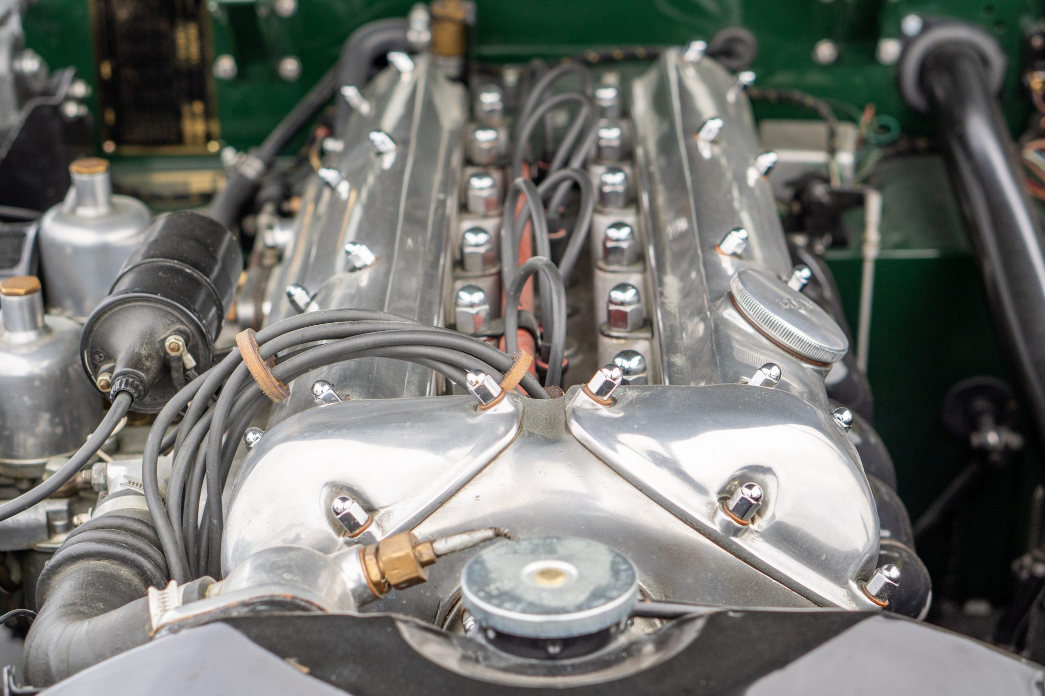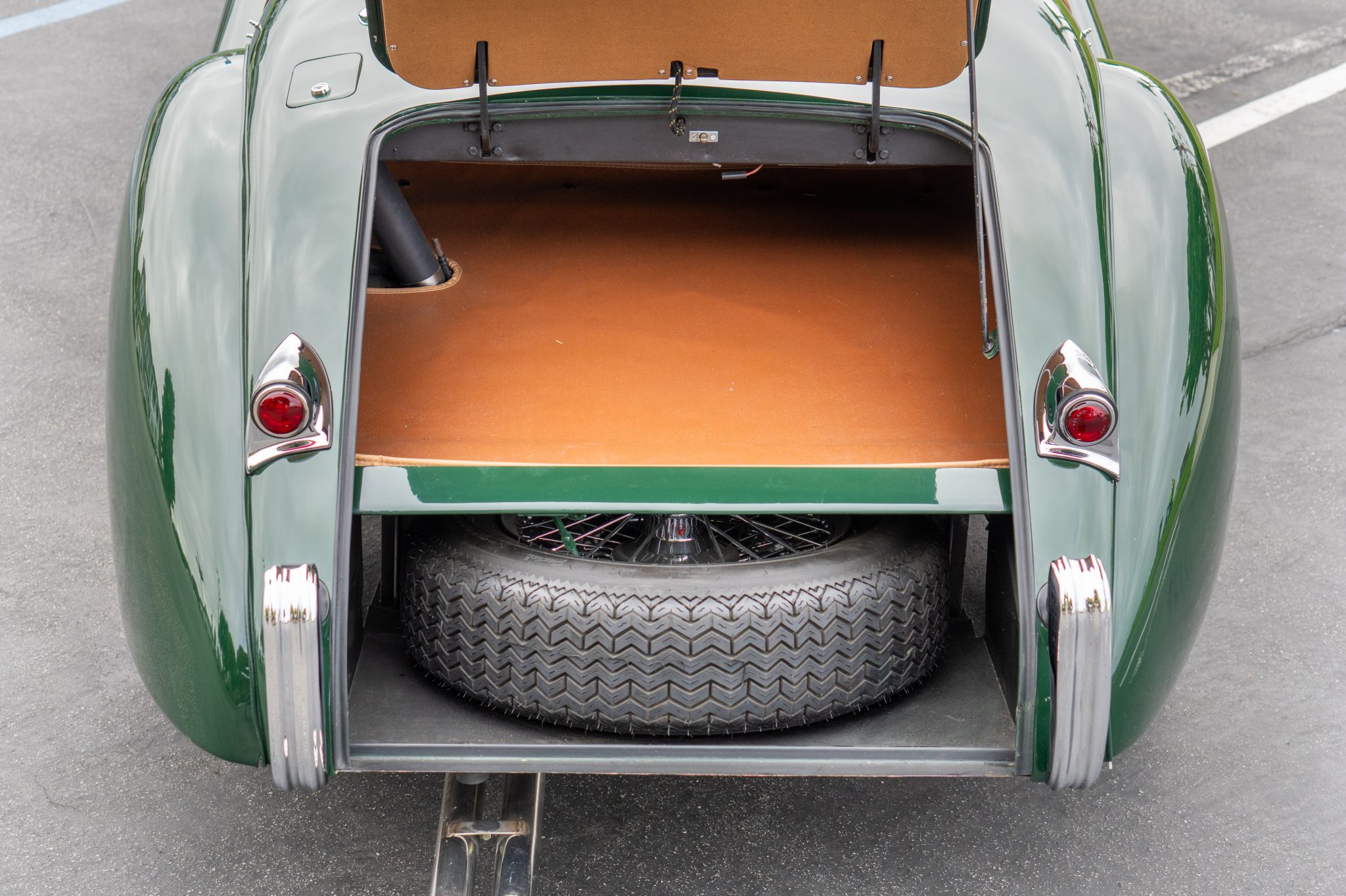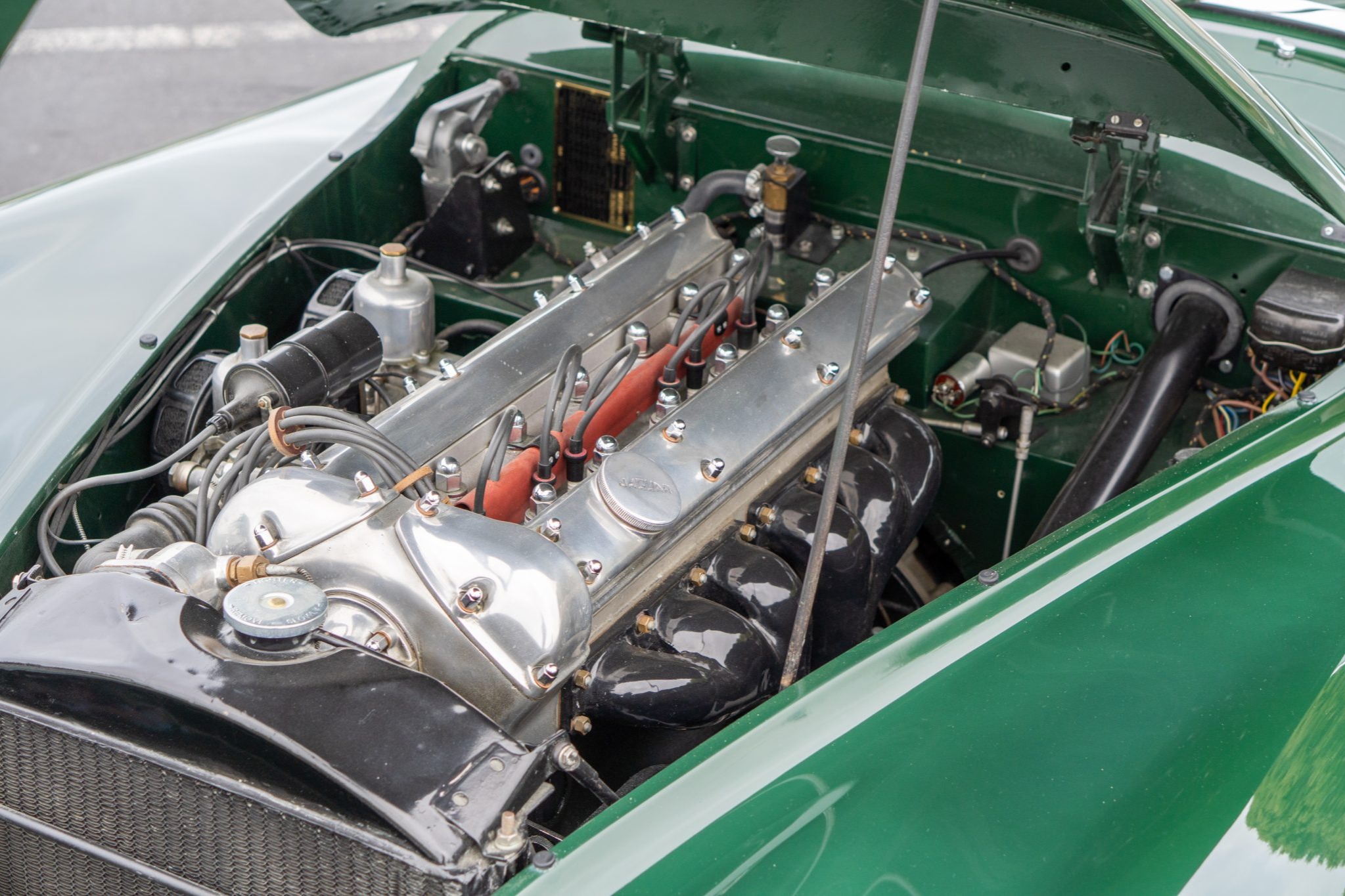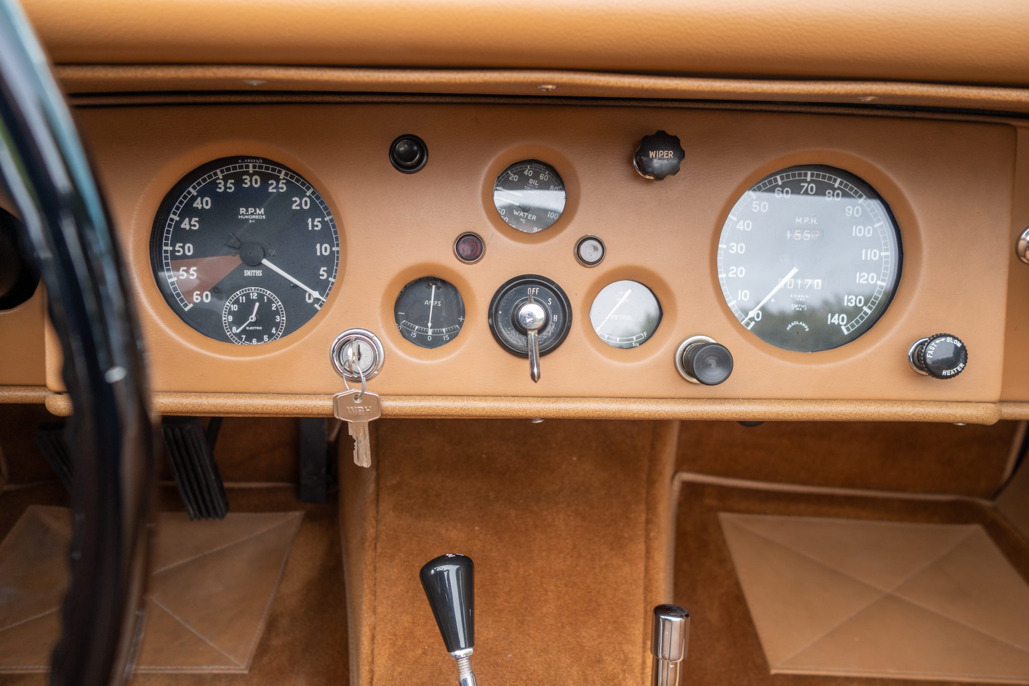 A refurbishment was commenced by powdercoating the frame and having the engine and transmission rebuilt. Powered by a 3.4-liter inline-six linked with a four-speed manual transmission, the car features dual SU carburetors, a C-type cylinder head, a beige convertible top, side curtains, chrome 16” wire wheels, and Smiths gauges.