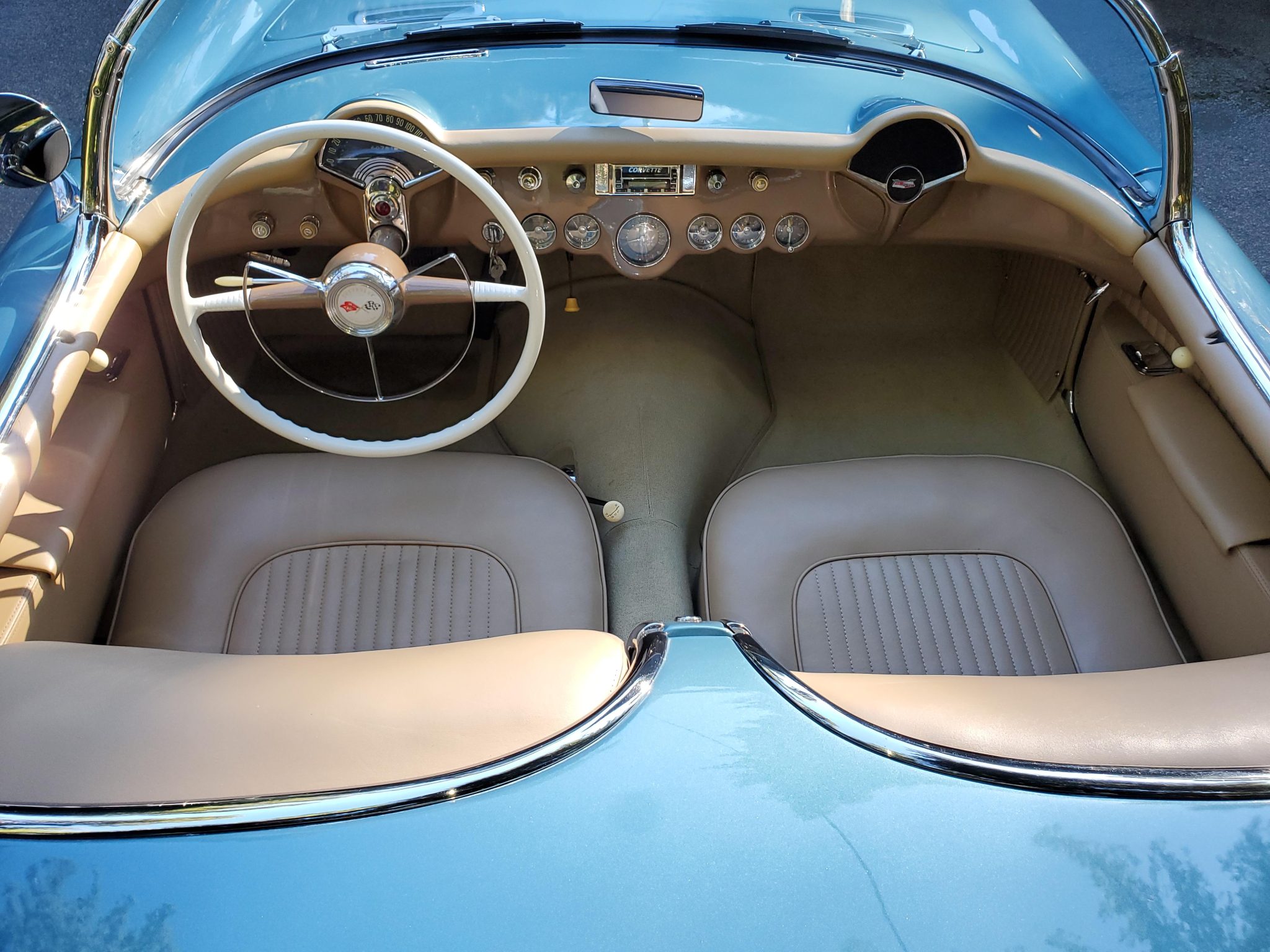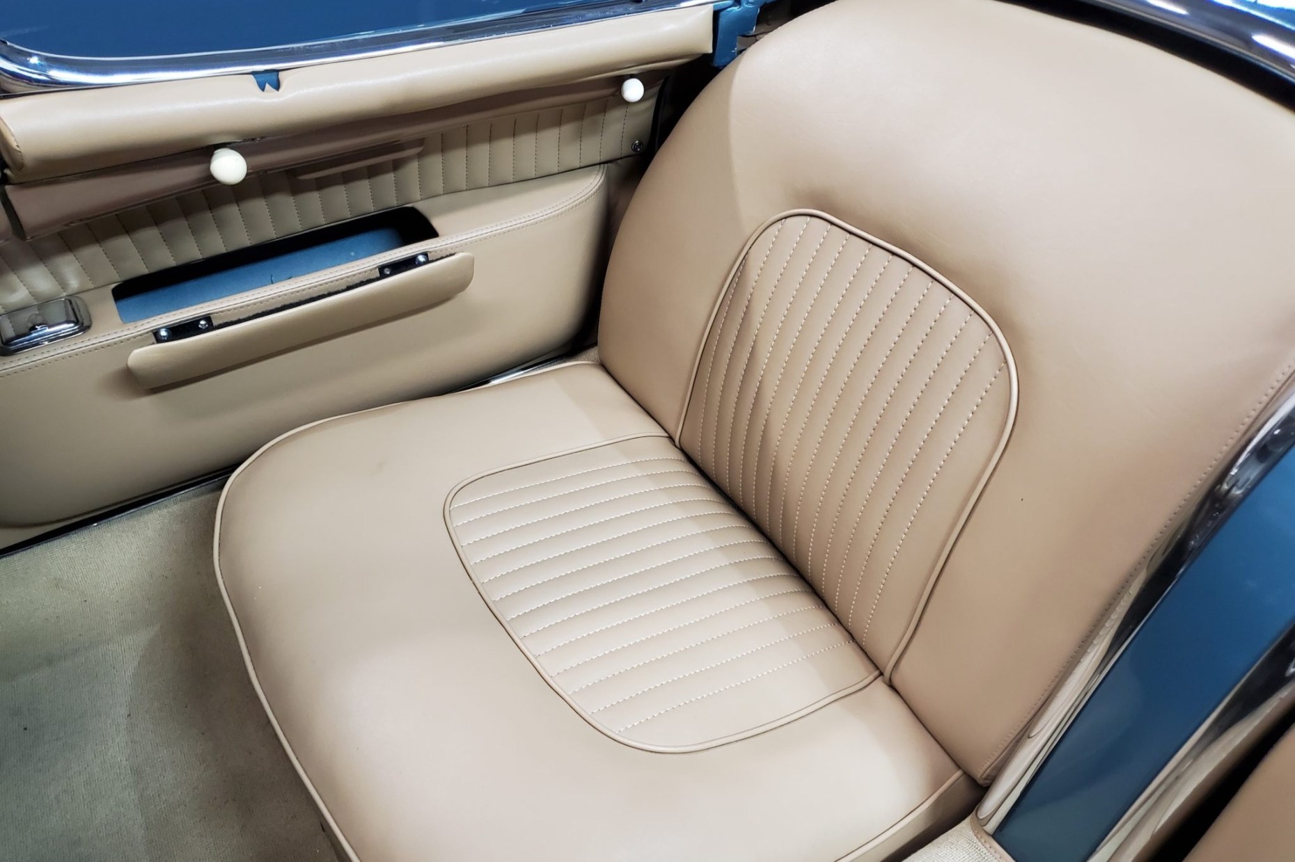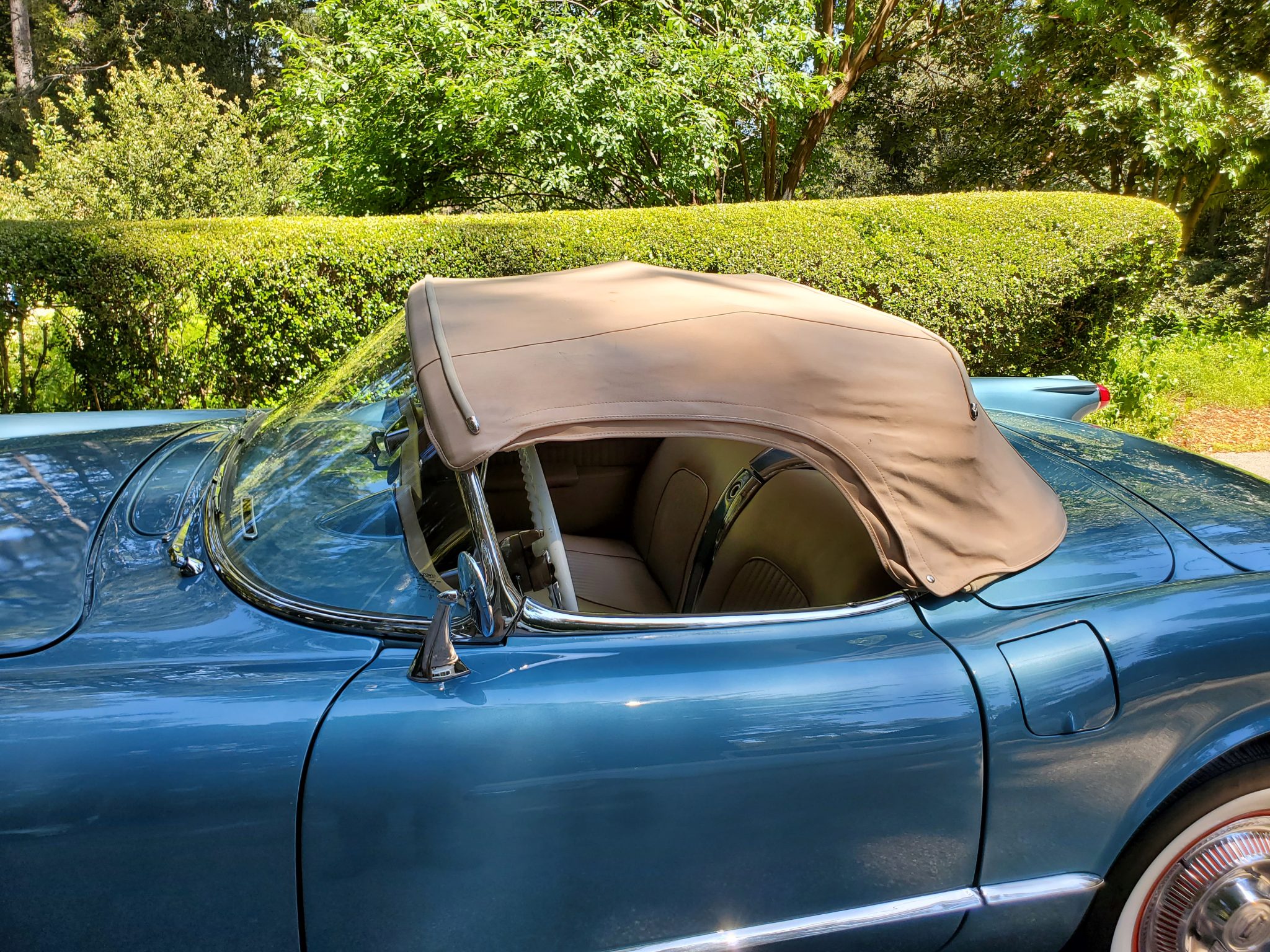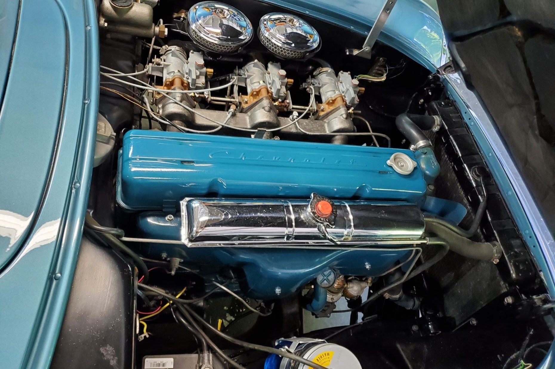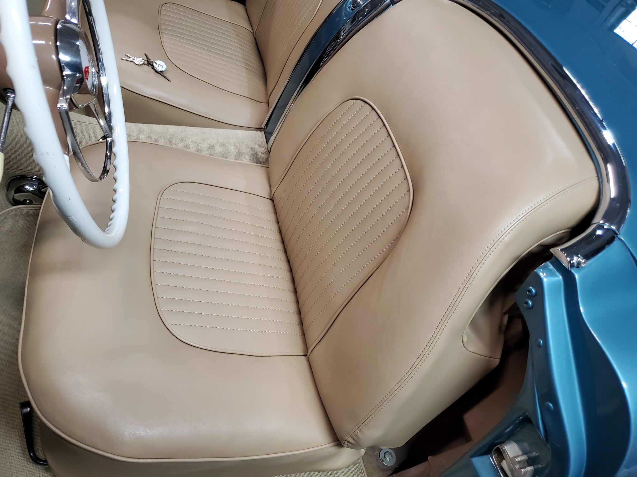 It is powered by a 235ci “Blue Flame” inline-six paired with a two-speed Powerglide automatic transmission, and it was refinished in Pennant Blue over tan vinyl during a refurbishment completed in 2006, according to the seller. The car was purchased in 2025 by the seller, who reports that subsequent service has included rebuilding the carburetors, powder-coating the wheels, rebuilding the generator and fuel pump, and replacing the fuel pump, spark plugs, voltage regulator, fan belt, and valve cover gasket. Features include 15” red-finished steel wheels with faux knock-off spinners as well as a beige soft top, a curved windshield, wire mesh headlight guards, triple Carter carburetors, and dual exhaust outlets that exit through the rear valance.