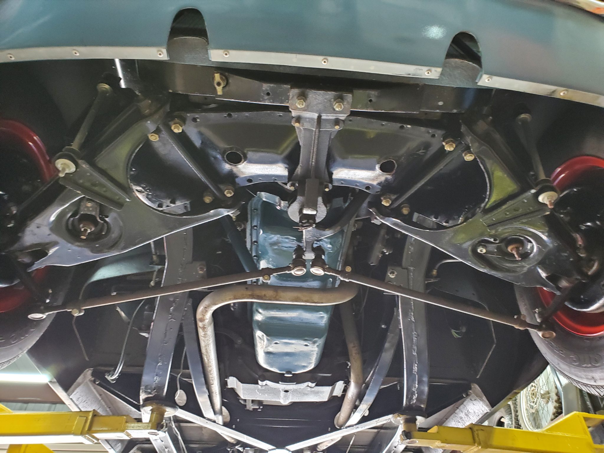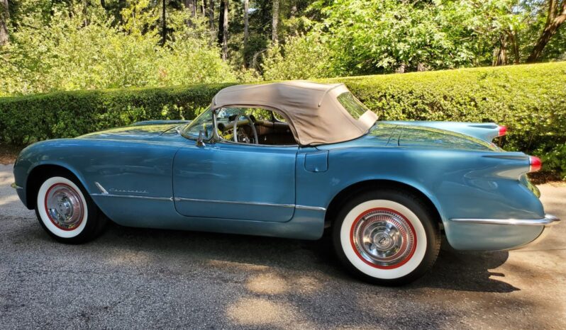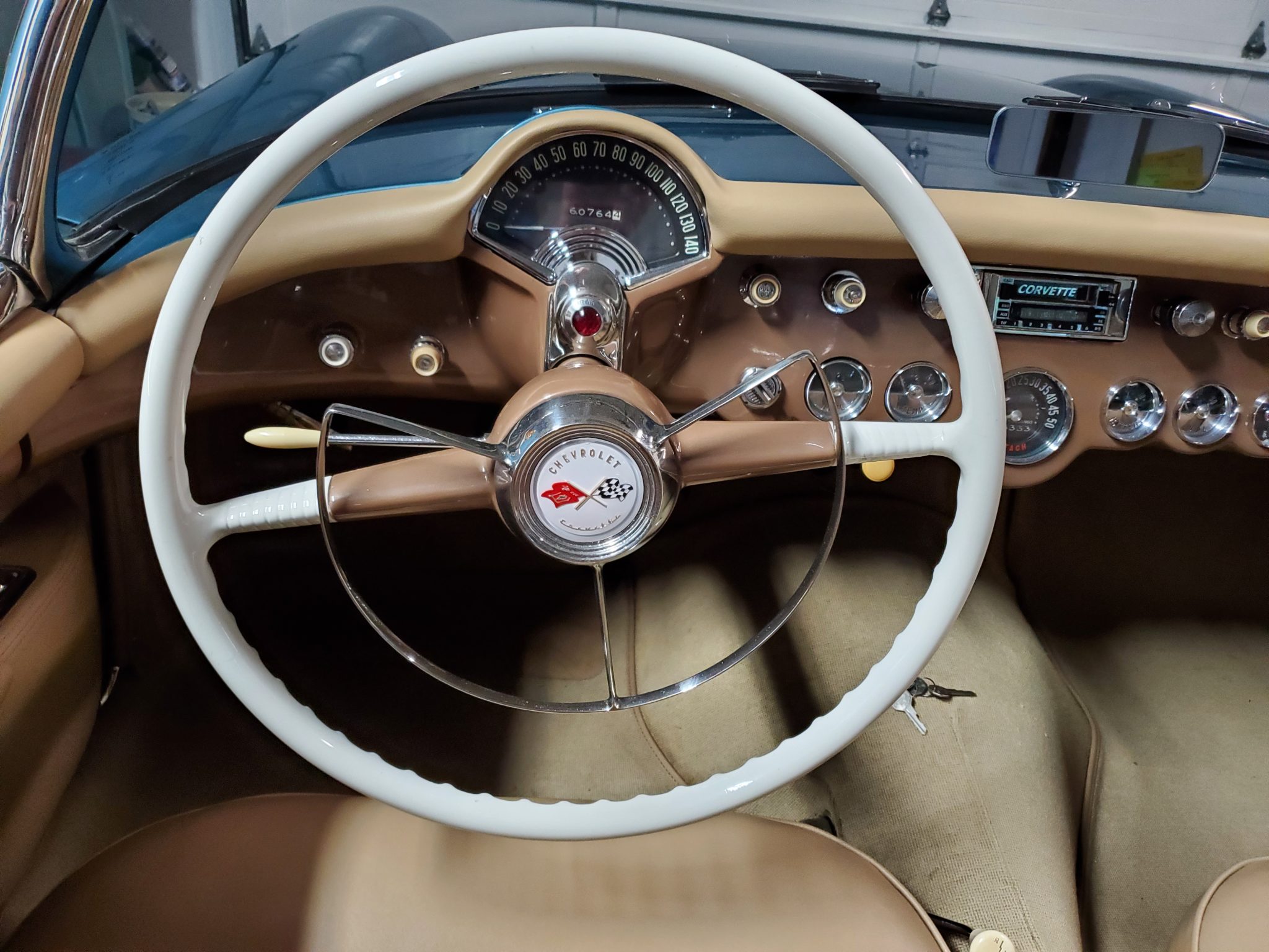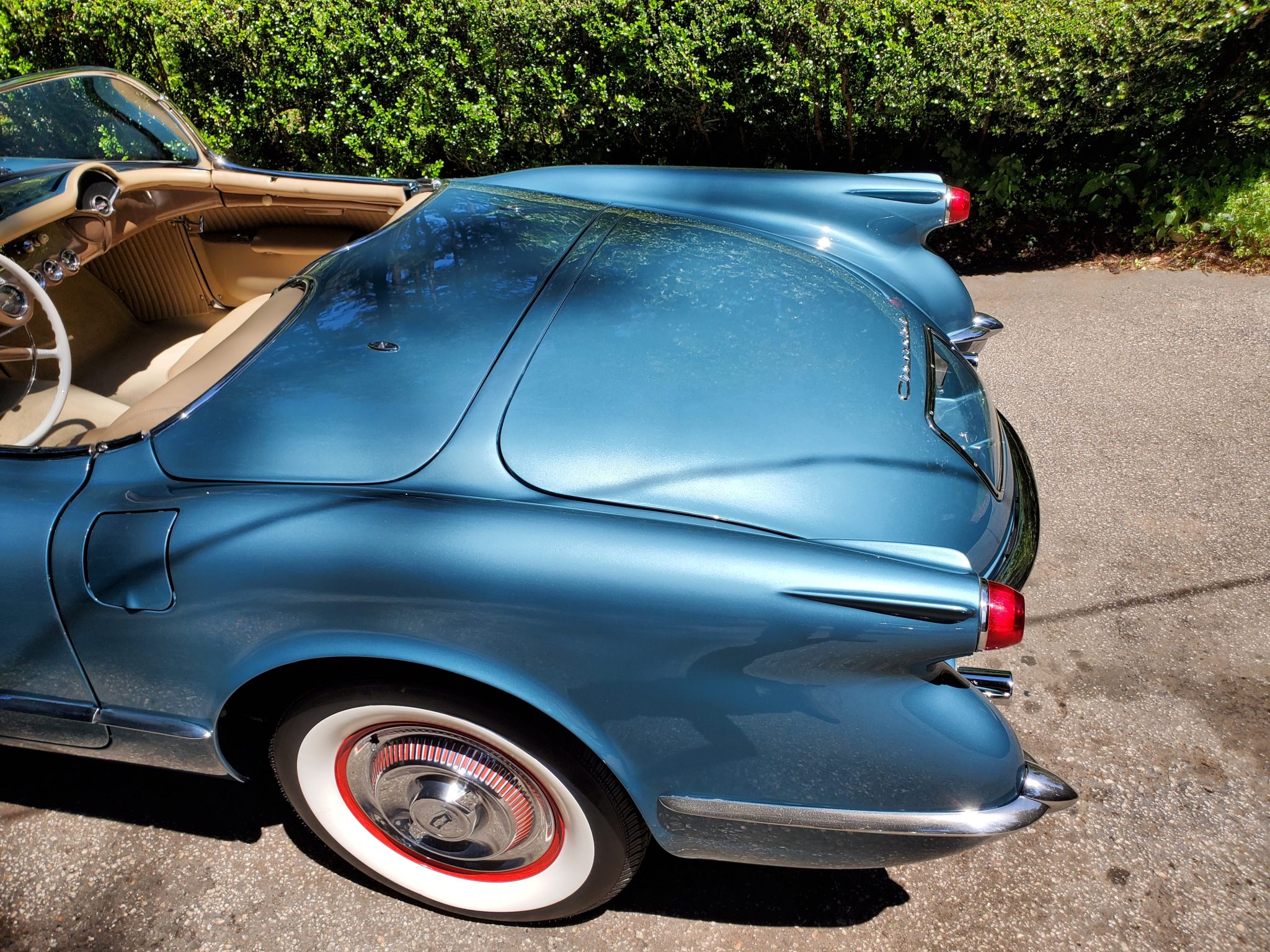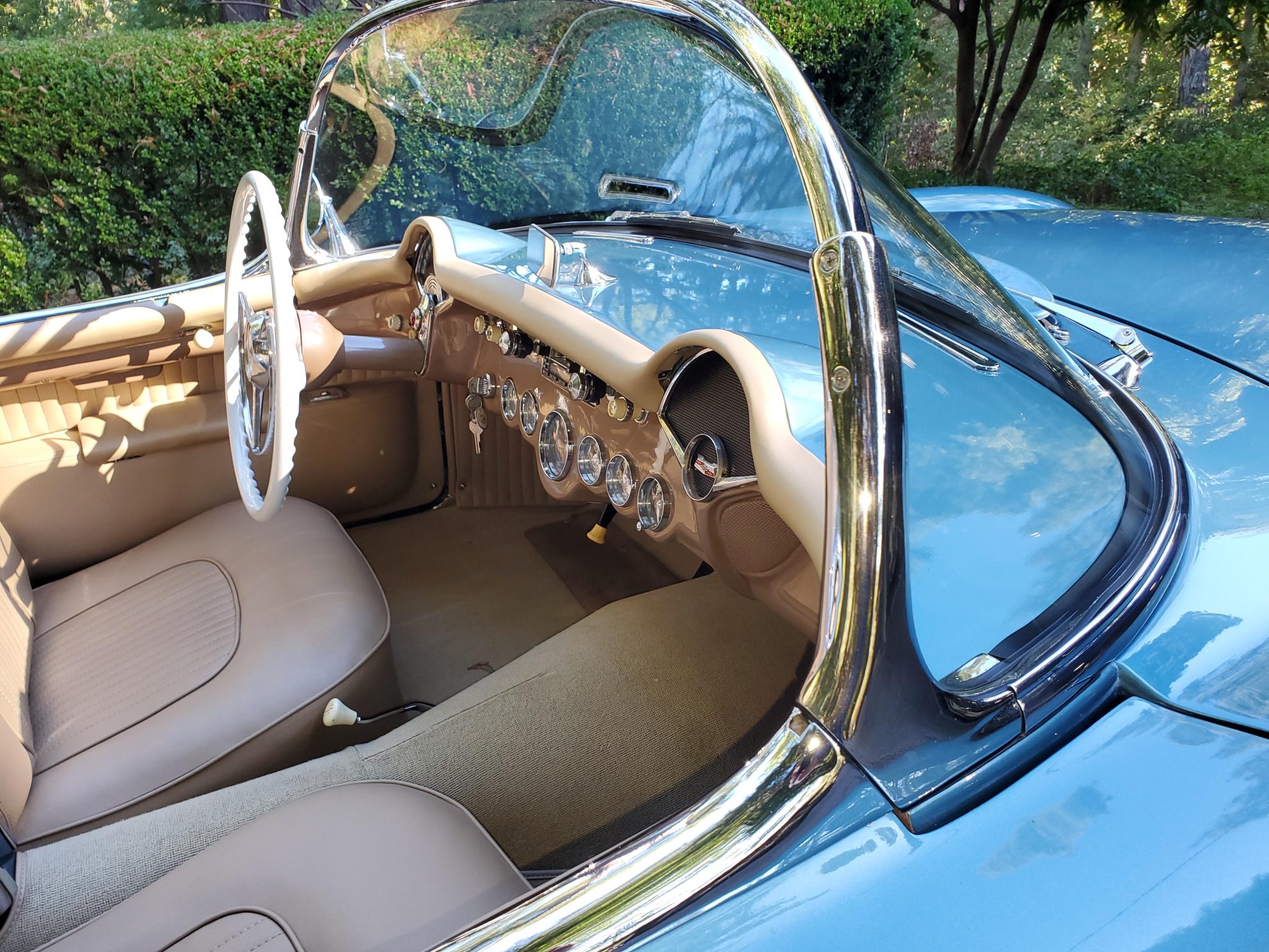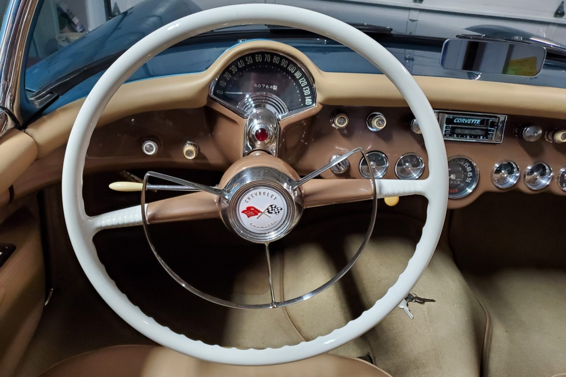 It is powered by a 235ci “Blue Flame” inline-six paired with a two-speed Powerglide automatic transmission, and it was refinished in Pennant Blue over tan vinyl during a refurbishment completed in 2006, according to the seller. The car was purchased in 2025 by the seller, who reports that subsequent service has included rebuilding the carburetors, powder-coating the wheels, rebuilding the generator and fuel pump, and replacing the fuel pump, spark plugs, voltage regulator, fan belt, and valve cover gasket. Features include 15” red-finished steel wheels with faux knock-off spinners as well as a beige soft top, a curved windshield, wire mesh headlight guards, triple Carter carburetors, and dual exhaust outlets that exit through the rear valance.