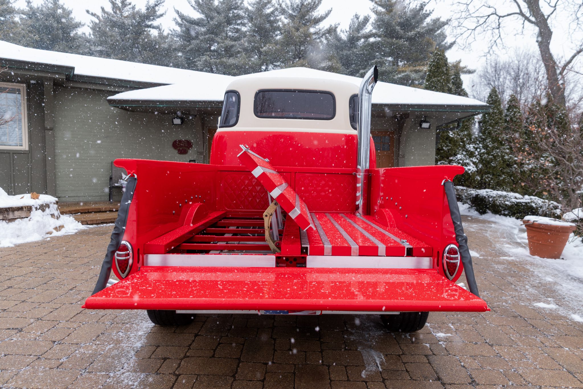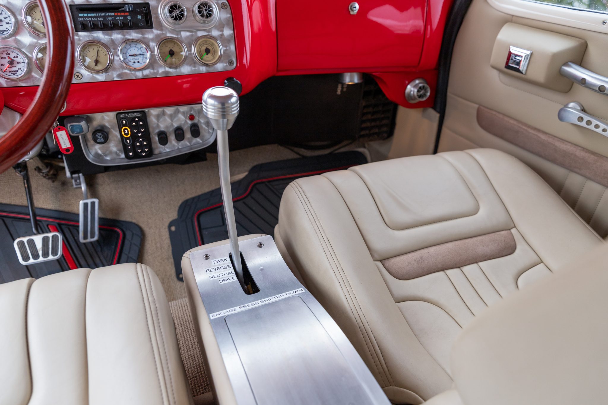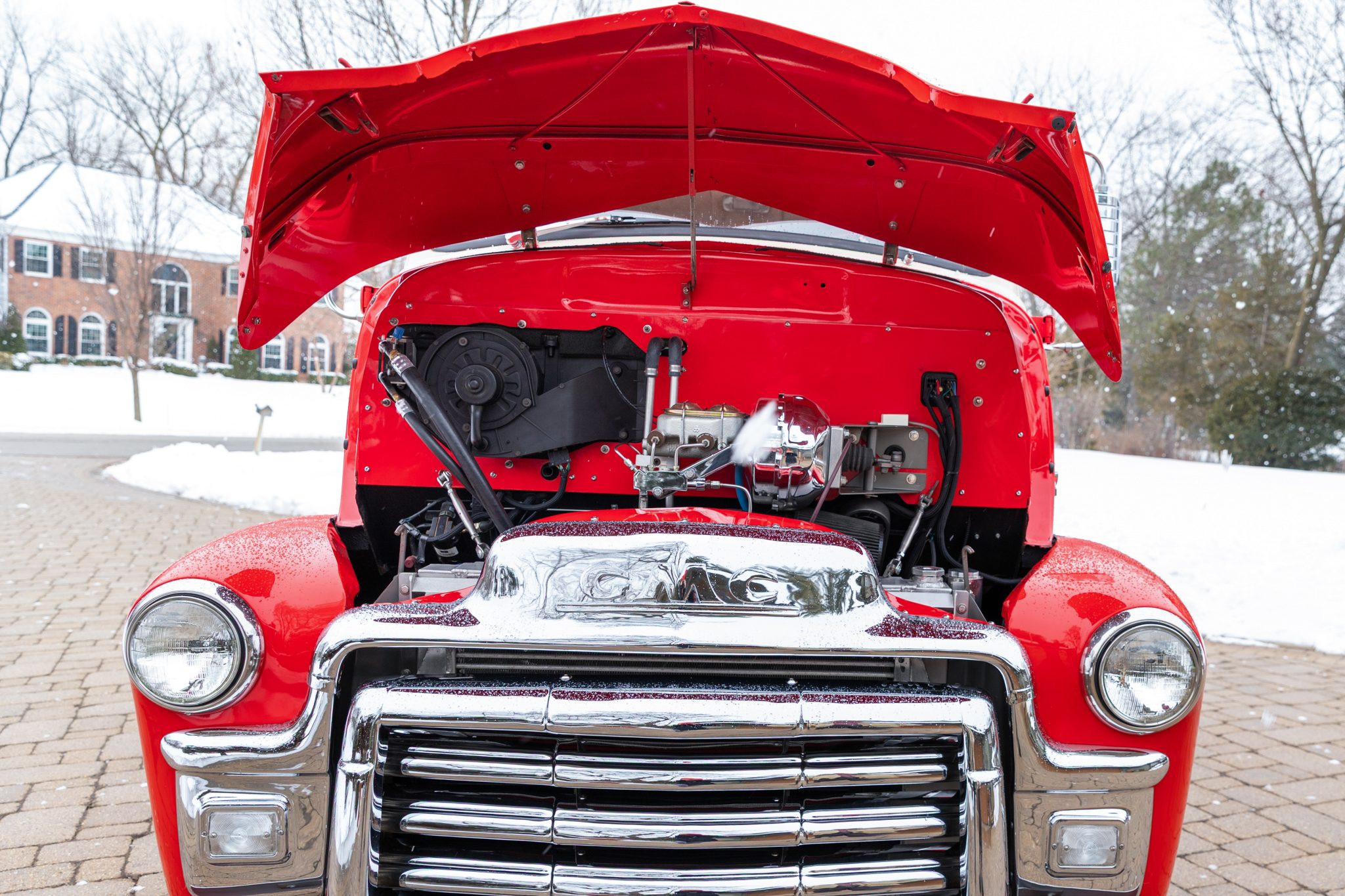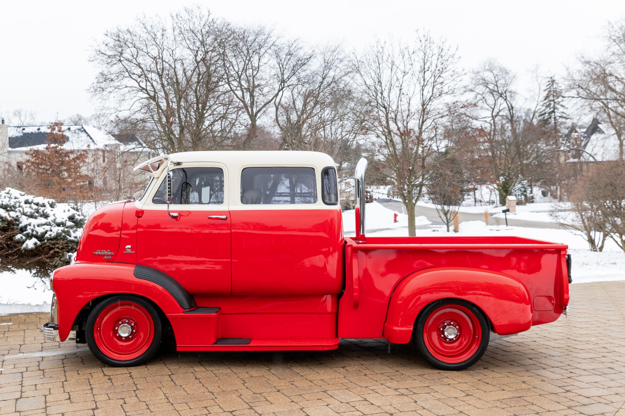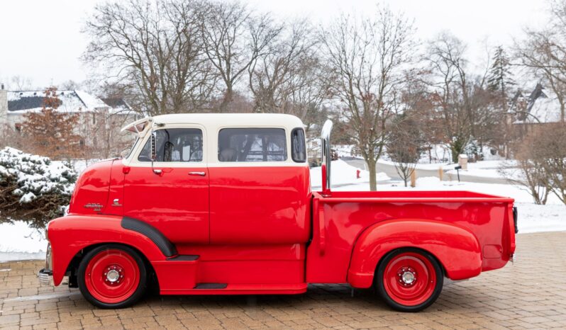 This 1954 GMC 350-Series cab-over truck underwent conversion from a tow vehicle to an extended-cab pickup under previous ownership. The body was mounted on a contemporary GM truck chassis, and additional modifications included the installation of a 5.9-liter Cummins turbodiesel inline-six, a three-speed automatic transmission, power four-wheel disc brakes, adjustable air suspension, electric lift bed panels, a beige leather interior, air conditioning, and power windows.