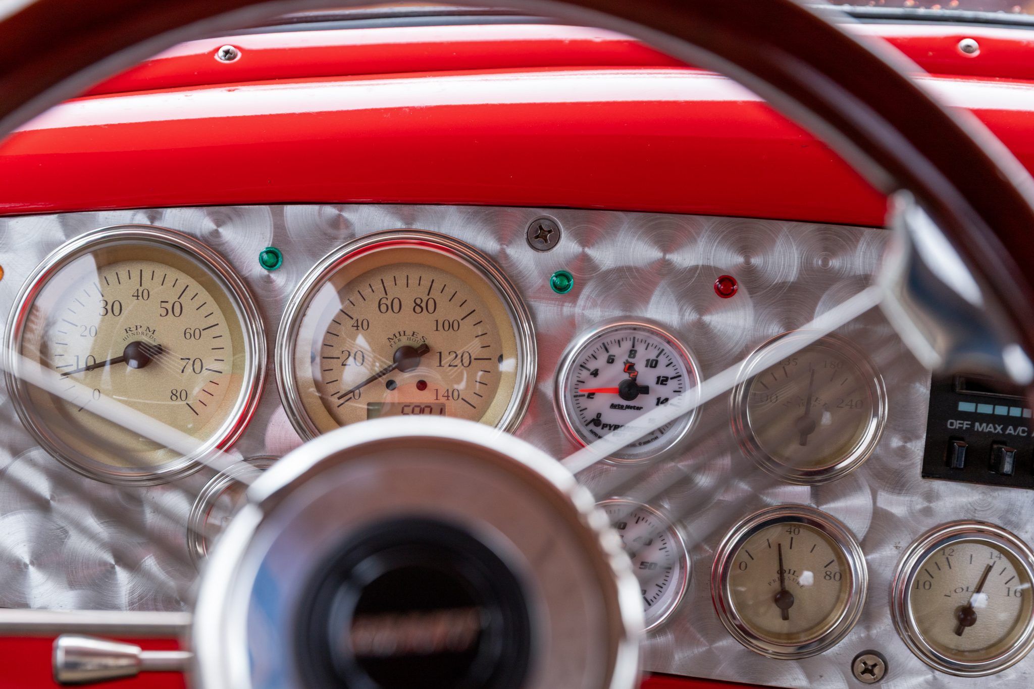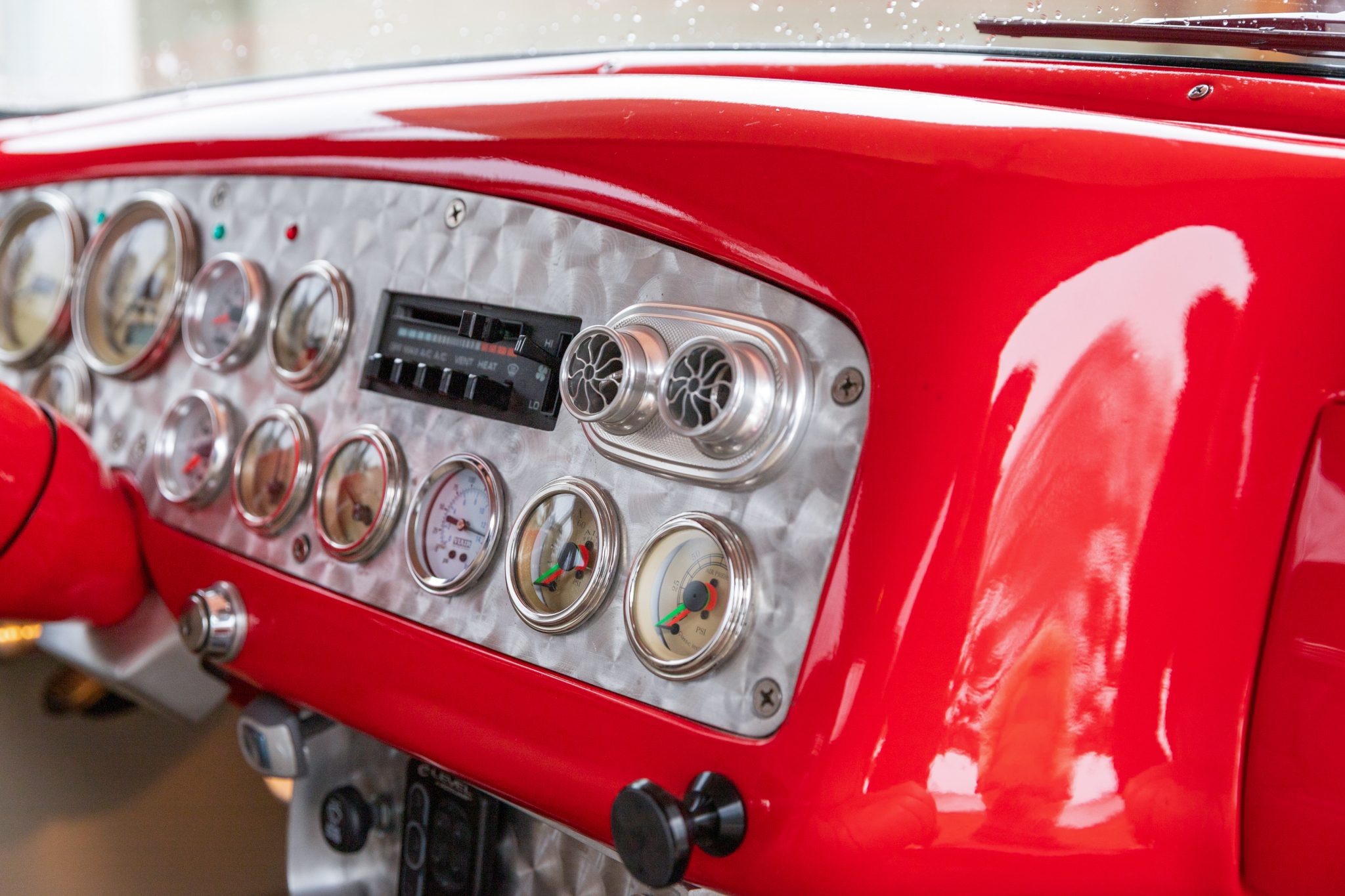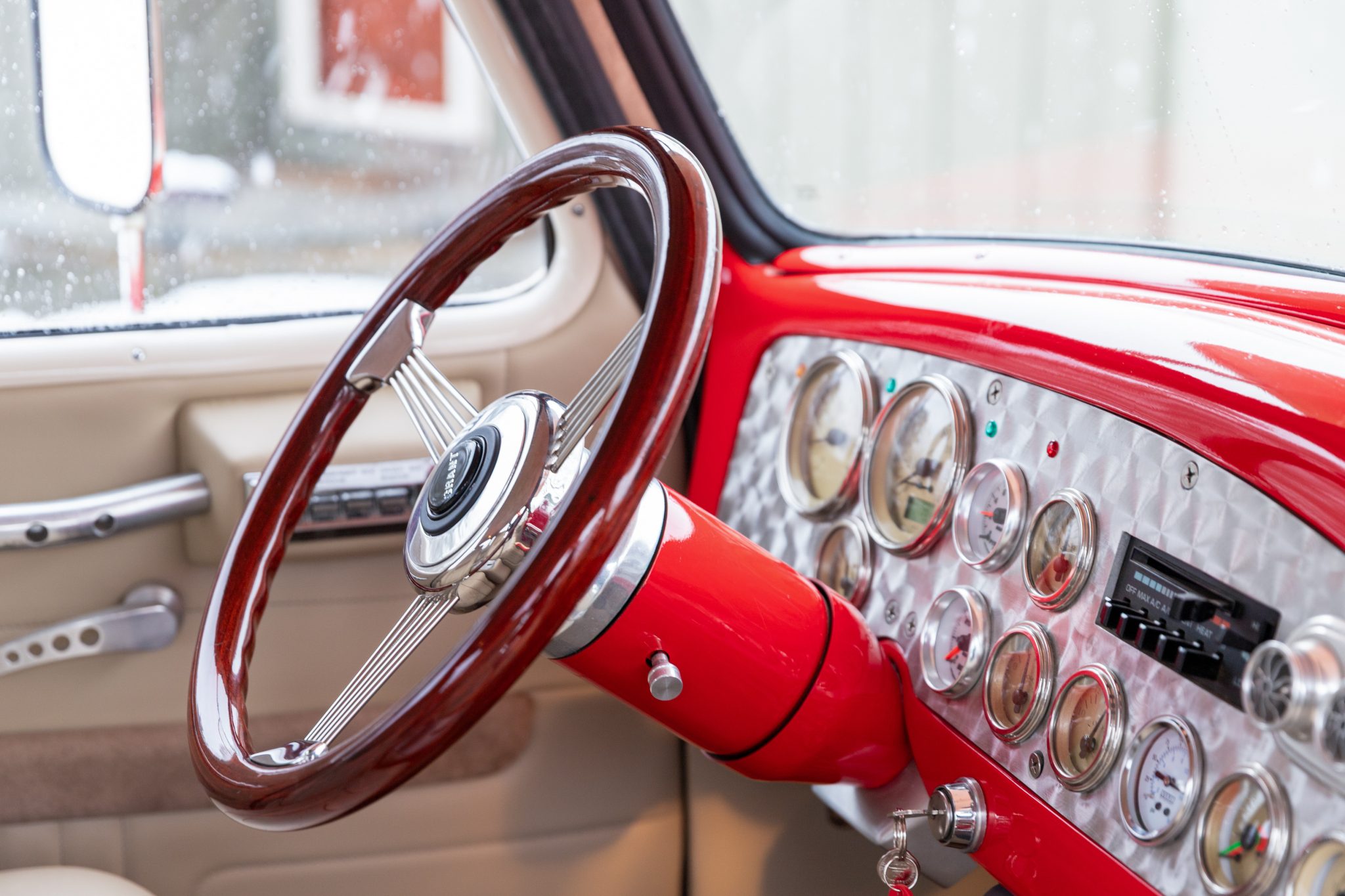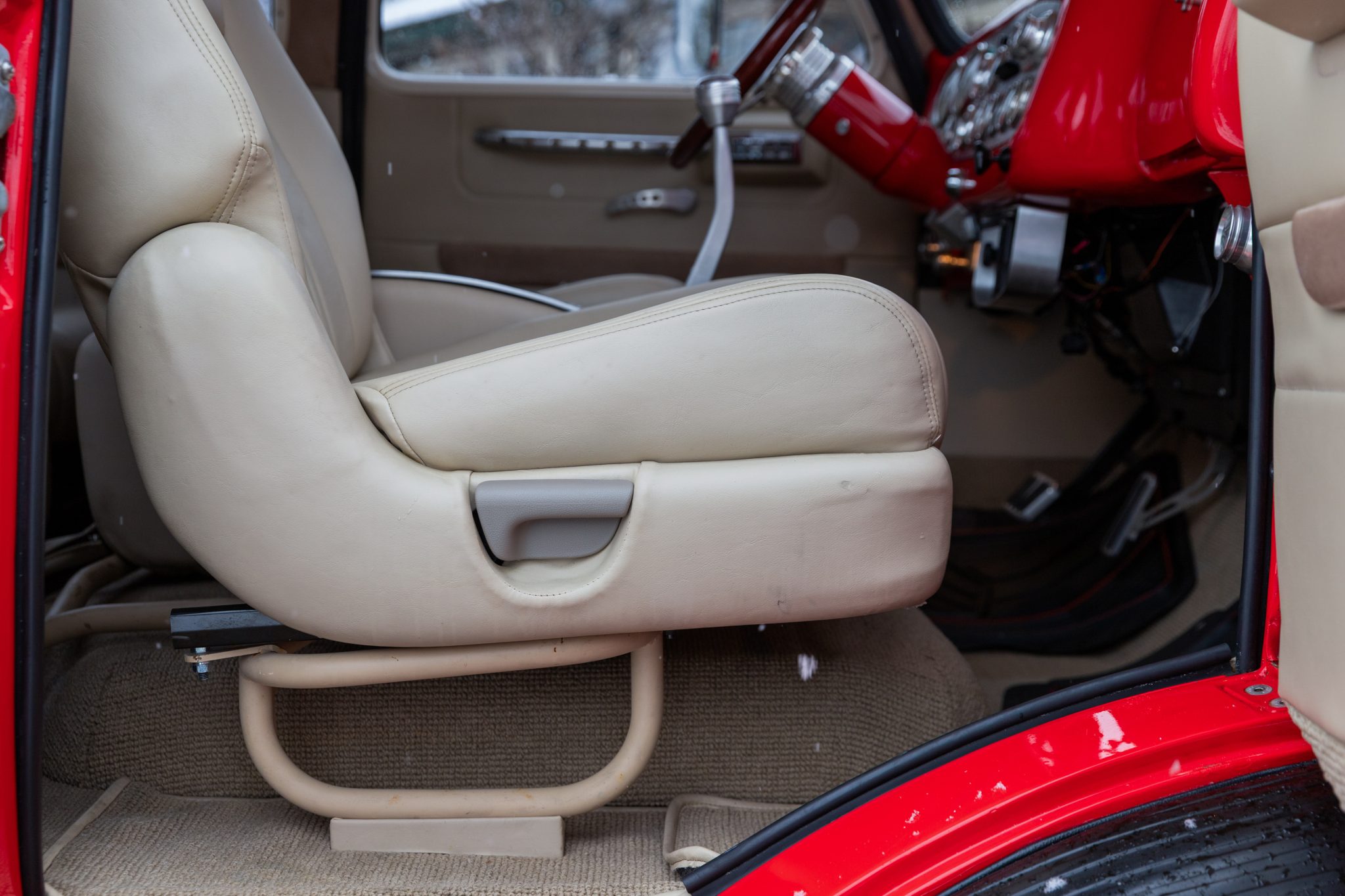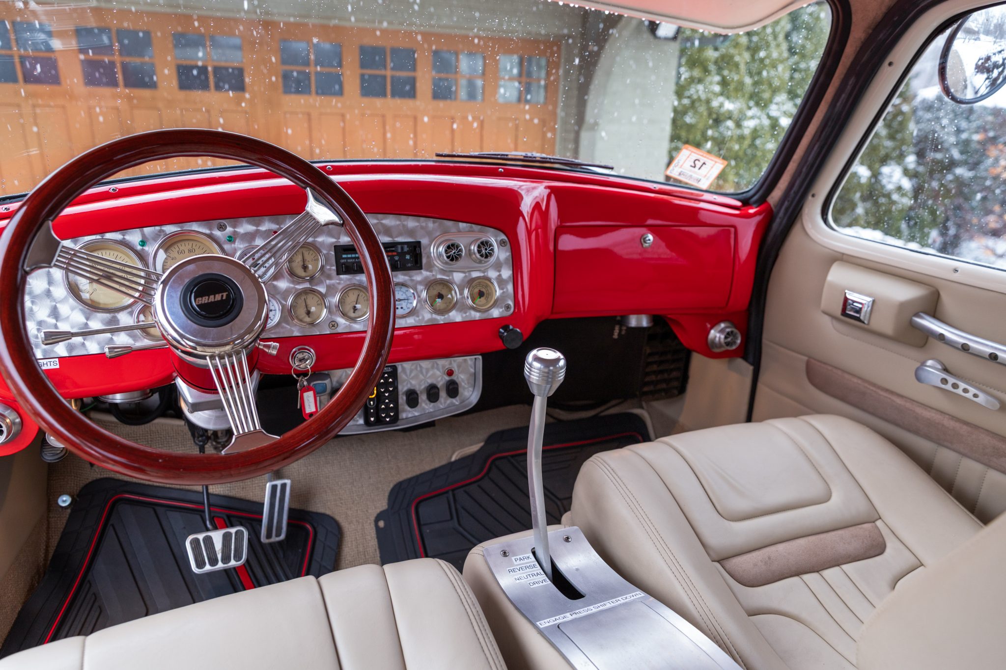 This 1954 GMC 350-Series cab-over truck underwent conversion from a tow vehicle to an extended-cab pickup under previous ownership. The body was mounted on a contemporary GM truck chassis, and additional modifications included the installation of a 5.9-liter Cummins turbodiesel inline-six, a three-speed automatic transmission, power four-wheel disc brakes, adjustable air suspension, electric lift bed panels, a beige leather interior, air conditioning, and power windows.