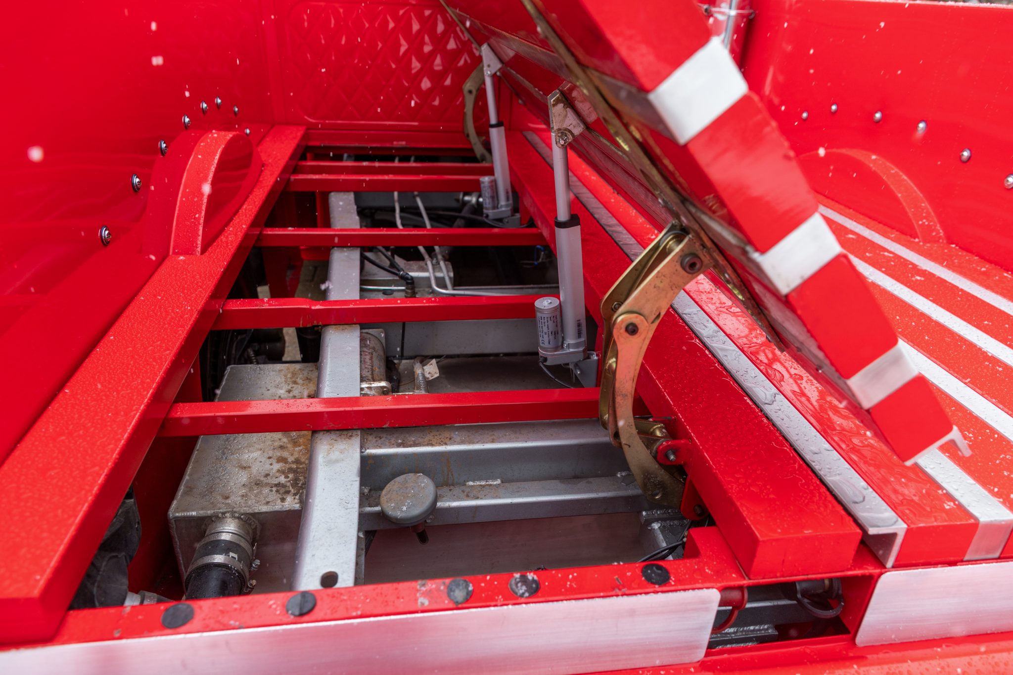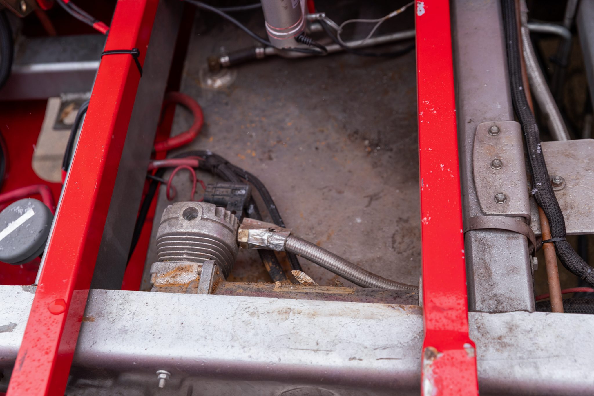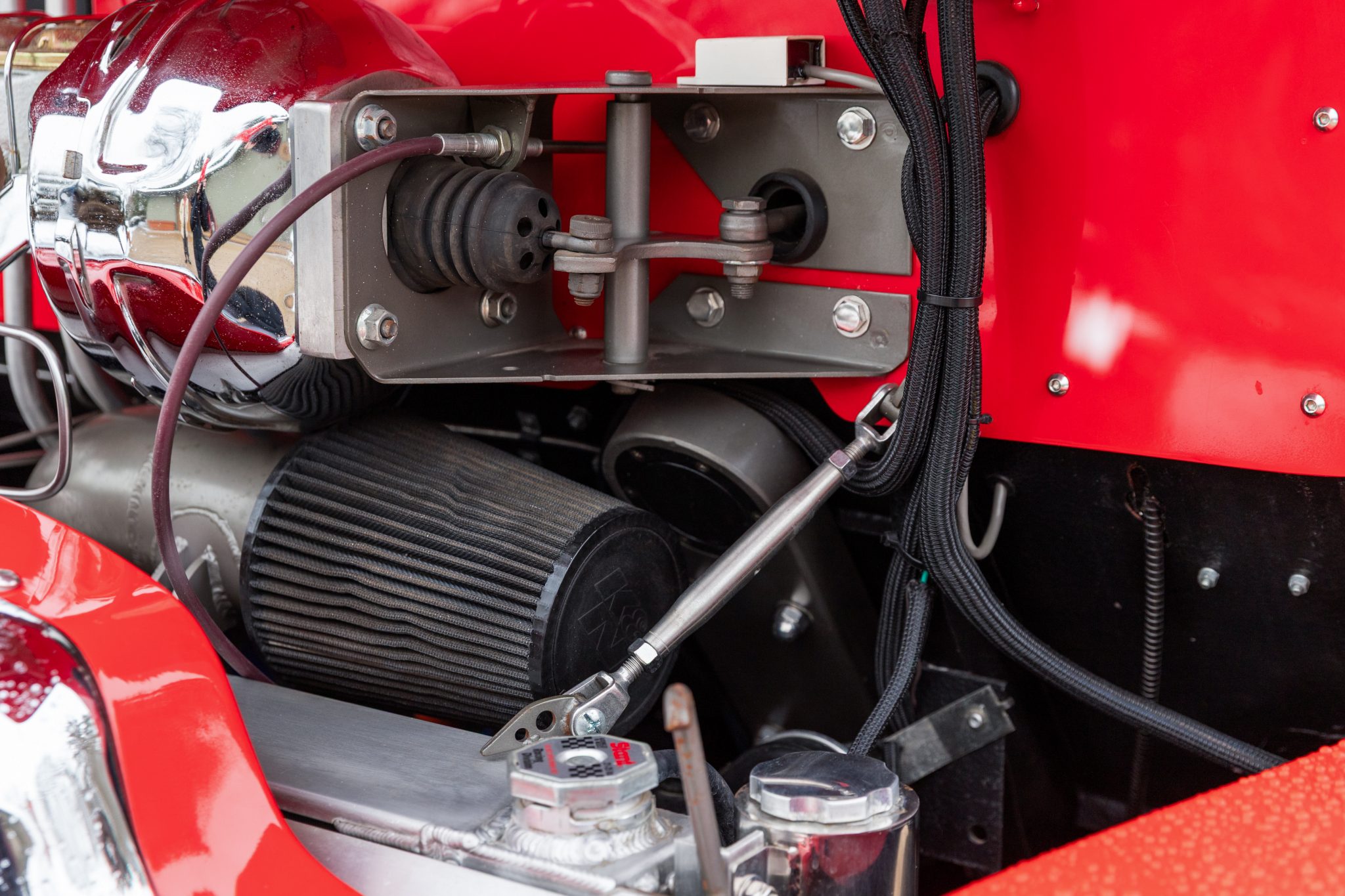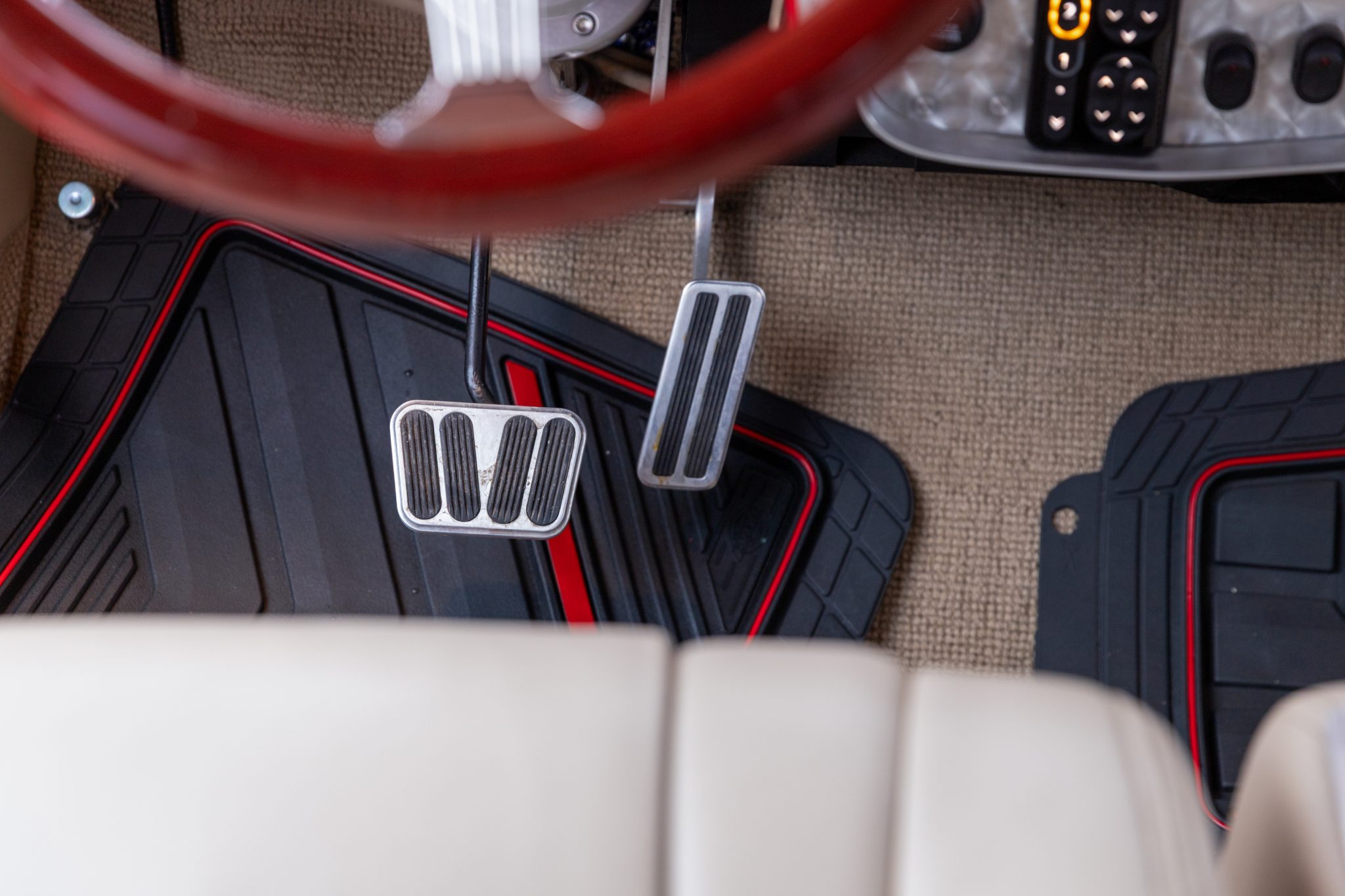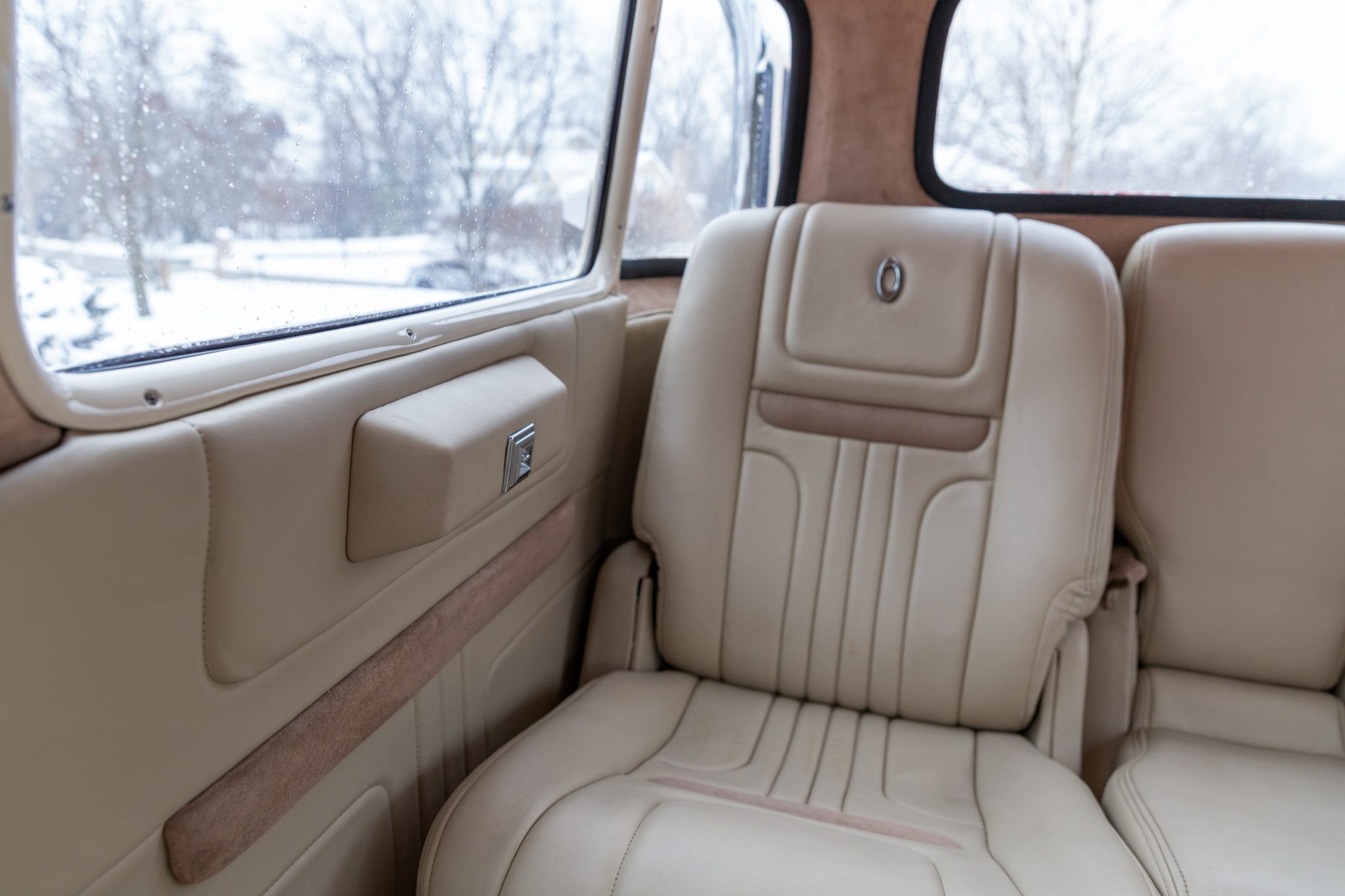 This 1954 GMC 350-Series cab-over truck underwent conversion from a tow vehicle to an extended-cab pickup under previous ownership. The body was mounted on a contemporary GM truck chassis, and additional modifications included the installation of a 5.9-liter Cummins turbodiesel inline-six, a three-speed automatic transmission, power four-wheel disc brakes, adjustable air suspension, electric lift bed panels, a beige leather interior, air conditioning, and power windows.