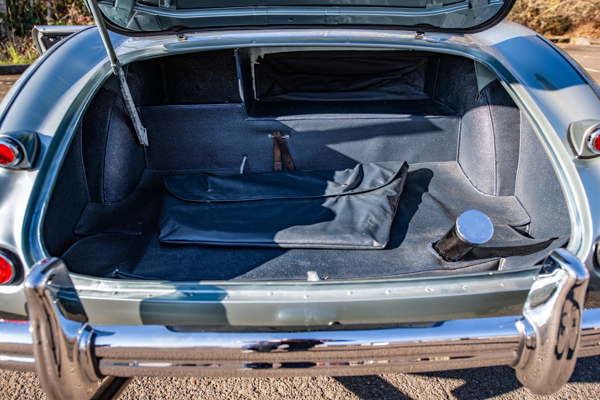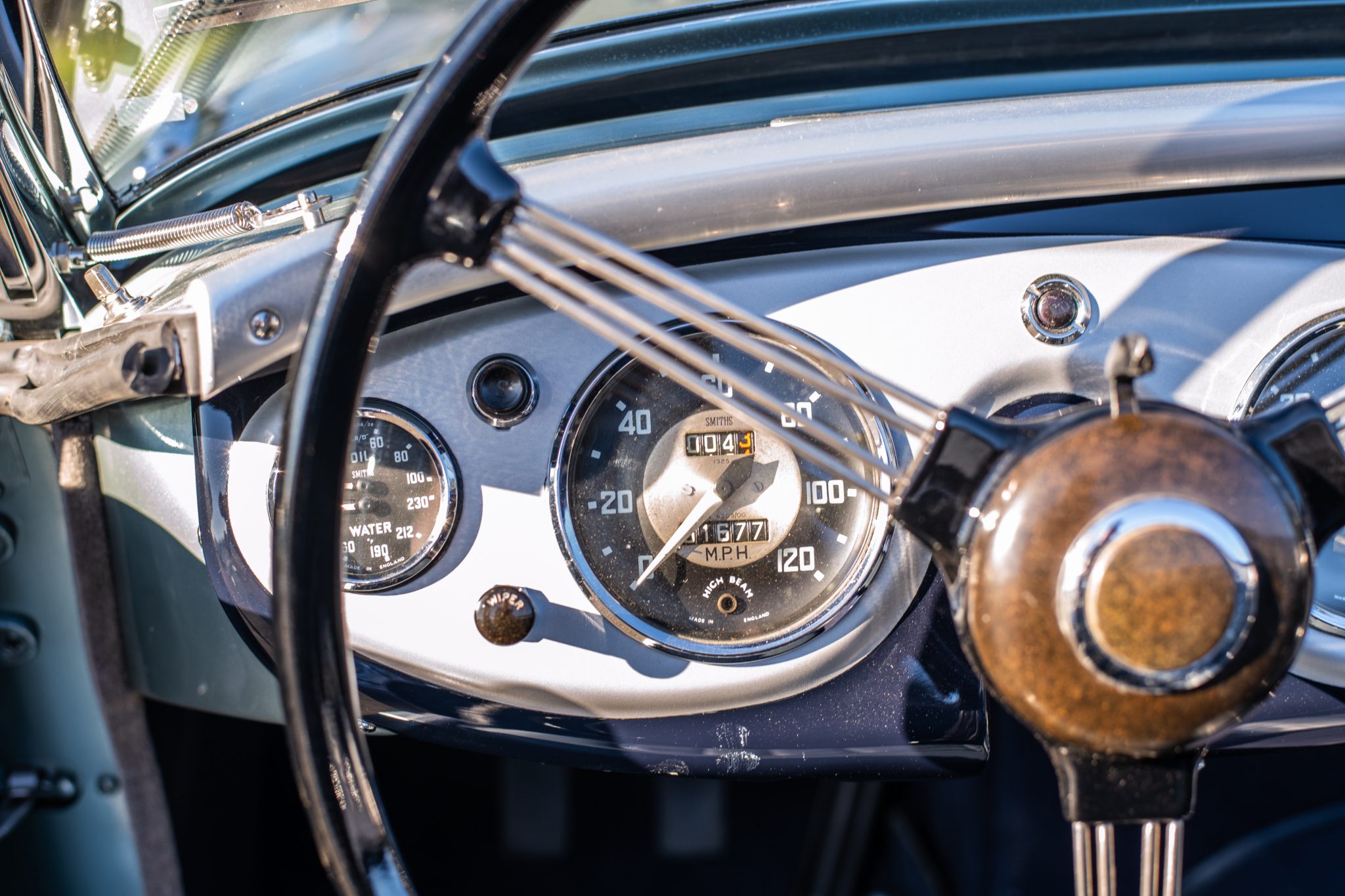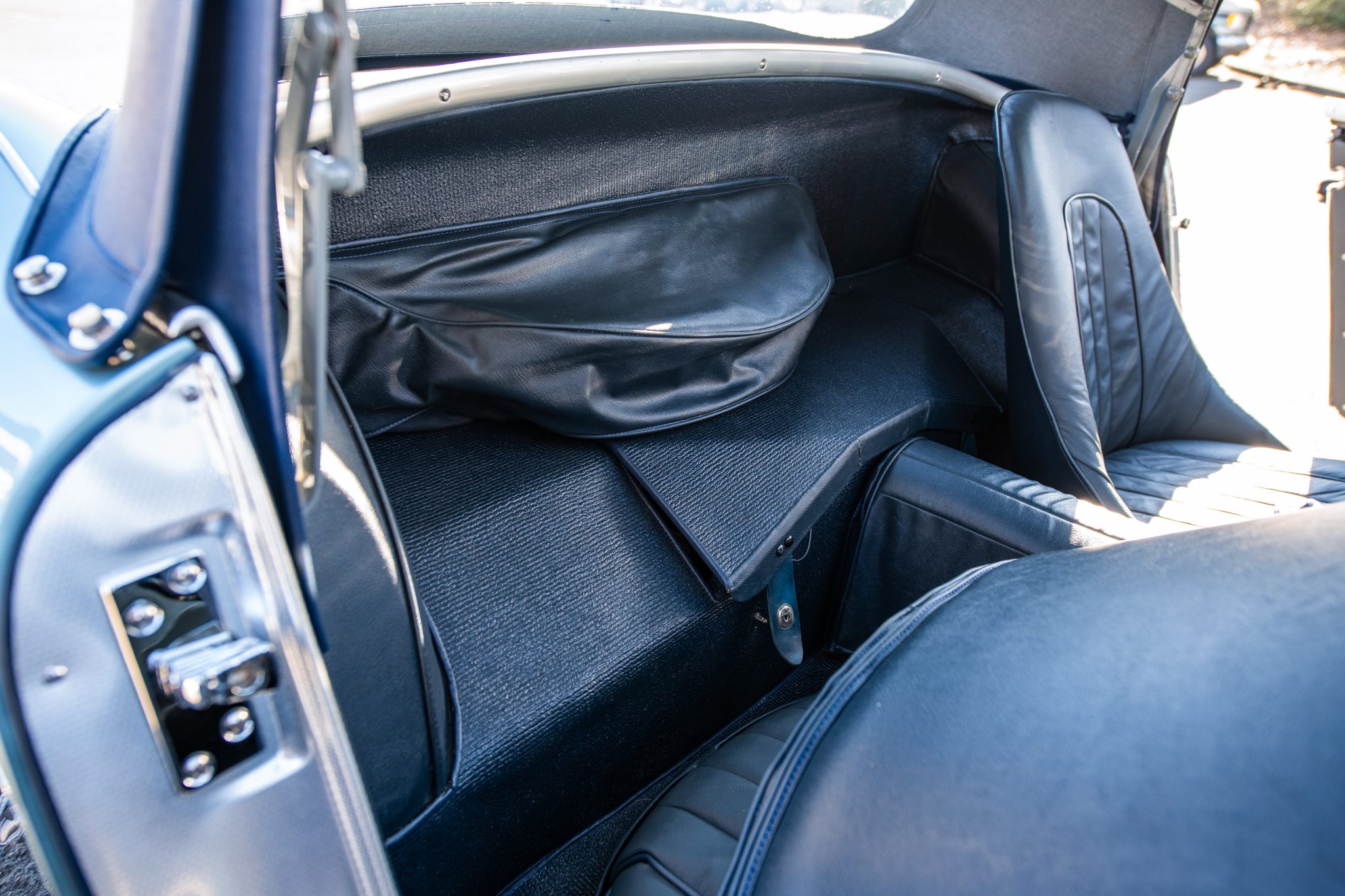 Finished in blue with a blue vinyl soft top, the car rides on 15″ knock-off wire wheels and is powered by a 2.7-liter inline-four equipped with dual SU carburetors. Shifting is through a three-speed manual transmission with overdrive, and additional equipment includes bucket seats, a banjo-style steering wheel, and a Smiths heater.