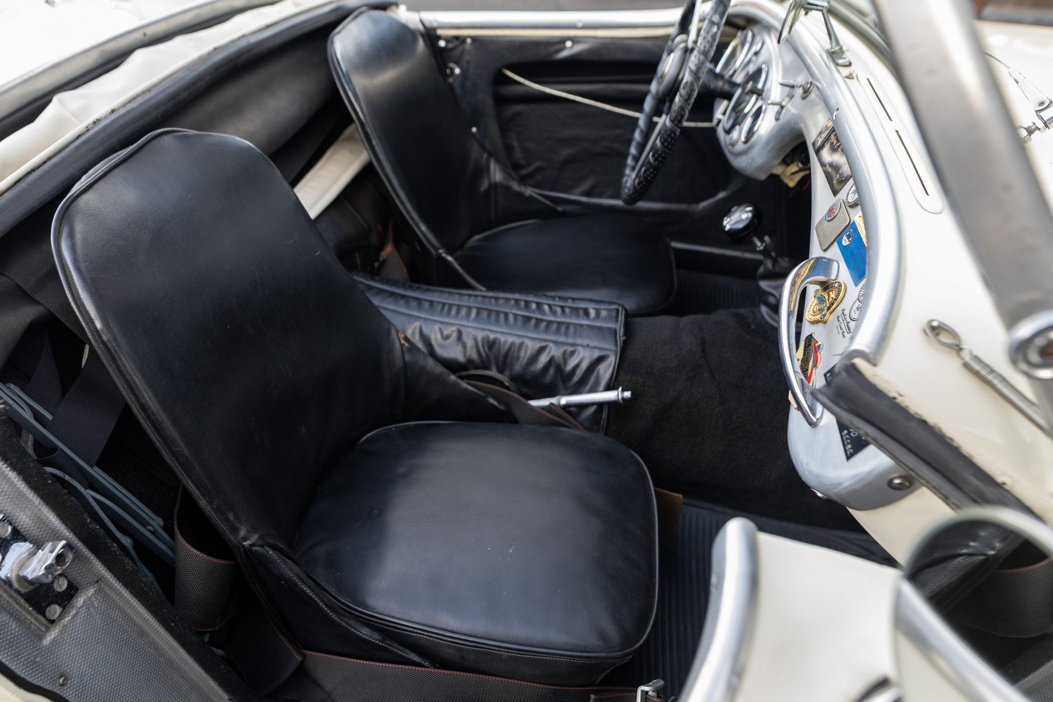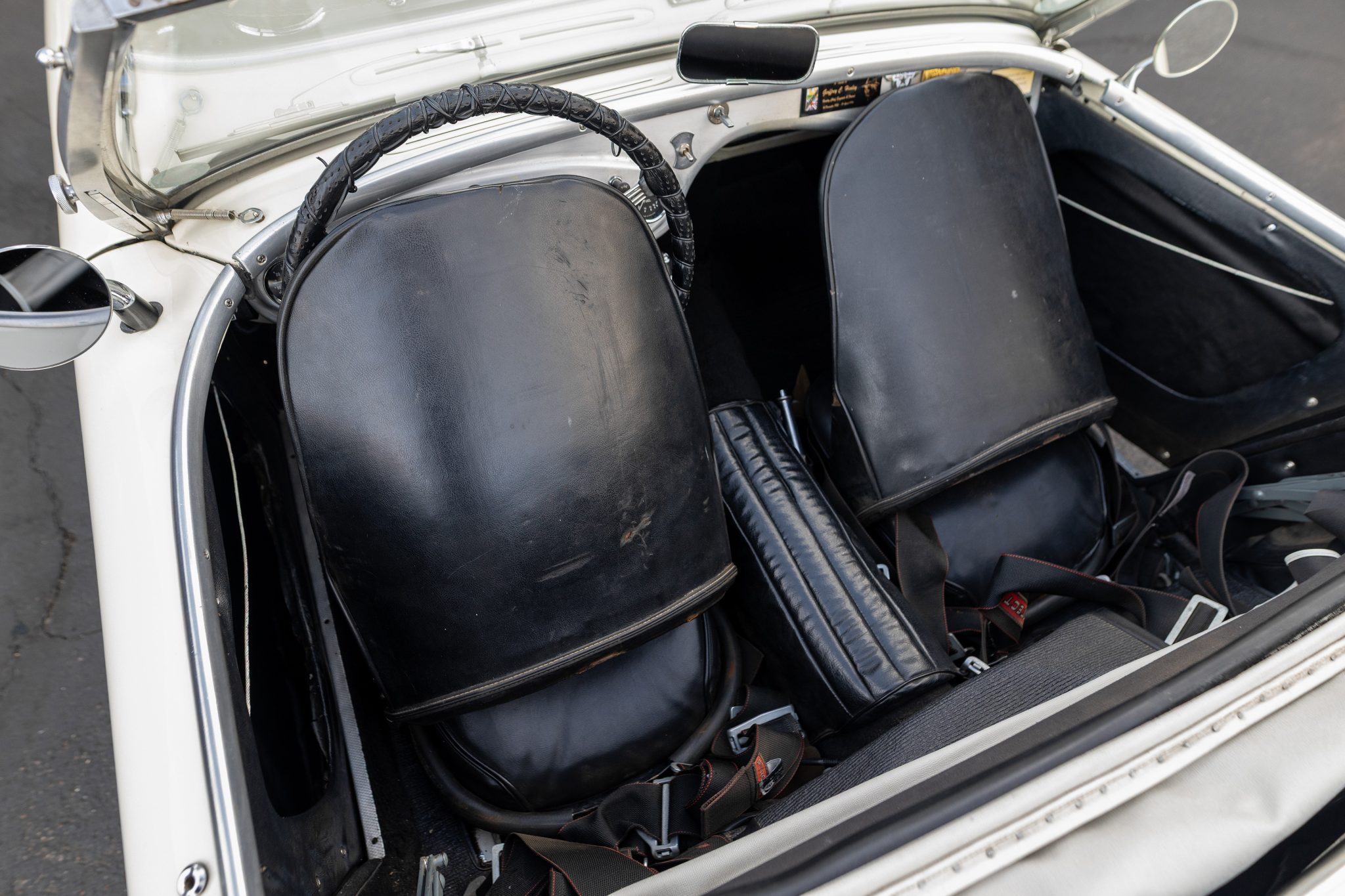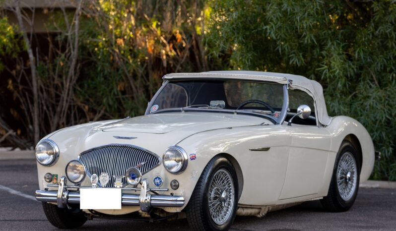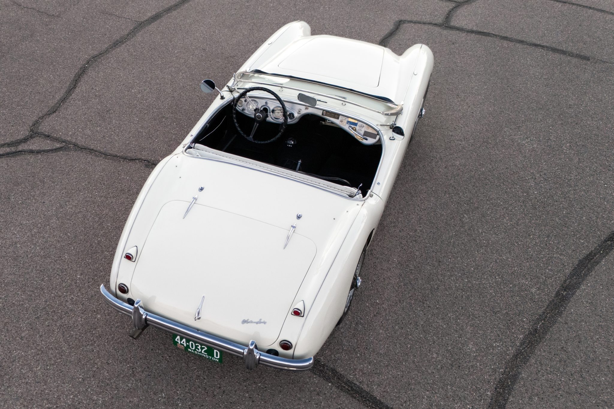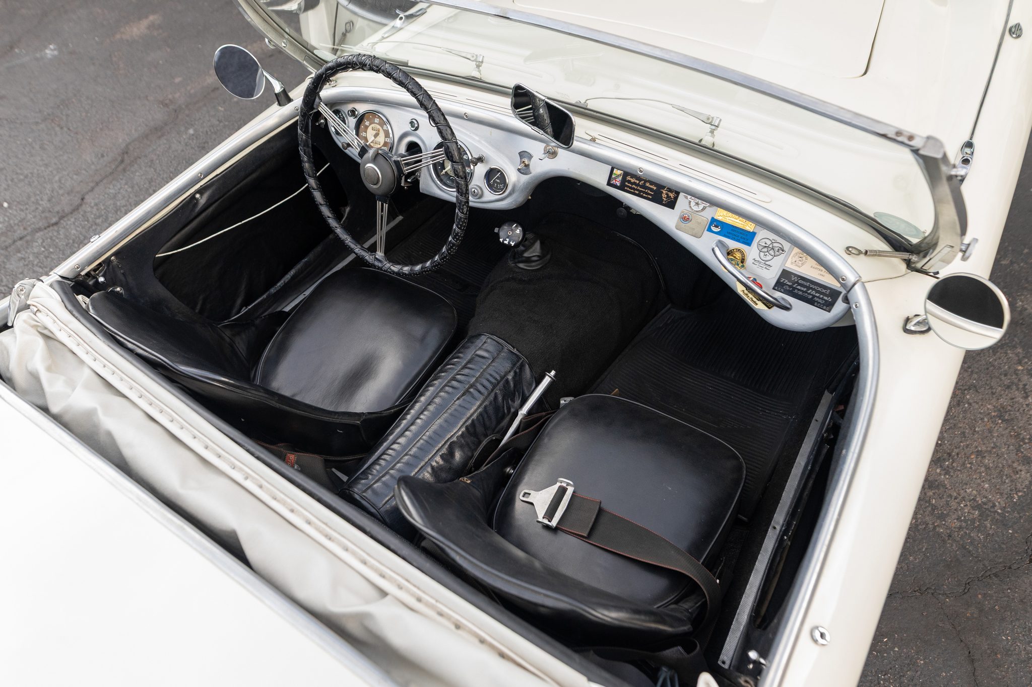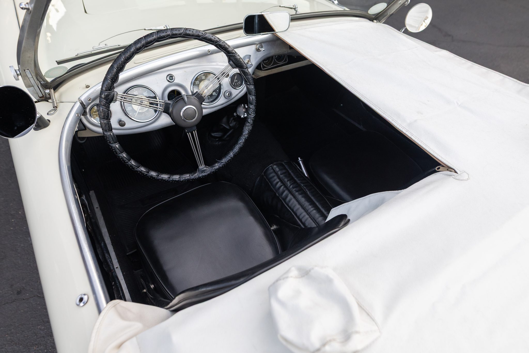 This 1955 Austin-Healey 100 BN1 roadster is powered by a 2.7-liter inline-four equipped with dual SU carburetors, that is backed by a retrofitted four-speed manual transmission with overdrive. Finished in white with a removable white soft top and tonneau cover over black vinyl upholstery, the car rides on 15″ knock-off wire wheels and is fitted with Dunlop front disc brakes. Additional equipment includes a Lucas fog light, a Notek driving light, a Smiths heater, and Pyrotect Safety five-point harnesses.