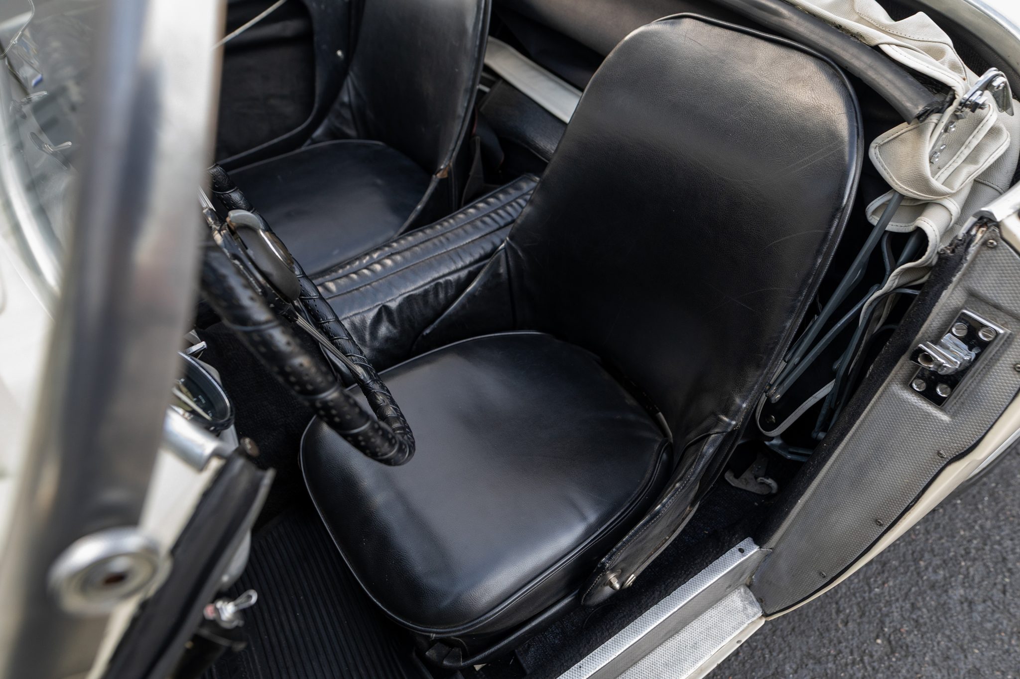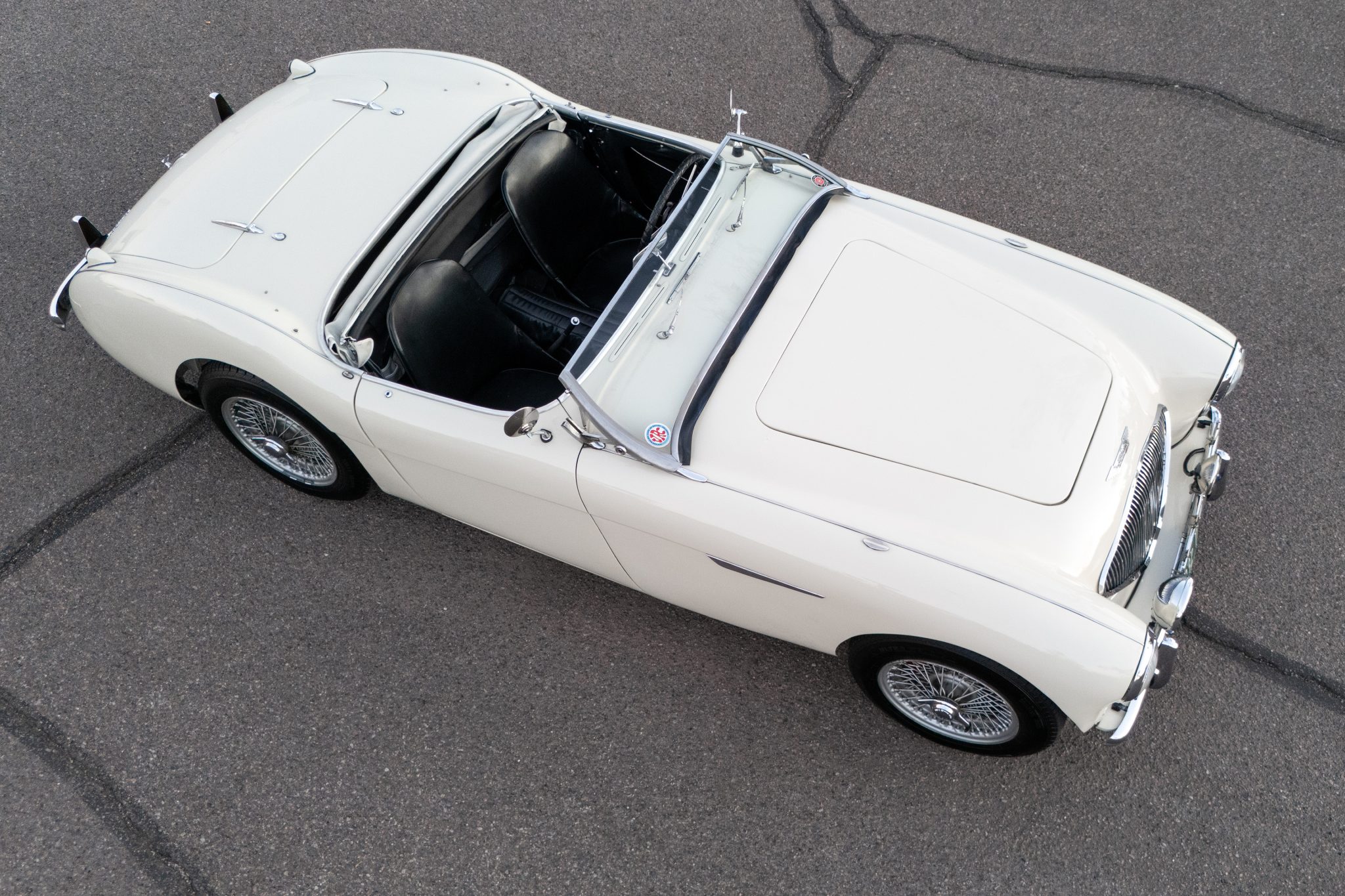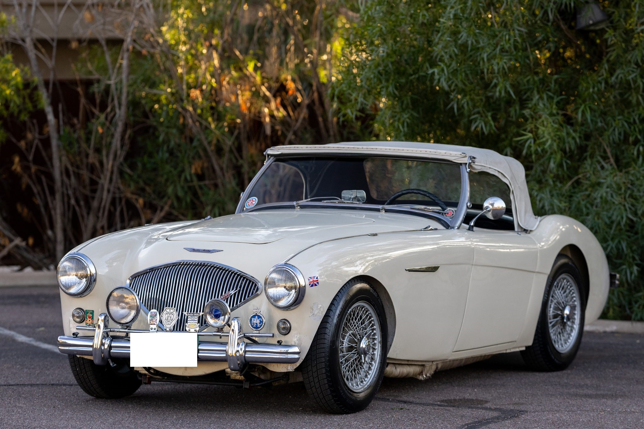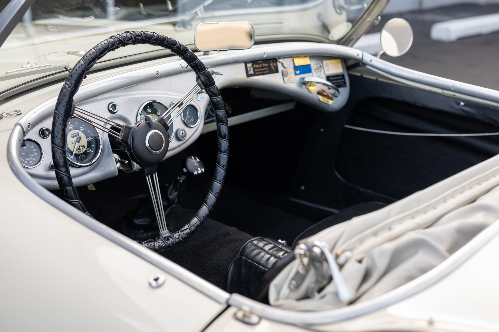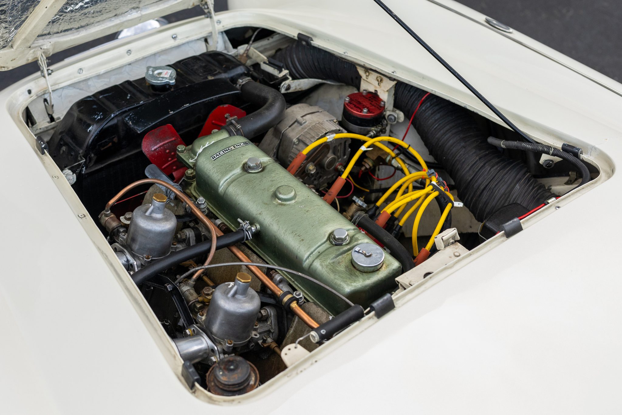 This 1955 Austin-Healey 100 BN1 roadster is powered by a 2.7-liter inline-four equipped with dual SU carburetors, that is backed by a retrofitted four-speed manual transmission with overdrive. Finished in white with a removable white soft top and tonneau cover over black vinyl upholstery, the car rides on 15″ knock-off wire wheels and is fitted with Dunlop front disc brakes. Additional equipment includes a Lucas fog light, a Notek driving light, a Smiths heater, and Pyrotect Safety five-point harnesses.