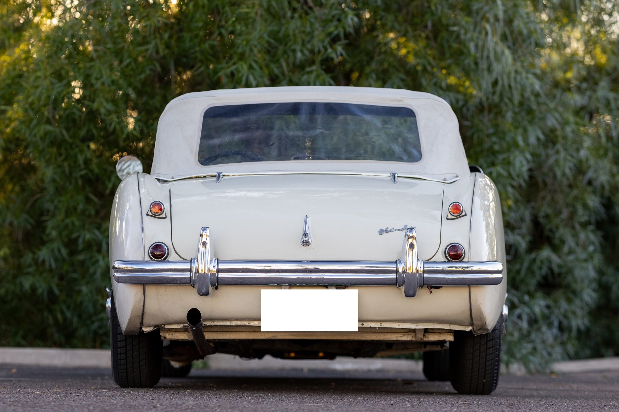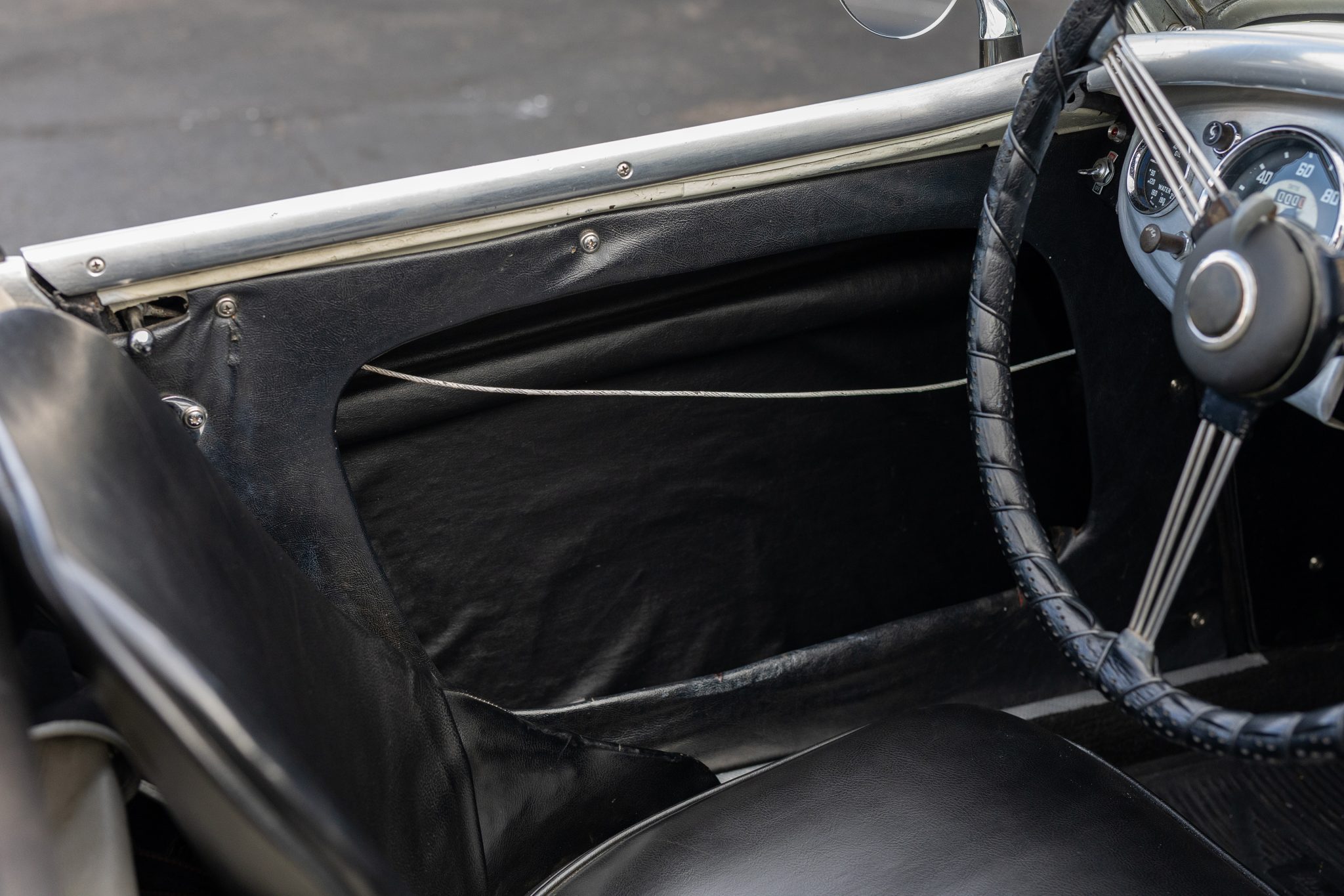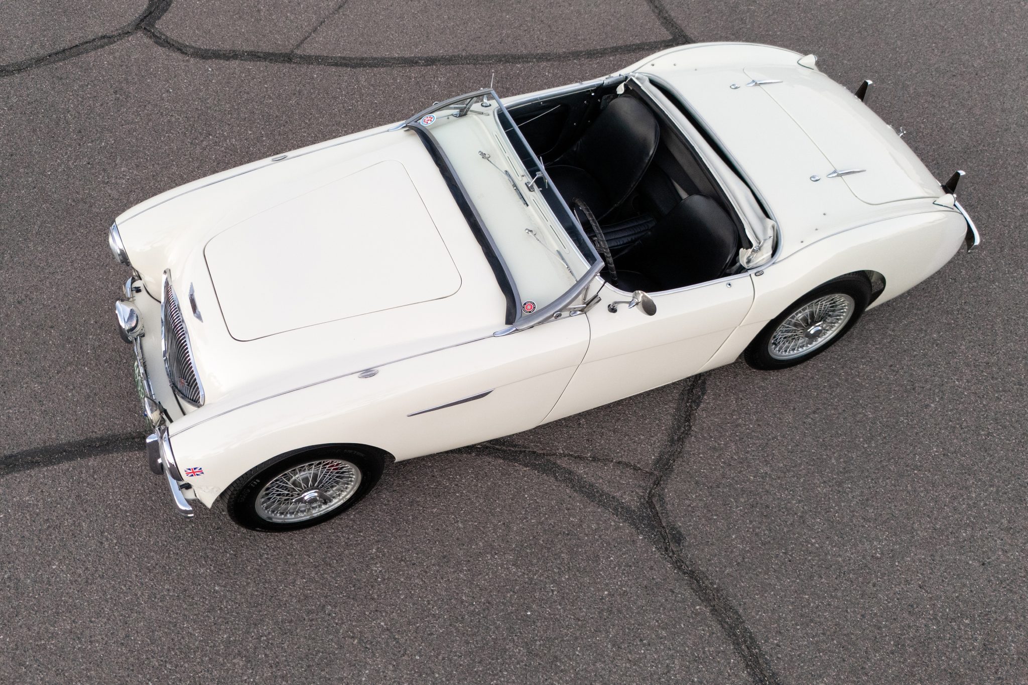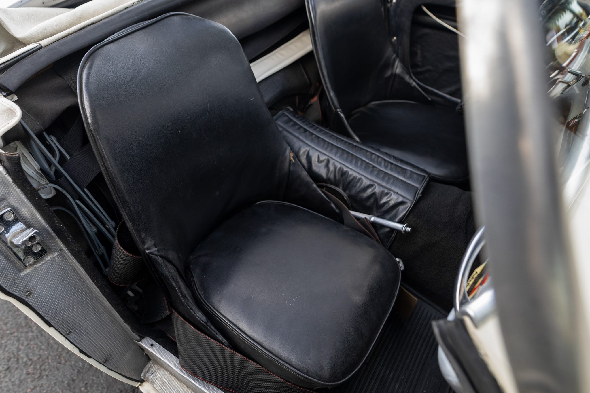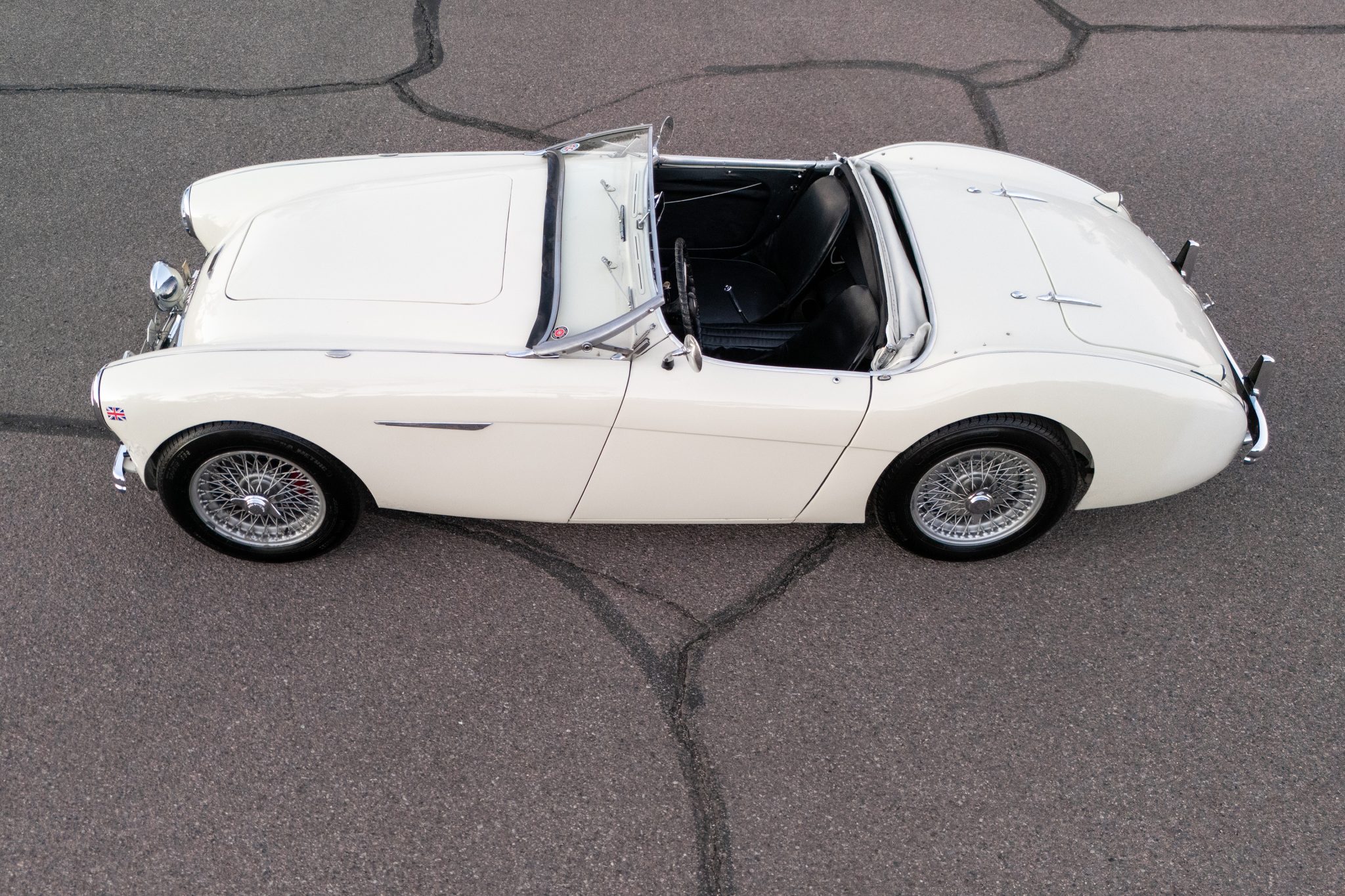 This 1955 Austin-Healey 100 BN1 roadster is powered by a 2.7-liter inline-four equipped with dual SU carburetors, that is backed by a retrofitted four-speed manual transmission with overdrive. Finished in white with a removable white soft top and tonneau cover over black vinyl upholstery, the car rides on 15″ knock-off wire wheels and is fitted with Dunlop front disc brakes. Additional equipment includes a Lucas fog light, a Notek driving light, a Smiths heater, and Pyrotect Safety five-point harnesses.