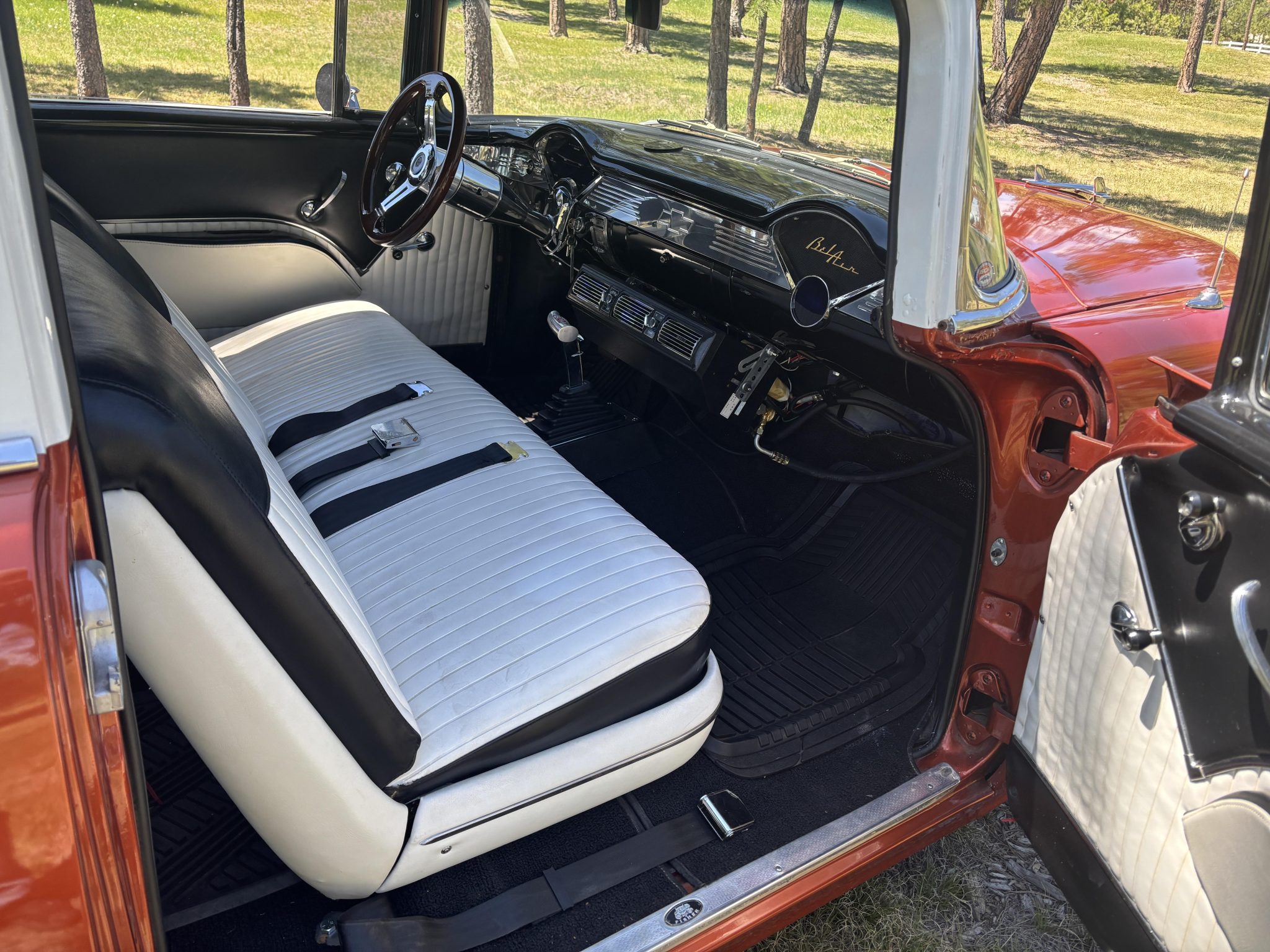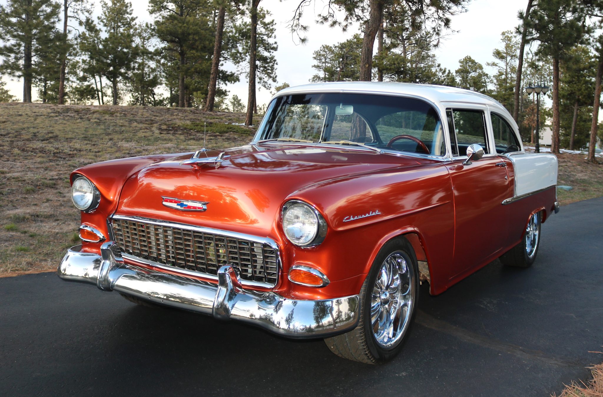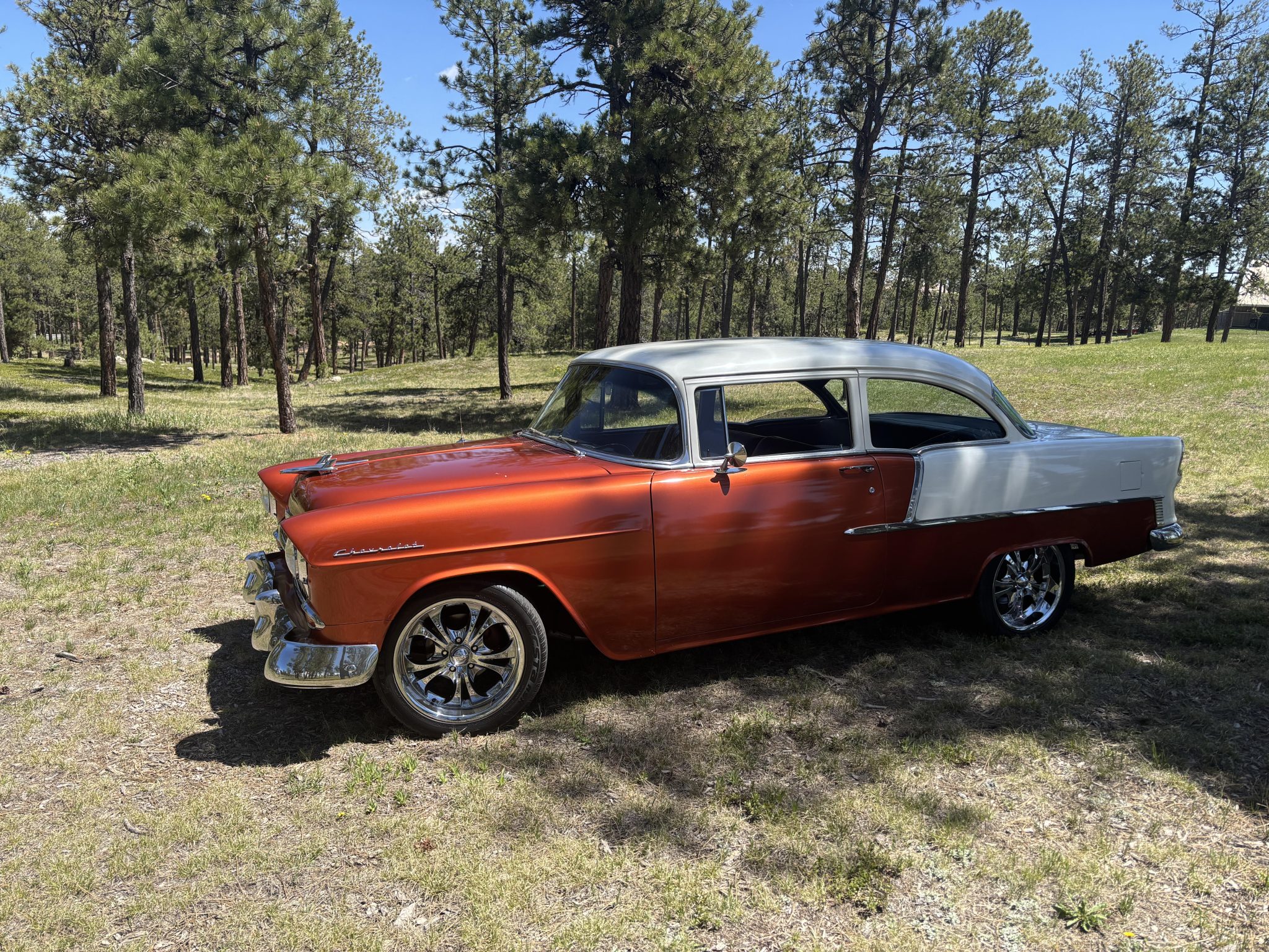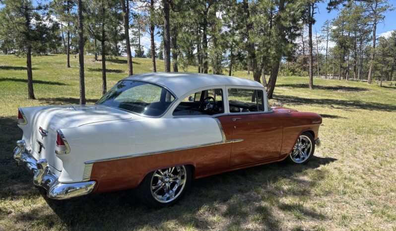 This 1955 Chevrolet 210 two-door sedan is powered by a 383ci stroker V8 that was assembled with forged internal components, a hydraulic roller camshaft, aluminum cylinder heads, a Holley carburetor, a Weiand supercharger, MSD ignition, and an ICT accessory drive setup. Power is routed through a four-speed automatic and a 9″ rear end with 4.11:1 gears, and the car rides on rear coilovers and 18″ Boss wheels mounted over four-wheel disc brakes. The exterior is finished in bronze and white, while the cabin is outfitted with air conditioning, a tilt steering wheel, digital instrumentation, a B&M shifter, and bench seating trimmed in black and white vinyl.