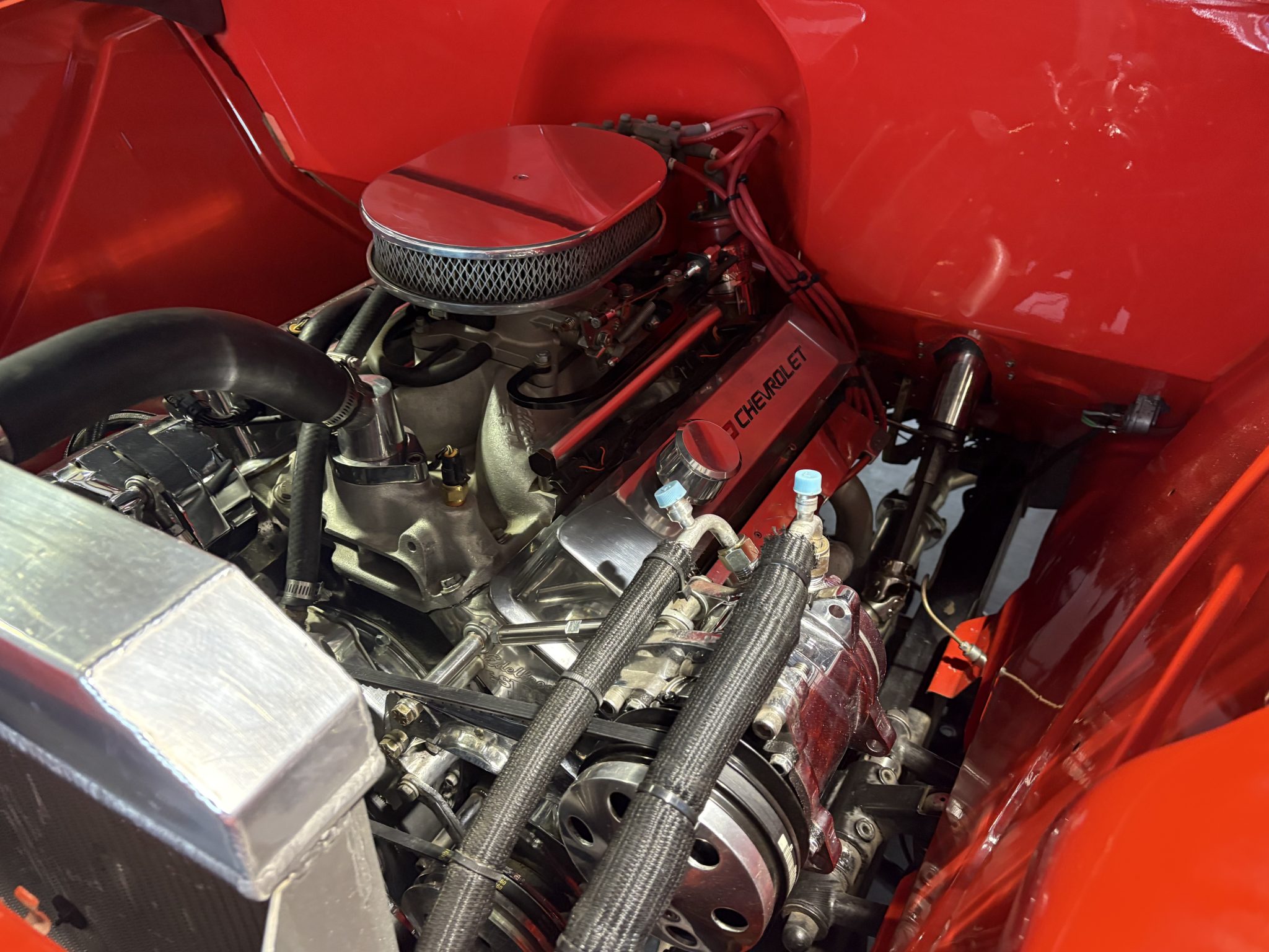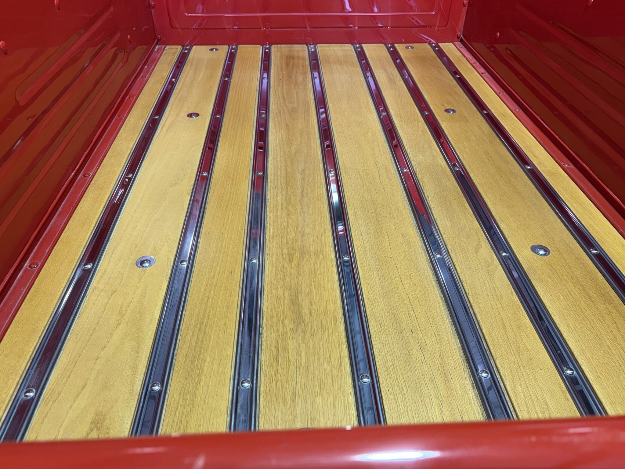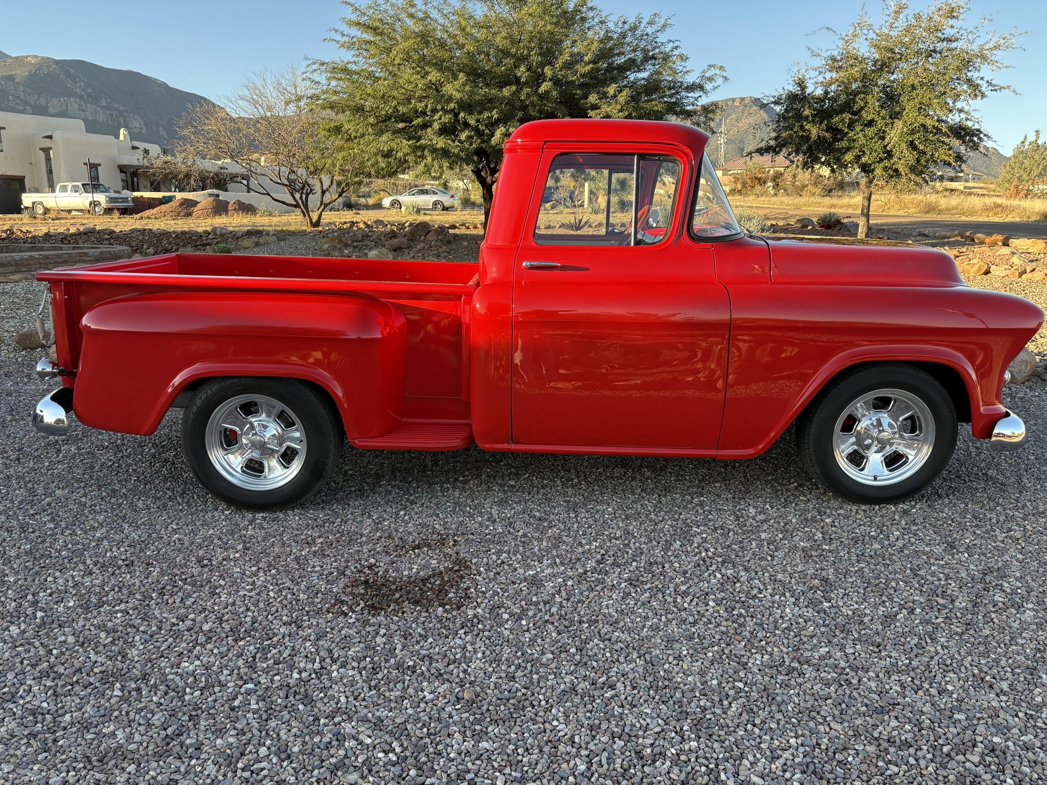 Work included installing a 383ci BluePrint V8 and a TH200-4R four-speed automatic transmission, repainting the exterior, refreshing the interior, performing a disc brake conversion, and overhauling the suspension. Equipment includes an Edelbrock EFI system, a hydraulic roller camshaft, an aluminum radiator, 17″ Billet Specialties wheels, a Mustang II-style front suspension, four-link rear suspension, RideTech coilovers, a wood bed floor, Vintage Air climate control, a Bluetooth-capable stereo, and aftermarket speakers.