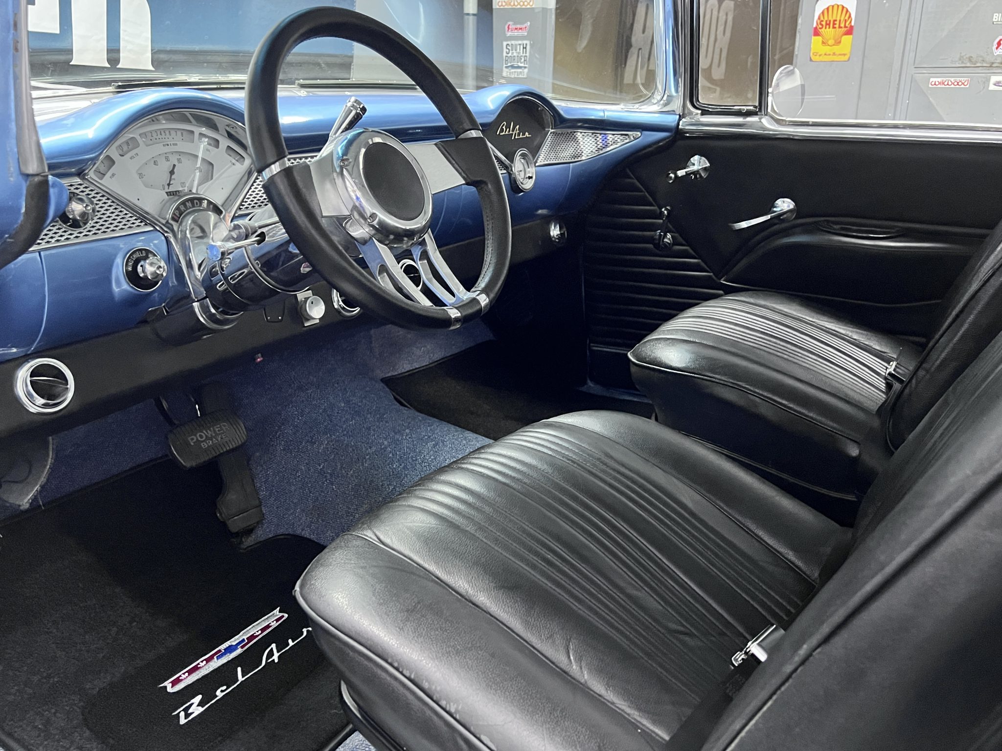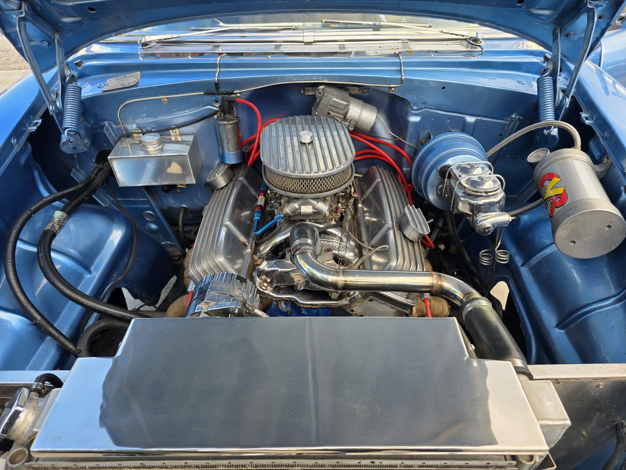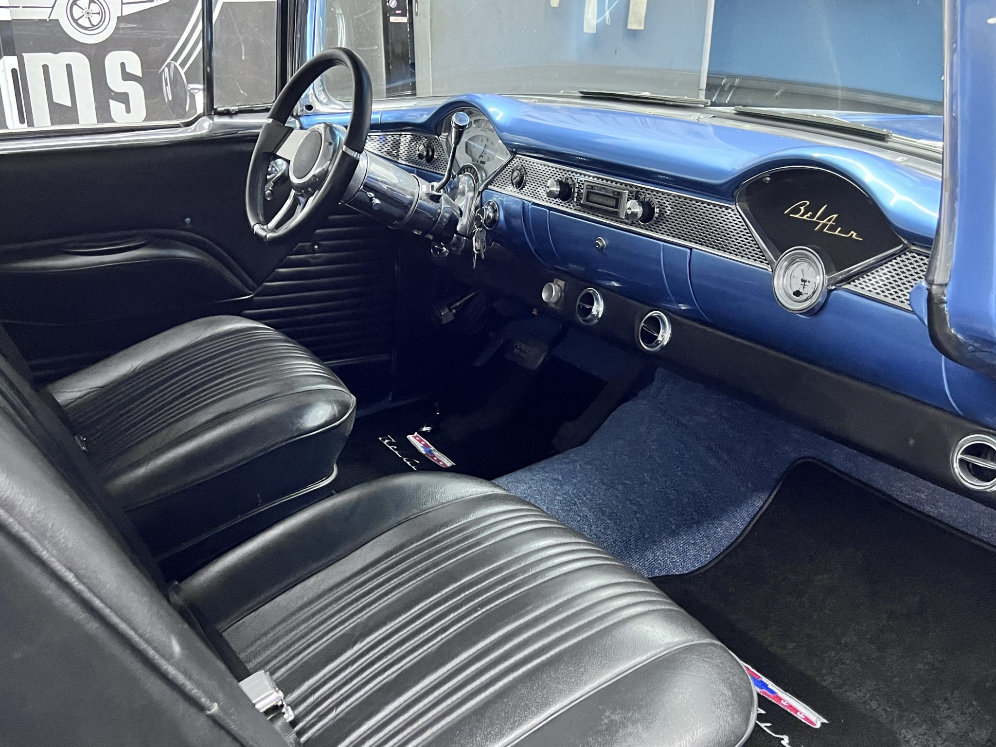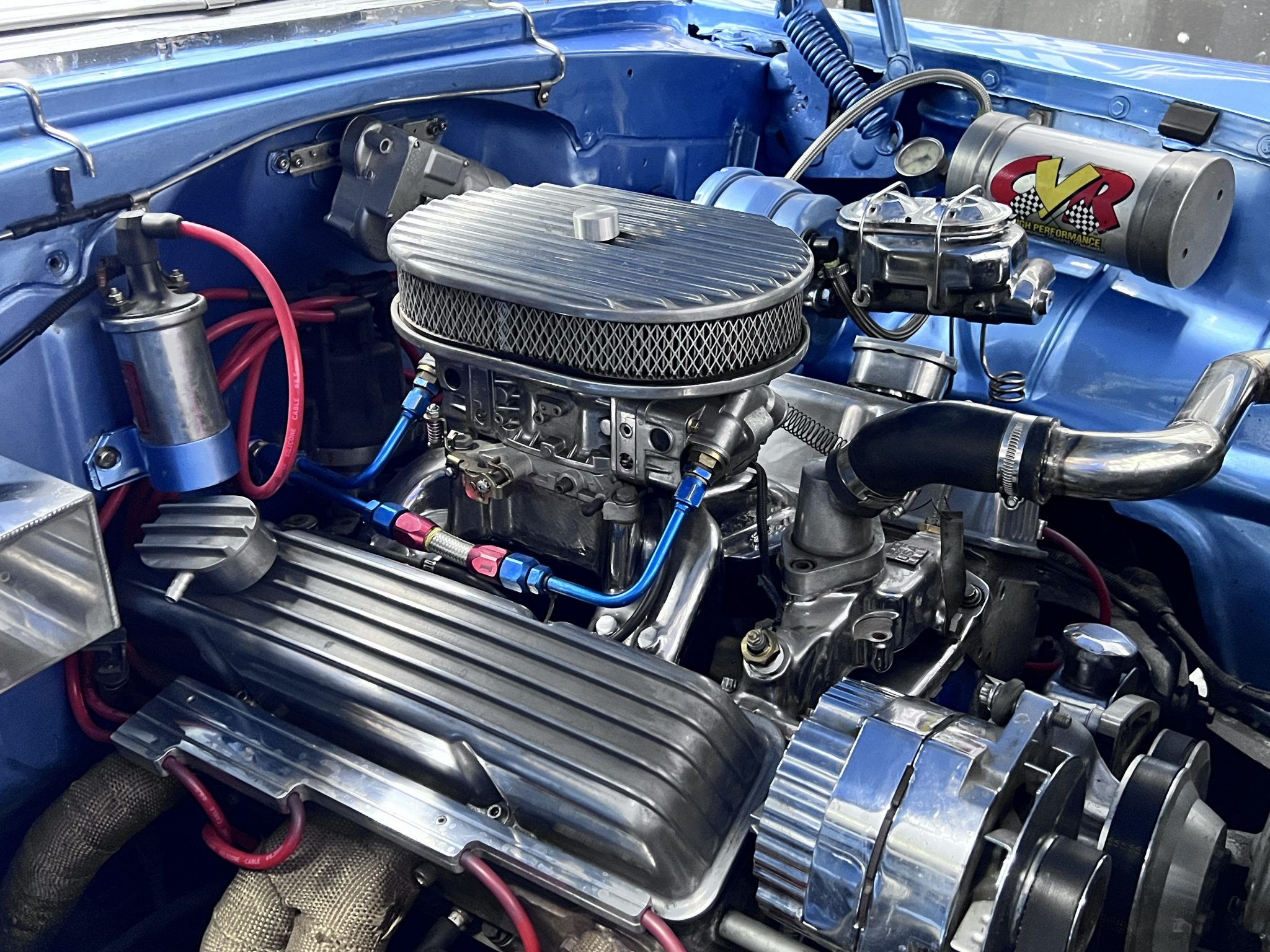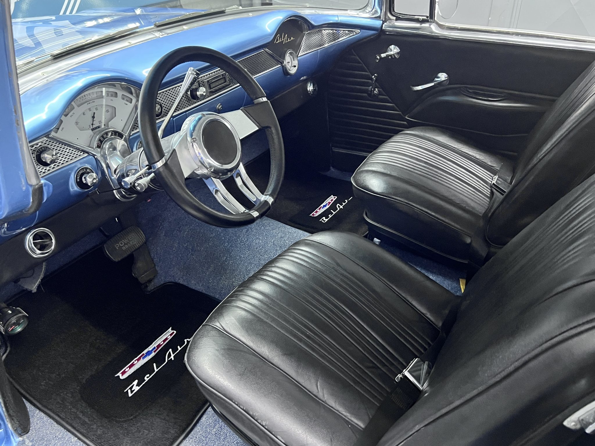 It is powered by a 350ci V8 that was assembled with larger-diameter pistons, an Edelbrock camshaft and intake, aluminum cylinder heads, and a Holley 750-cfm carburetor, and the modified TH350 three-speed automatic is linked to a 9″ rear axle with a limited-slip differential and 3.73:1 gears. The body was removed from the frame and refinished in blue and white, long-tube headers and cutouts were installed, and sound-deadening material was applied in the cabin. Details include 17″ aftermarket wheels, four-wheel disc brakes, power steering, black and blue cabin upholstery, Classic Instruments gauges, and a retro-look Bluetooth stereo.