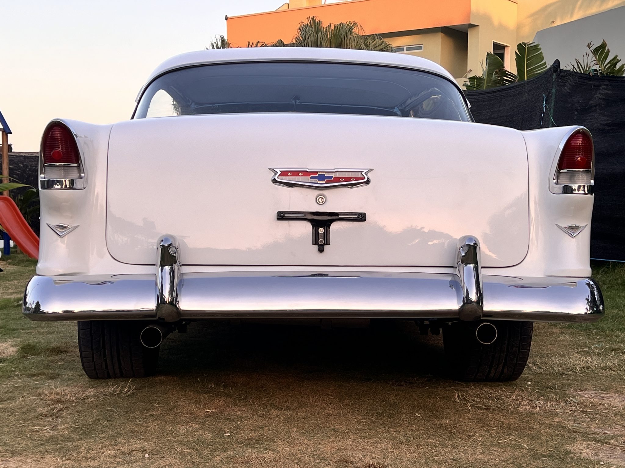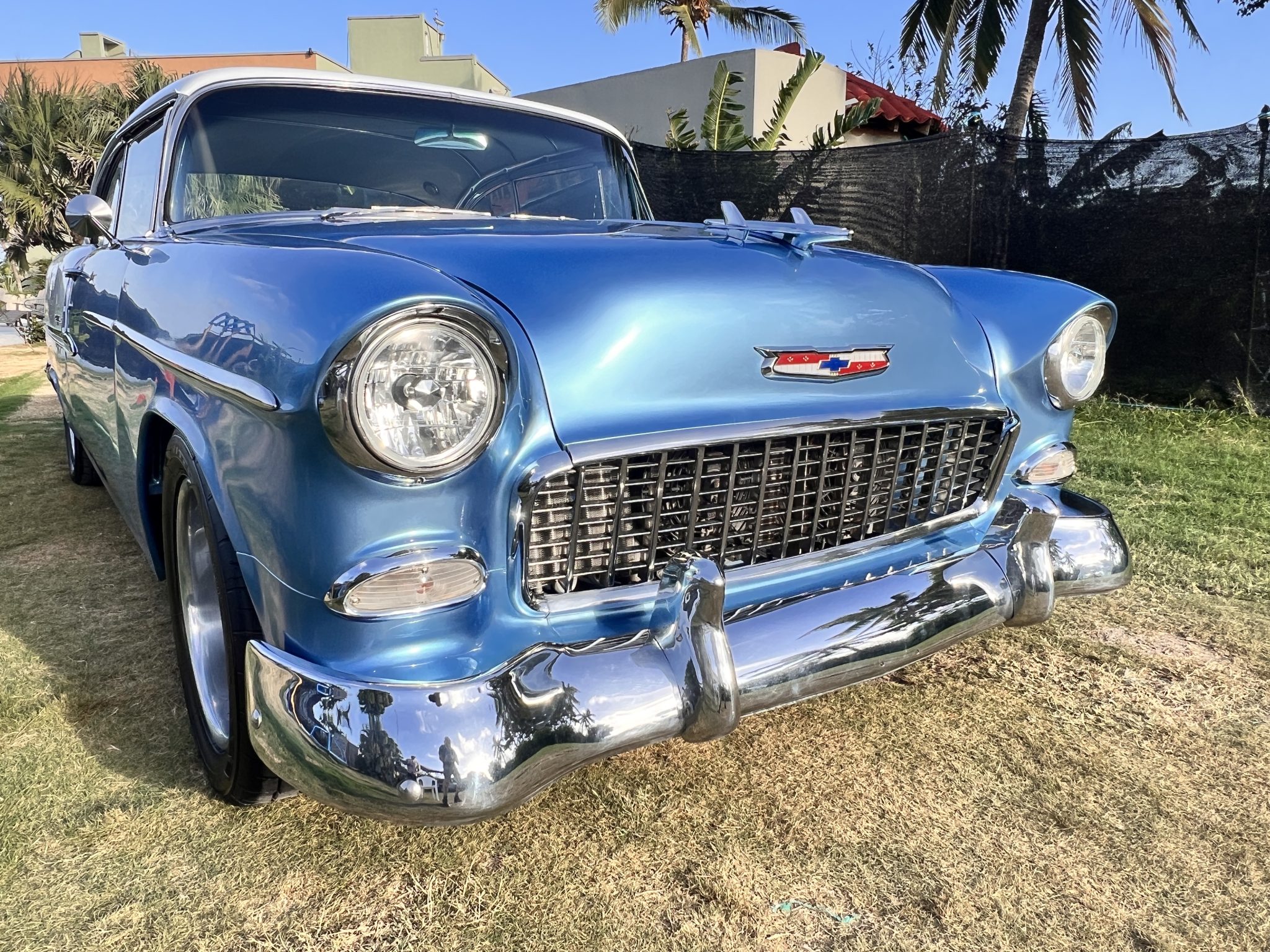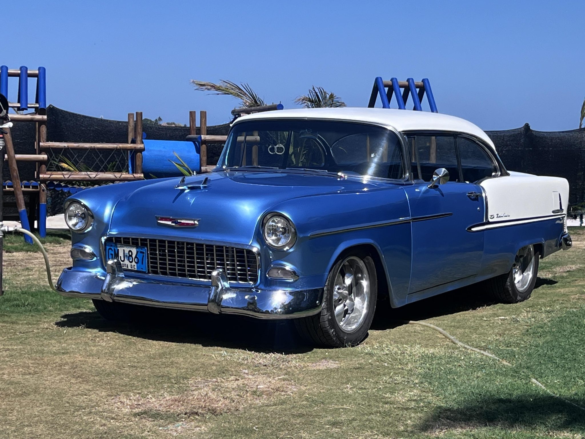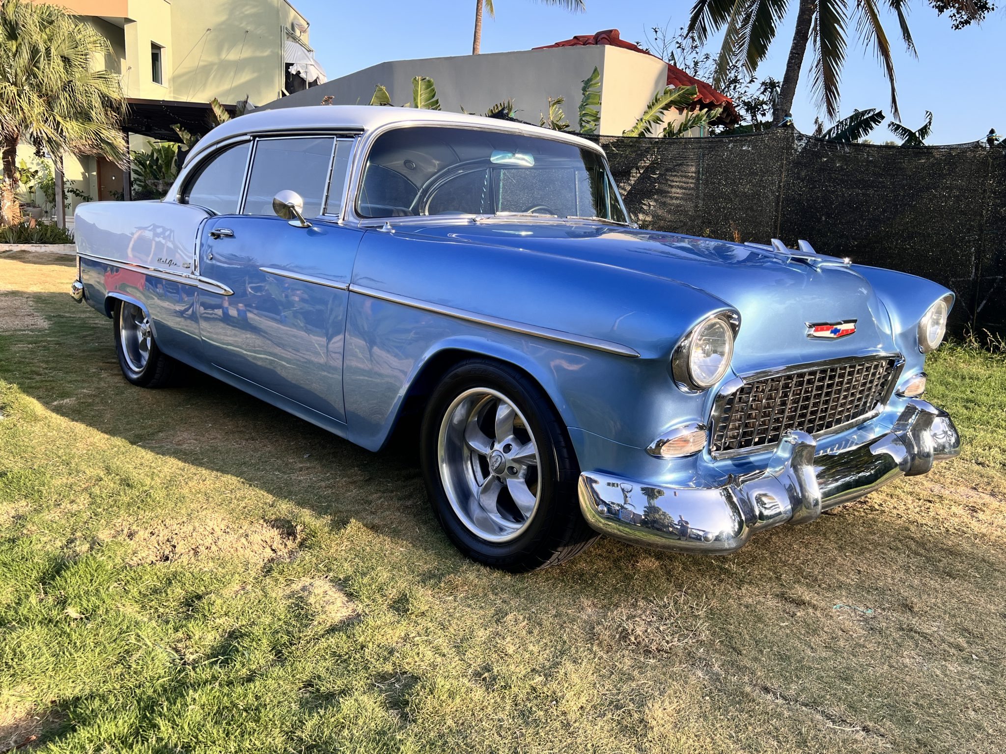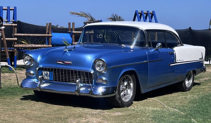 It is powered by a 350ci V8 that was assembled with larger-diameter pistons, an Edelbrock camshaft and intake, aluminum cylinder heads, and a Holley 750-cfm carburetor, and the modified TH350 three-speed automatic is linked to a 9″ rear axle with a limited-slip differential and 3.73:1 gears. The body was removed from the frame and refinished in blue and white, long-tube headers and cutouts were installed, and sound-deadening material was applied in the cabin. Details include 17″ aftermarket wheels, four-wheel disc brakes, power steering, black and blue cabin upholstery, Classic Instruments gauges, and a retro-look Bluetooth stereo.